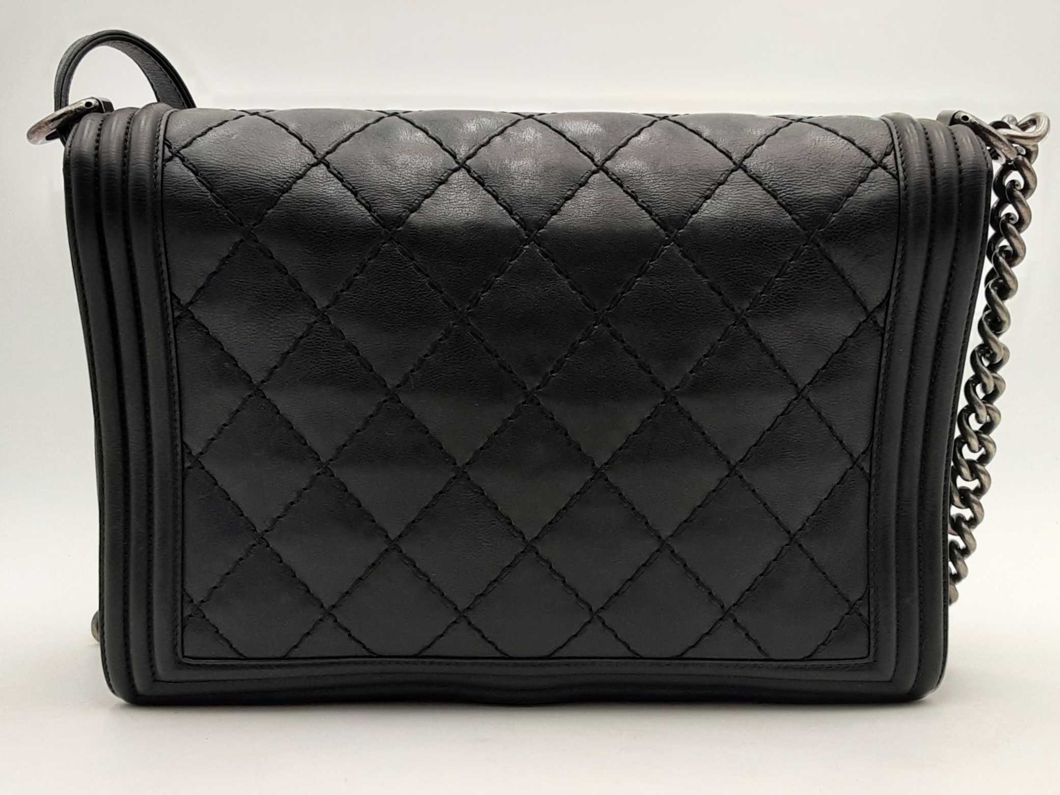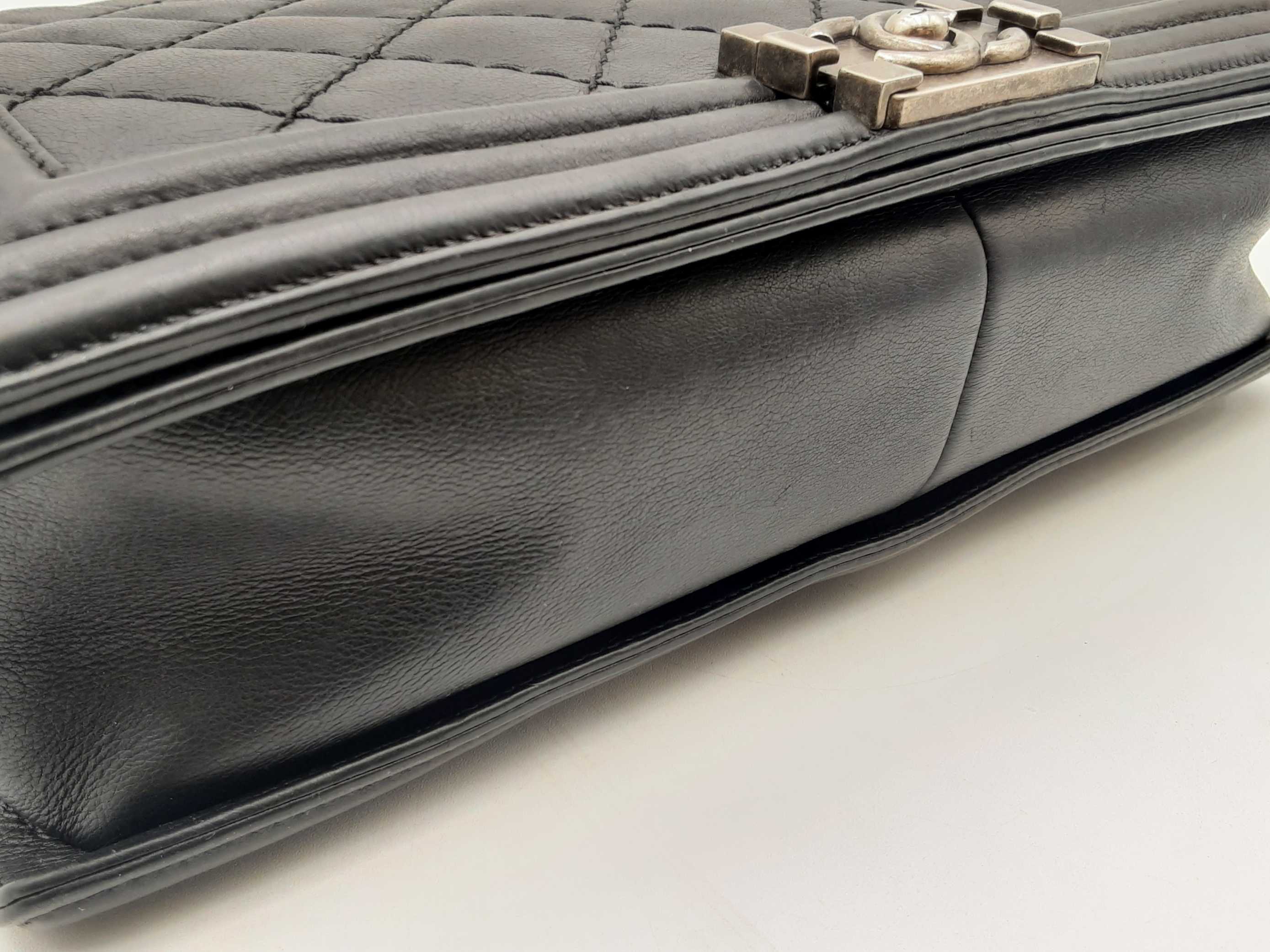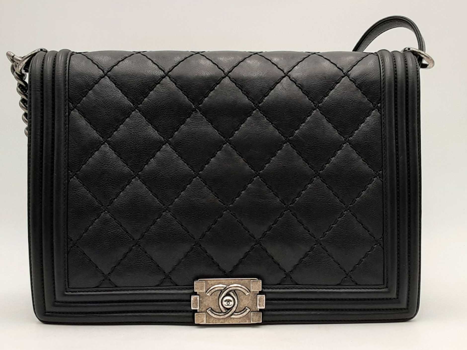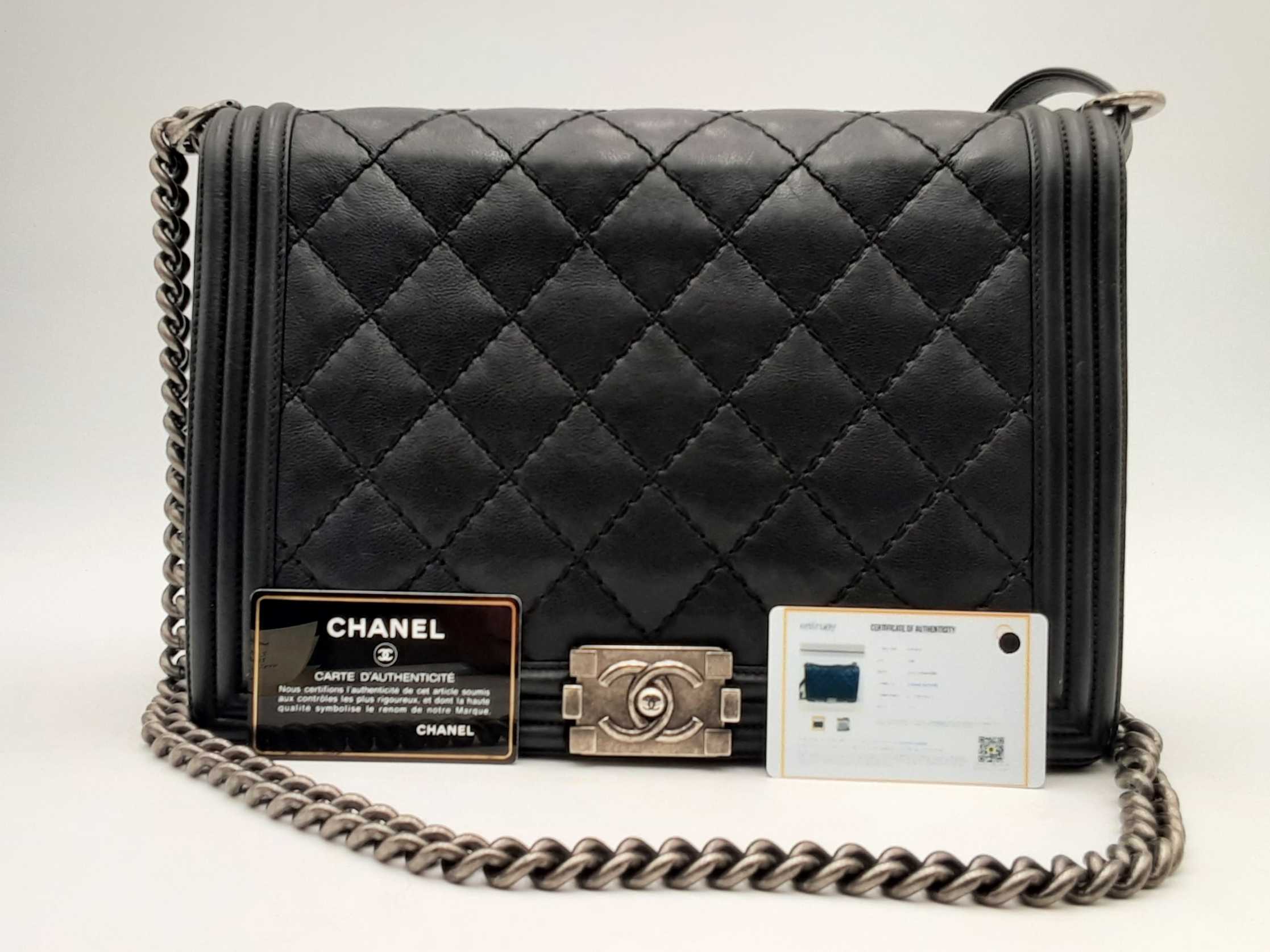 144010053743 Chanel Large Boy Bag Lambskin Black Handbag. Approximate measurements Height 9 IN X Length 12 IN X Width 3 IN. Drop 18 IN. Good Pre-Owned Condition. Scratches on the hardware as well as the exterior. Some wrinkles on the leather. Entrupy Certificate # 72V2RKQ