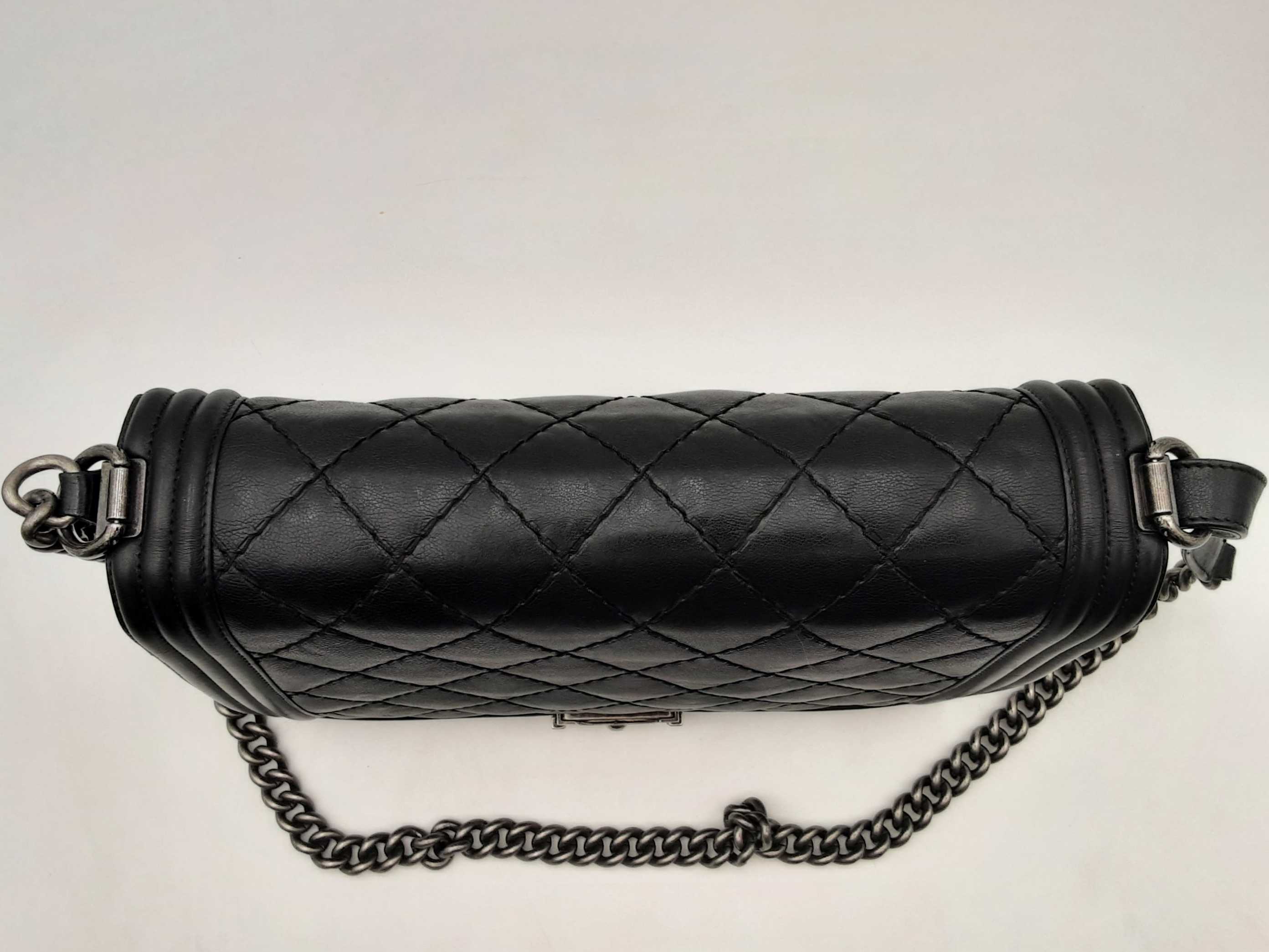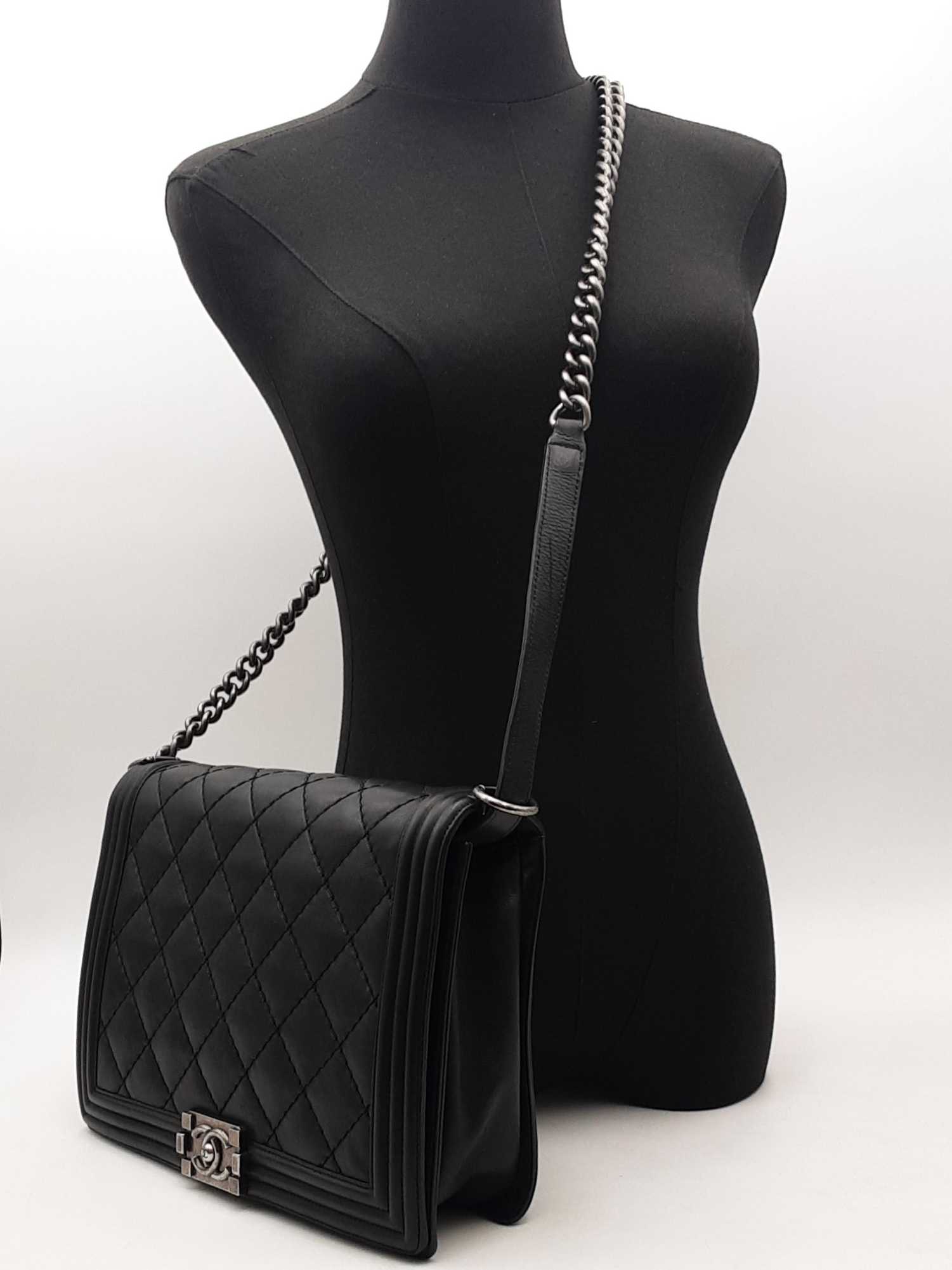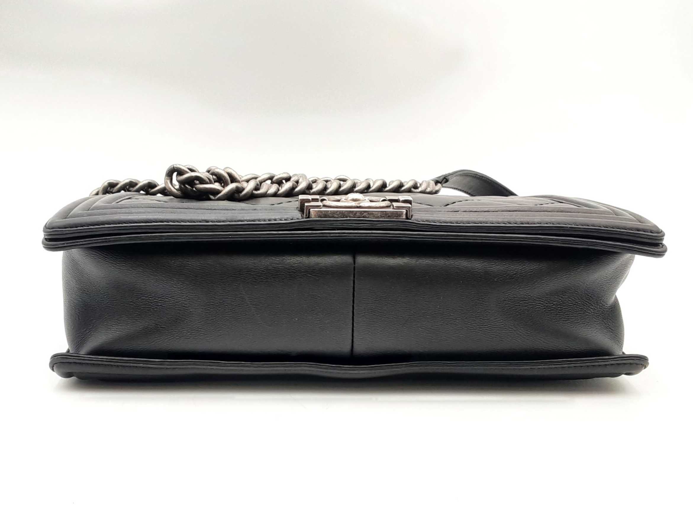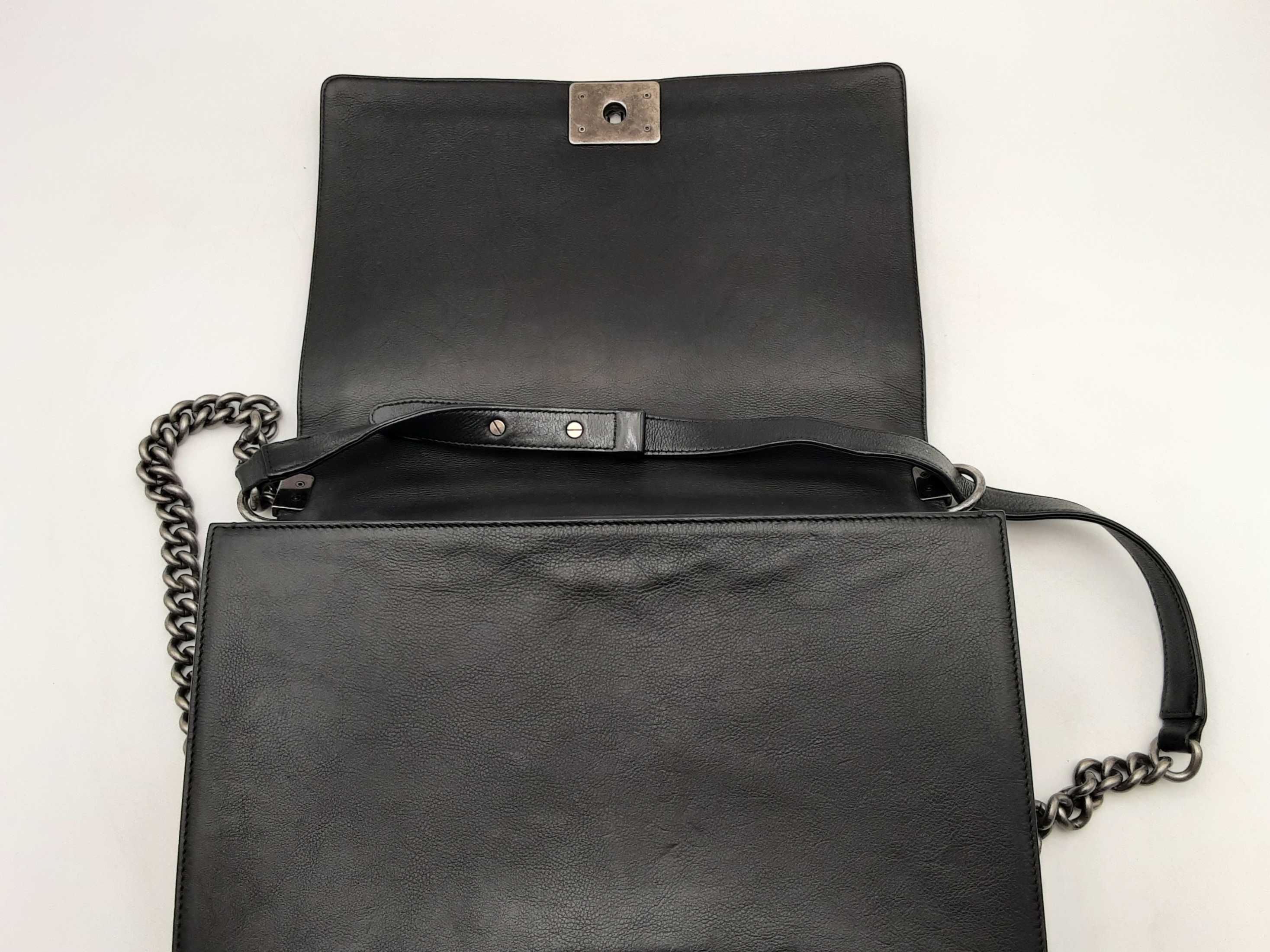 144010053743 Chanel Large Boy Bag Lambskin Black Handbag. Approximate measurements Height 9 IN X Length 12 IN X Width 3 IN. Drop 18 IN. Good Pre-Owned Condition. Scratches on the hardware as well as the exterior. Some wrinkles on the leather. Entrupy Certificate # 72V2RKQ