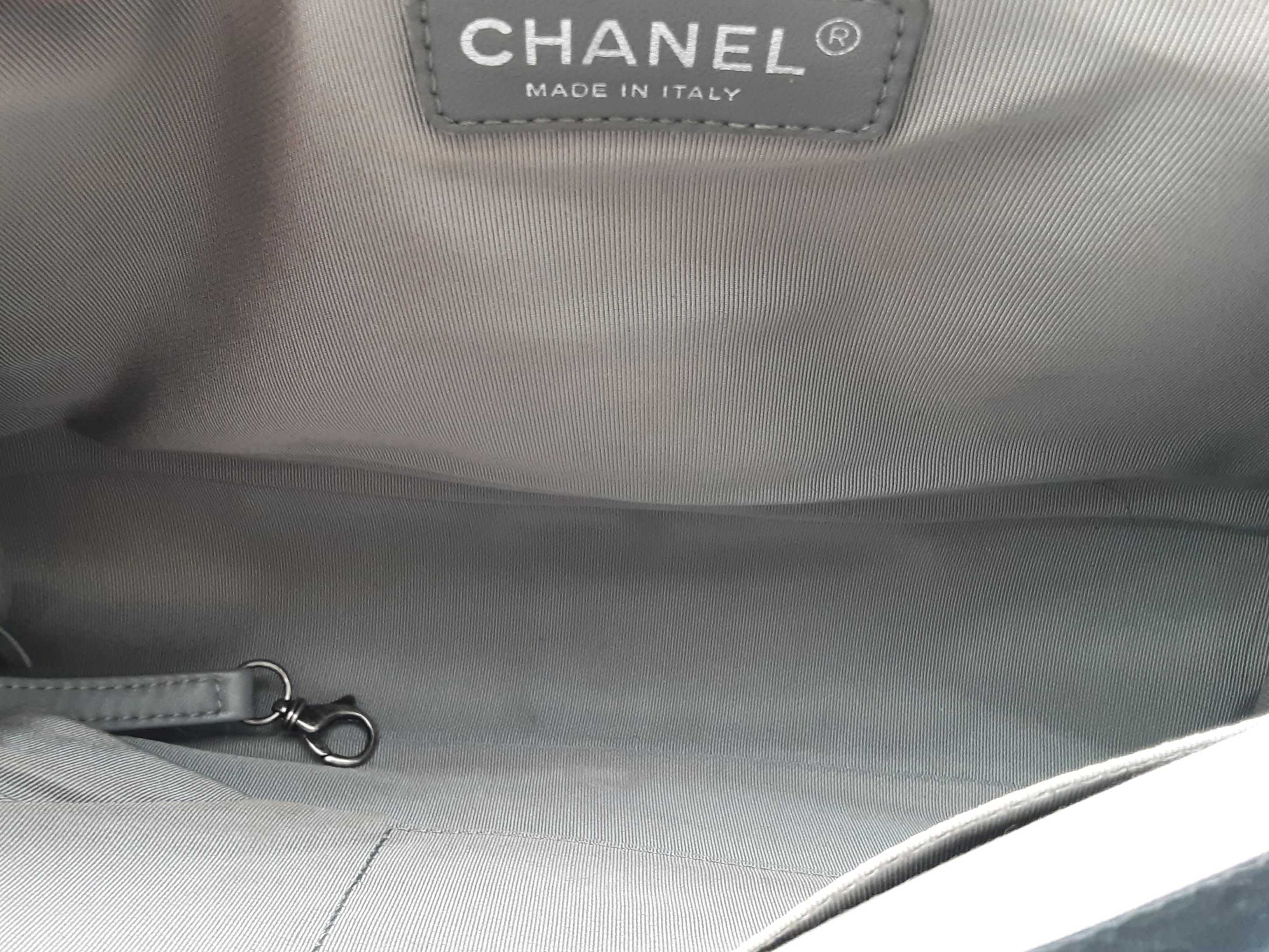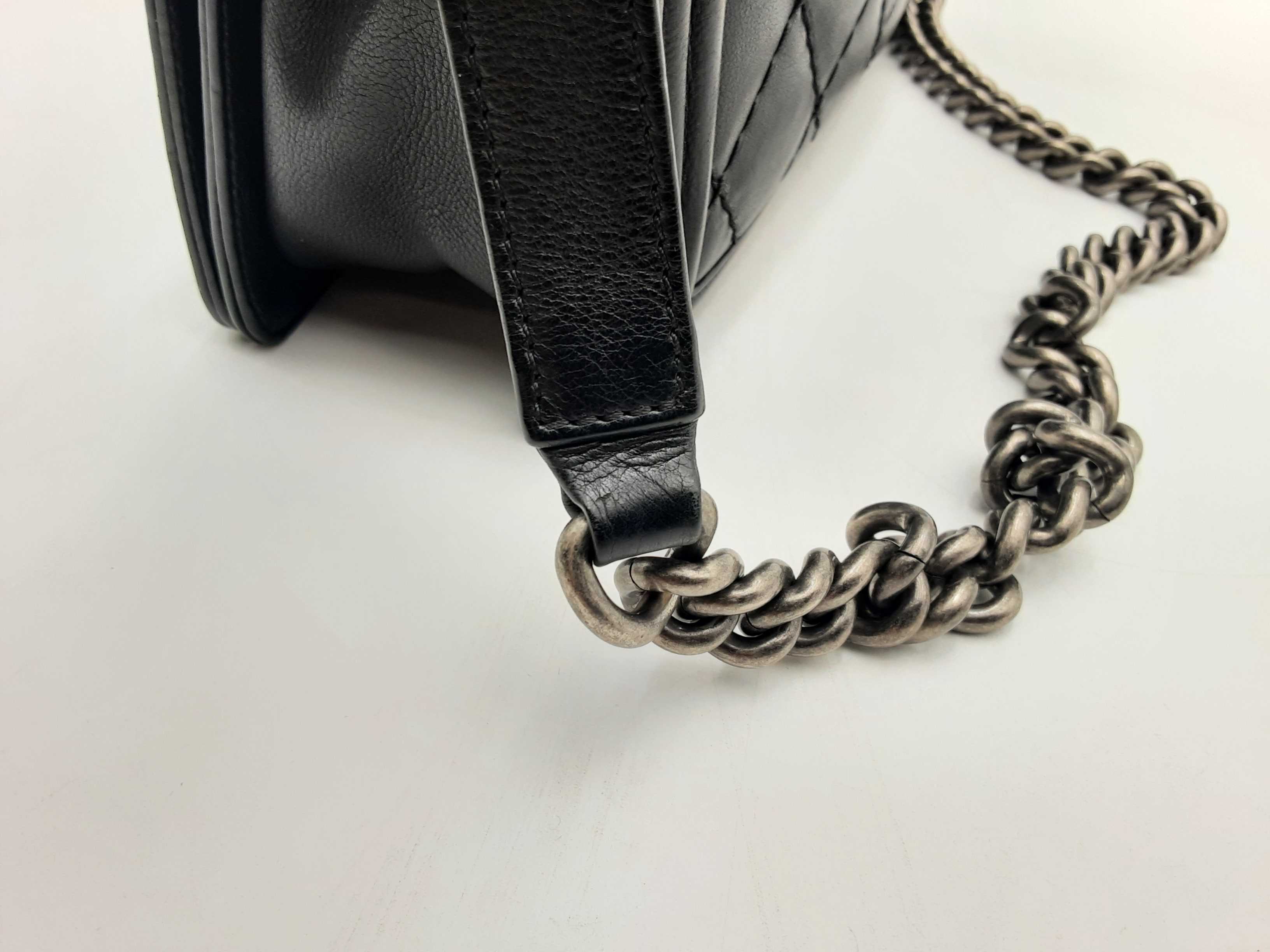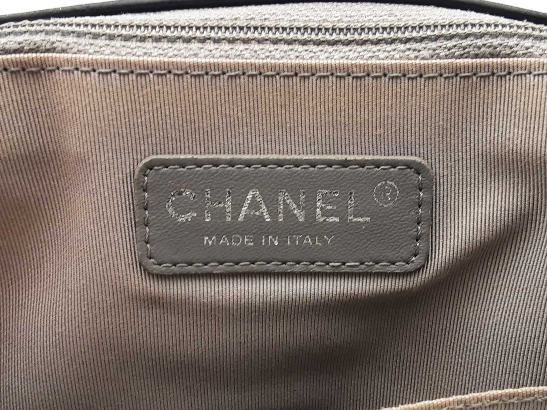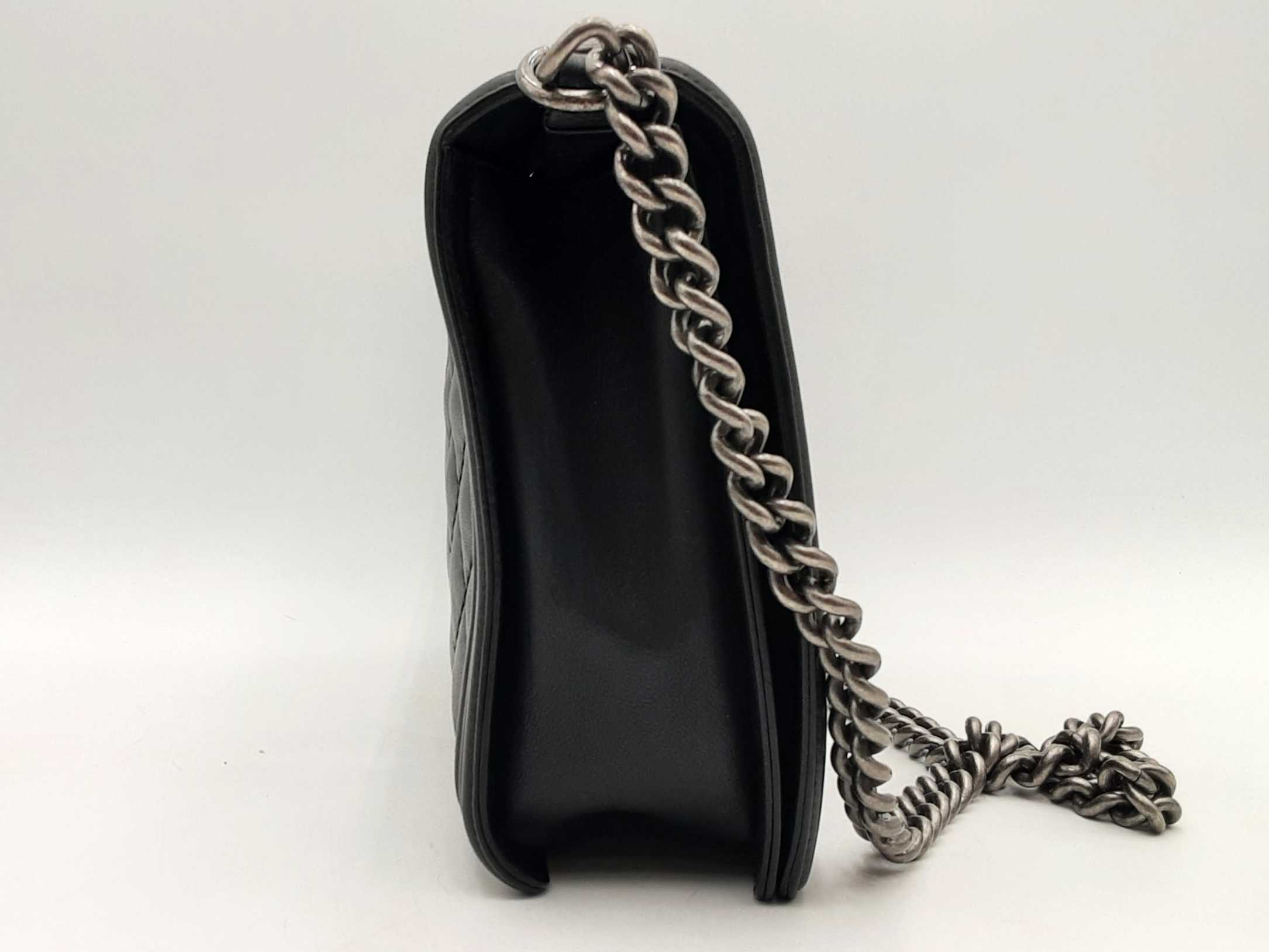 144010053743 Chanel Large Boy Bag Lambskin Black Handbag. Approximate measurements Height 9 IN X Length 12 IN X Width 3 IN. Drop 18 IN. Good Pre-Owned Condition. Scratches on the hardware as well as the exterior. Some wrinkles on the leather. Entrupy Certificate # 72V2RKQ