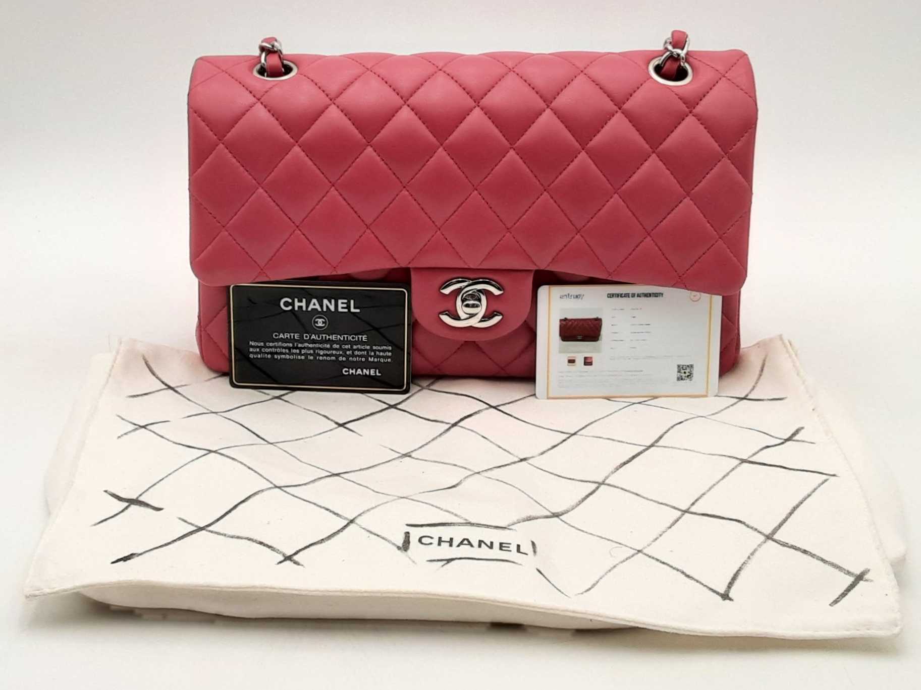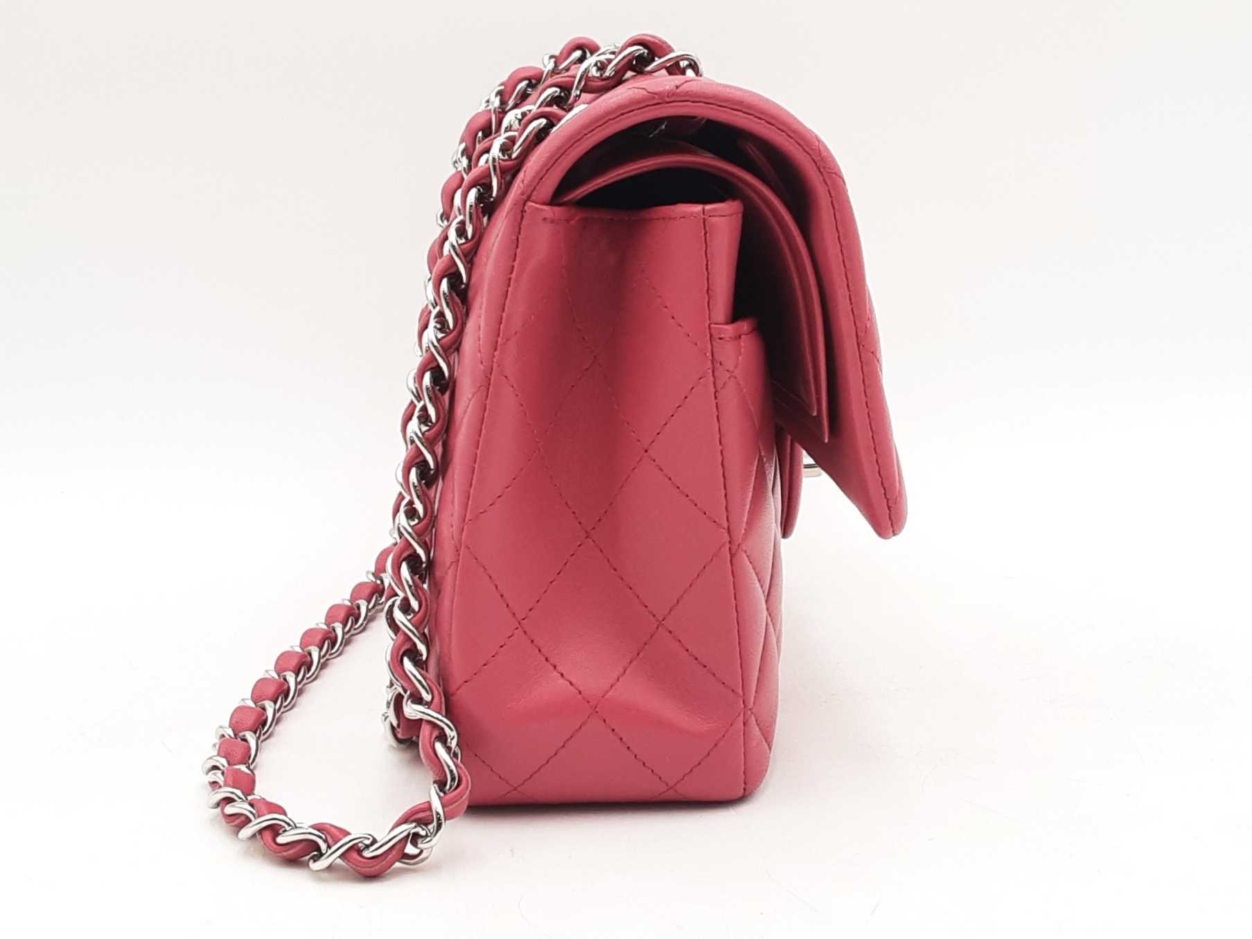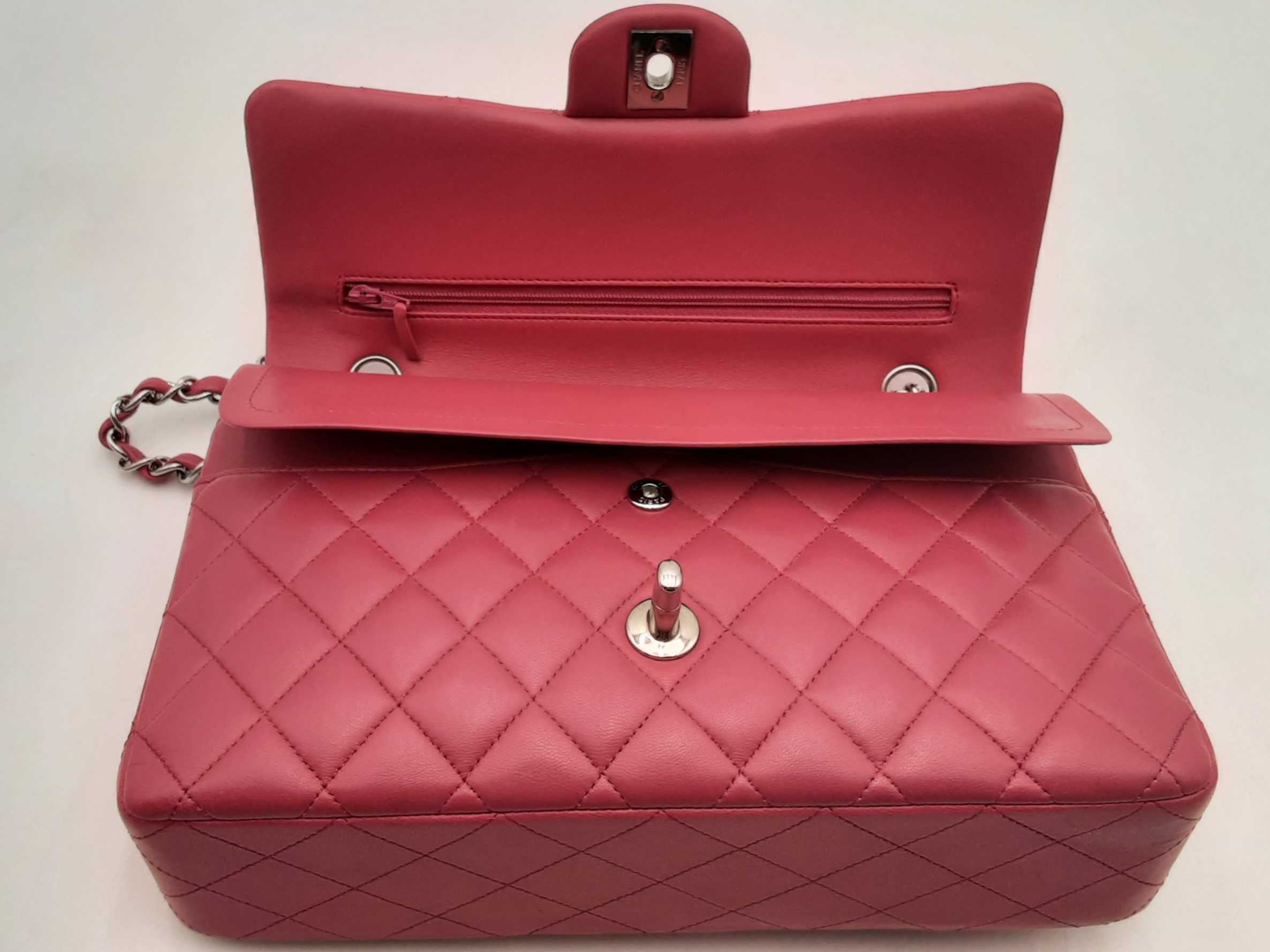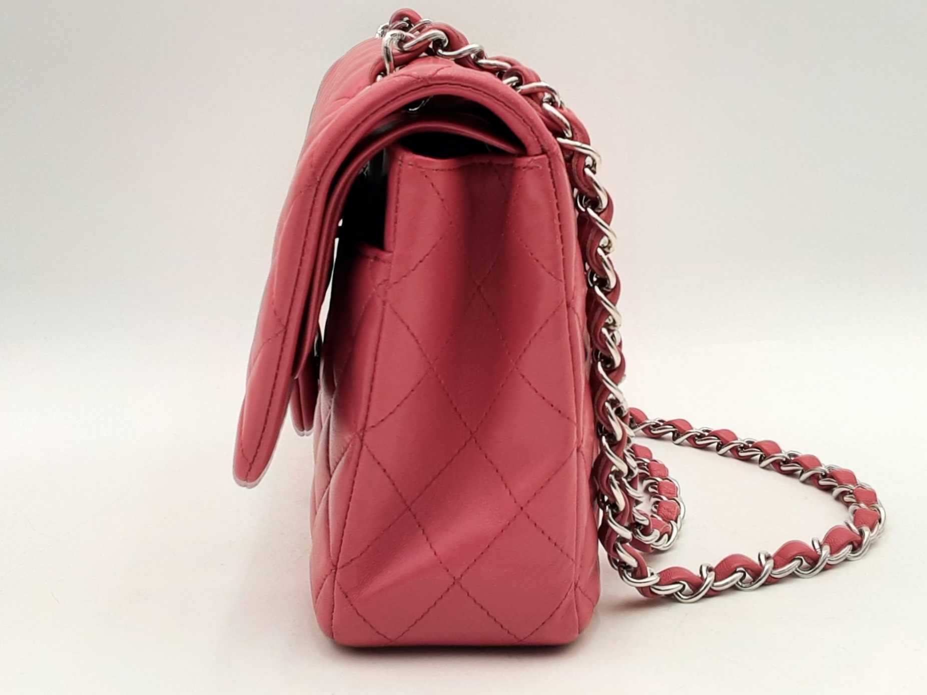 144010059548 Chanel Medium Double Flap Pink Lambskin Handbag. Approximate measurements Height 6.5 IN X Length 10 IN X Width 3 IN. Drop 17 IN. Silver-Tone Hardware. Great Pre-Owned Condition. Scratches on hardware and exterior of the bag. Marks on inner flap caused by the strap as shown in the photo. Entrupy Certificate # 2TB7WHT