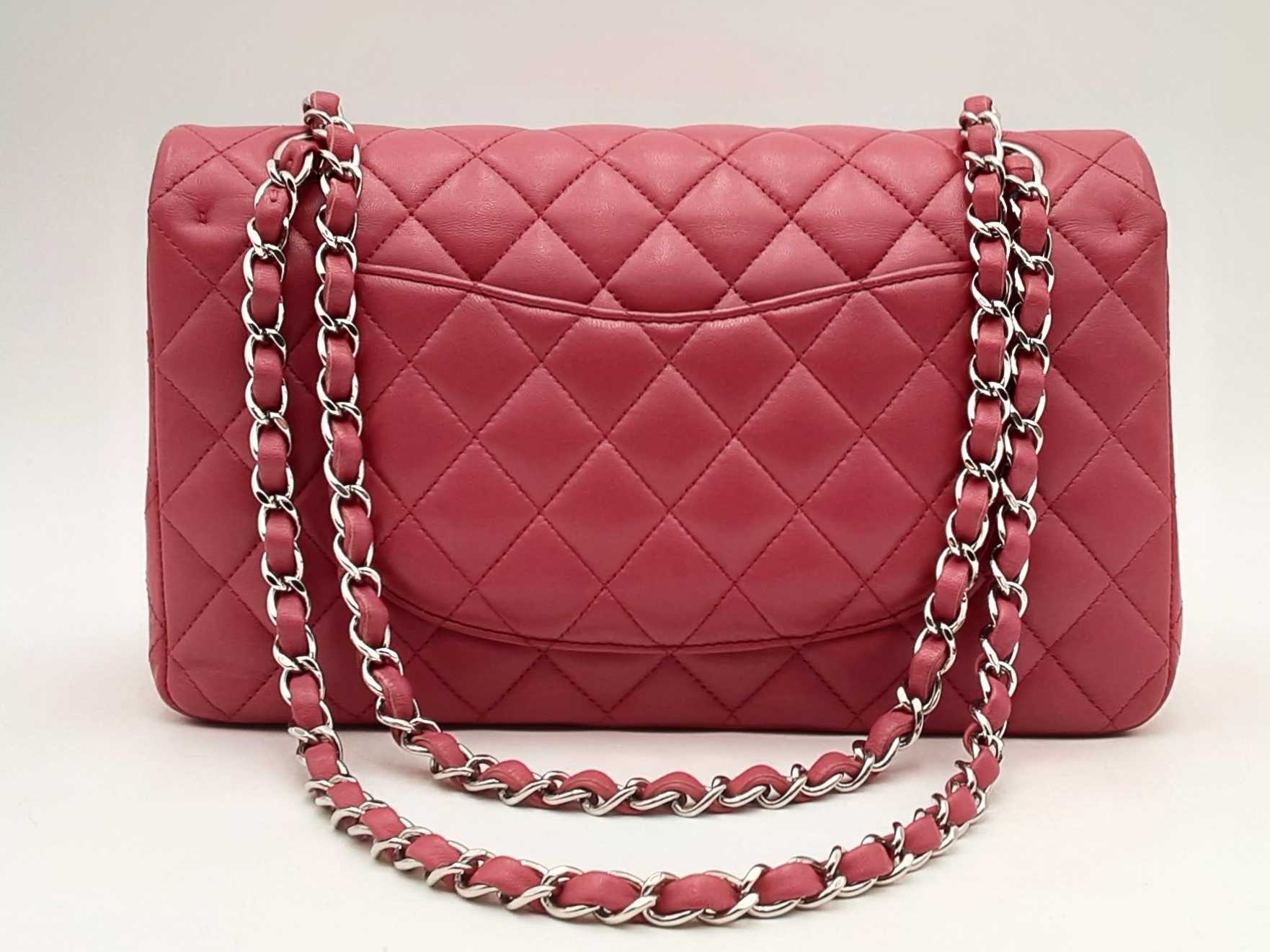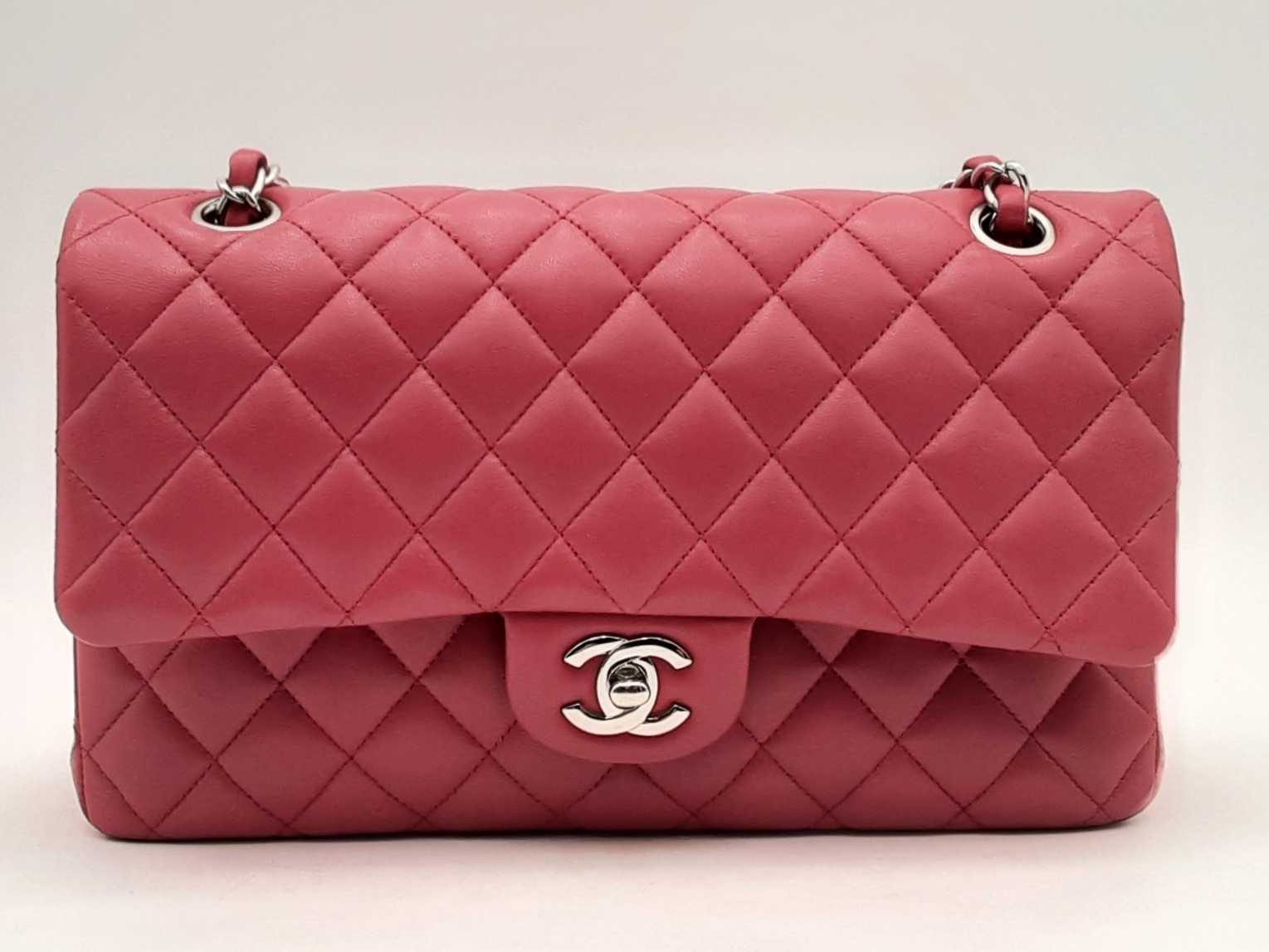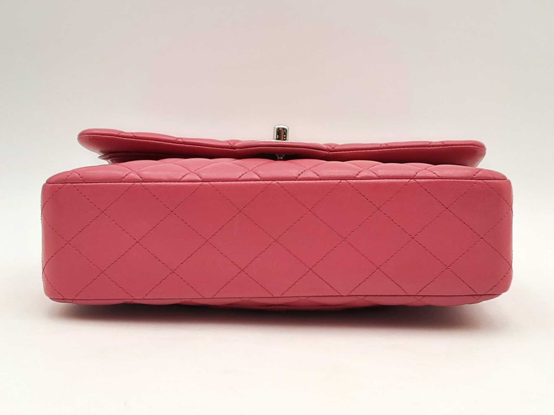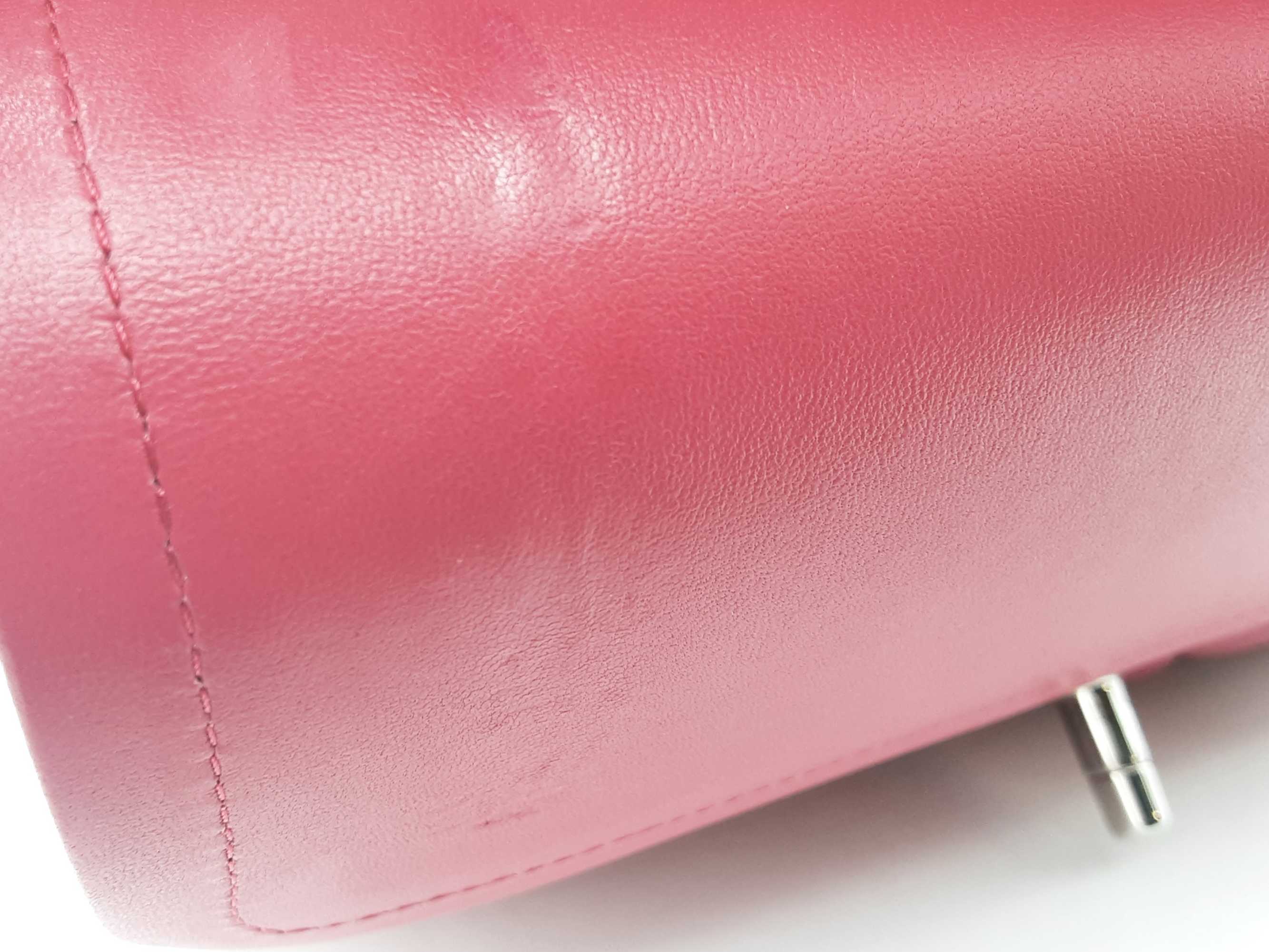 144010059548 Chanel Medium Double Flap Pink Lambskin Handbag. Approximate measurements Height 6.5 IN X Length 10 IN X Width 3 IN. Drop 17 IN. Silver-Tone Hardware. Great Pre-Owned Condition. Scratches on hardware and exterior of the bag. Marks on inner flap caused by the strap as shown in the photo. Entrupy Certificate # 2TB7WHT