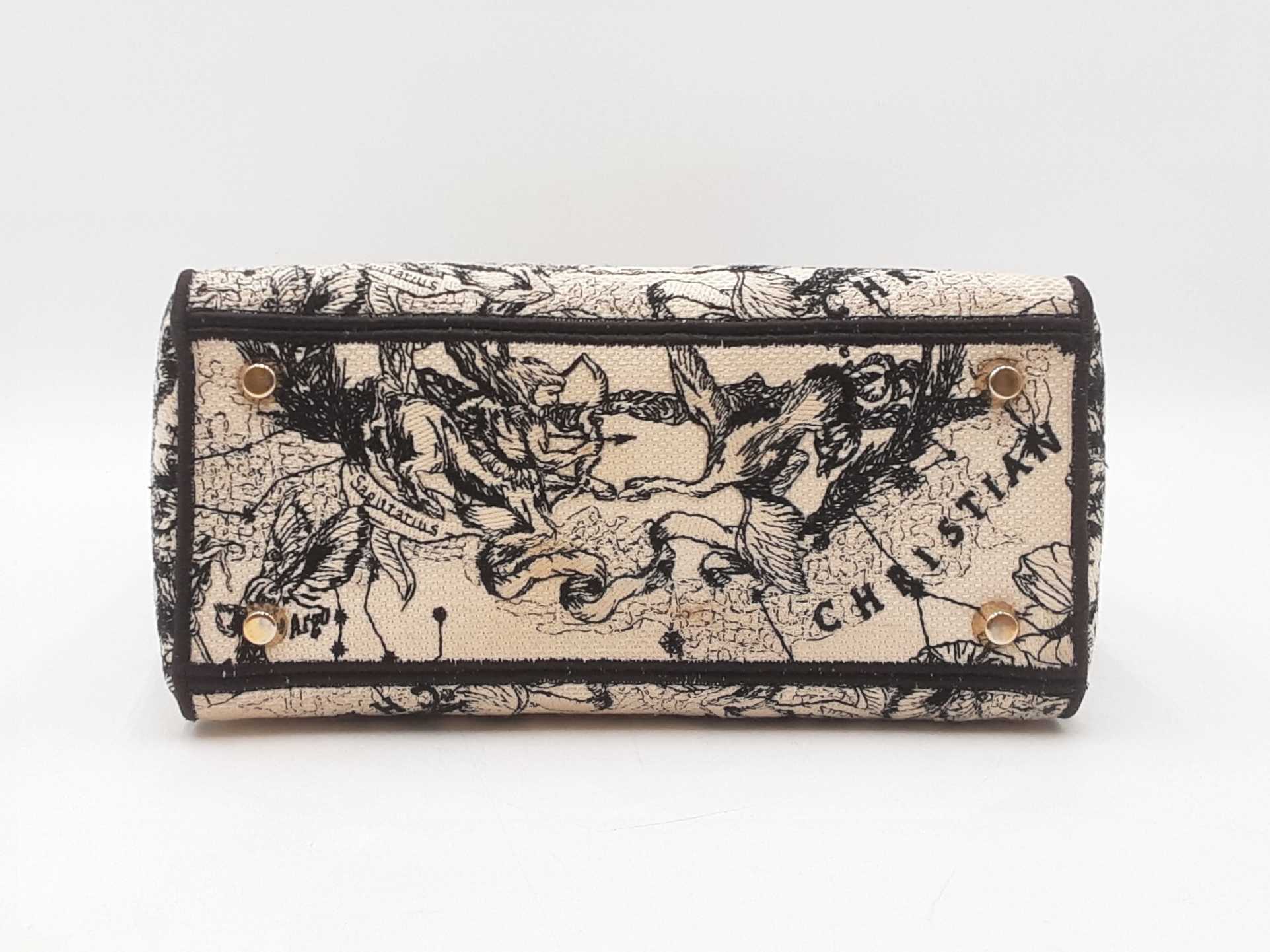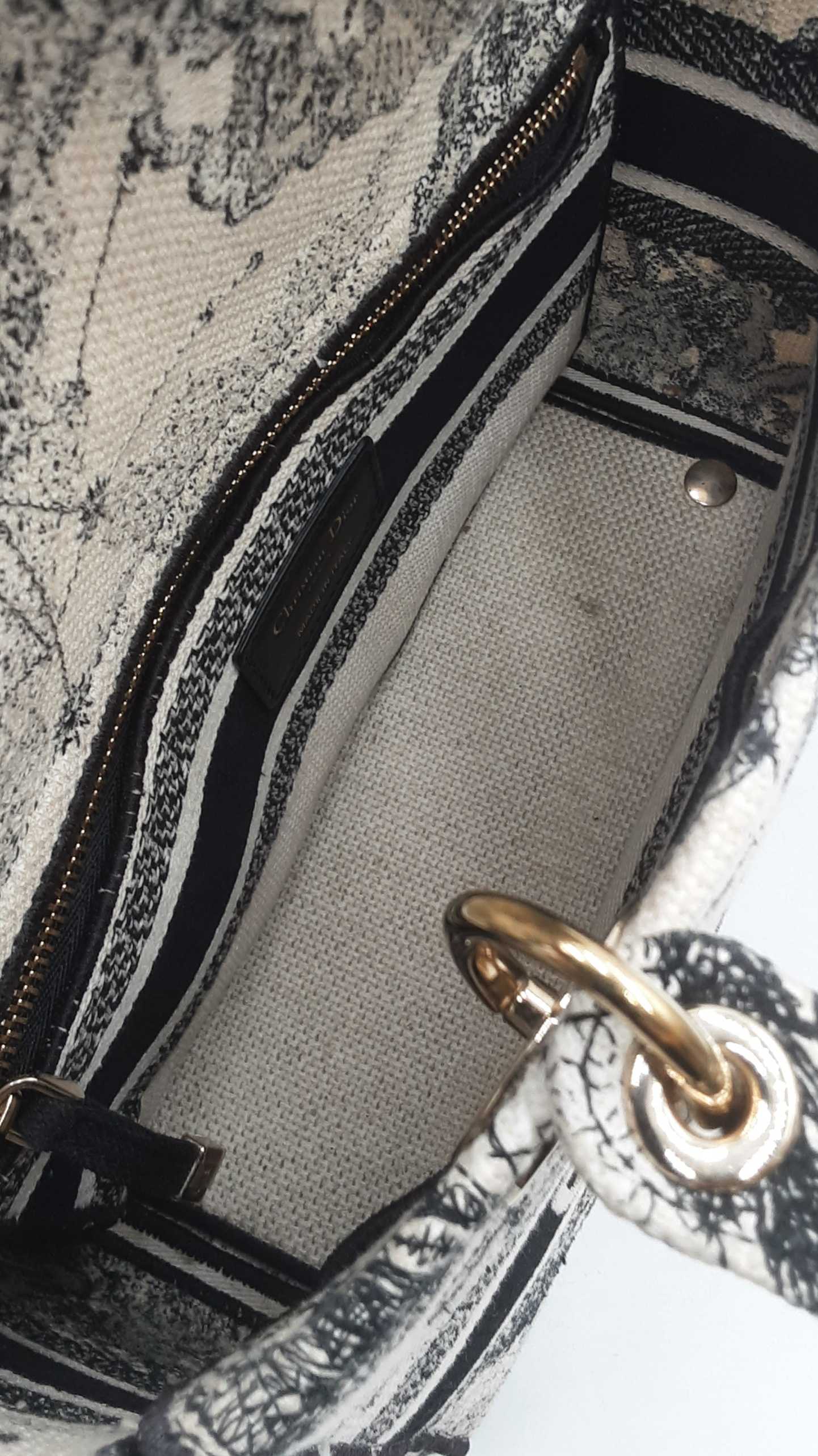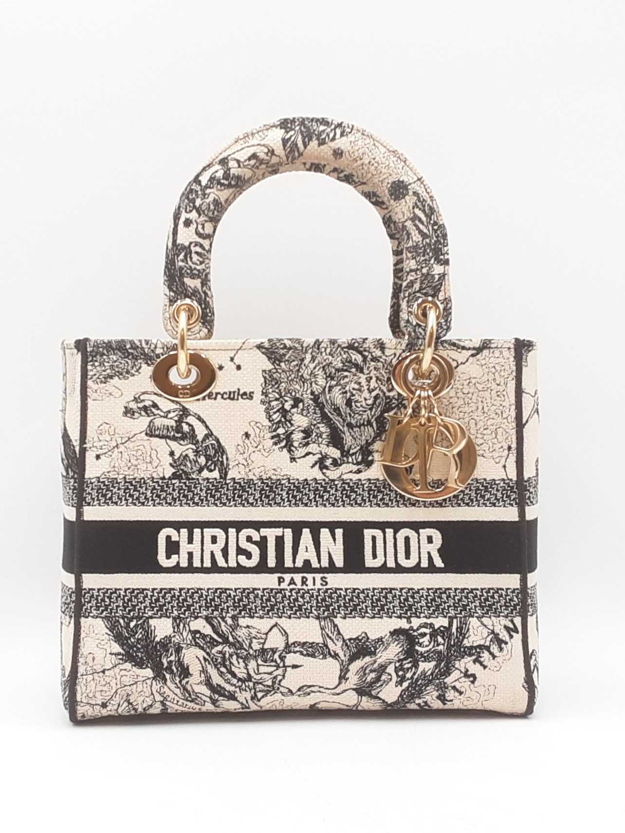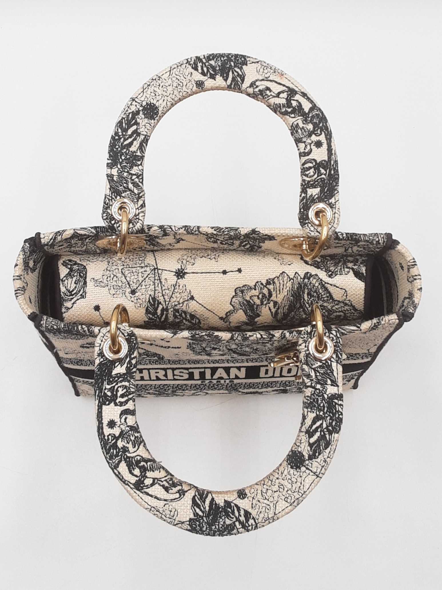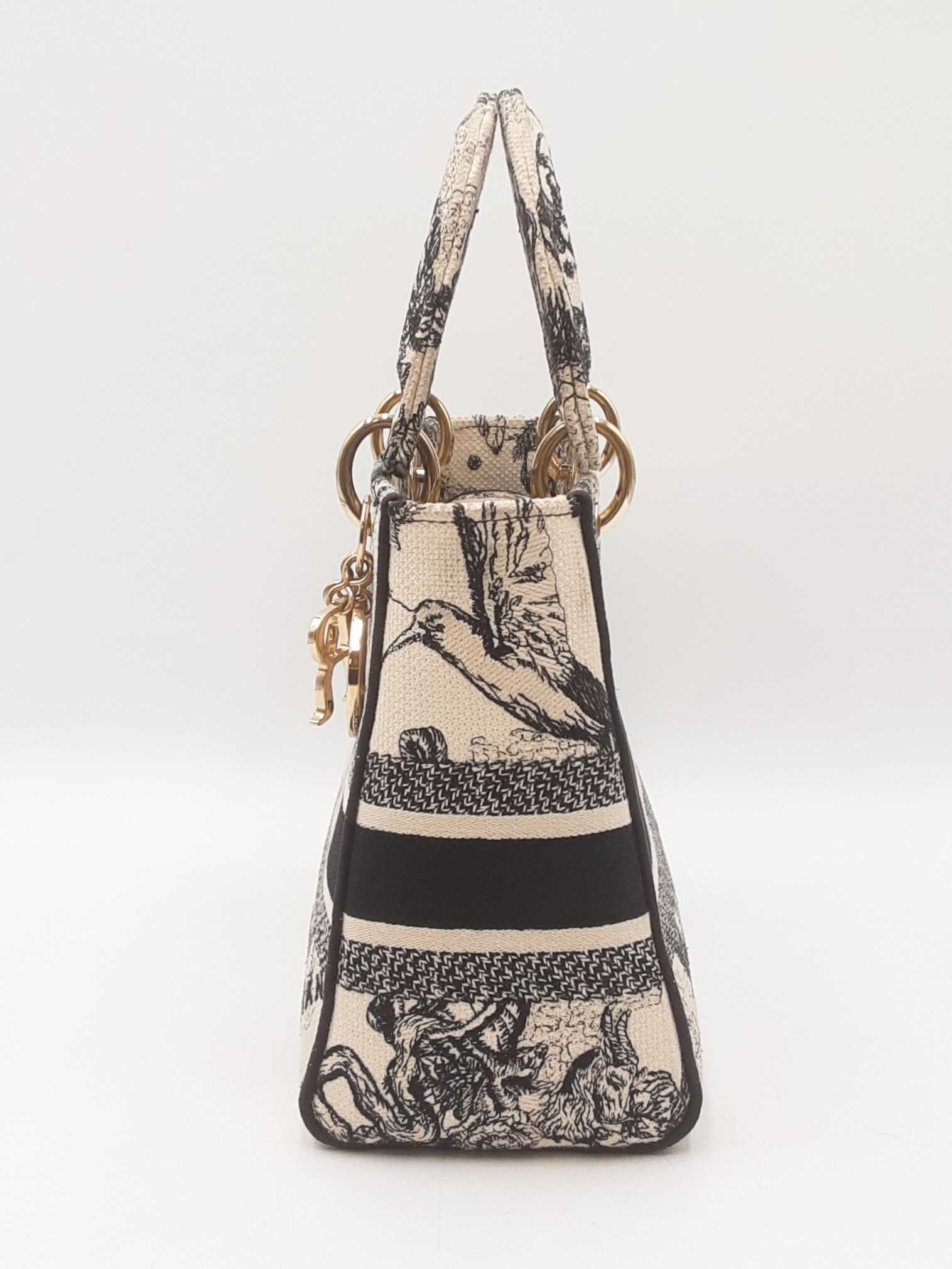 144030024632Christian Dior Lady Dior D-Lite In Toile De Jouy Zodiac Embroidered Canvas. Gold-Tone Hardware. Length 9.5 IN X Height 7.75 IN X Base Width 4.75 IN X Handle Drop 3.75 IN, approximately. Good Pre-Owned Condition. Scratches on hardware, and gold-tone finish wearing off of all bottom studs. Discolored canvas on sides near top of bag, on exterior of flap, and undersides of top handles. Discolorations in interior compartment.