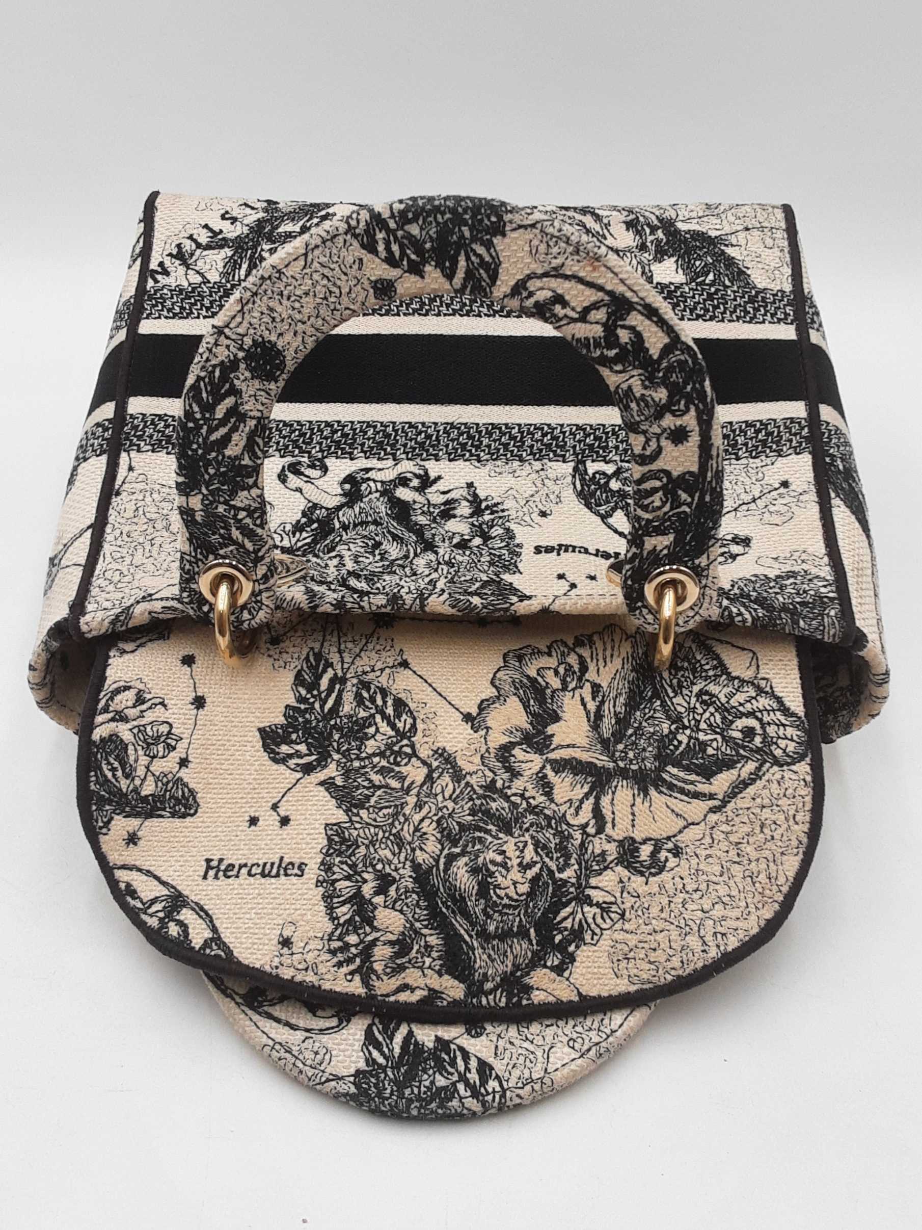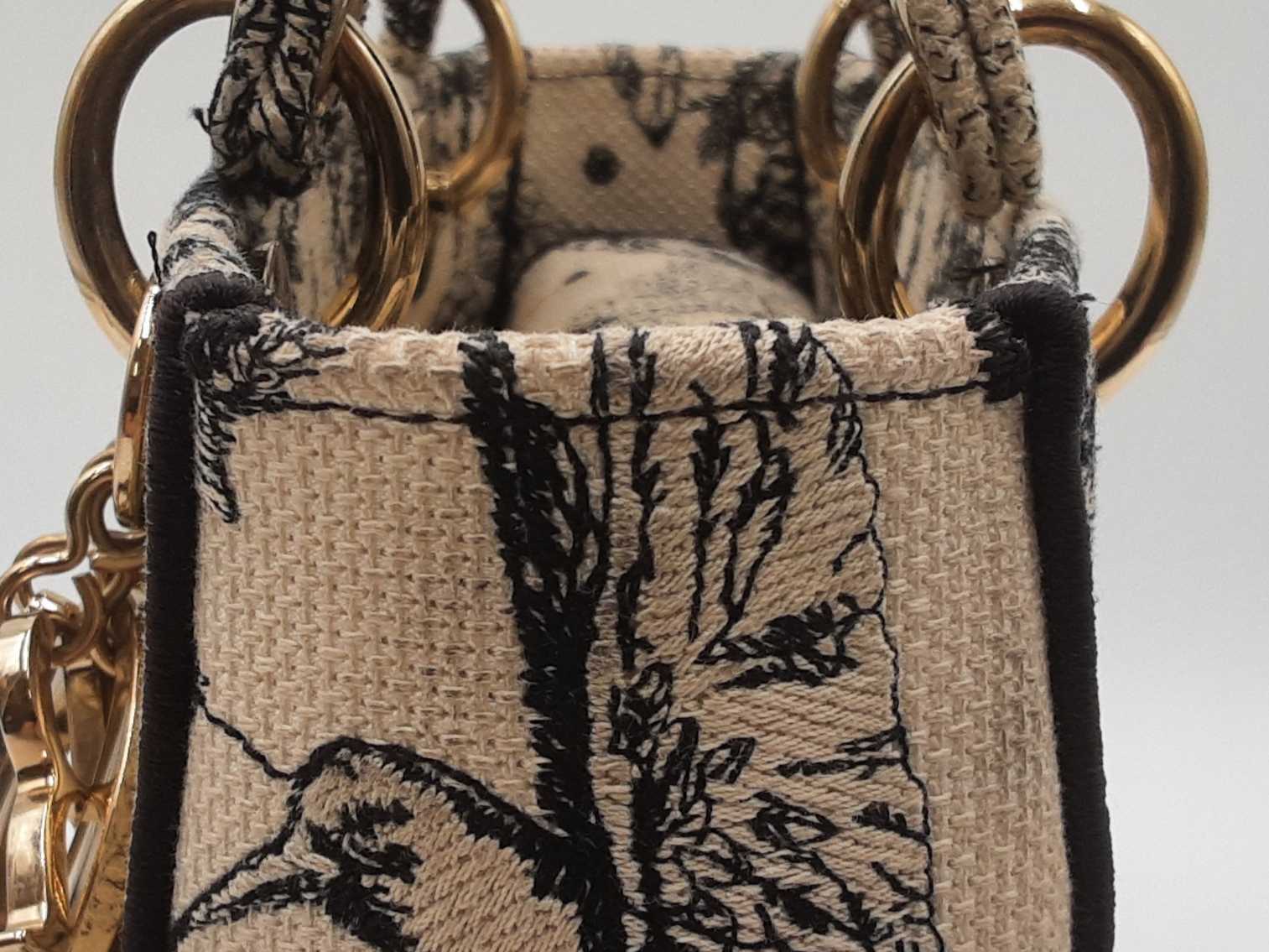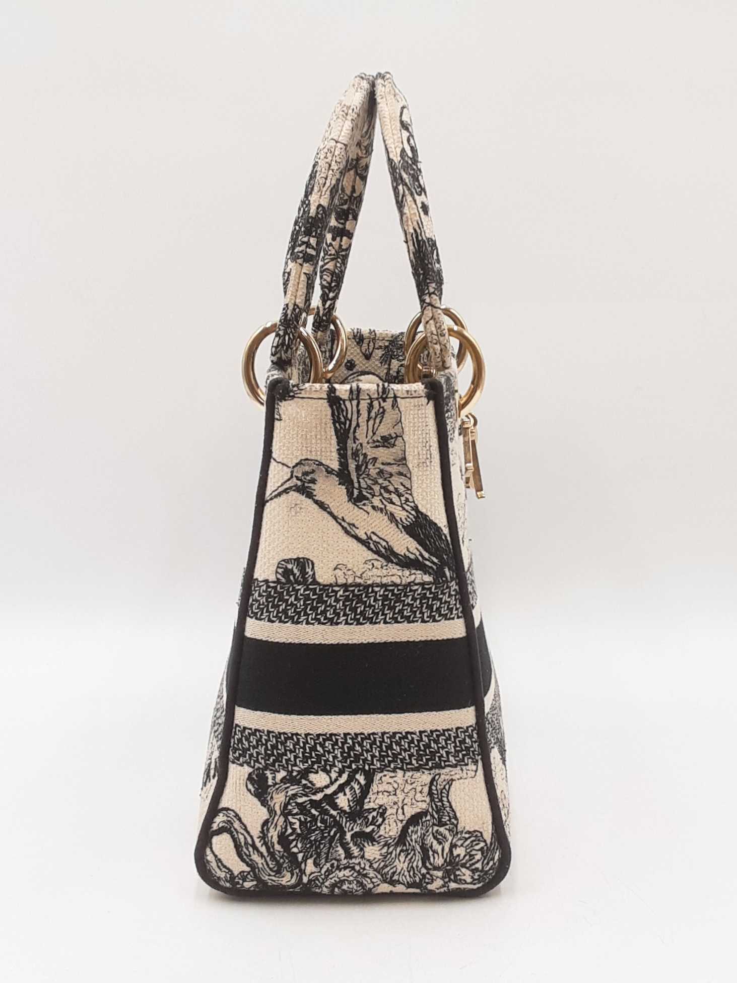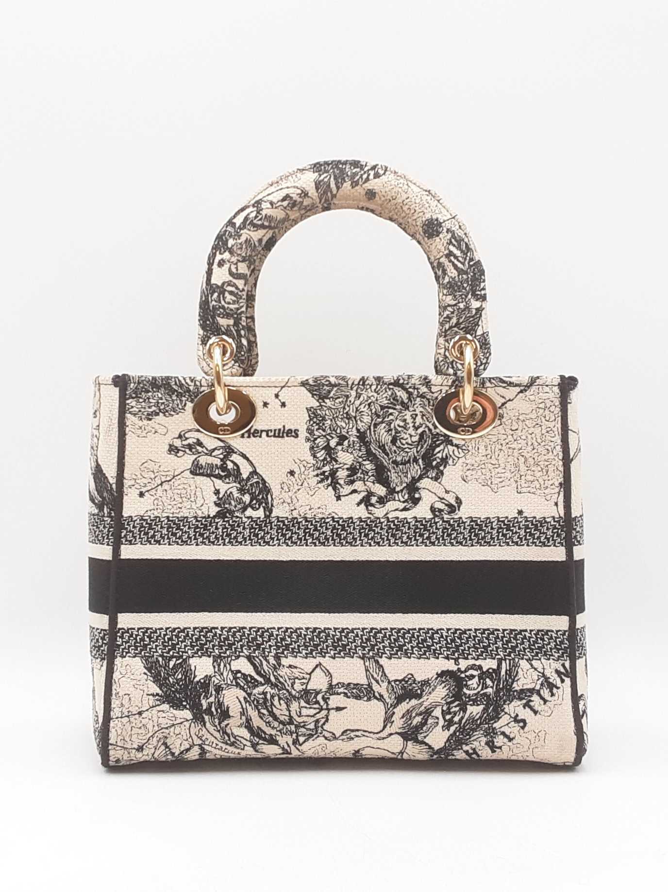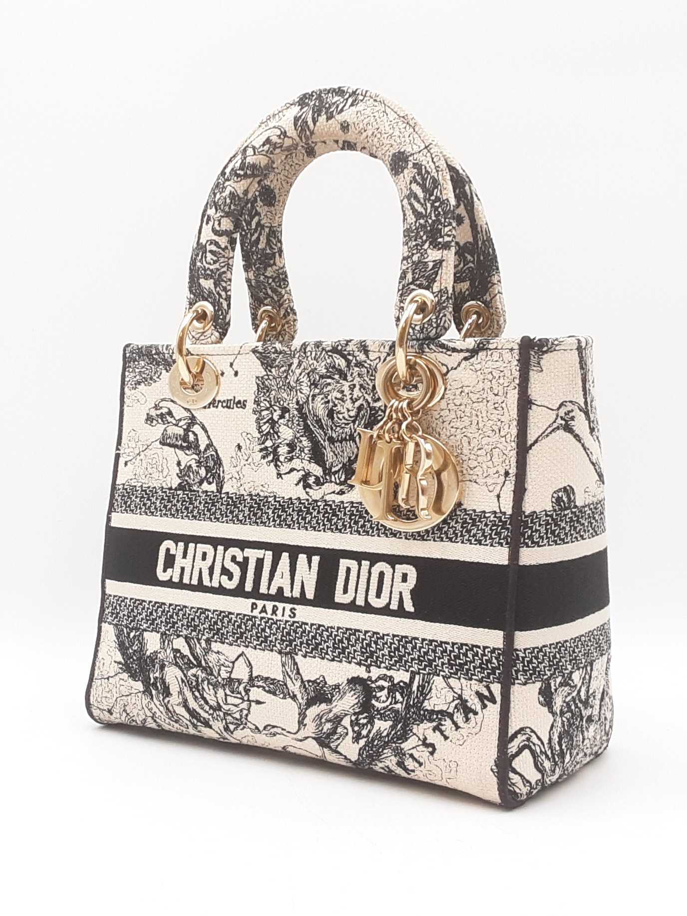144030024632Christian Dior Lady Dior D-Lite In Toile De Jouy Zodiac Embroidered Canvas. Gold-Tone Hardware. Length 9.5 IN X Height 7.75 IN X Base Width 4.75 IN X Handle Drop 3.75 IN, approximately. Good Pre-Owned Condition. Scratches on hardware, and gold-tone finish wearing off of all bottom studs. Discolored canvas on sides near top of bag, on exterior of flap, and undersides of top handles. Discolorations in interior compartment.