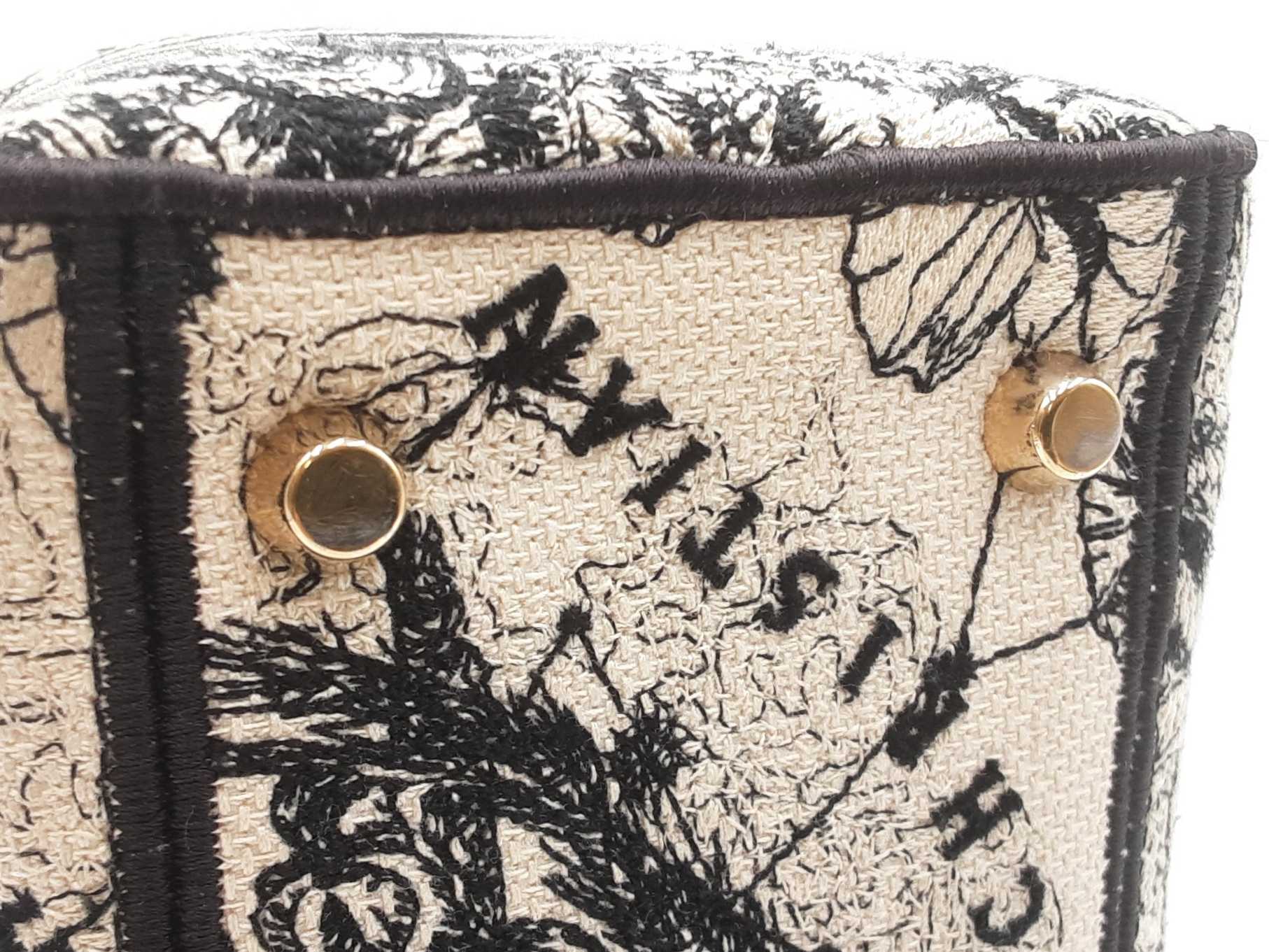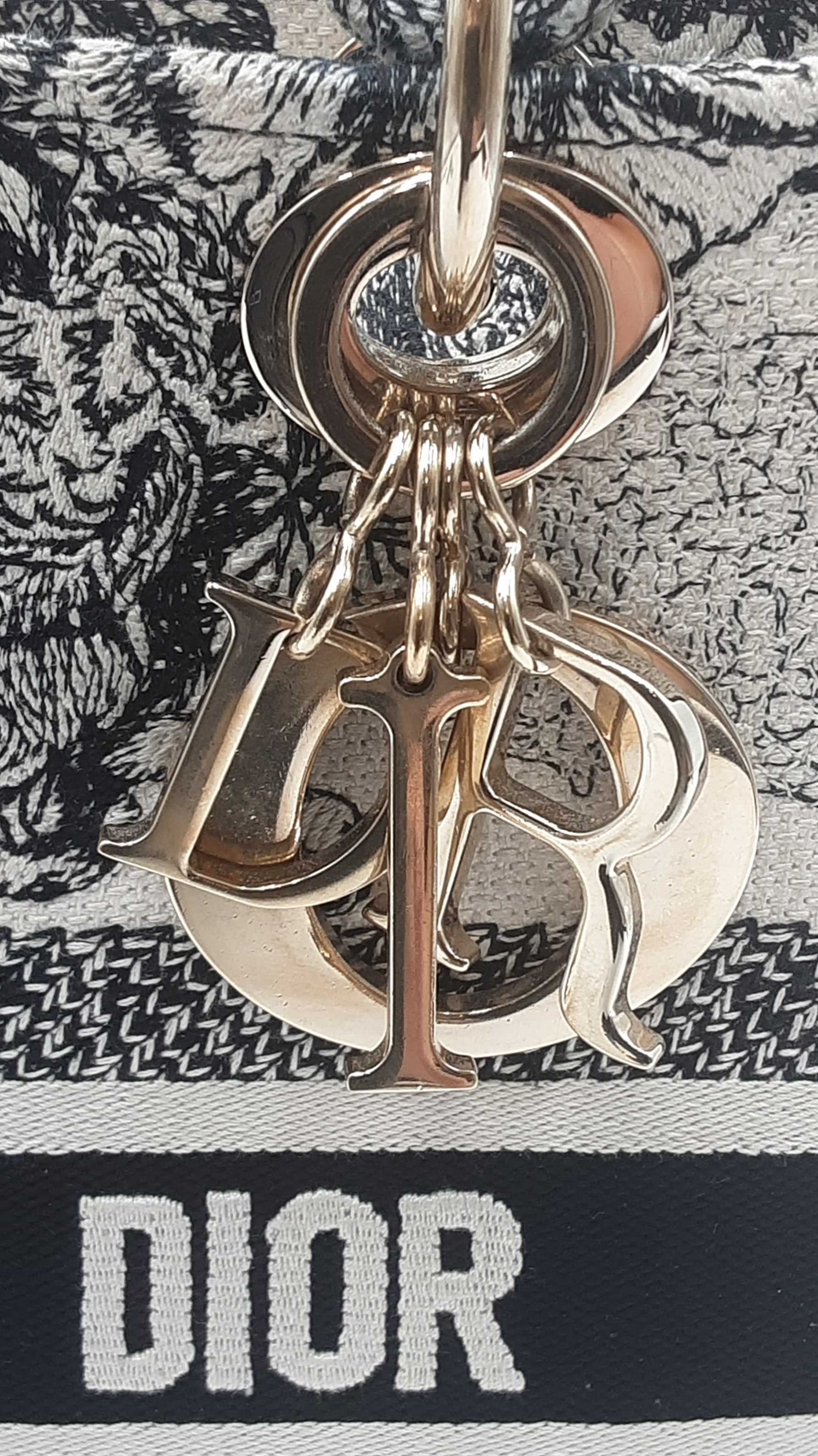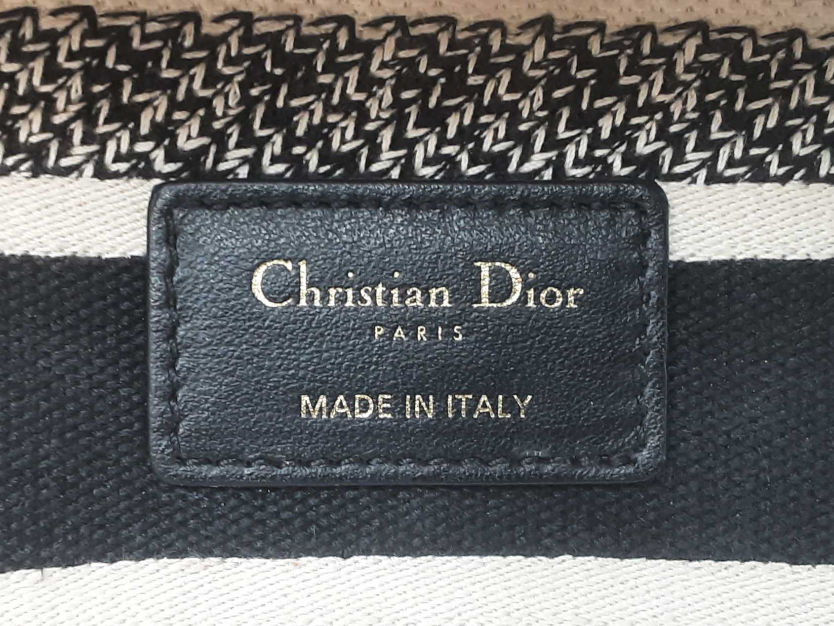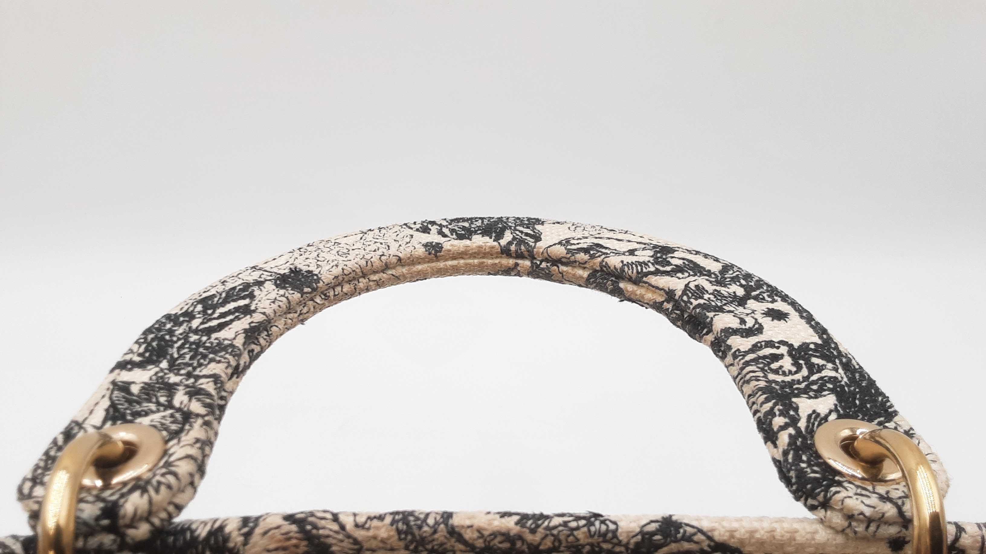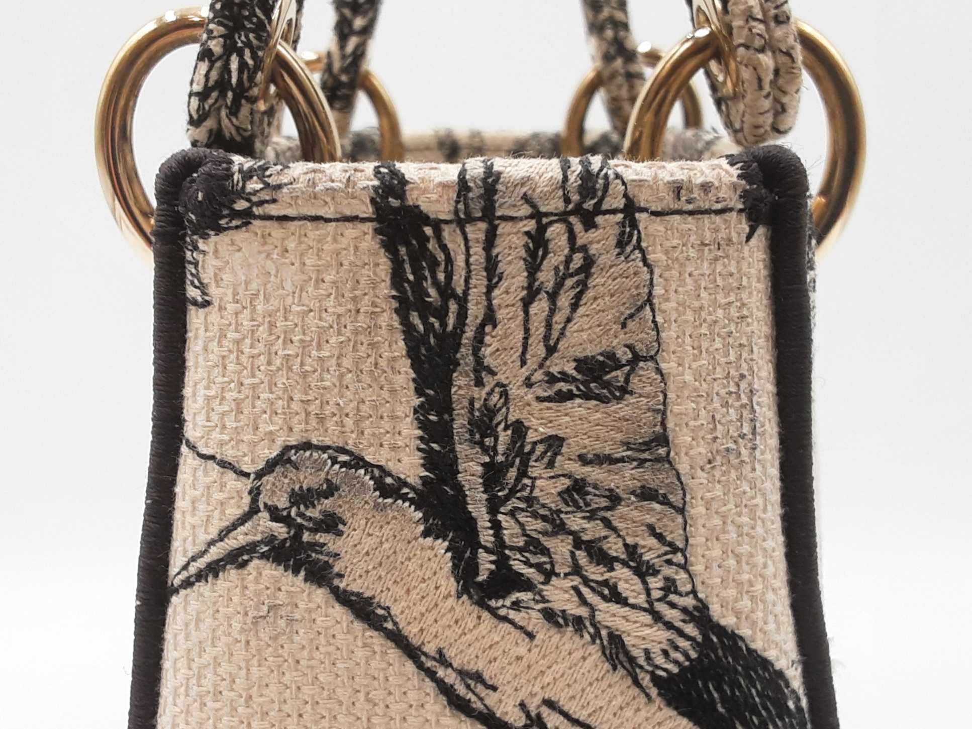 144030024632Christian Dior Lady Dior D-Lite In Toile De Jouy Zodiac Embroidered Canvas. Gold-Tone Hardware. Length 9.5 IN X Height 7.75 IN X Base Width 4.75 IN X Handle Drop 3.75 IN, approximately. Good Pre-Owned Condition. Scratches on hardware, and gold-tone finish wearing off of all bottom studs. Discolored canvas on sides near top of bag, on exterior of flap, and undersides of top handles. Discolorations in interior compartment.