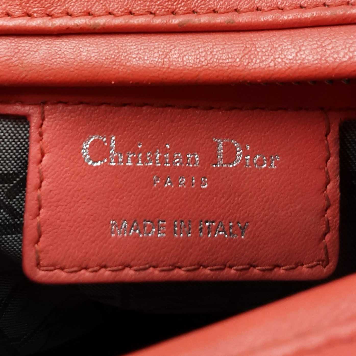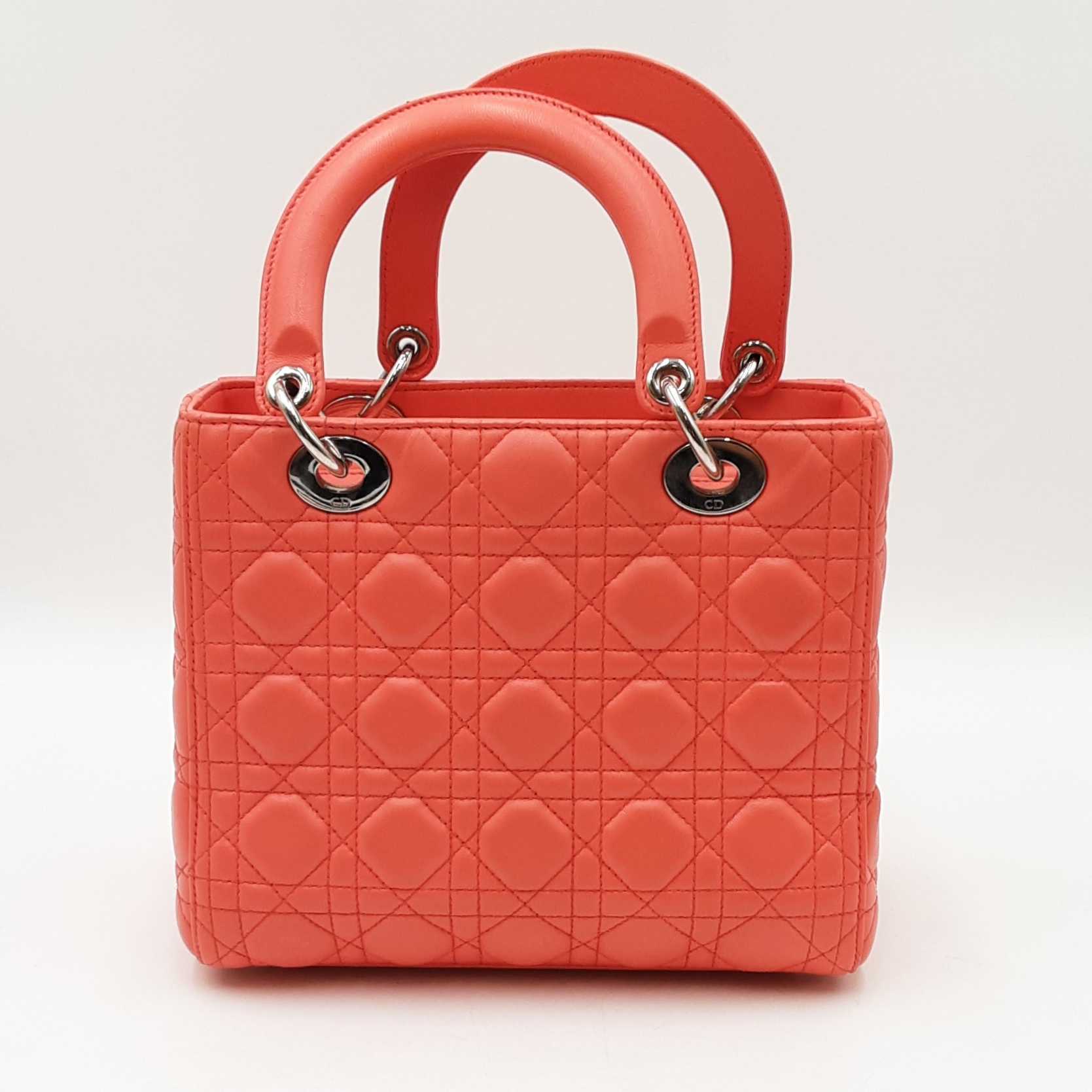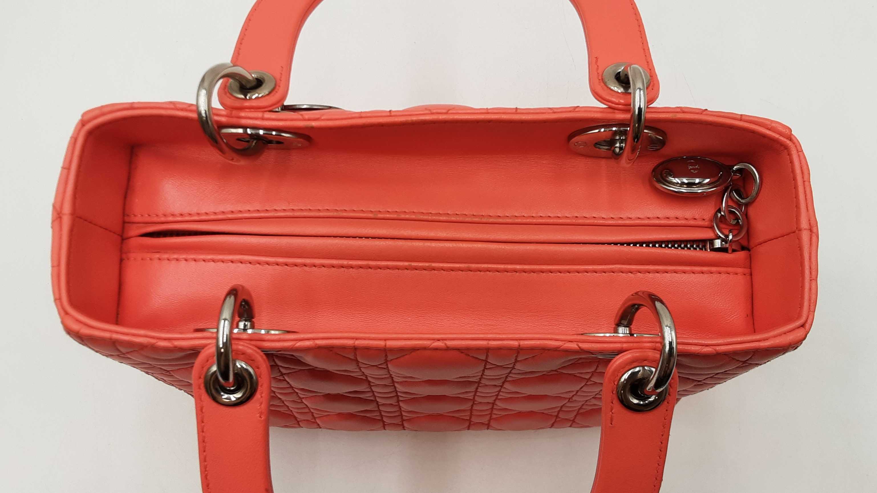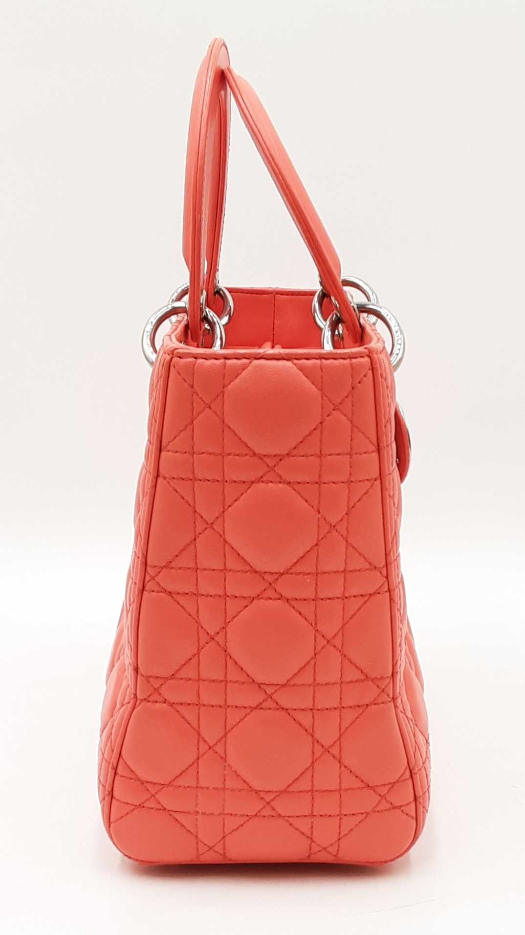 144030022719Christian Dior Lambskin Cannage Lady Dior Coral Hand Bag. Stainless Steel Hardware. Approximate measurements Height 8 IN X Length 10 IN X Width 5 IN. Scratches on hardware. Marks on the outside of the bag. Black mark on bottom. Both handles have wear on them as pictured. Interior has dust and debris. Entrupy Certificate Card #XD83H7G