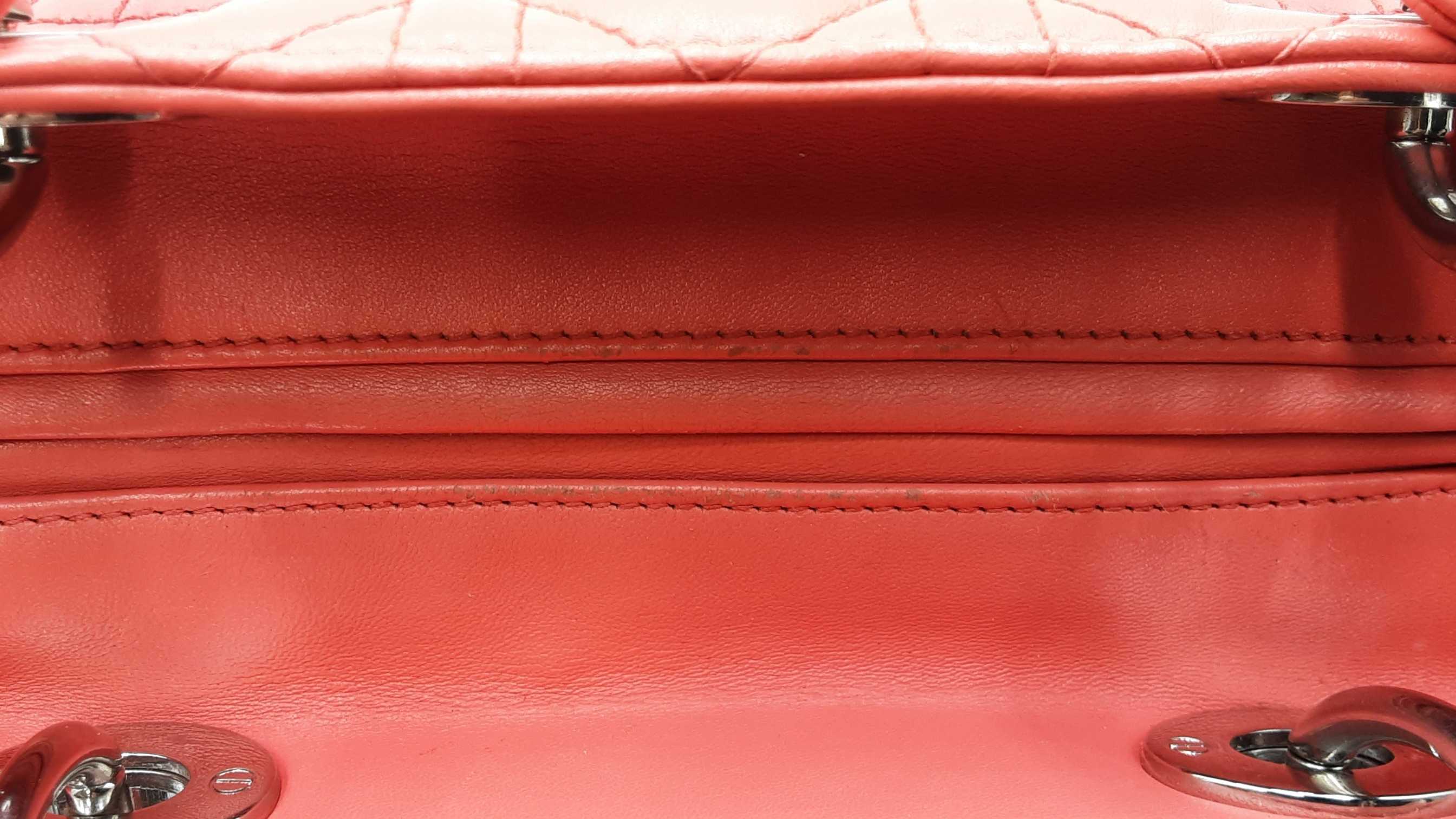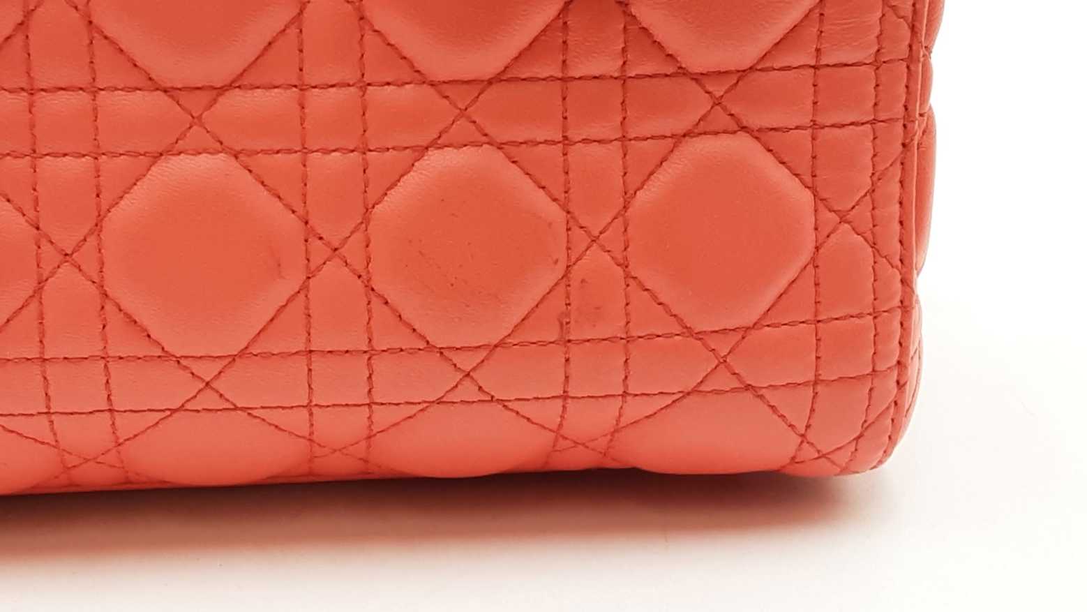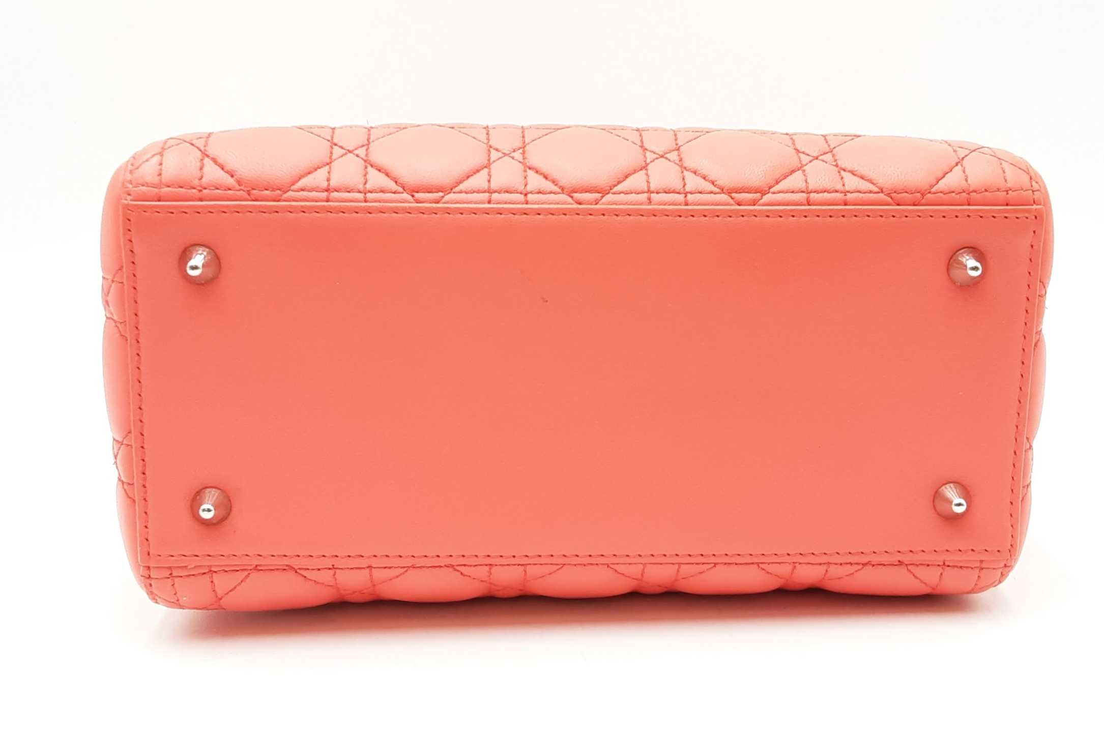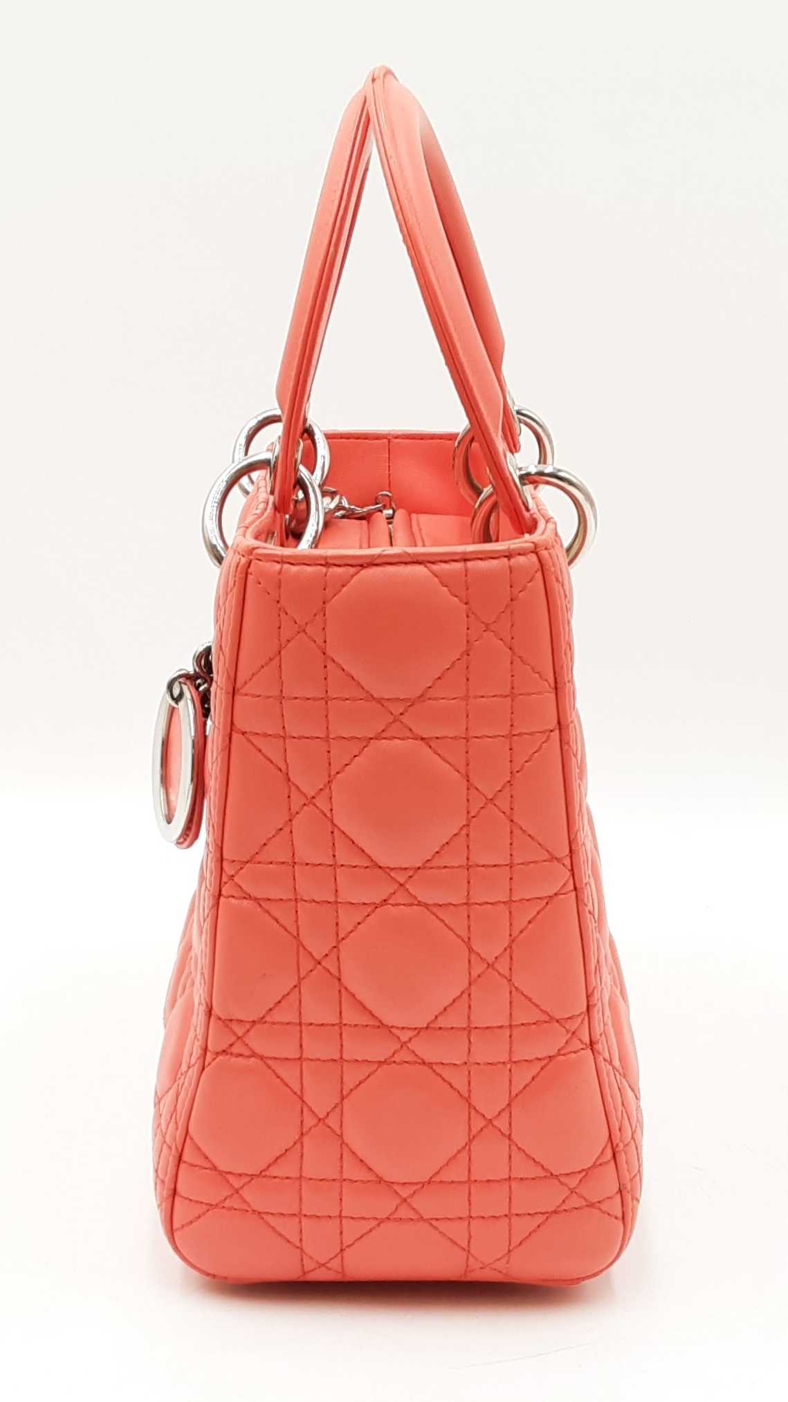 144030022719Christian Dior Lambskin Cannage Lady Dior Coral Hand Bag. Stainless Steel Hardware. Approximate measurements Height 8 IN X Length 10 IN X Width 5 IN. Scratches on hardware. Marks on the outside of the bag. Black mark on bottom. Both handles have wear on them as pictured. Interior has dust and debris. Entrupy Certificate Card #XD83H7G