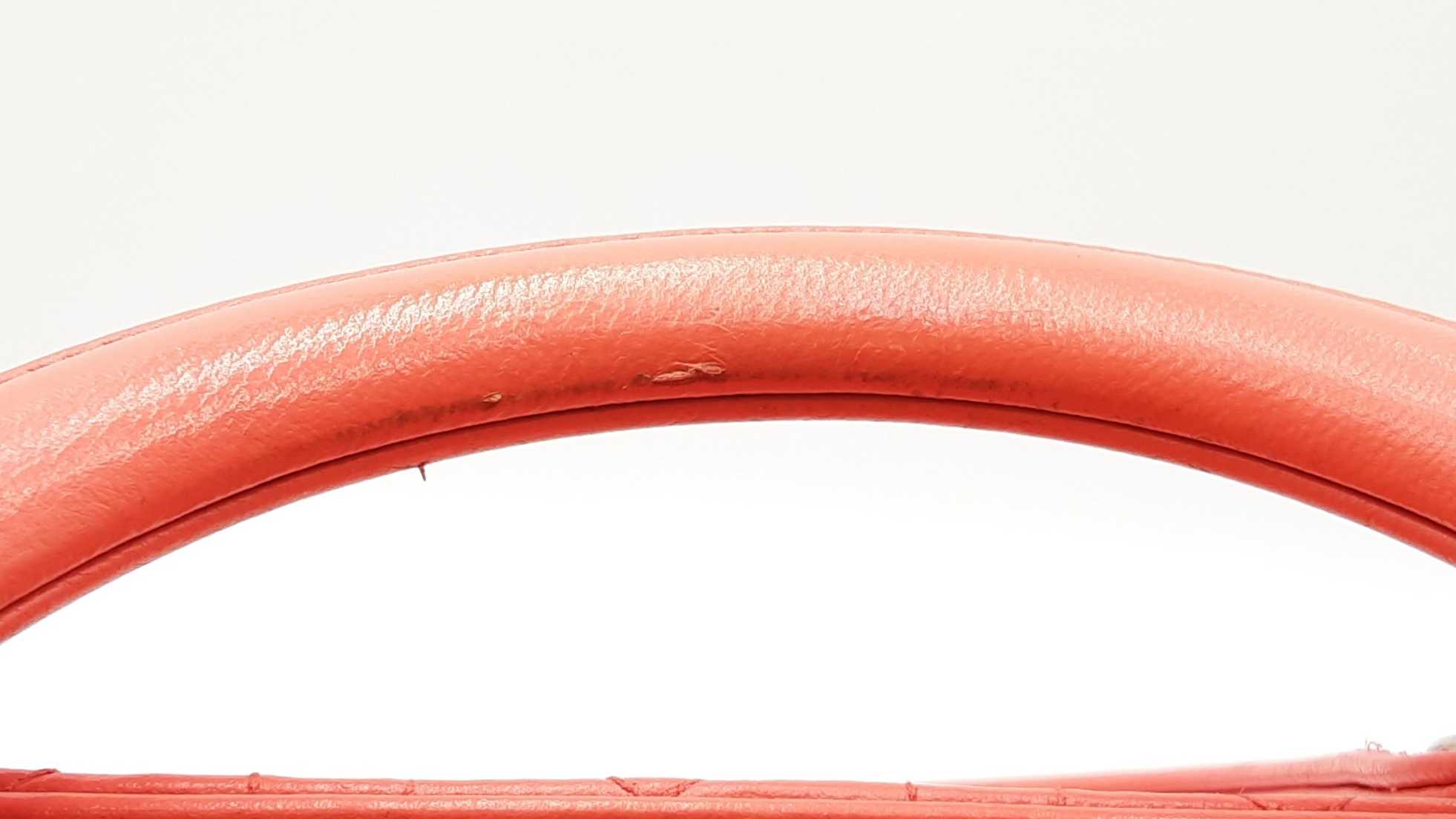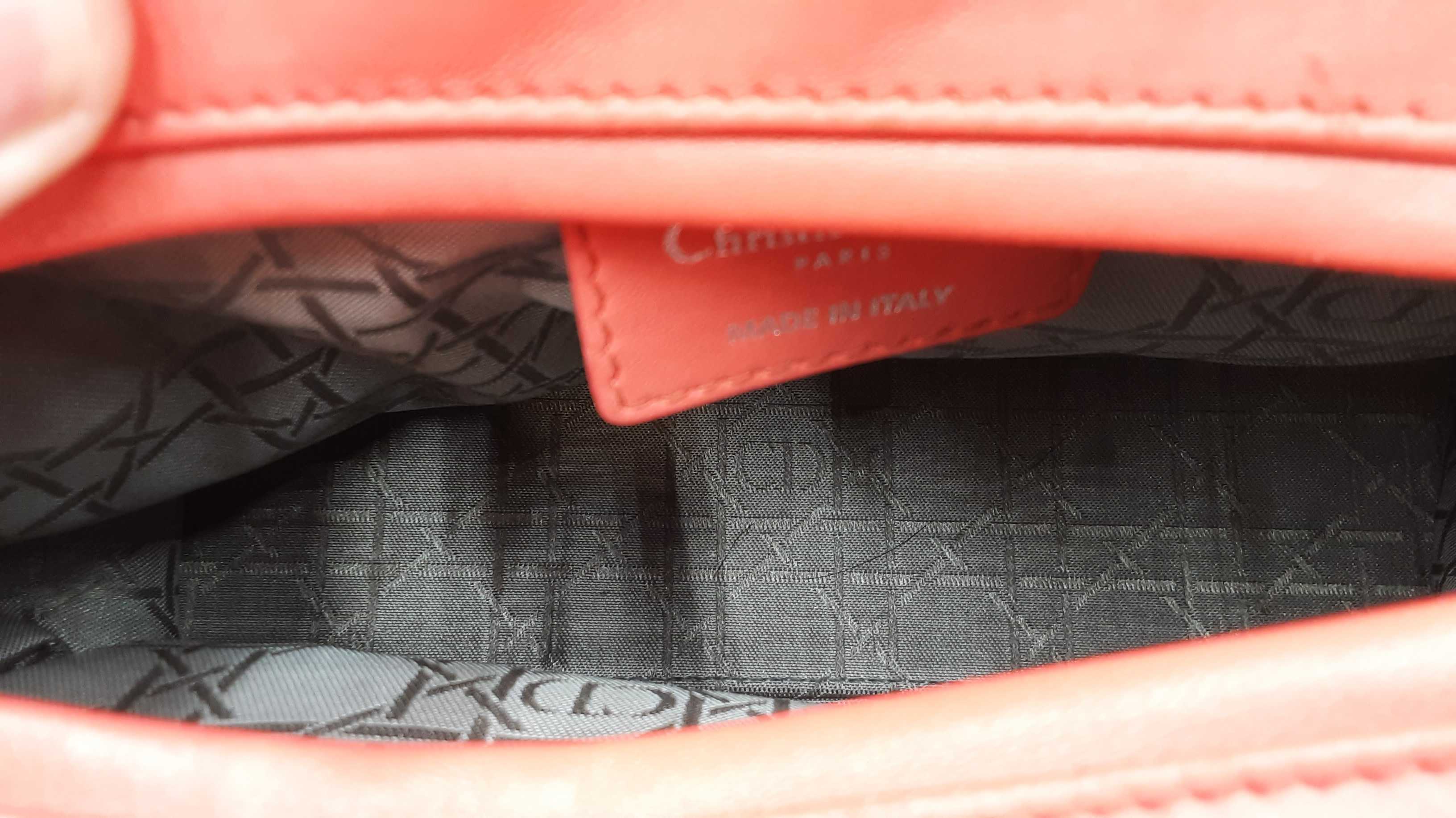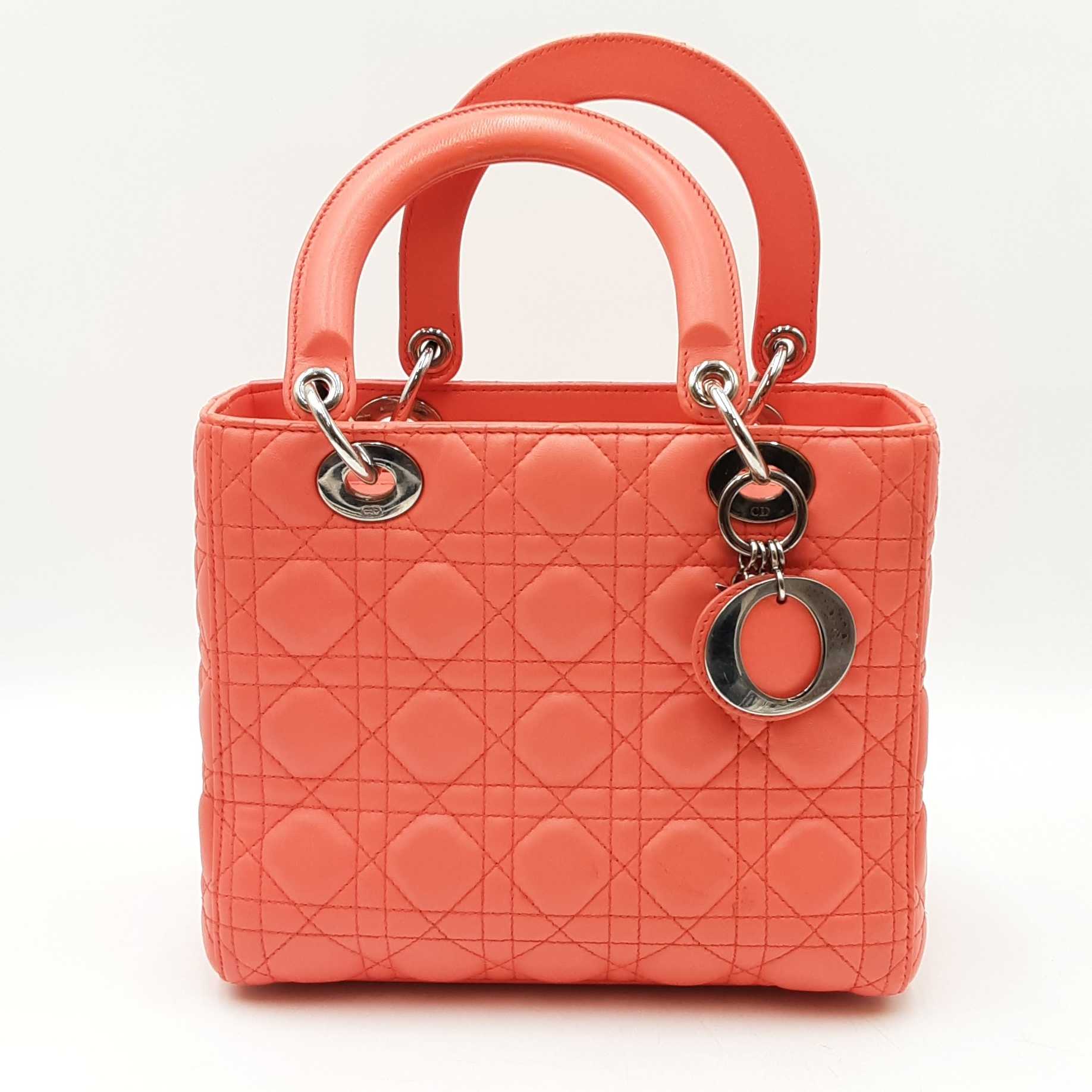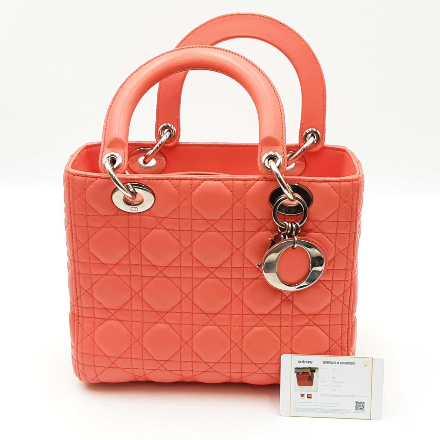 144030022719Christian Dior Lambskin Cannage Lady Dior Coral Hand Bag. Stainless Steel Hardware. Approximate measurements Height 8 IN X Length 10 IN X Width 5 IN. Scratches on hardware. Marks on the outside of the bag. Black mark on bottom. Both handles have wear on them as pictured. Interior has dust and debris. Entrupy Certificate Card #XD83H7G