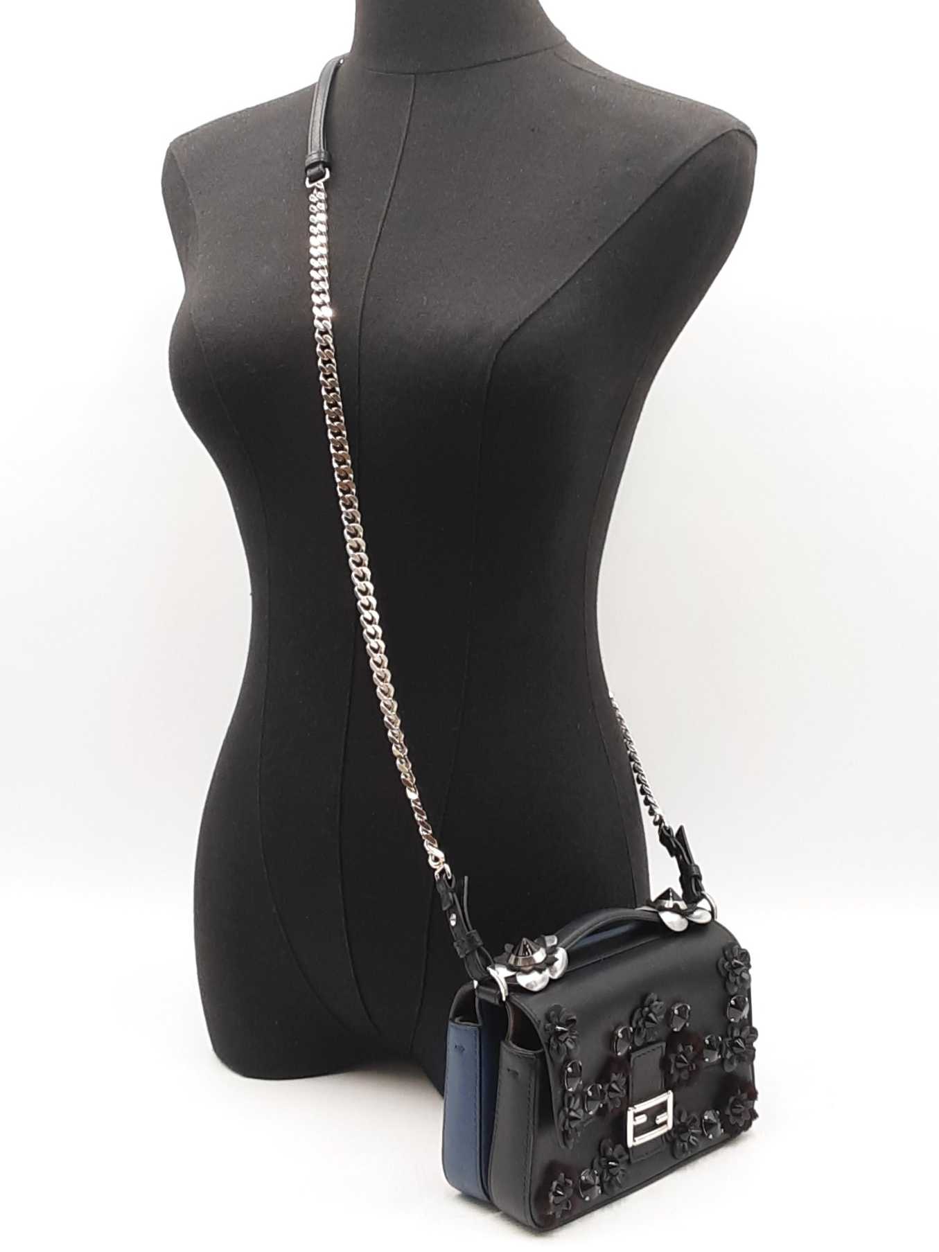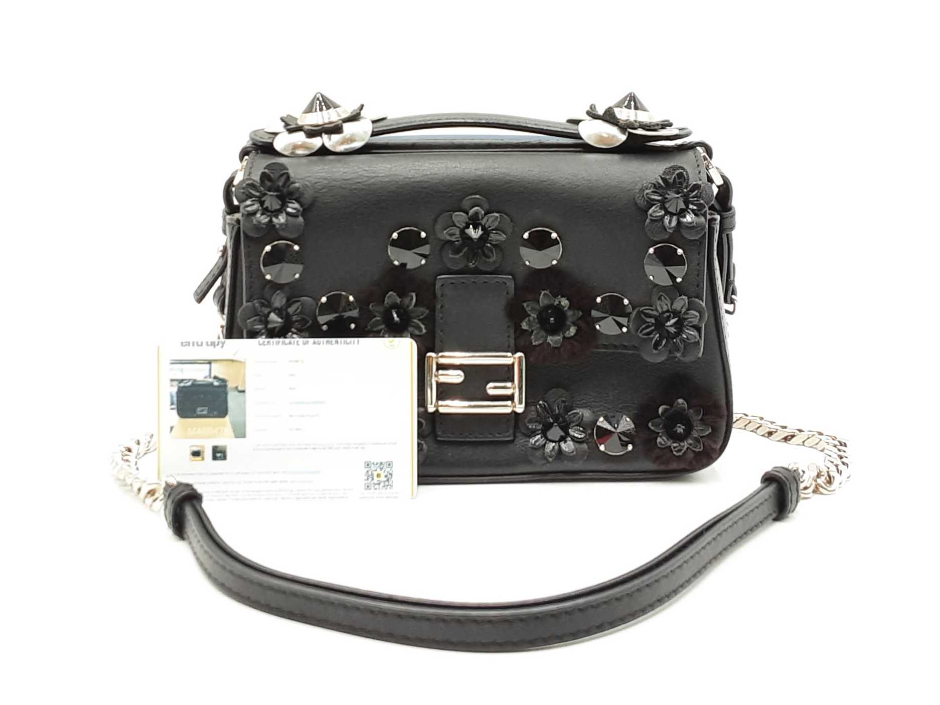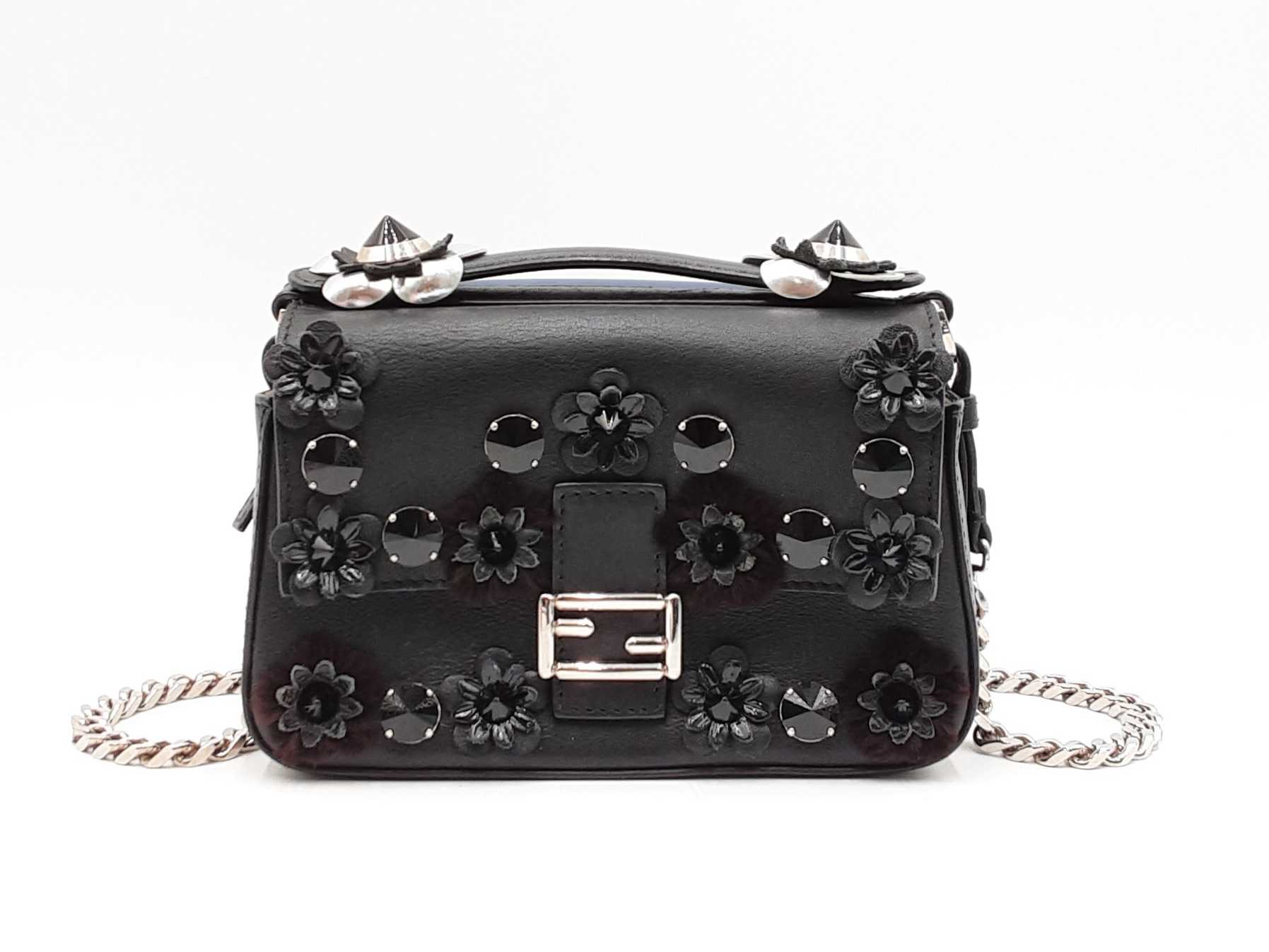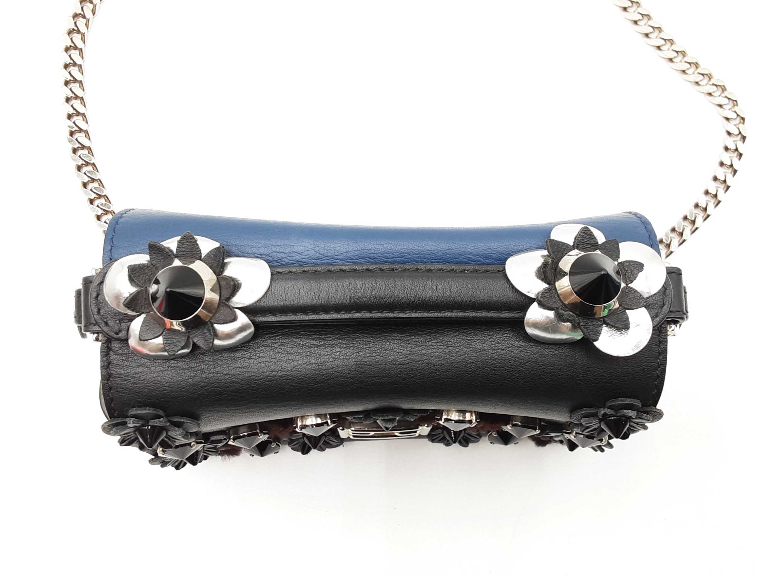 144030019684Fendi Flowerland Micro Double Baguette In Bicolor Vitello Dolce Leather. Silver-Tone Hardware. Height 4.5 X Length 7 X Width 2.5 (1.25 each compartment) X Handle Drop 1.5 X Shoulder Drop 22.5 inches, approximately. Great Pre-Owned Condition. Scratches on hardware. Creasing and light scuffs throughout leather. Creasing and wear on floral embellishments and studs. Small discoloration in interior of one compartment. Entrupy Certificate # M4BB47X