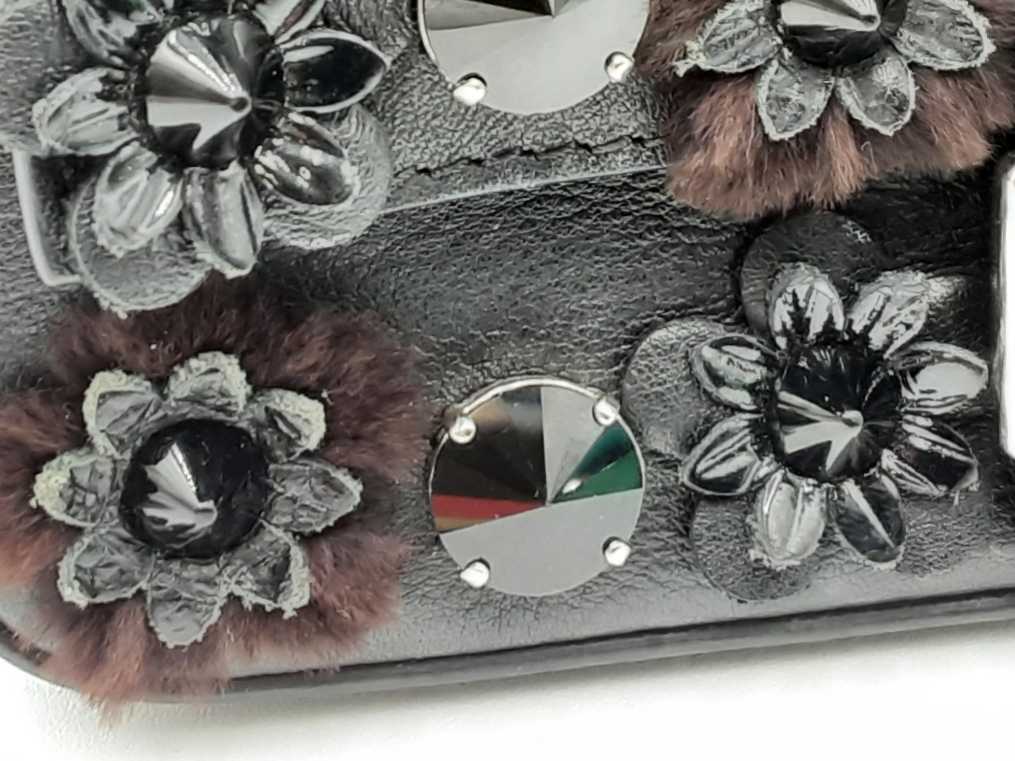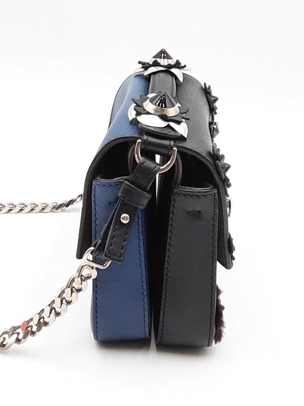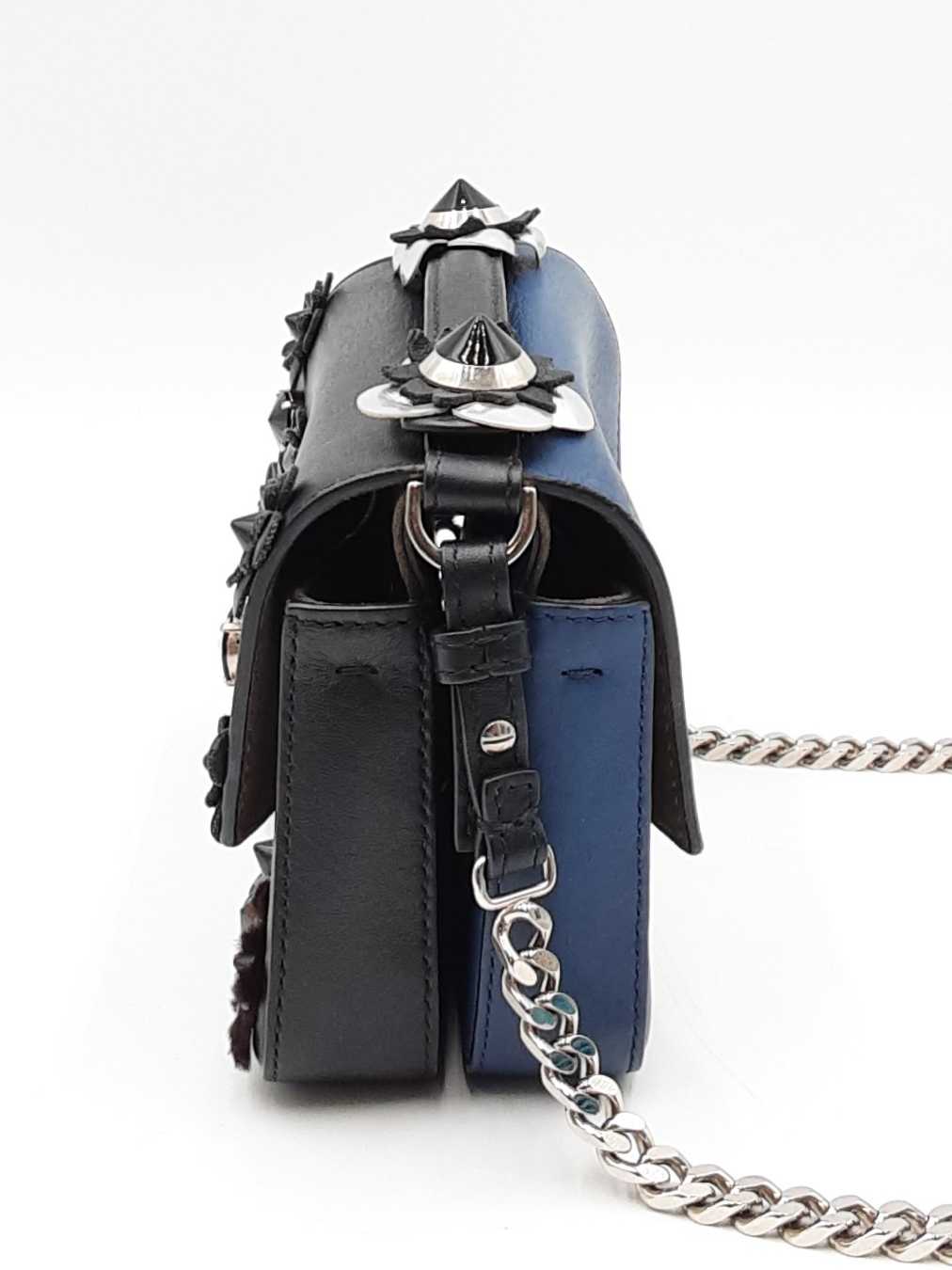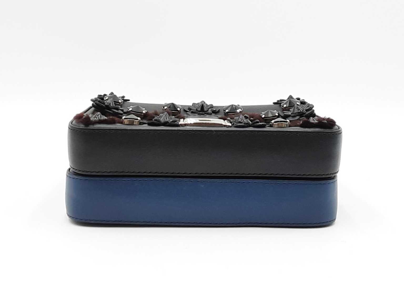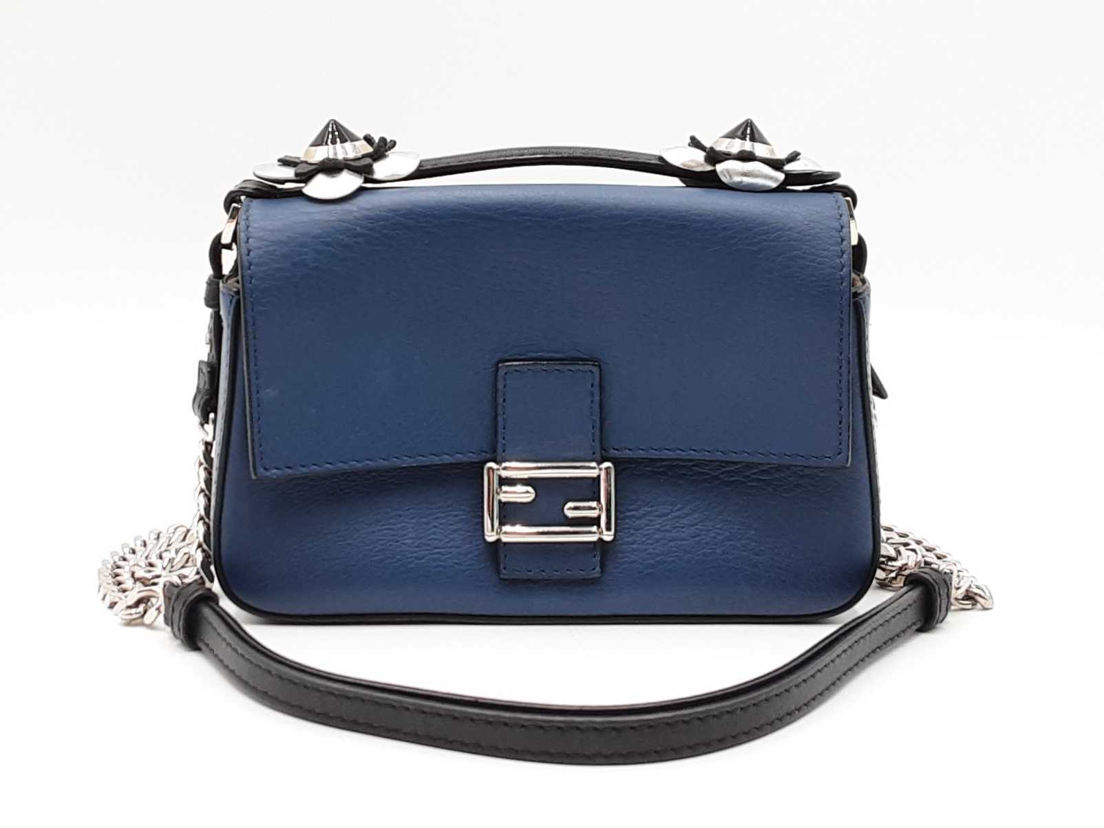 144030019684Fendi Flowerland Micro Double Baguette In Bicolor Vitello Dolce Leather. Silver-Tone Hardware. Height 4.5 X Length 7 X Width 2.5 (1.25 each compartment) X Handle Drop 1.5 X Shoulder Drop 22.5 inches, approximately. Great Pre-Owned Condition. Scratches on hardware. Creasing and light scuffs throughout leather. Creasing and wear on floral embellishments and studs. Small discoloration in interior of one compartment. Entrupy Certificate # M4BB47X