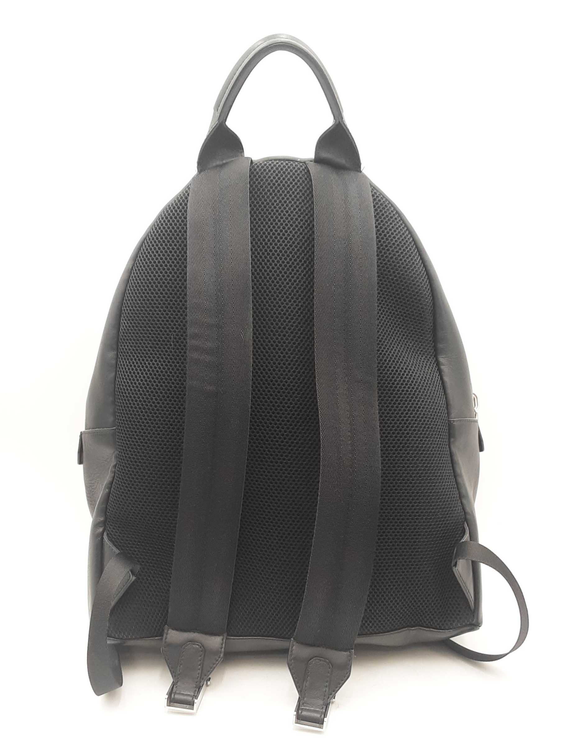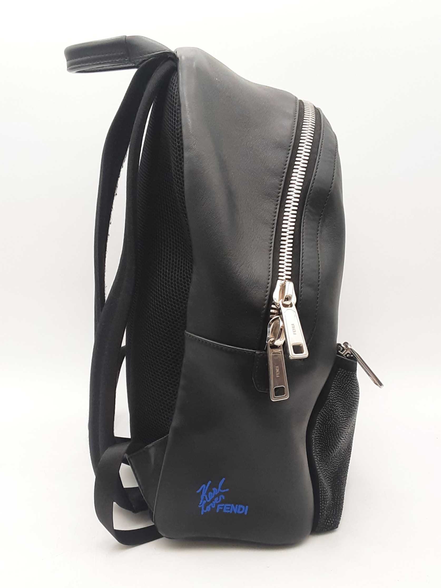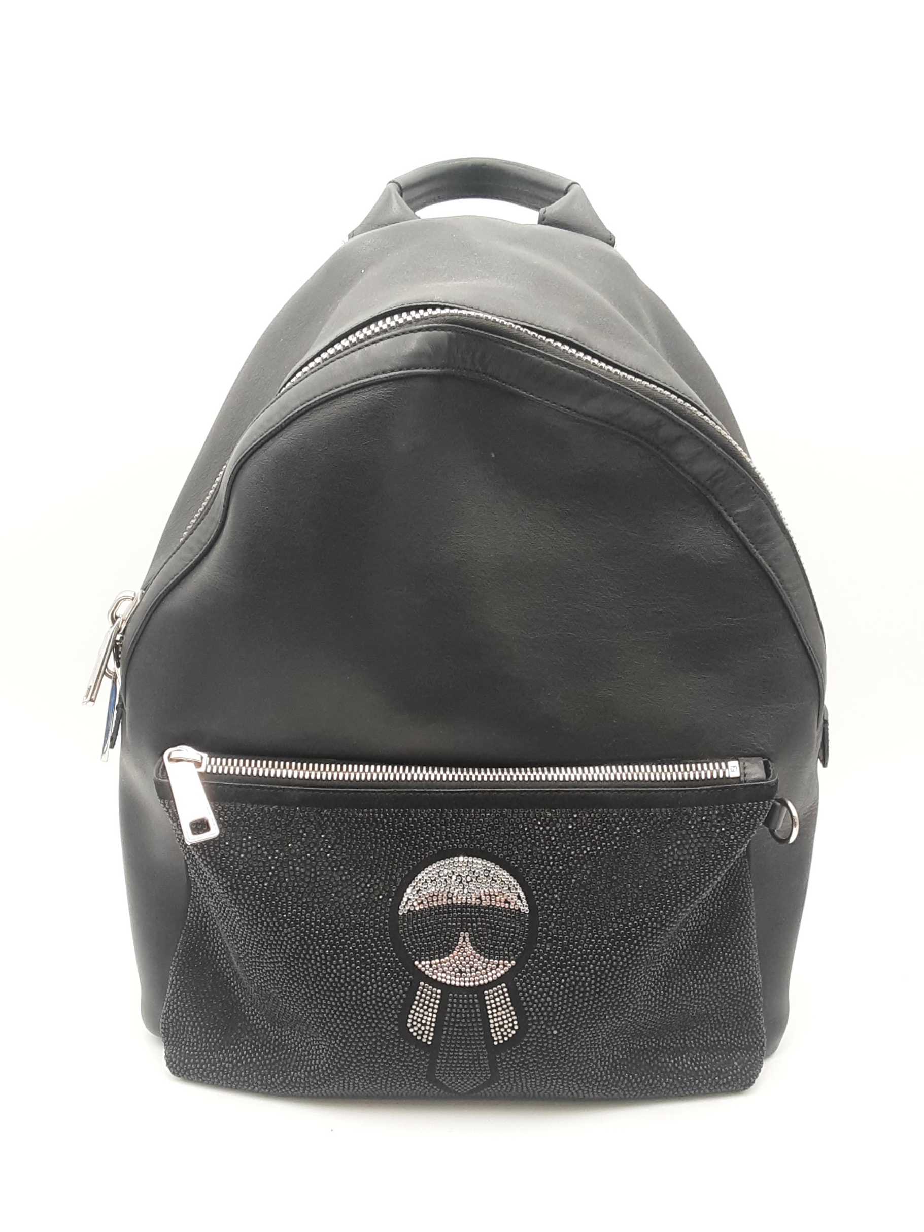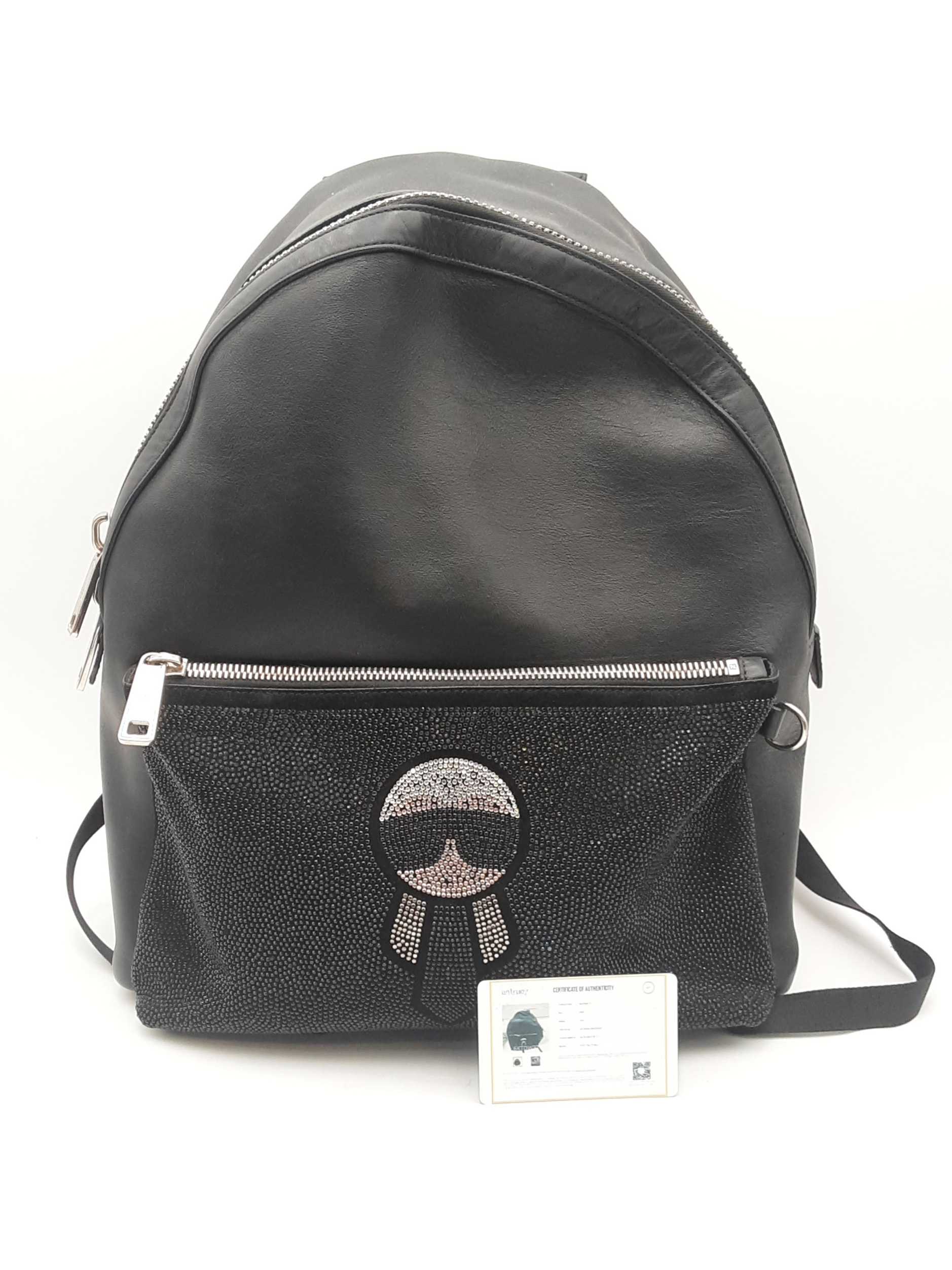 144010047627Fendi Karlito Karl Lagerfeld Black Leather Backpack. Stainless Steel Hardware. Approximate measurements Height 16 IN X Length 13 IN X Width 7 IN. Great Pre-Owned Condition. Scratches on hardware. One bead is missing on exterior. Part of fabric appears that it was caught in zipper and tore. Interior has light dust and debris. Entrupy Certificate Card #6KTDW37