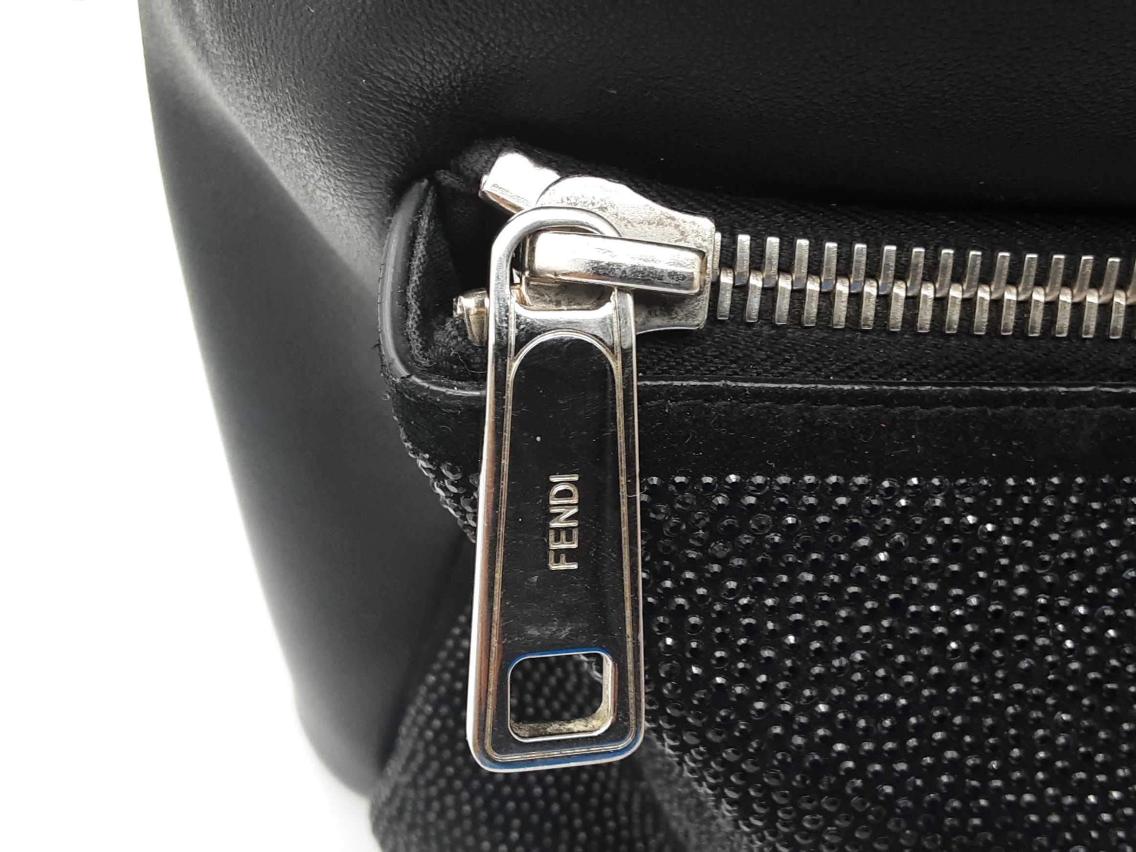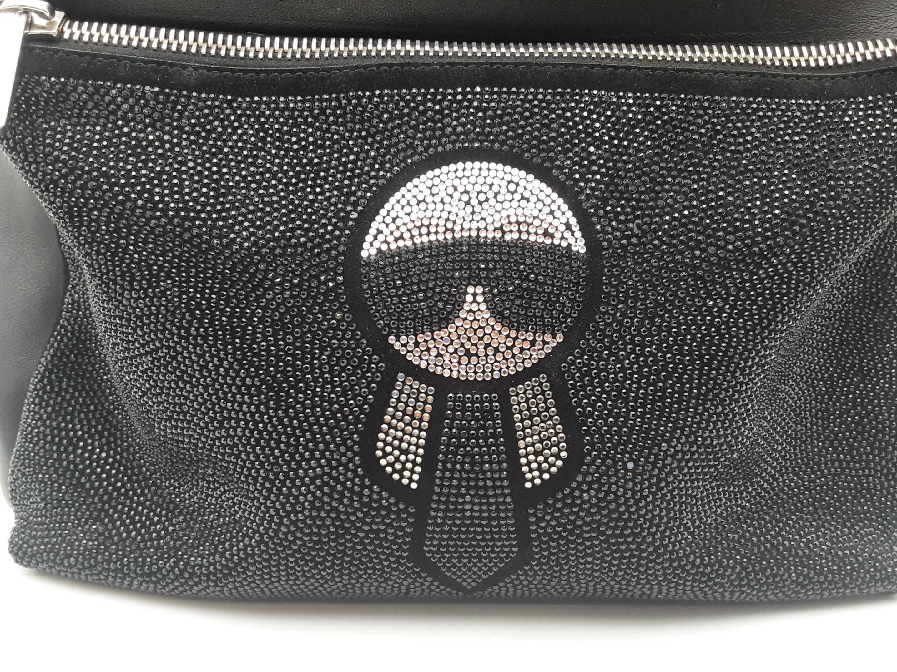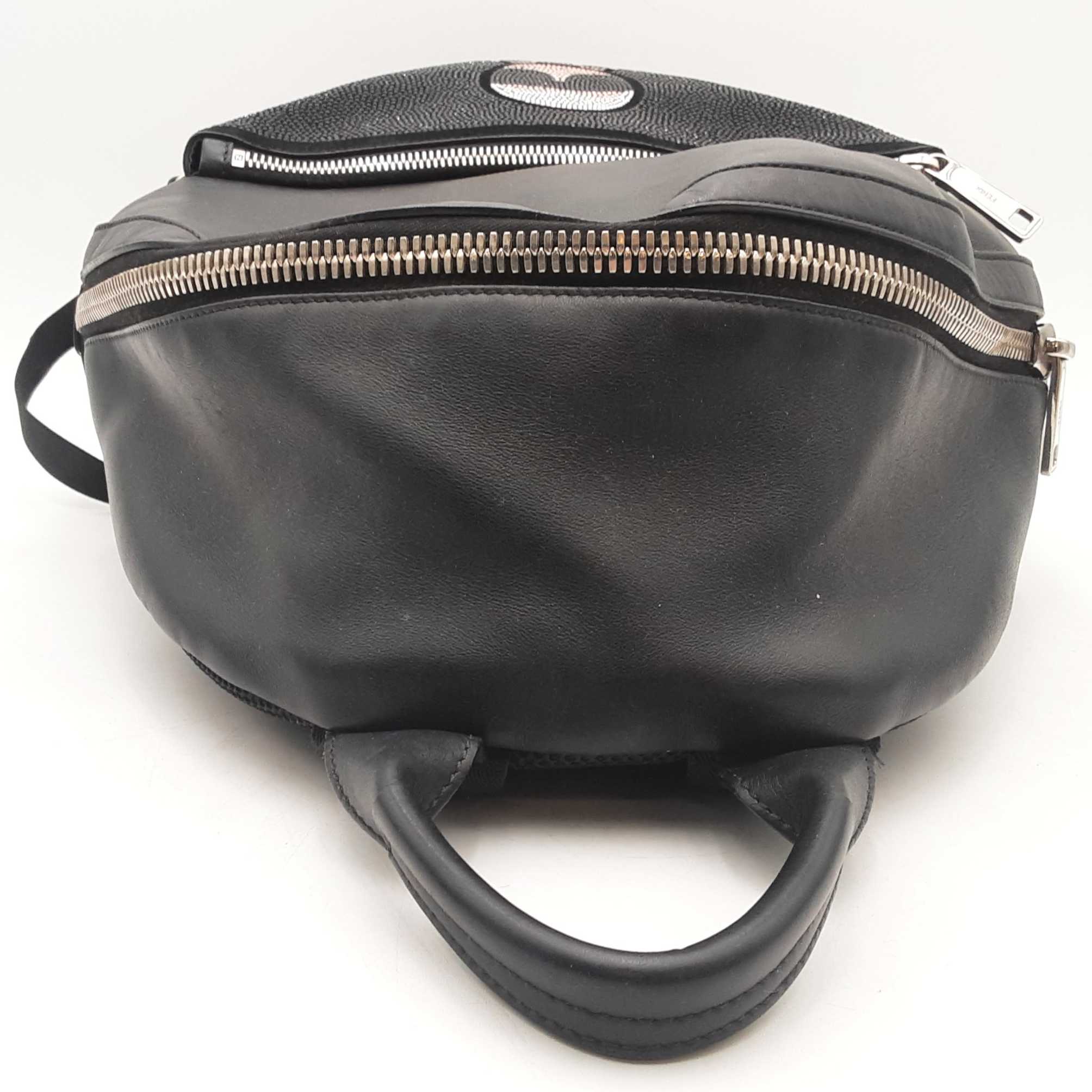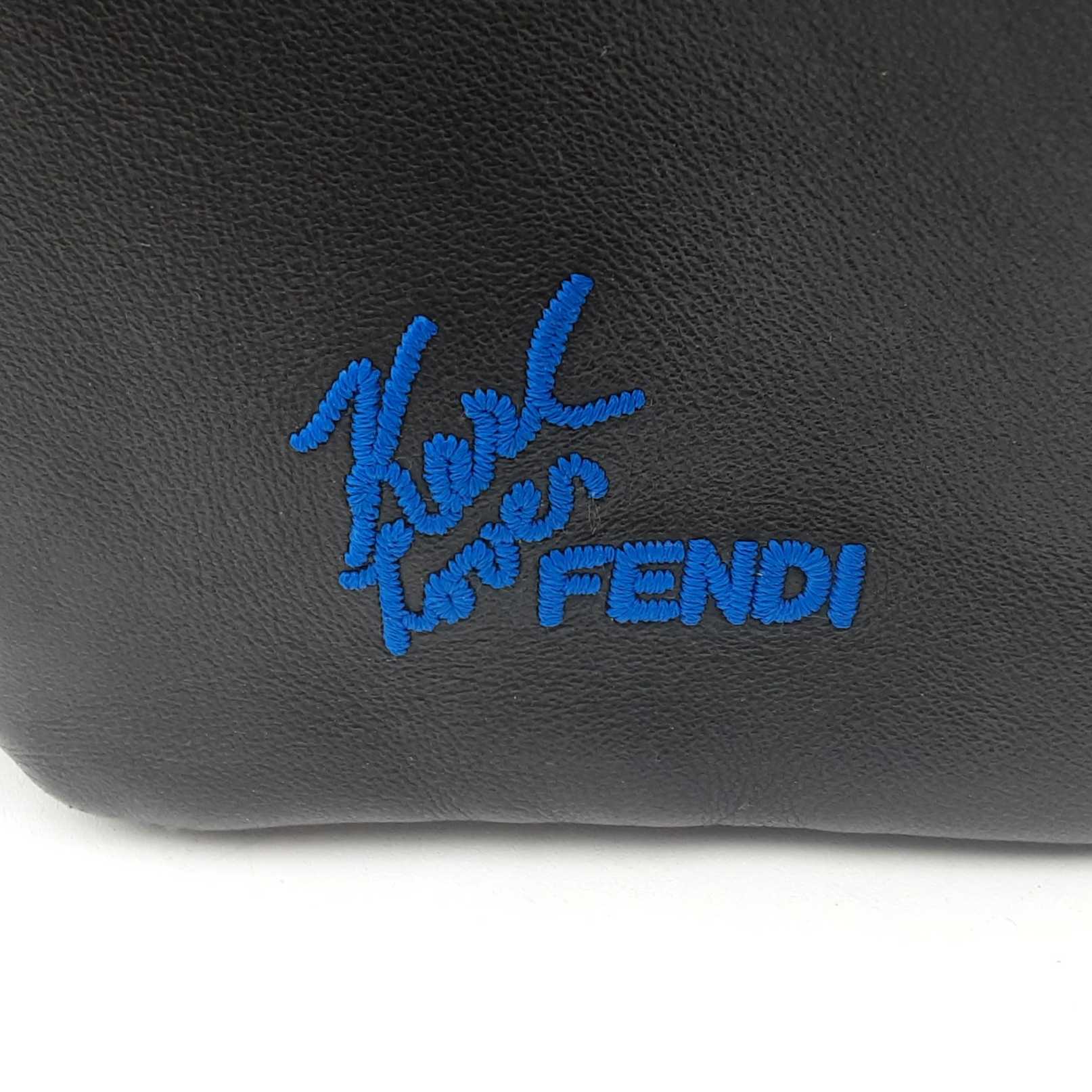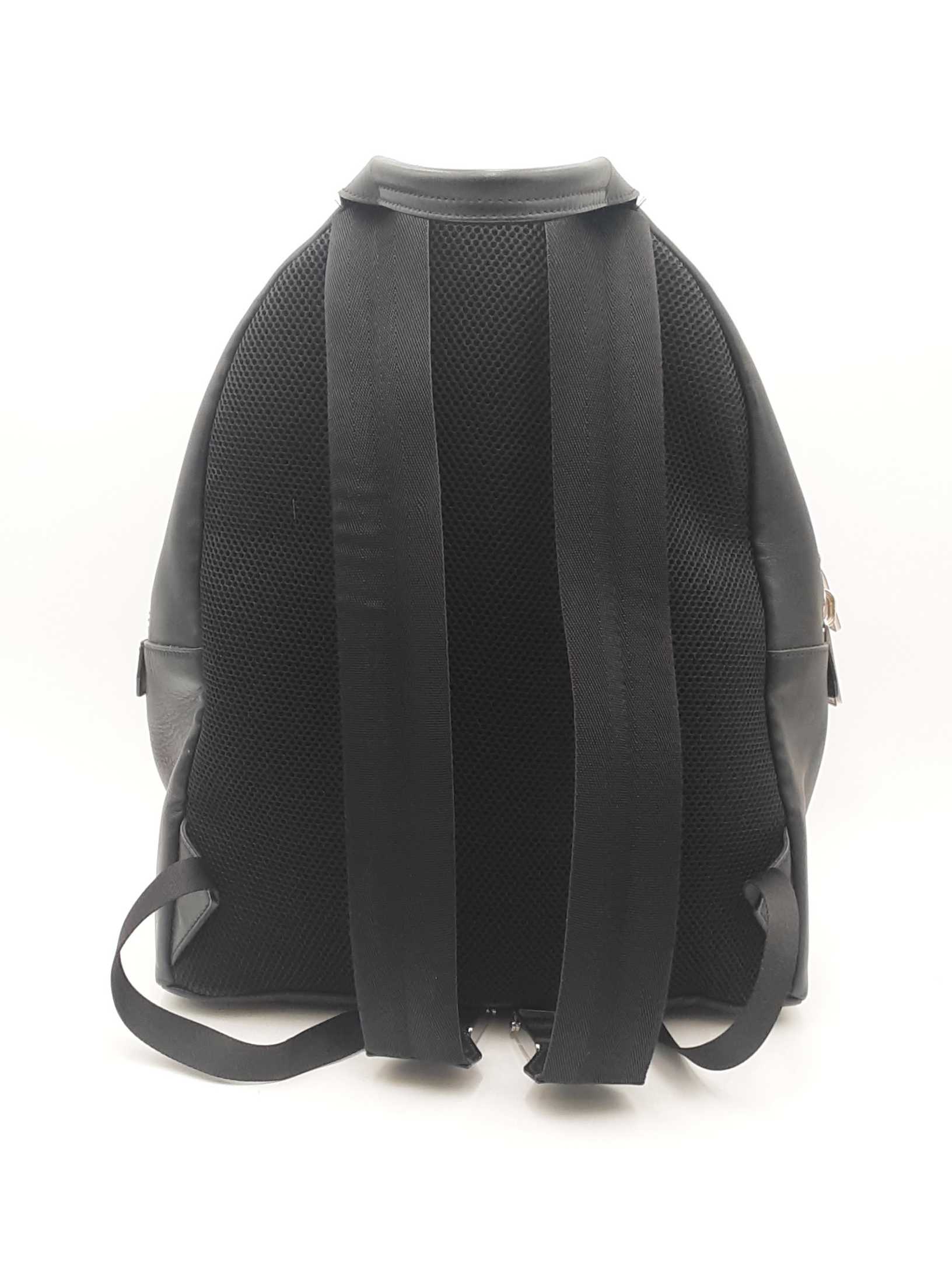144010047627Fendi Karlito Karl Lagerfeld Black Leather Backpack. Stainless Steel Hardware. Approximate measurements Height 16 IN X Length 13 IN X Width 7 IN. Great Pre-Owned Condition. Scratches on hardware. One bead is missing on exterior. Part of fabric appears that it was caught in zipper and tore. Interior has light dust and debris. Entrupy Certificate Card #6KTDW37