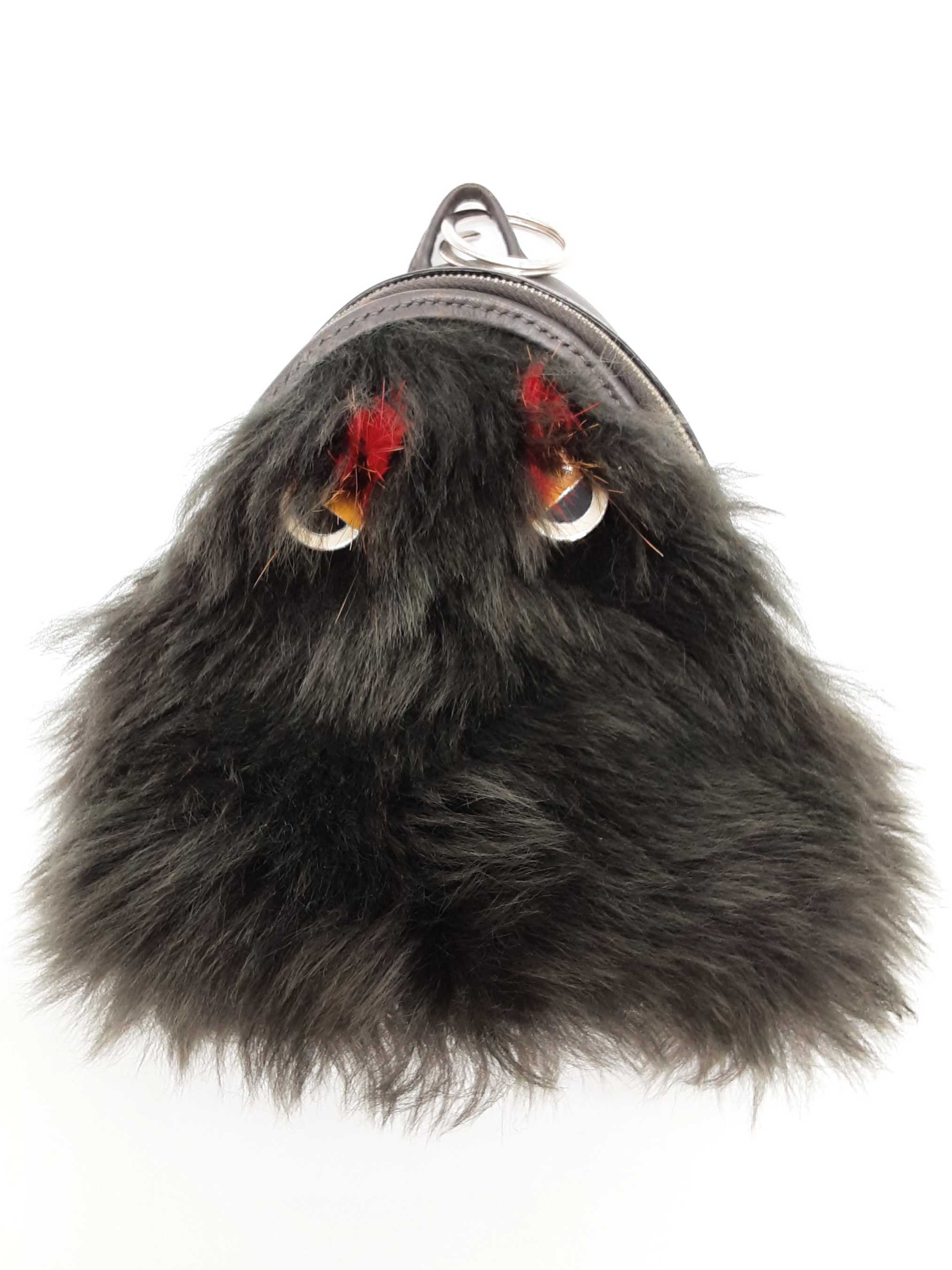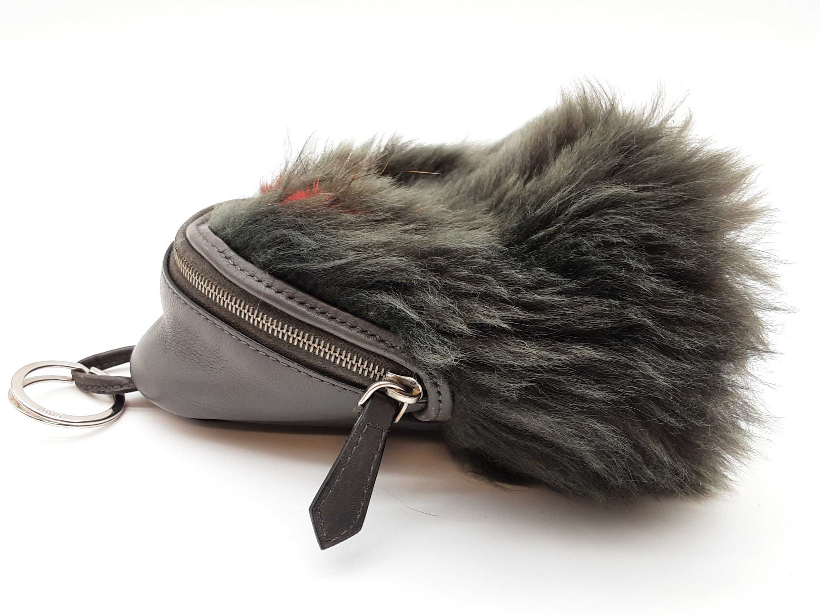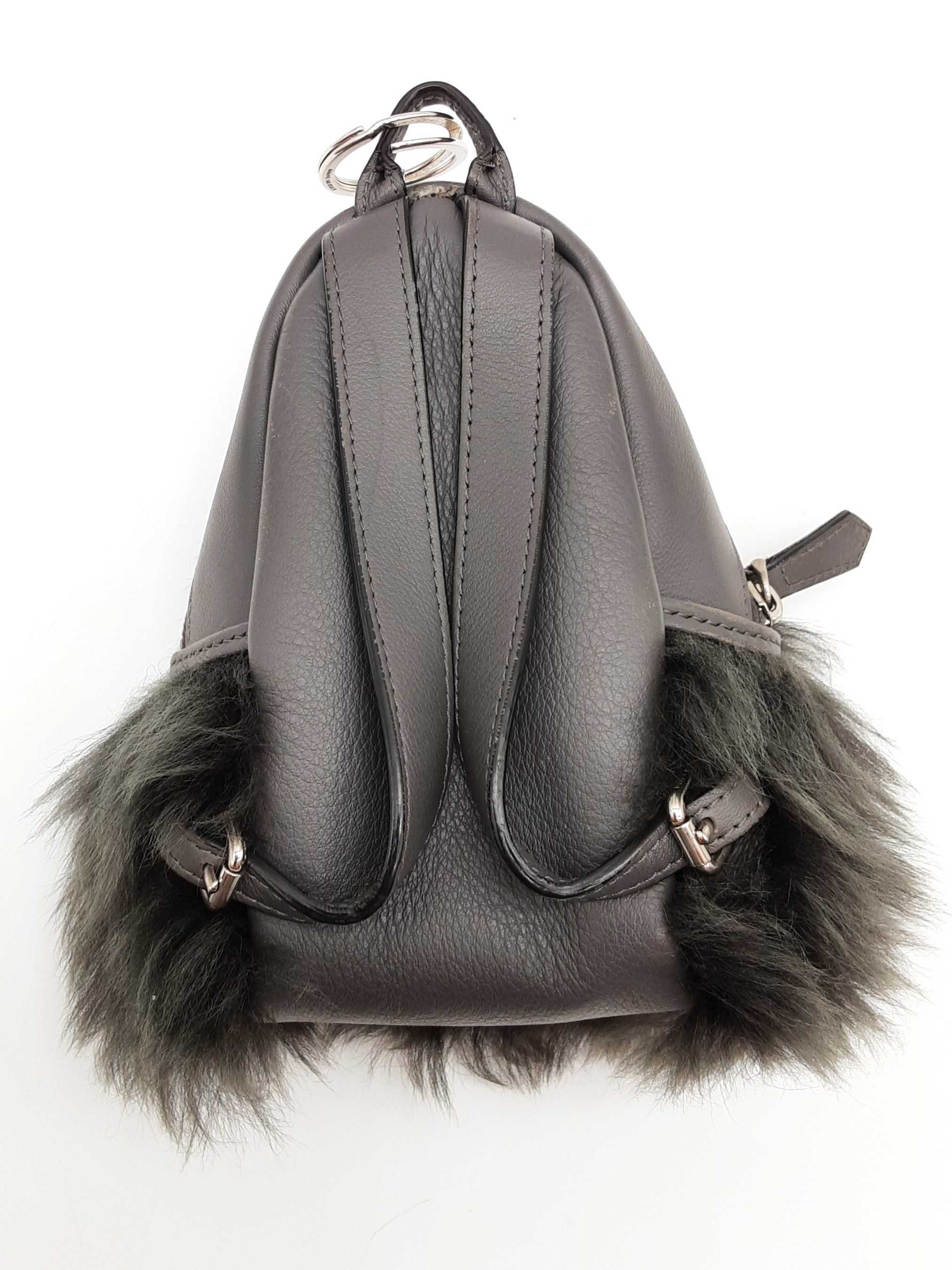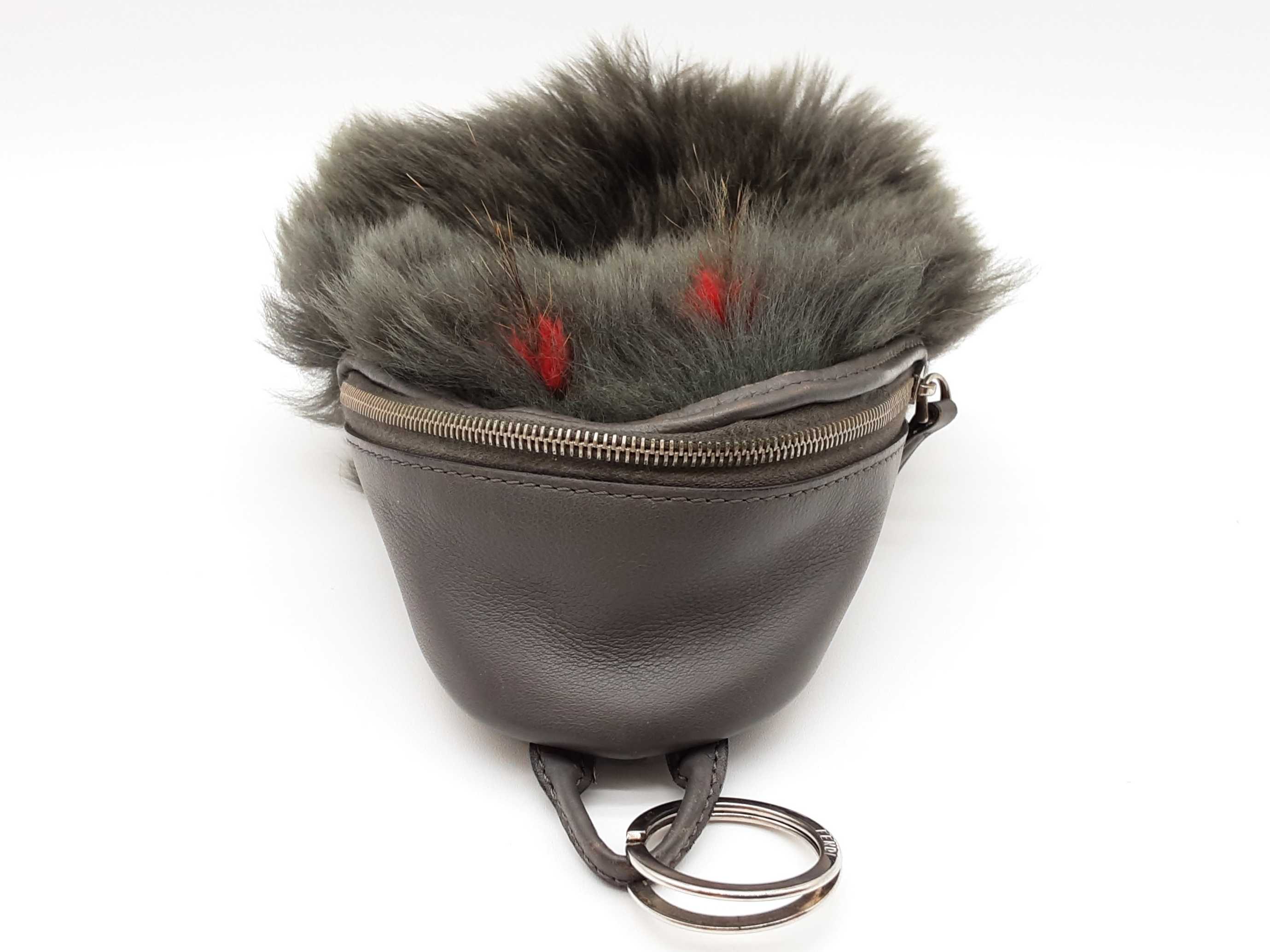 144020037360Fendi Monster Gray Leather Faux Fur Mini Backpack Pouch Bag Charm. Length 4 IN X Height 6.5 IN X Width 2 IN. Pre-Owned - Good Condition with keyring stretched, creases, wear on edges, scratch and cracking on one strap, and marks on interior.