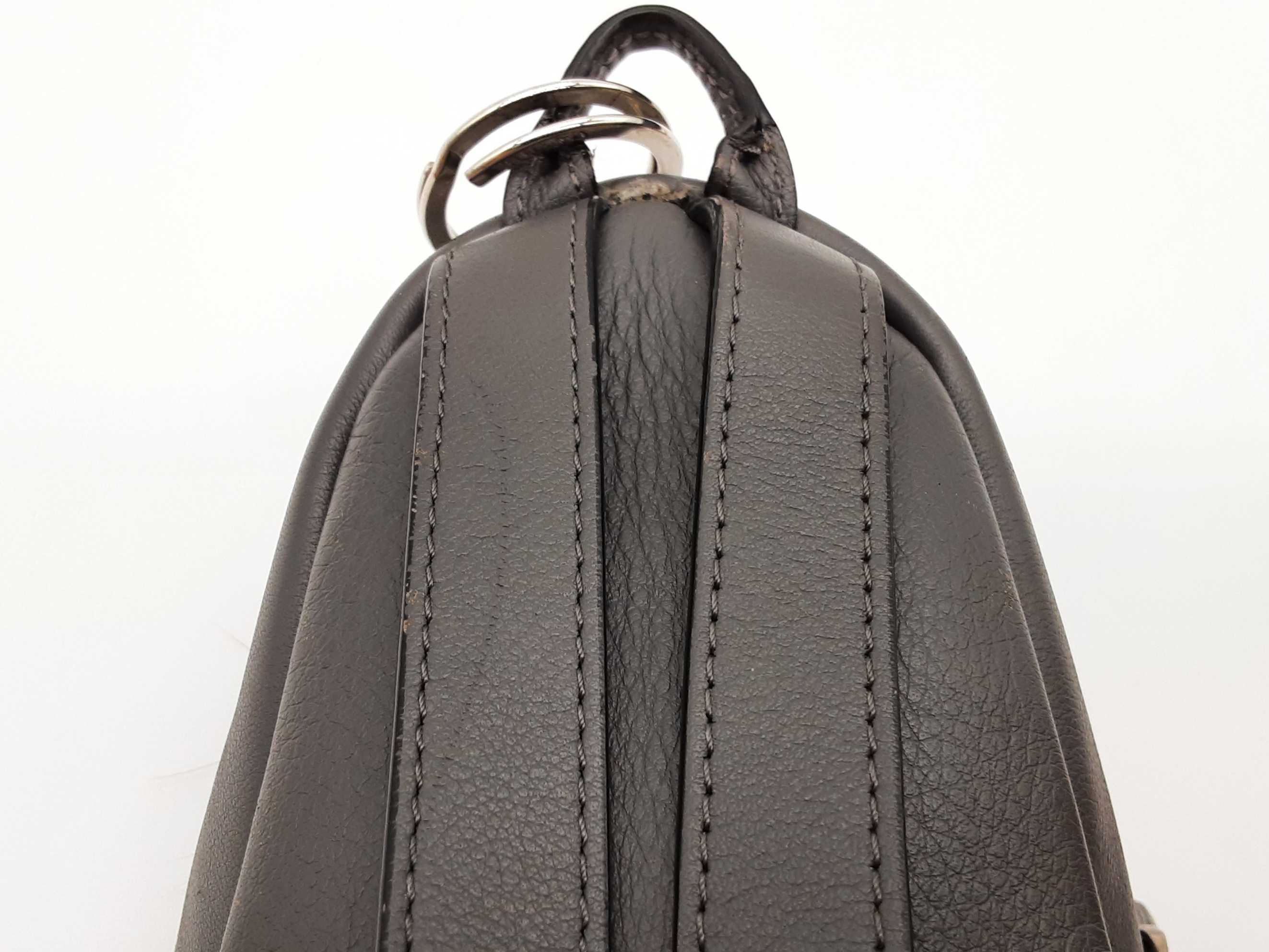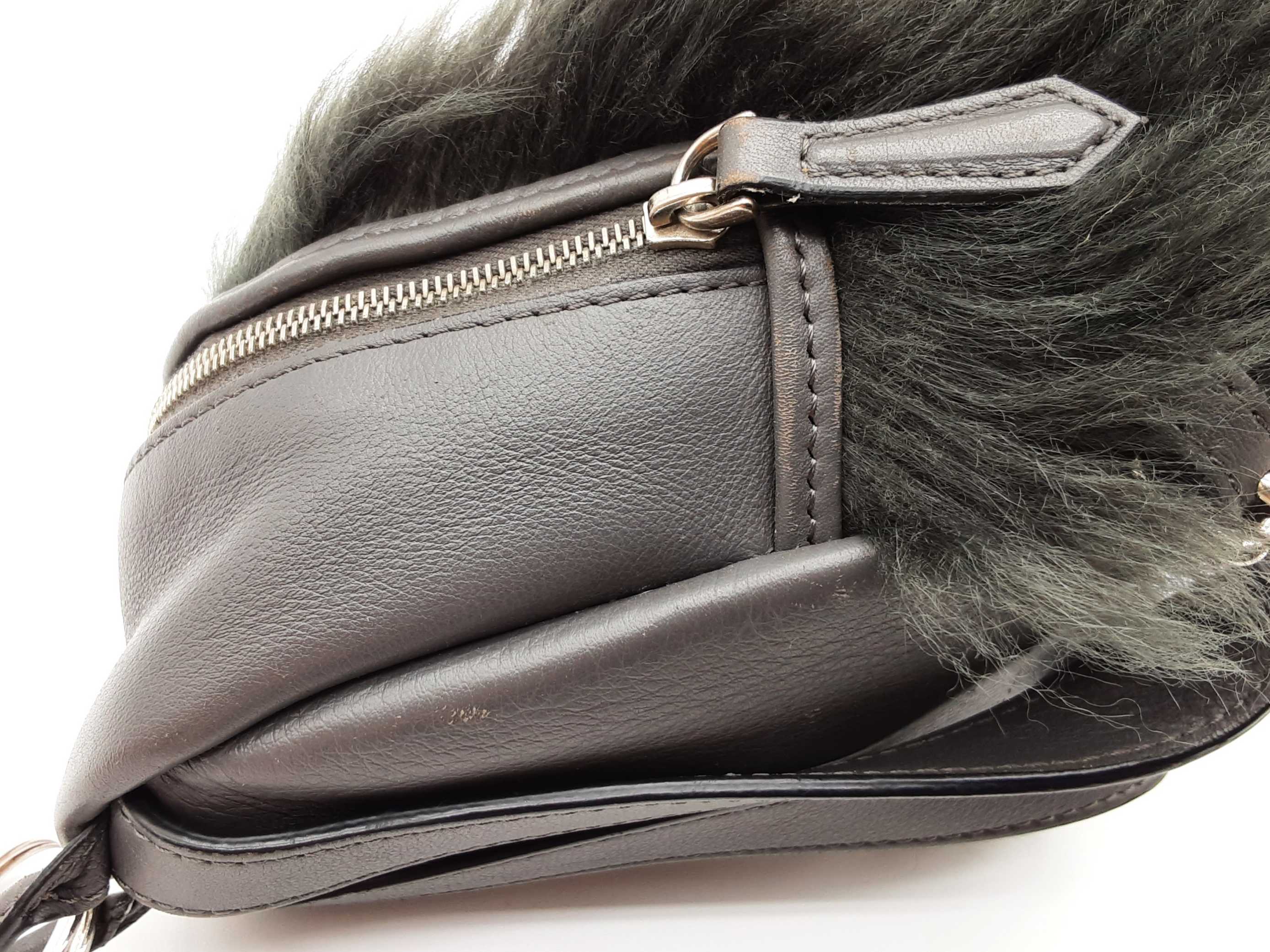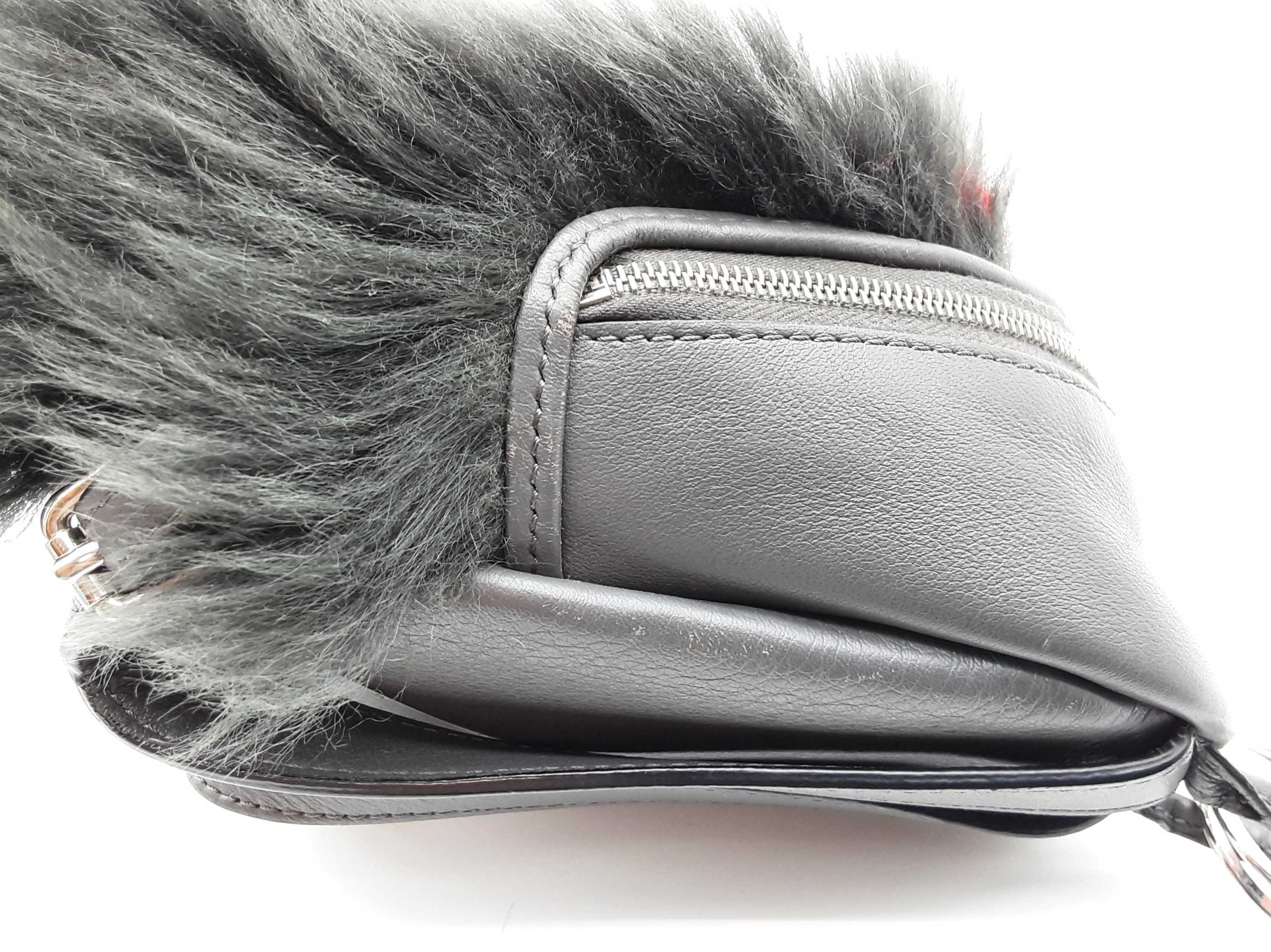 144020037360Fendi Monster Gray Leather Faux Fur Mini Backpack Pouch Bag Charm. Length 4 IN X Height 6.5 IN X Width 2 IN. Pre-Owned - Good Condition with keyring stretched, creases, wear on edges, scratch and cracking on one strap, and marks on interior.