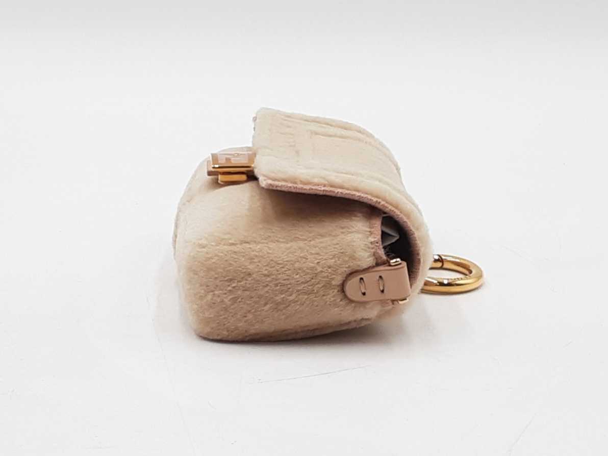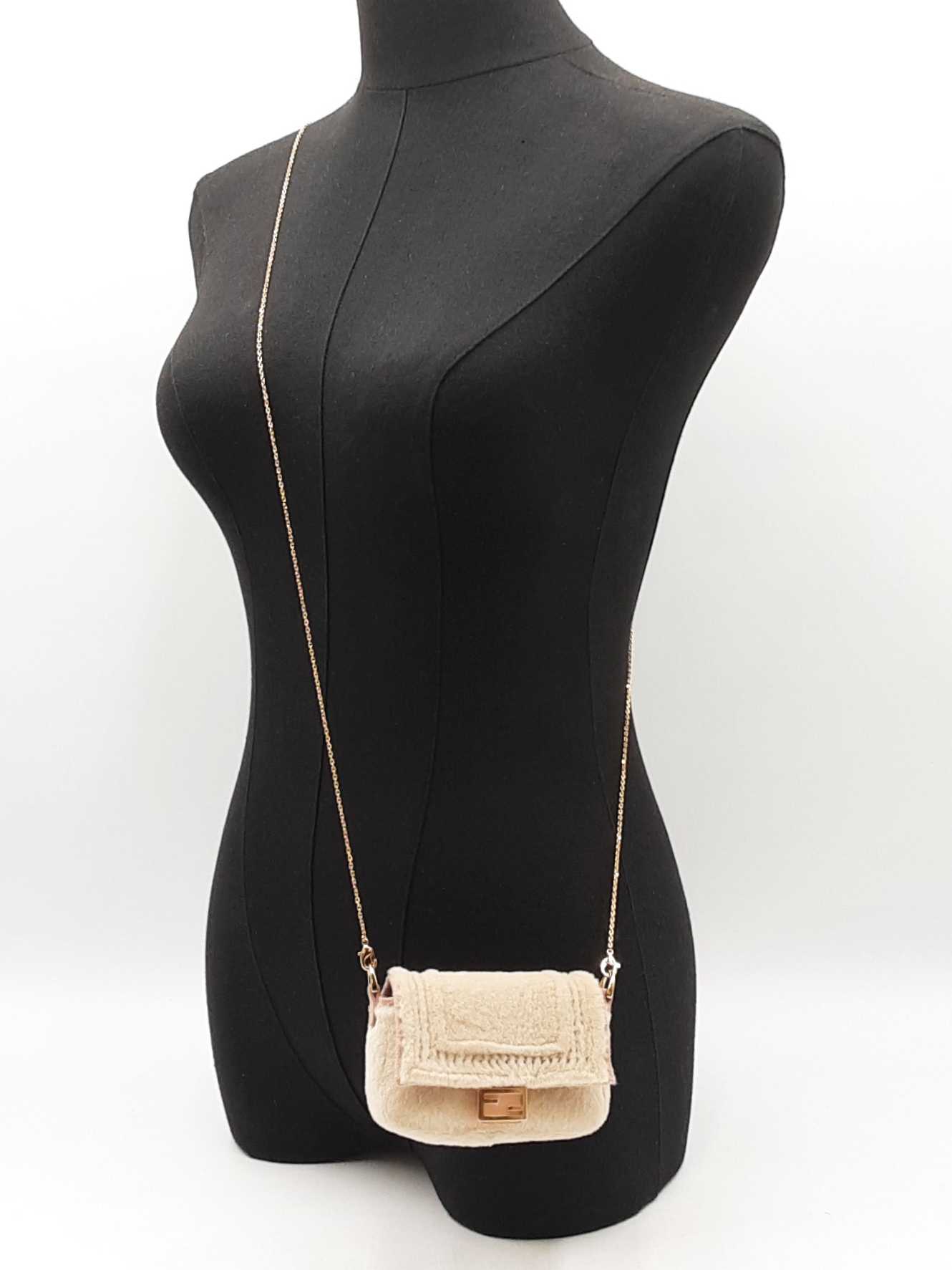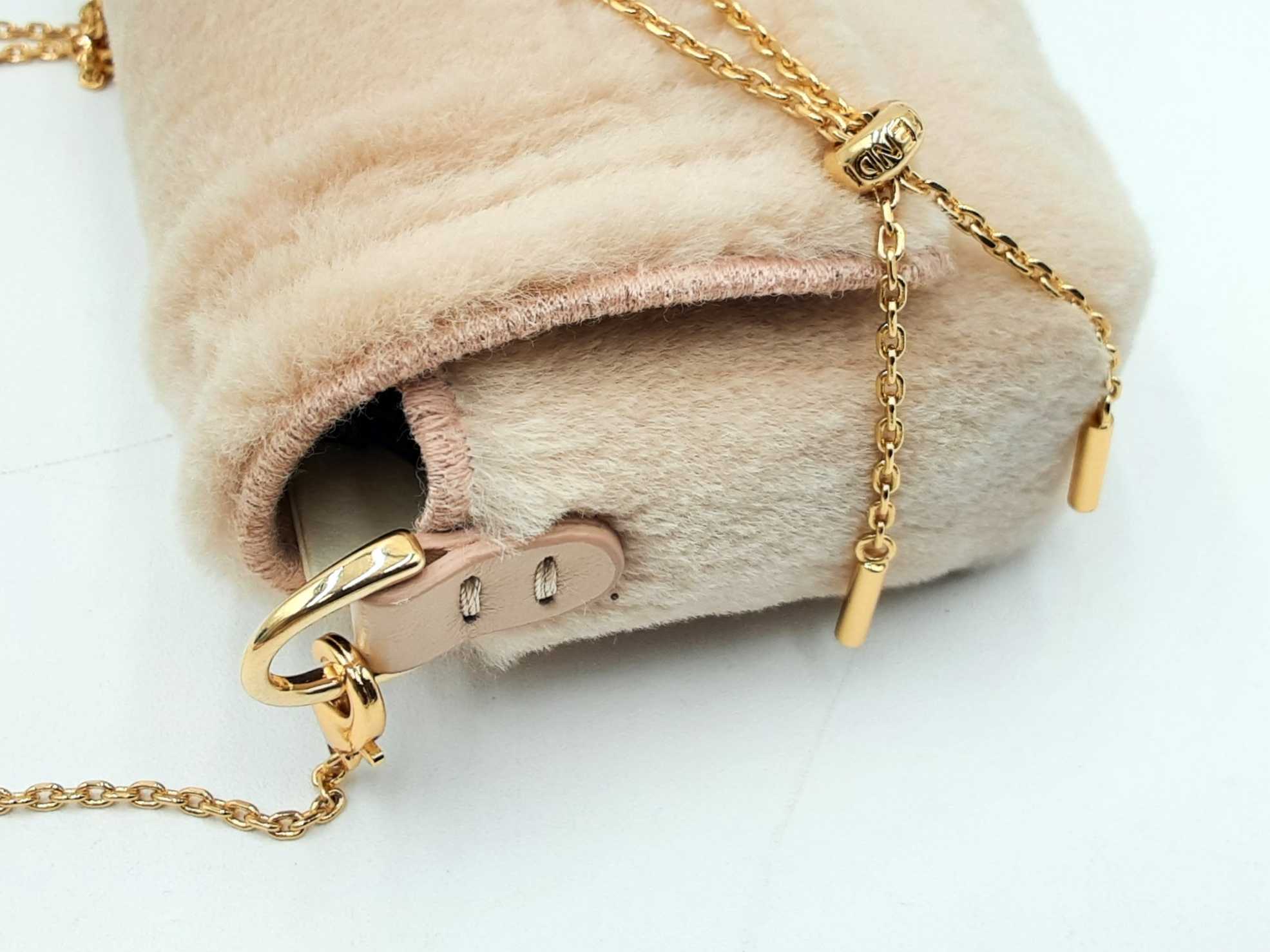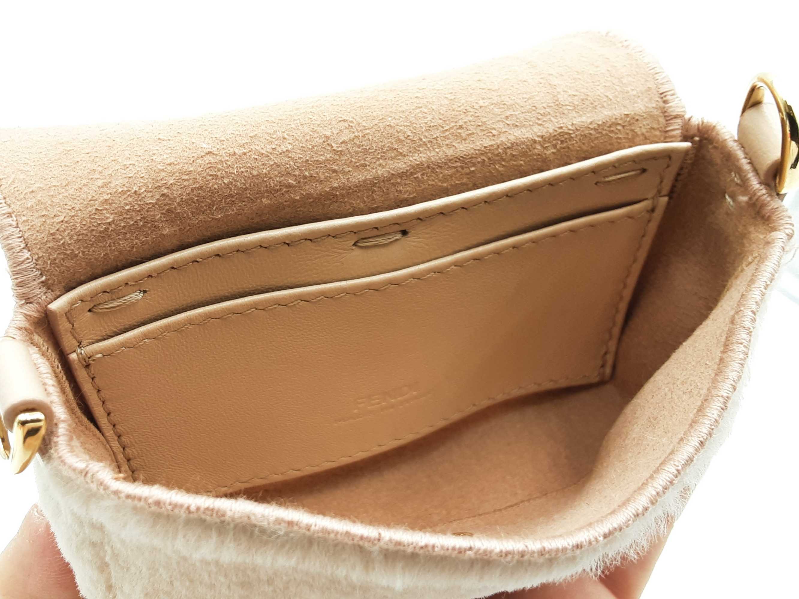 144030019717Fendi Nano Baguette Mink Crossbody Bag & Charm. Gold-Tone Hardware. Height 3 x Length 4.25 x Width 1.25 x Chain Drop 23 (with adjustable slider) inches, approximately. Good Pre-Owned Condition. Scratches on hardware. Fur on front and sides of bag is faded, and is more beige than rosy. Entrupy Certificate # 2DHJ2BC