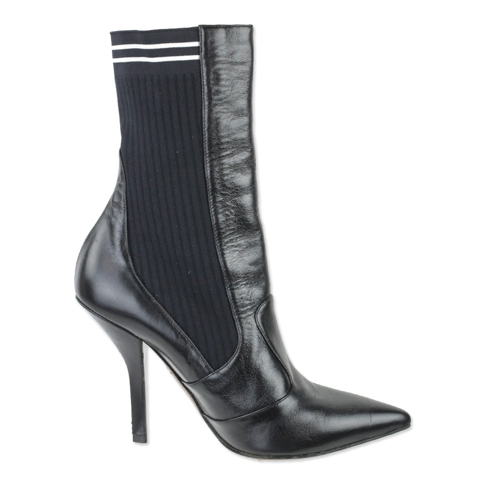Fendi boots, Rockoko, sock ankle boot, women's size 40, designer shoes, luxury footwear, good condition, black leather, ribbed knit, stiletto heel, classic style, timeless fashion, high-end apparel, sophisticated look, pre-owned luxury, fashion resale, authentic Fendi, Italian designer, elegant piece, chic shoes, versatile style, professional footwear, luxury brand, luxury fashion, leather shoes, designer boots, polished look, sleek silhouette, stylish comfort, everyday wear, designer booties, pointed toe, Fendi Rockoko, sporty chic, designer resale.