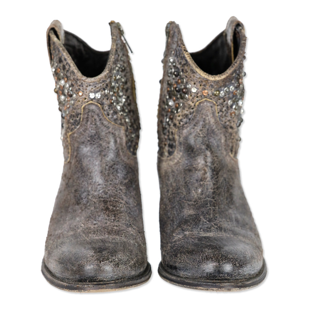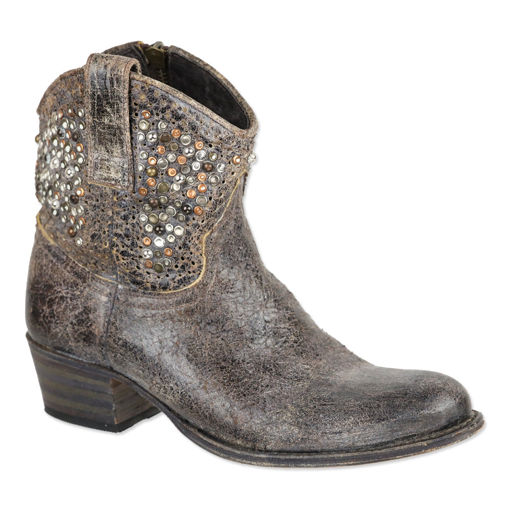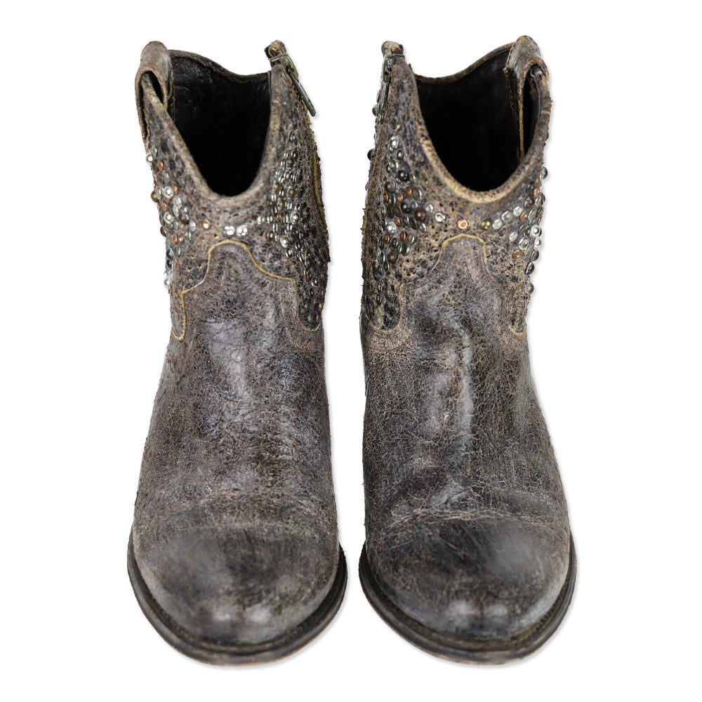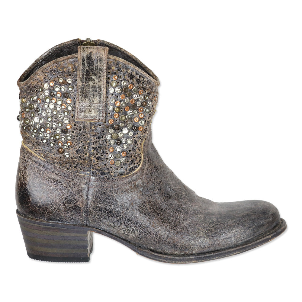 - Details: Perforated vamp, tri-color studs, side zipper, western silhouette