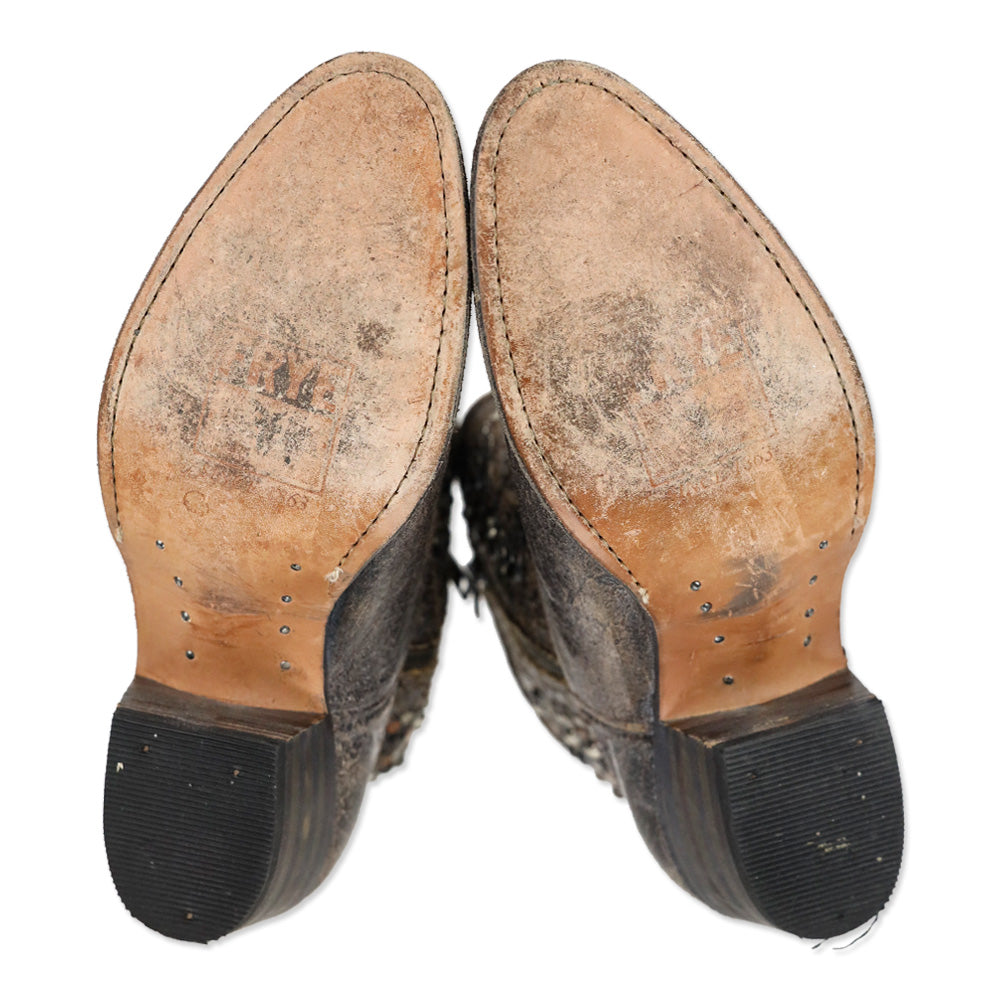 Frye Deborah boots, studded western boots, distressed leather boots, size 7 Frye, Spanish leather boots Hand-applied studs, vintage patina, rocker aesthetic, Goodyear construction, bohemian edge, intentional distressing
