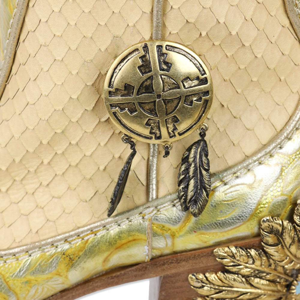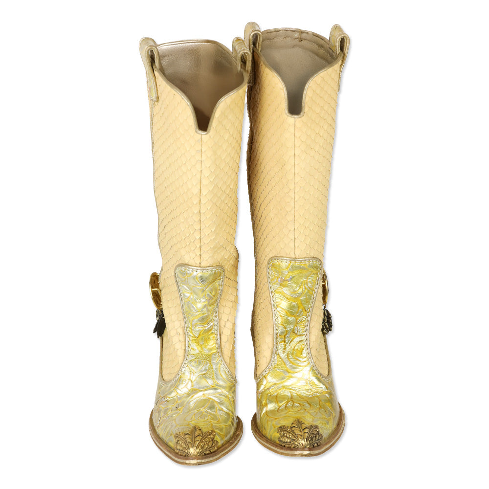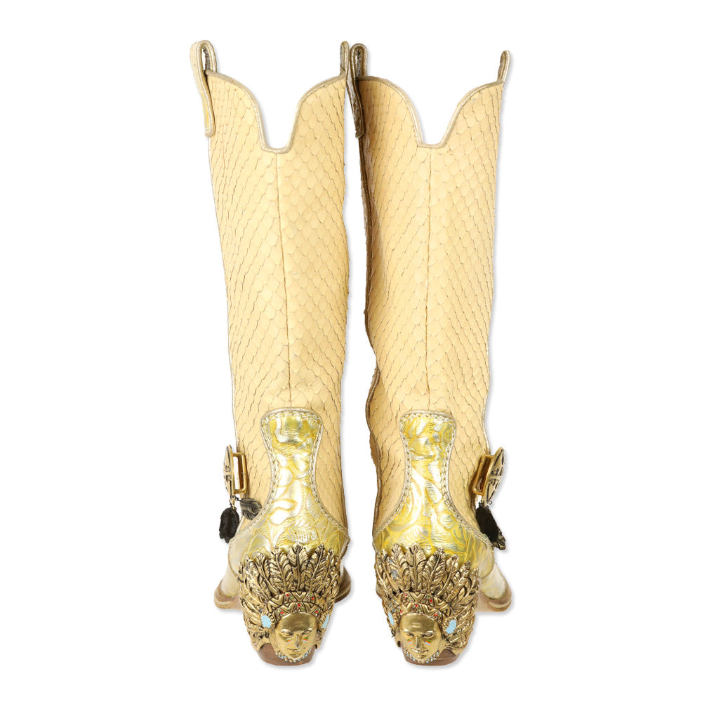 Giuseppe Zanotti python cowboy boots, Vicini Chief Head boots, ivory snakeskin cowboy boots, size 35 designer boots, gold-tone hardware boots, handmade Italian boots, $2500 luxury cowboy boots, unique western boots Artistic footwear design, exotic leather texture, movable embellishments, handcrafted Italian luxury, statement cowboy boots, bohemian-chic aesthetic, collectible designer boots