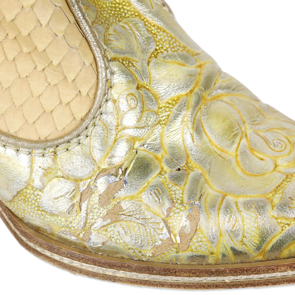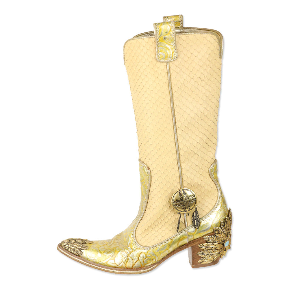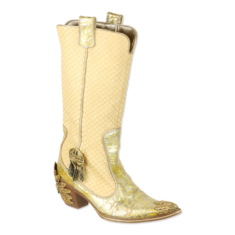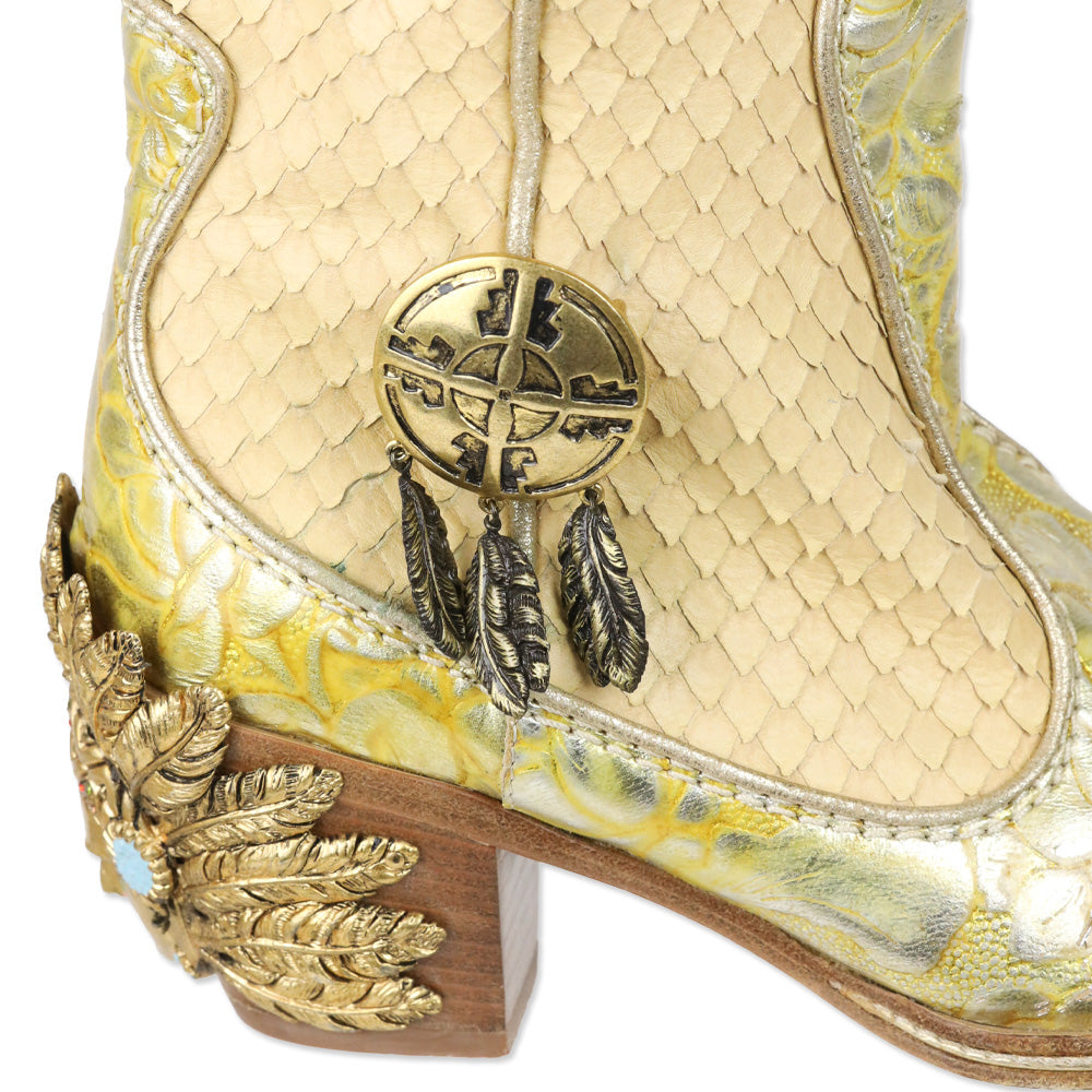 Giuseppe Zanotti python cowboy boots, Vicini Chief Head boots, ivory snakeskin cowboy boots, size 35 designer boots, gold-tone hardware boots, handmade Italian boots, $2500 luxury cowboy boots, unique western boots Artistic footwear design, exotic leather texture, movable embellishments, handcrafted Italian luxury, statement cowboy boots, bohemian-chic aesthetic, collectible designer boots