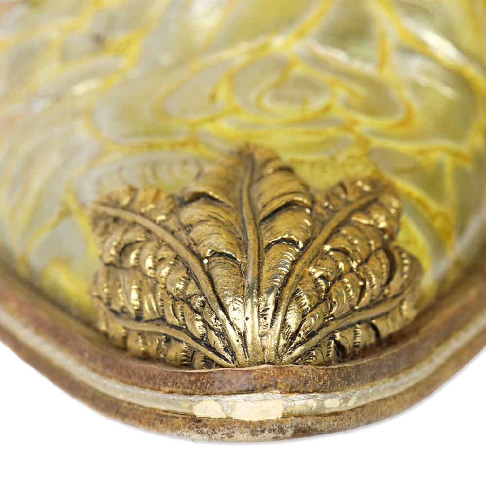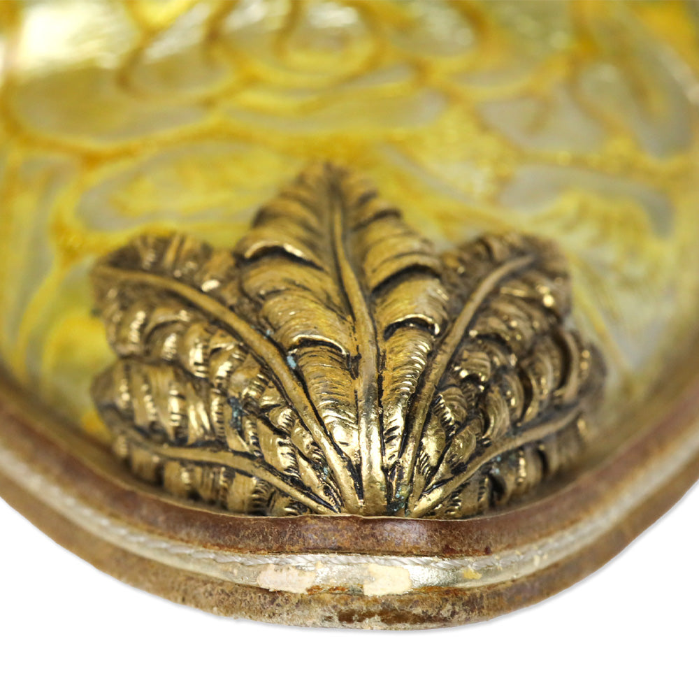 - Scratch and exposed under material on the gold floral patent leather of the left shoe and on the top of the right shoe. Wear on the soles. Left shoe is missing 1/3 of its feather charms, and on the right shoe, one of the charms is turned backward.