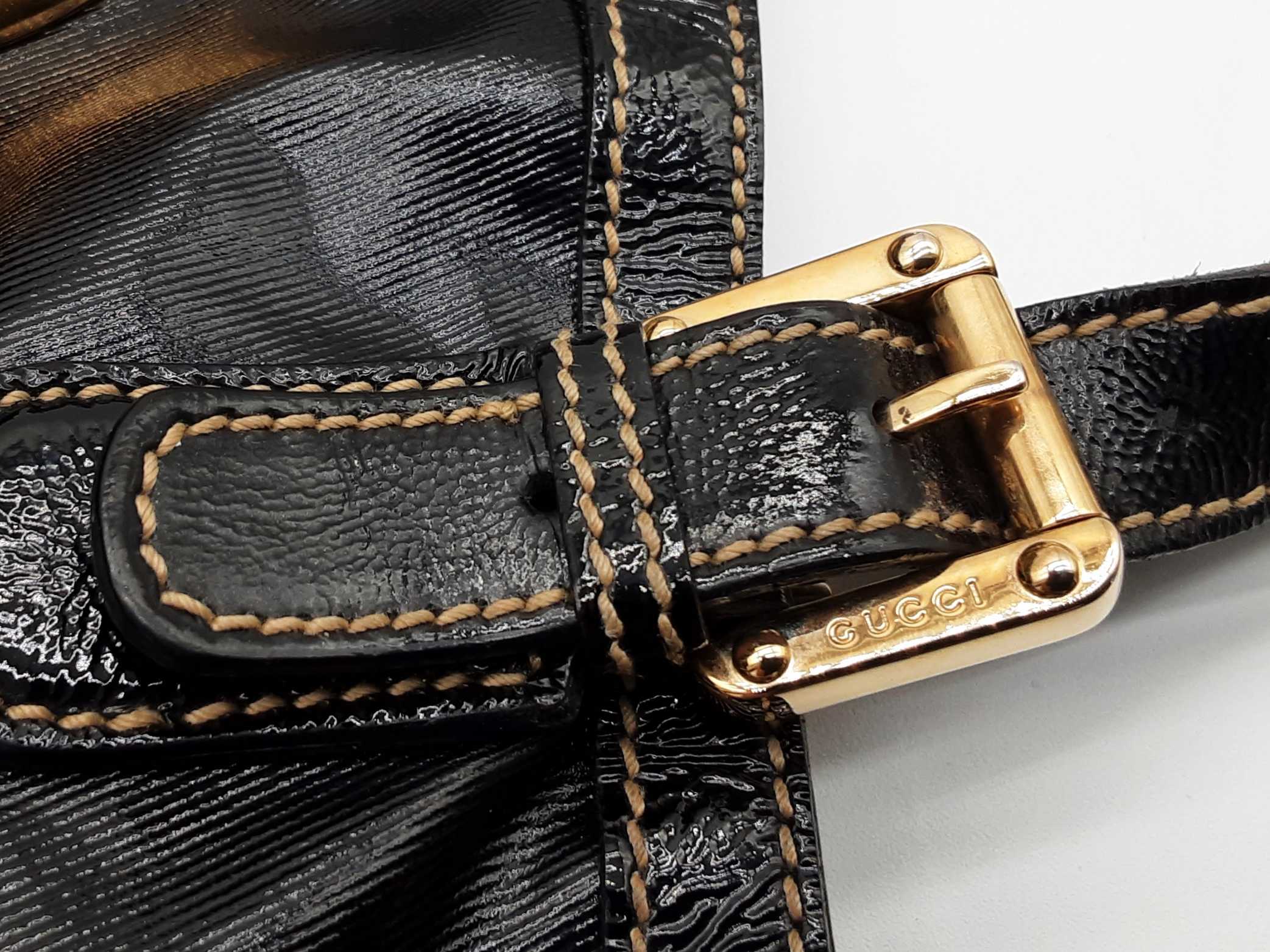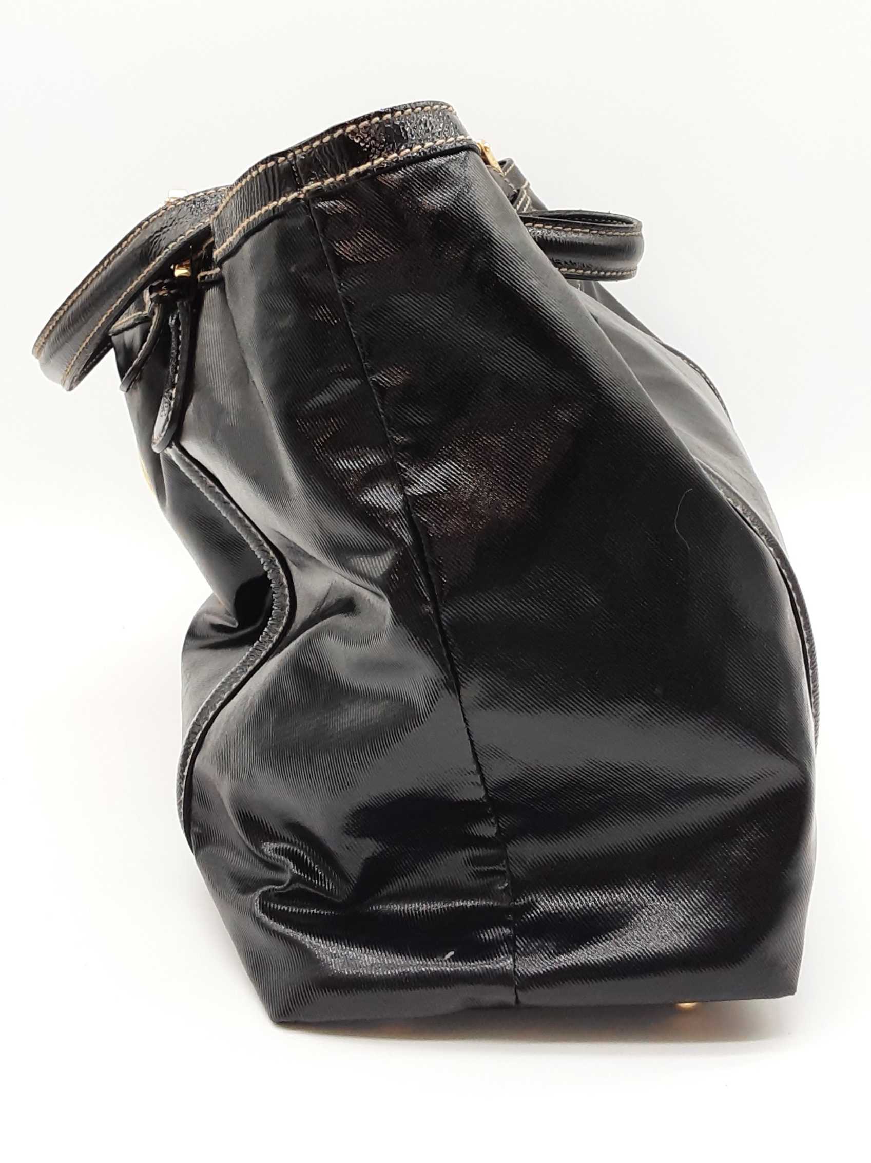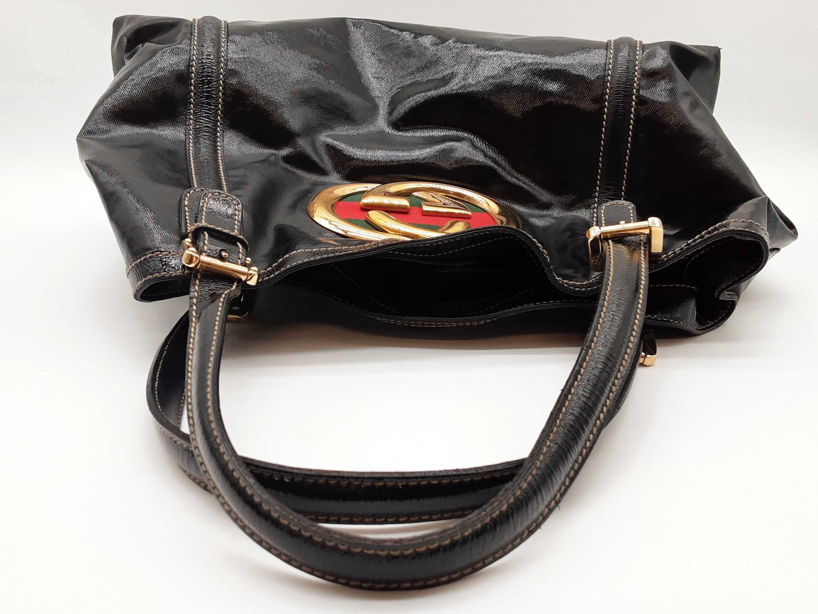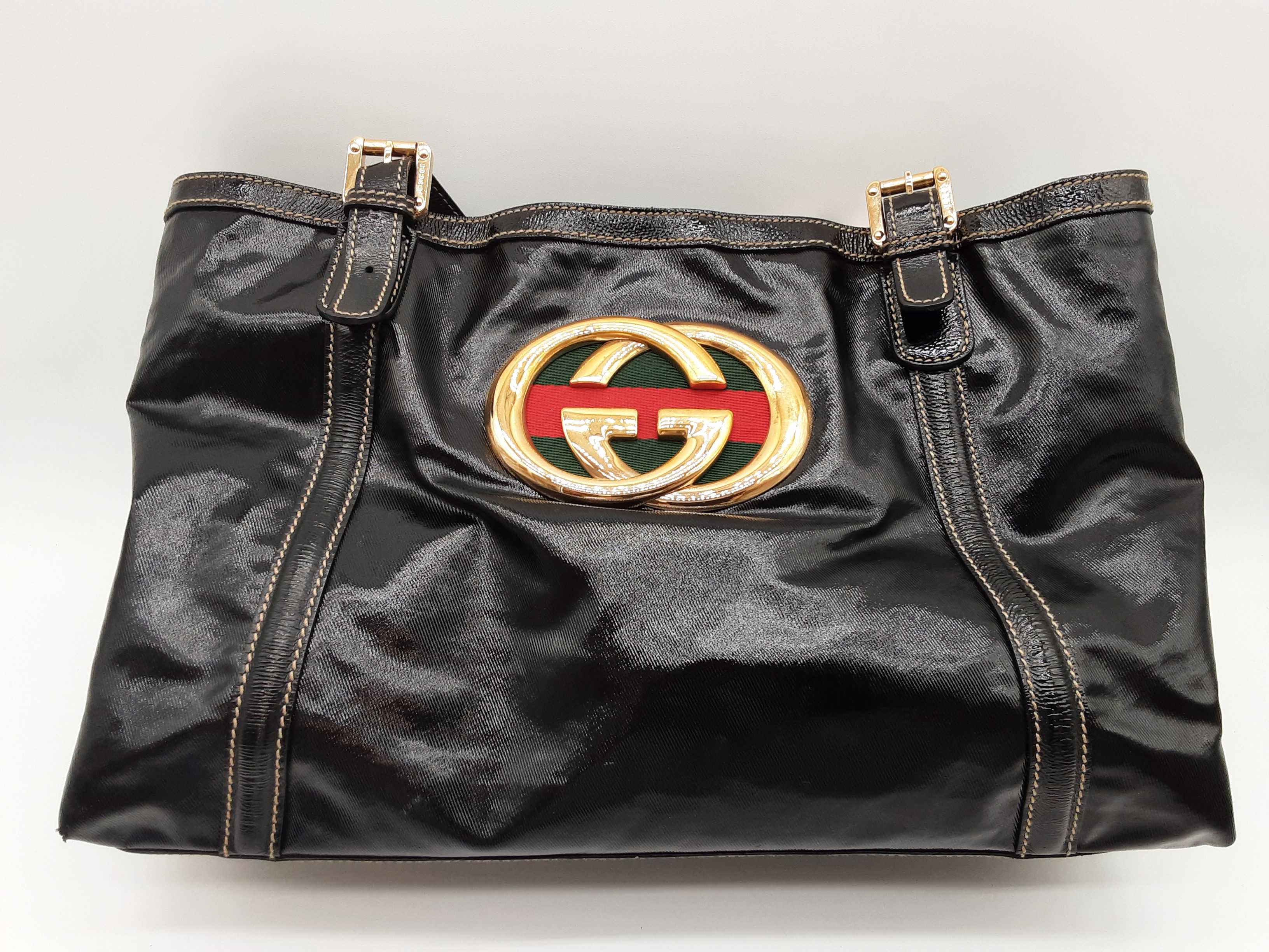 144020029831Gucci Britt GG Web Black Patent Leather Tote Bag. Length 15.5 IN X Height 10 IN X Width 5.5 IN X Drop 7.5 IN. Style #162094. Entrupy Certificate #XM3RWD7. Pre-owned - Good Condition with creases, bag misshappen and leaning towards front, white marks on exterior and interior, wear on straps and corners, and scratches and wear on metal hardware.