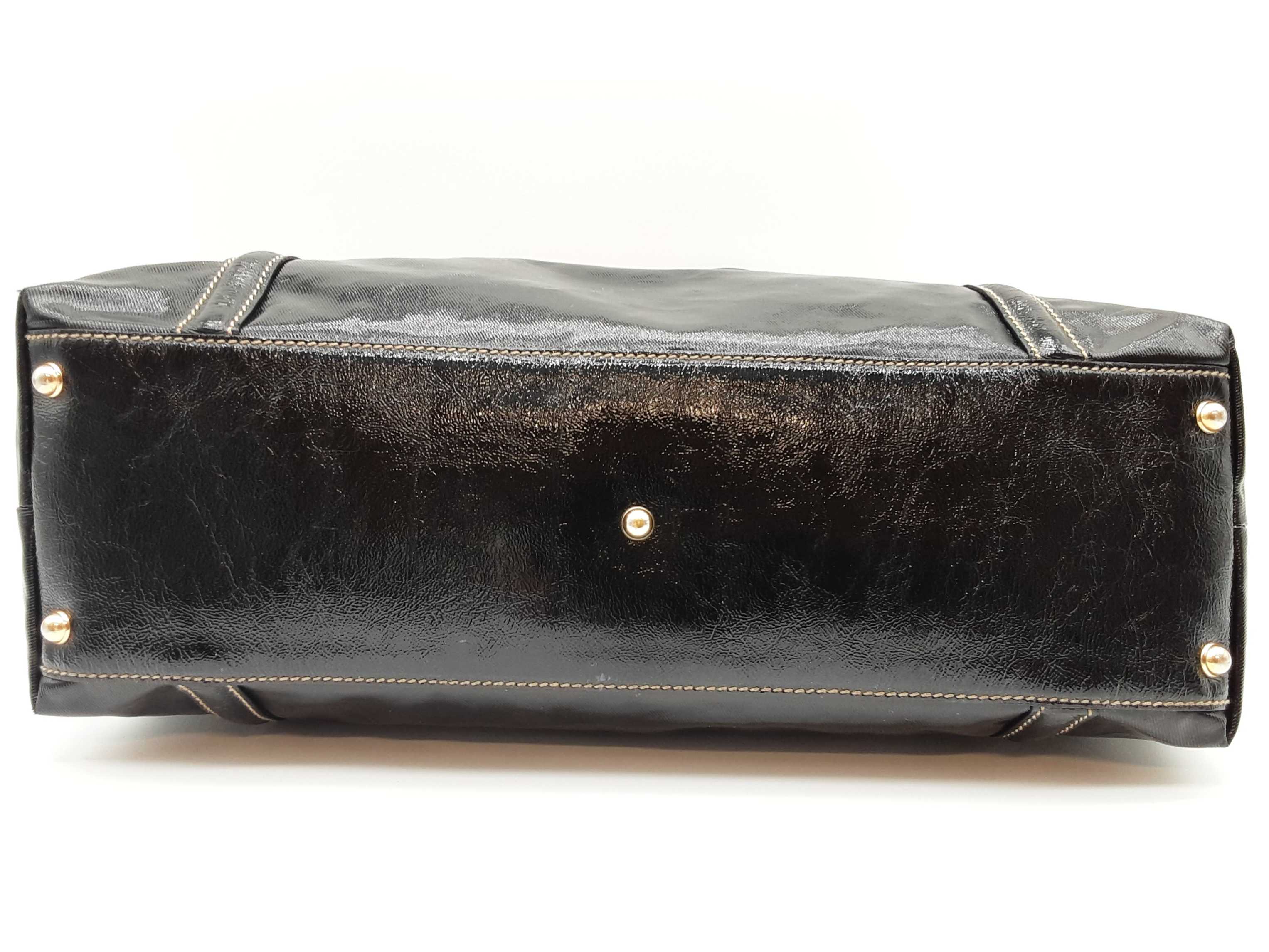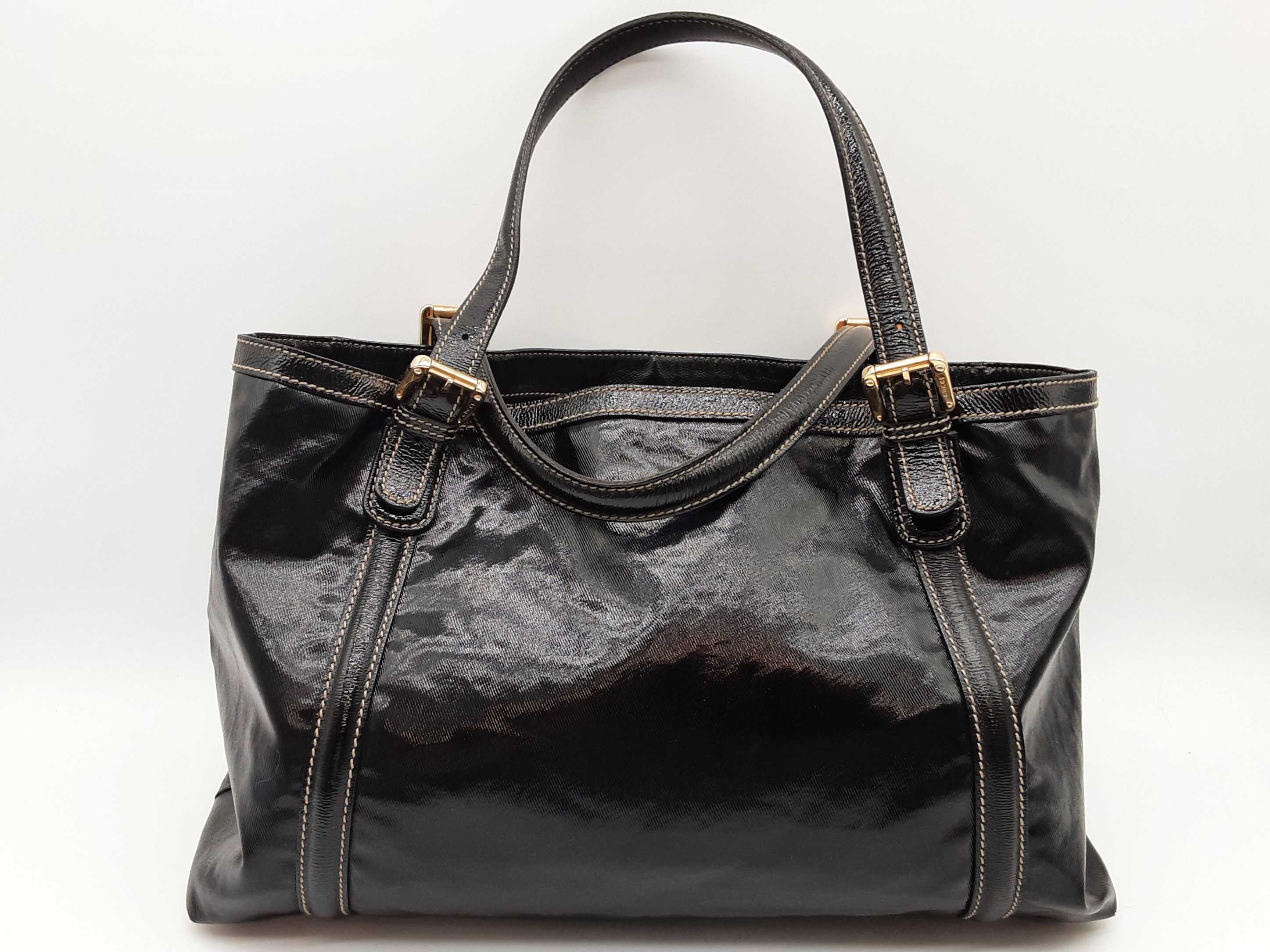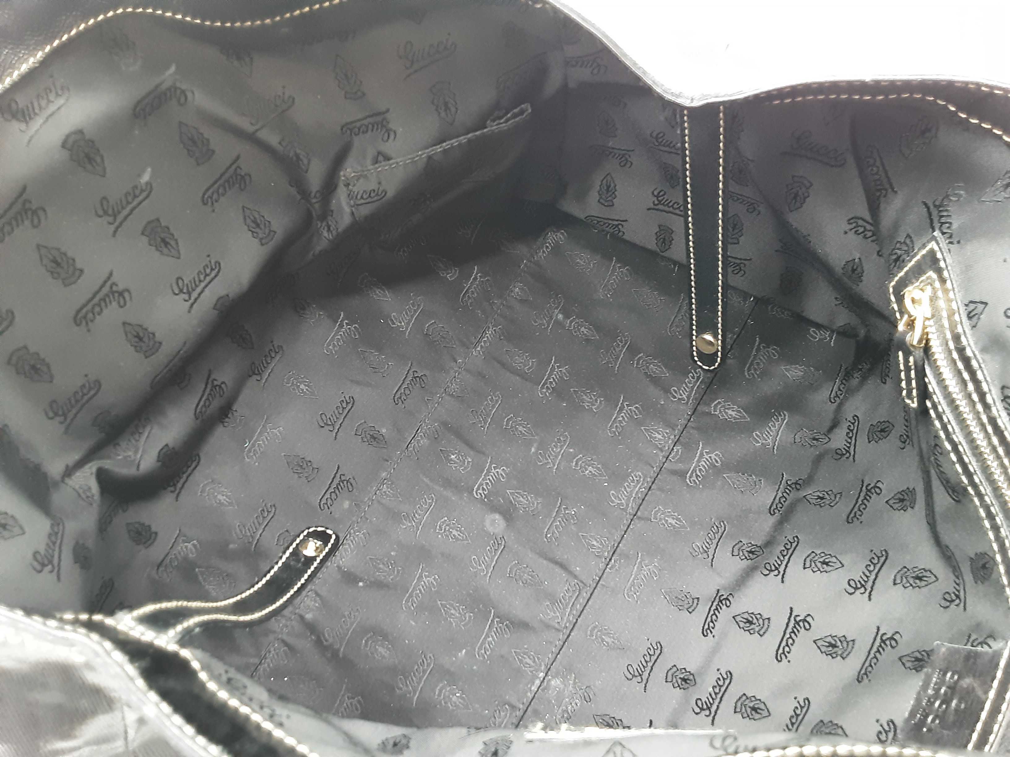 144020029831Gucci Britt GG Web Black Patent Leather Tote Bag. Length 15.5 IN X Height 10 IN X Width 5.5 IN X Drop 7.5 IN. Style #162094. Entrupy Certificate #XM3RWD7. Pre-owned - Good Condition with creases, bag misshappen and leaning towards front, white marks on exterior and interior, wear on straps and corners, and scratches and wear on metal hardware.