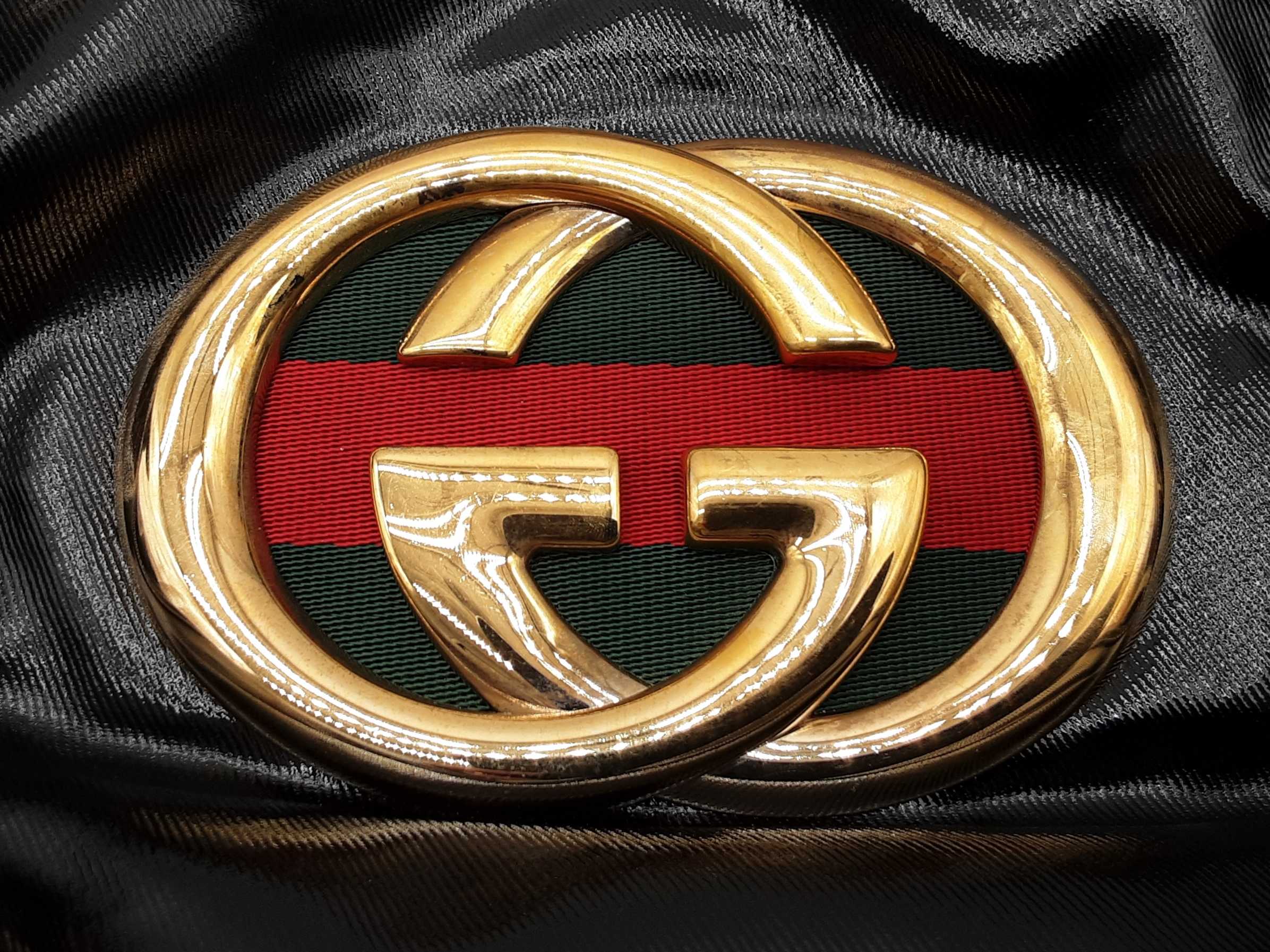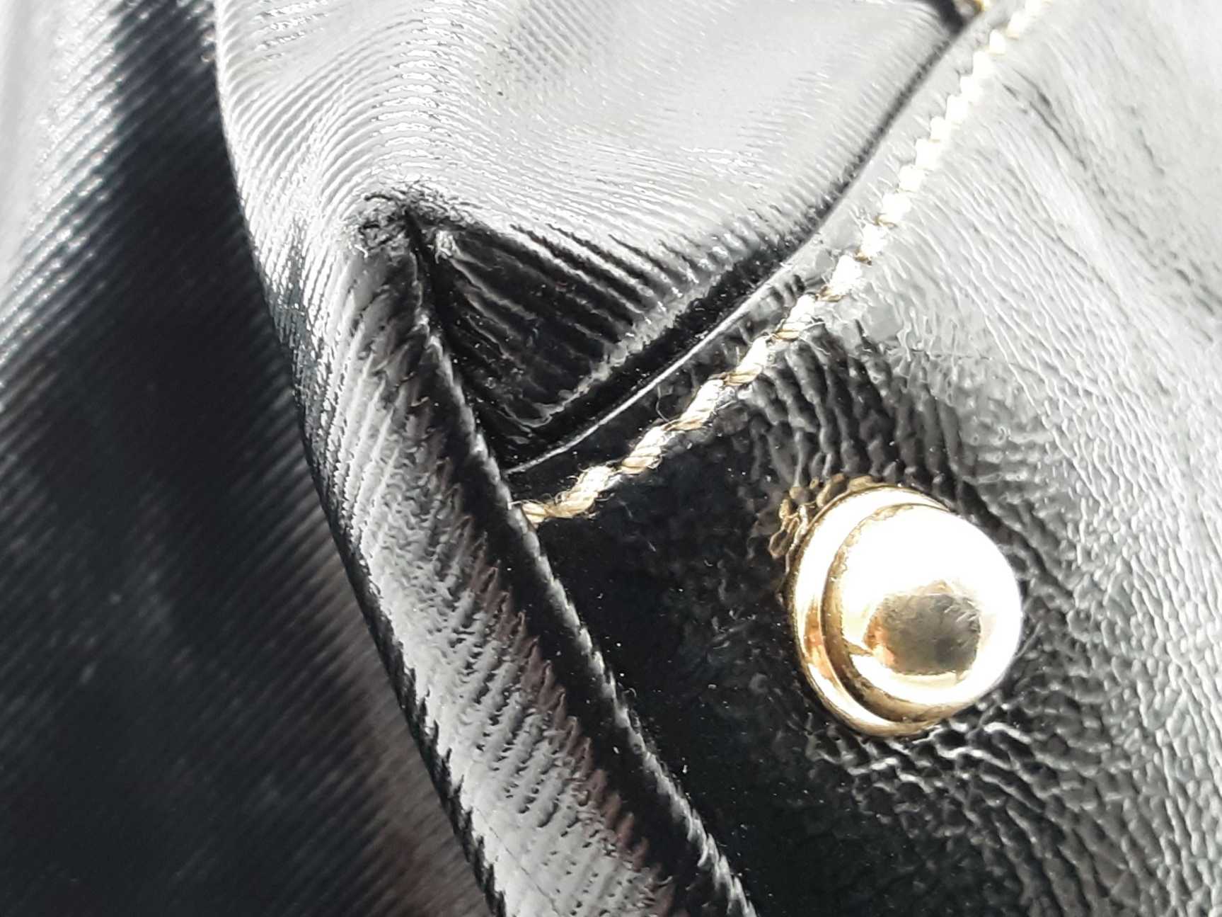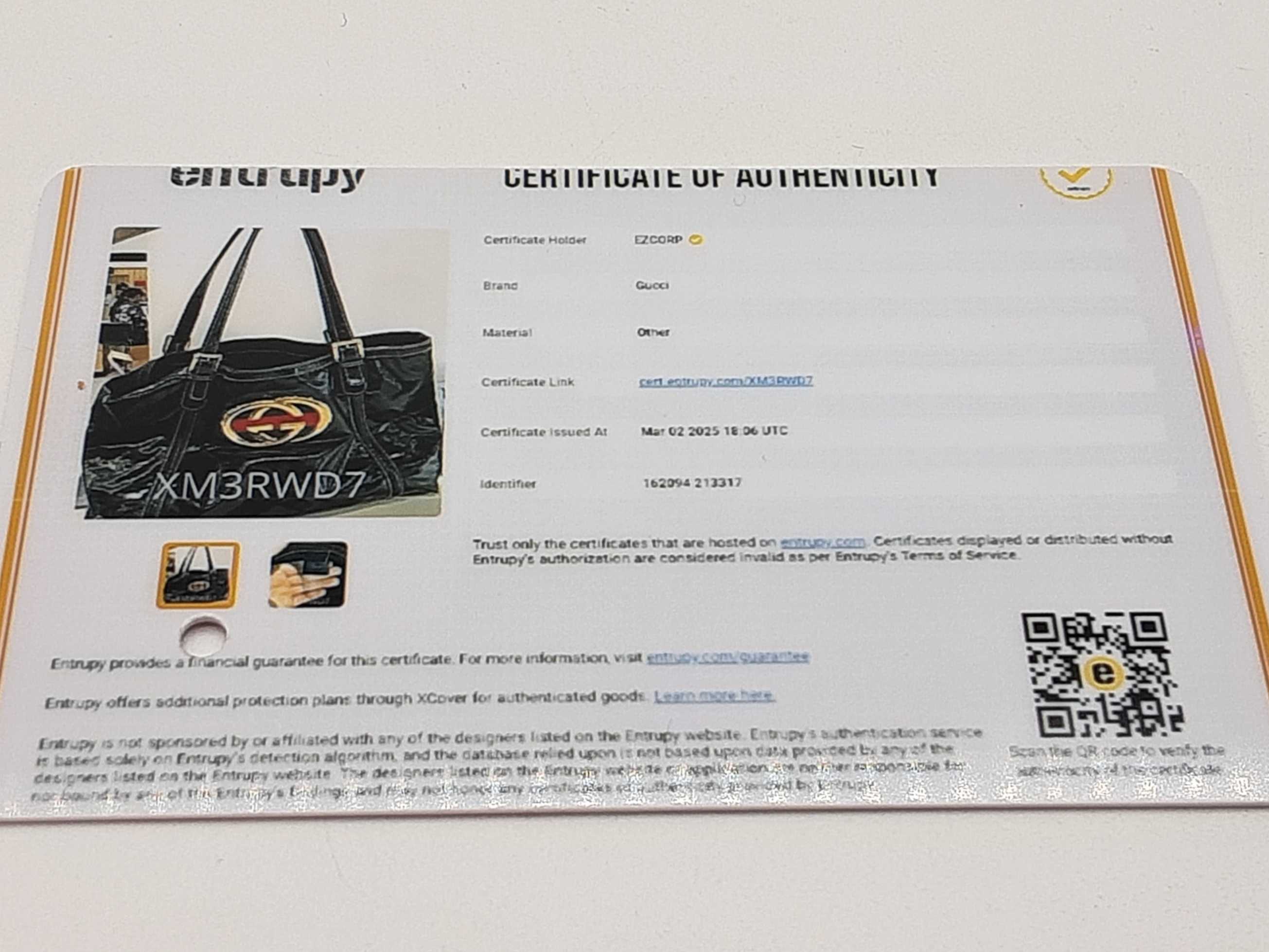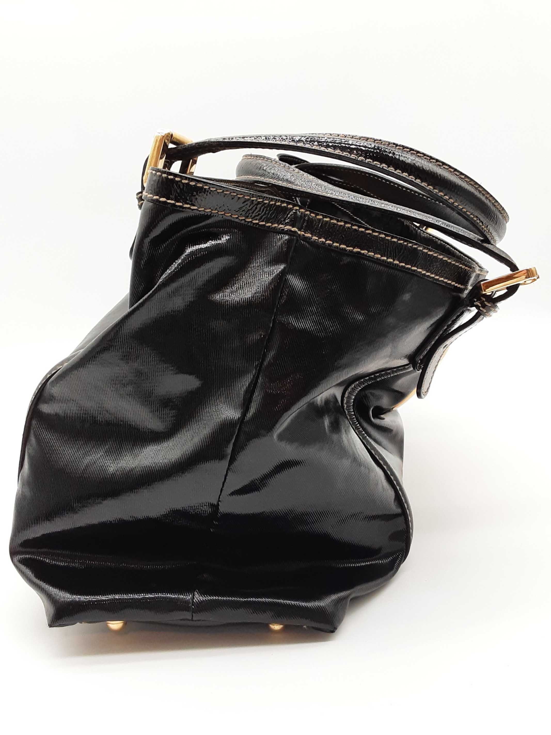 144020029831Gucci Britt GG Web Black Patent Leather Tote Bag. Length 15.5 IN X Height 10 IN X Width 5.5 IN X Drop 7.5 IN. Style #162094. Entrupy Certificate #XM3RWD7. Pre-owned - Good Condition with creases, bag misshappen and leaning towards front, white marks on exterior and interior, wear on straps and corners, and scratches and wear on metal hardware.