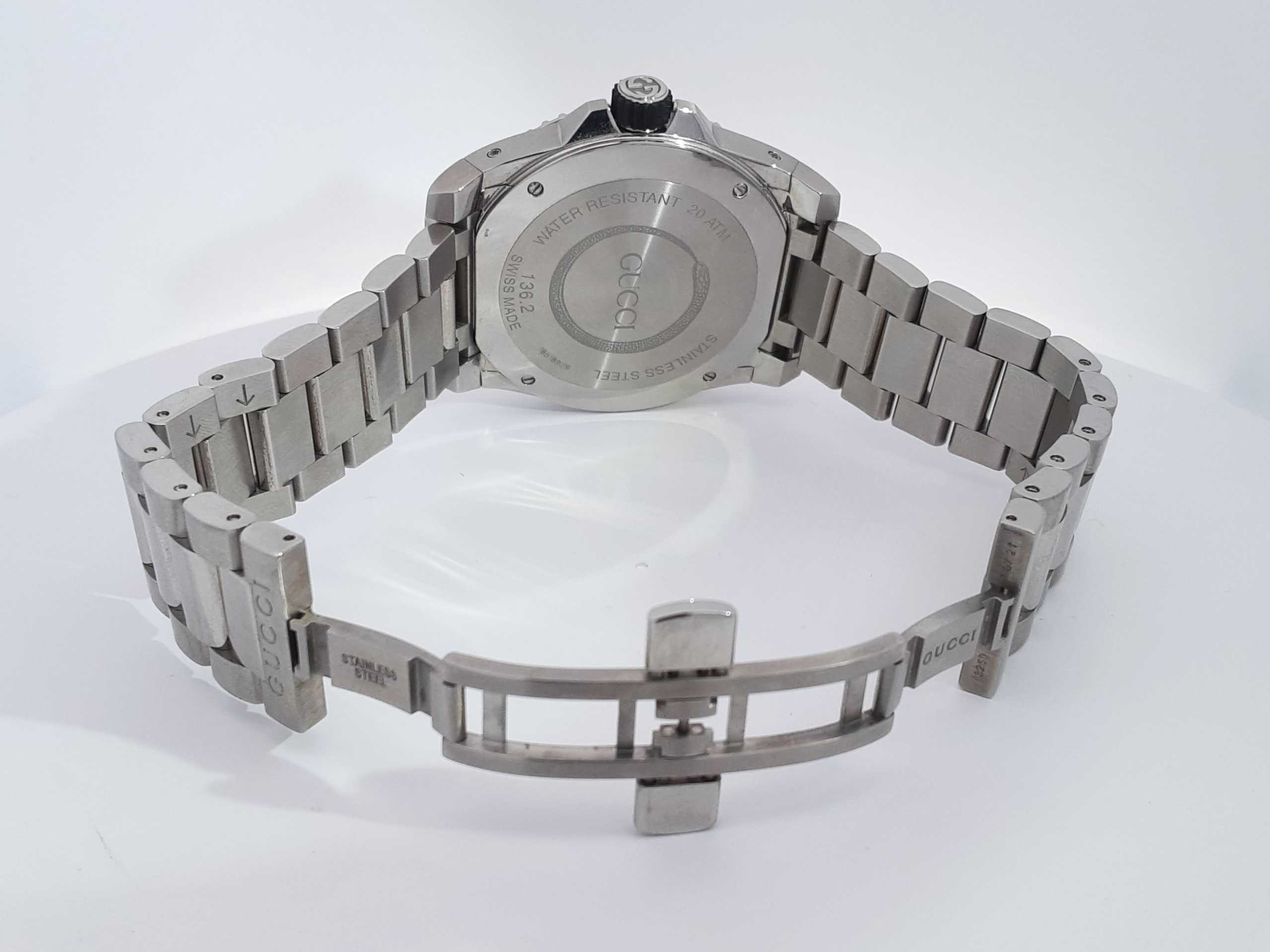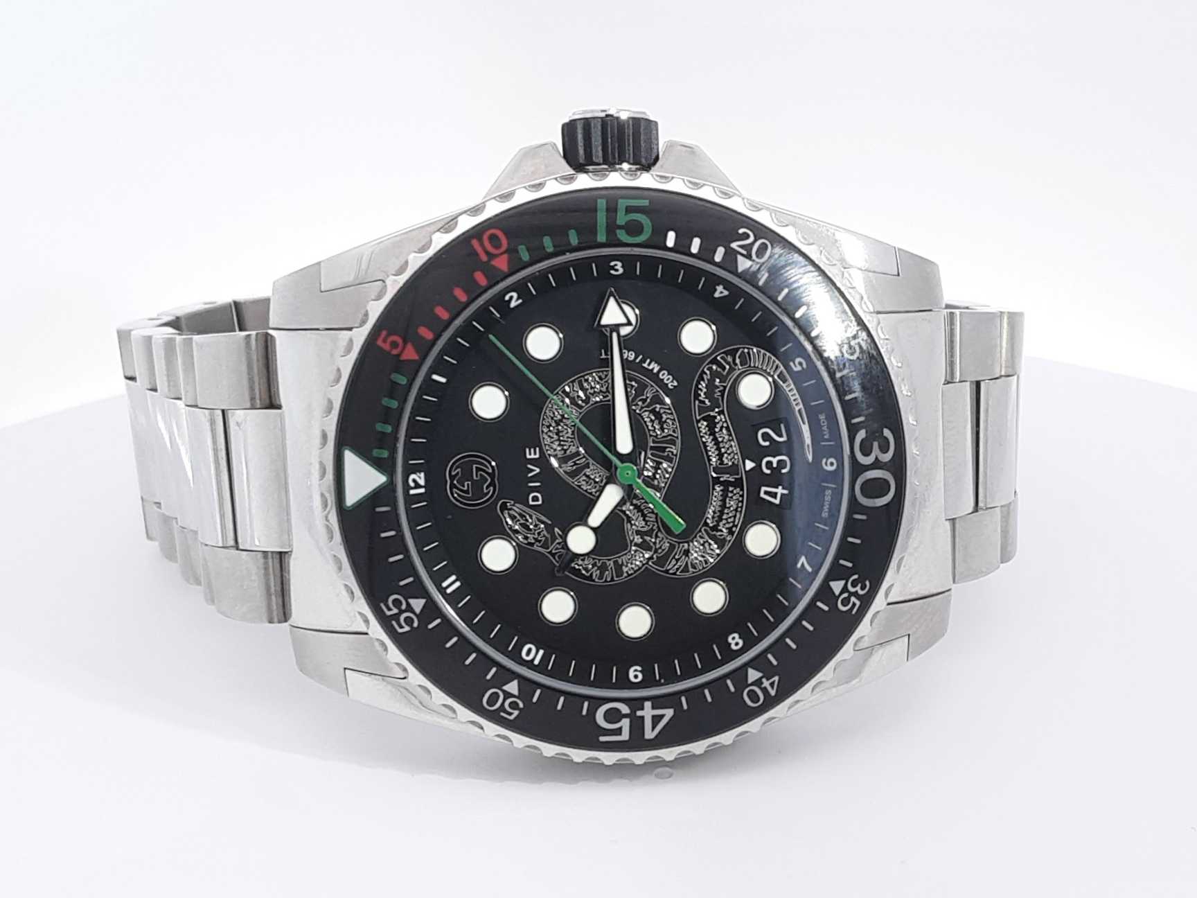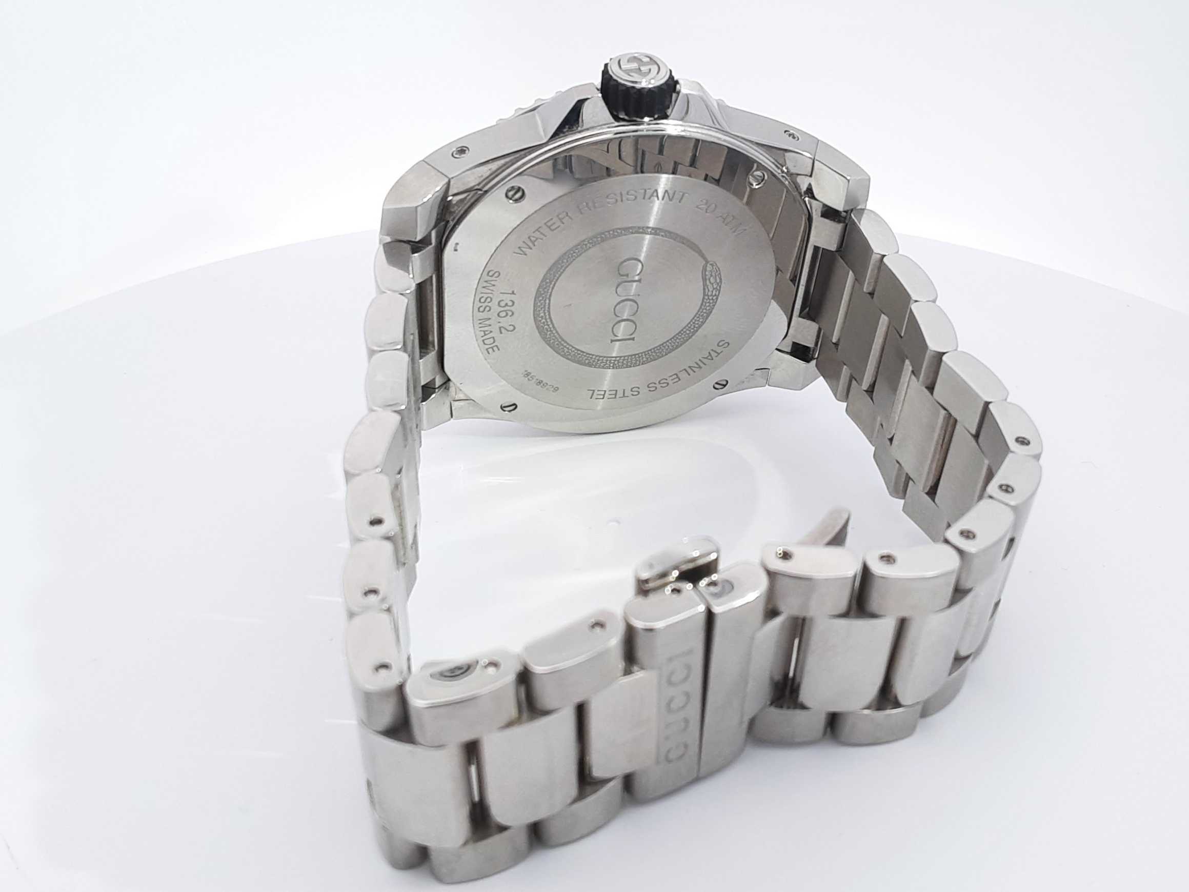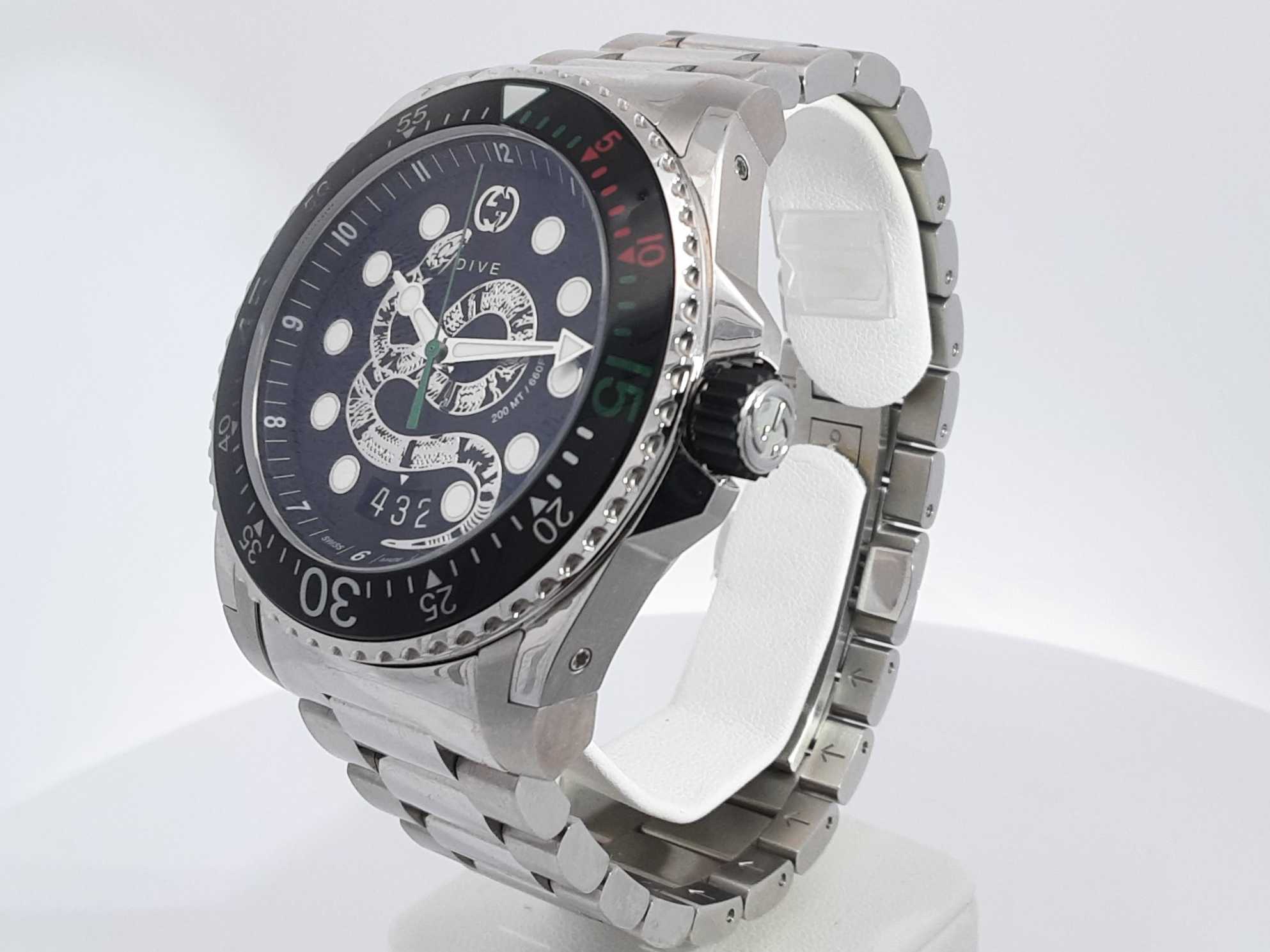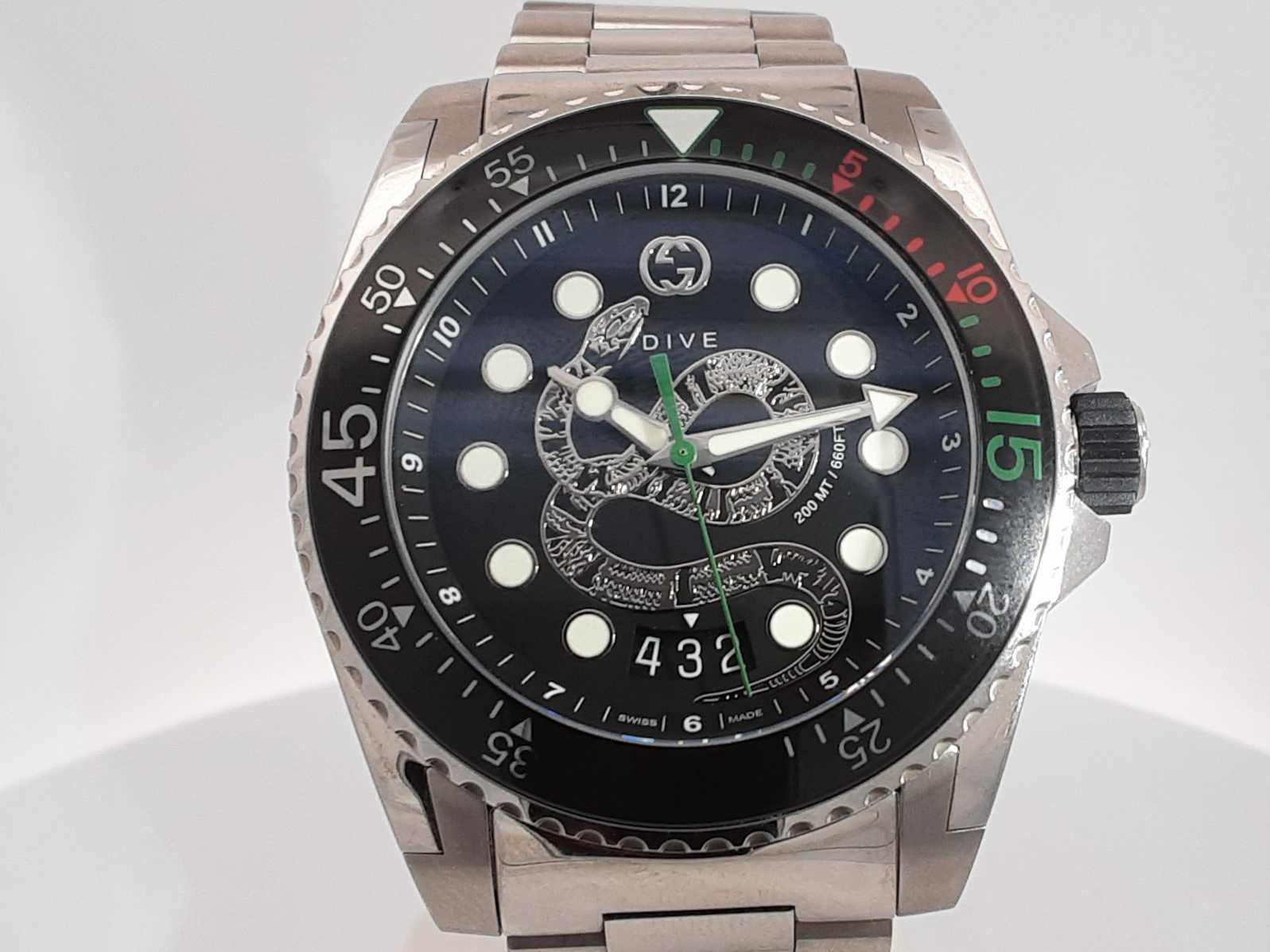 144010058197Gucci Dive 45mm Stainless Steel Black Dial Quartz Watch. Model Number 136.2. Great Pre-Owned Condition. Slight scratches on the band. Bezel and dial are in excellent condition. Comes with Box.
