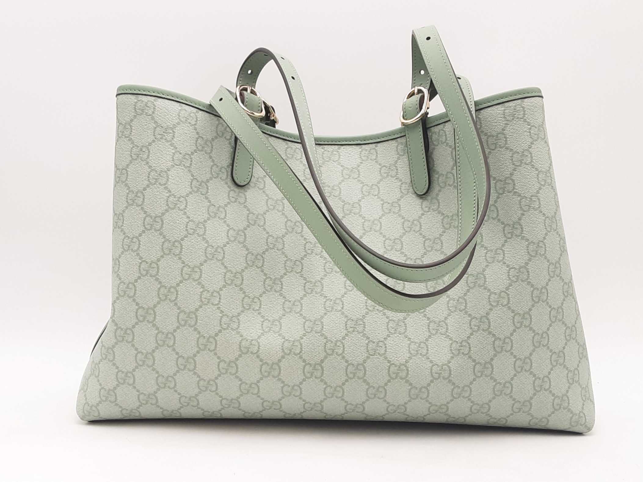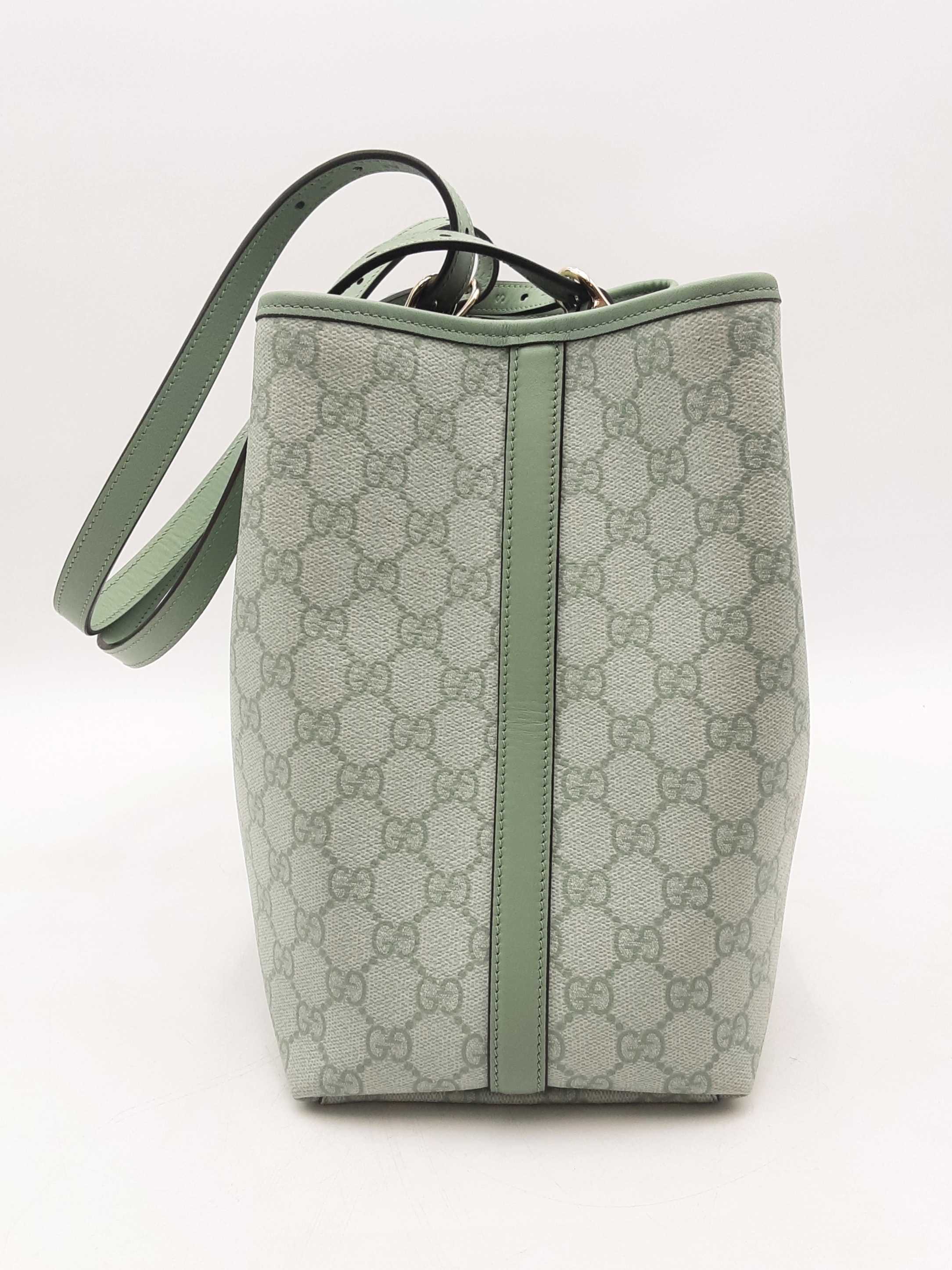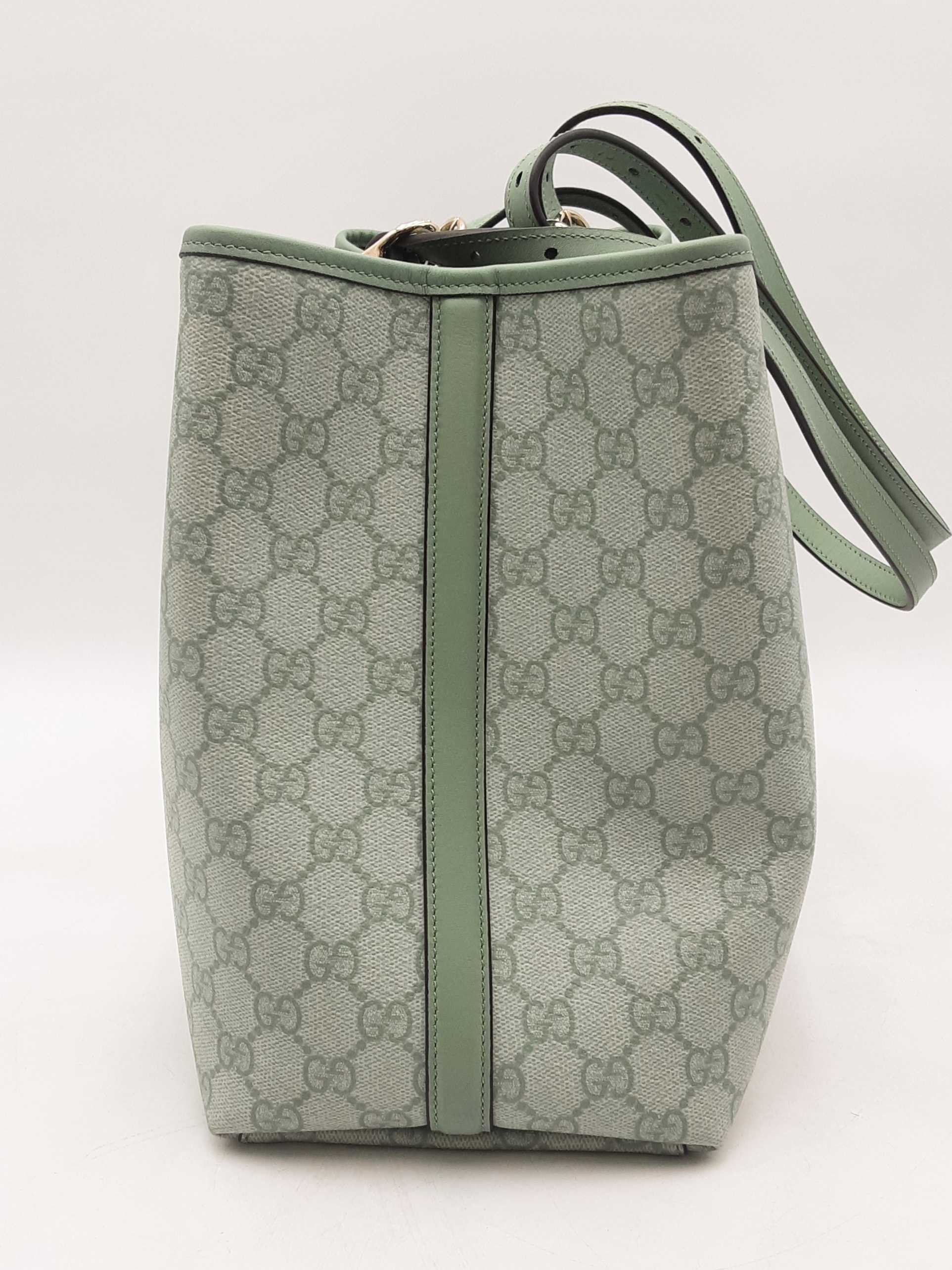 144010061461Gucci Gg Emblem Sage Green Tote Bag. Silver-Tone Hardware. Approximate measurements Height 9.5 IN X Length 15.5 IN X Width 8 IN. Handle drop 9-12 IN. Interior has dust and debris. Entrupy Certificate Card #TDK3W48