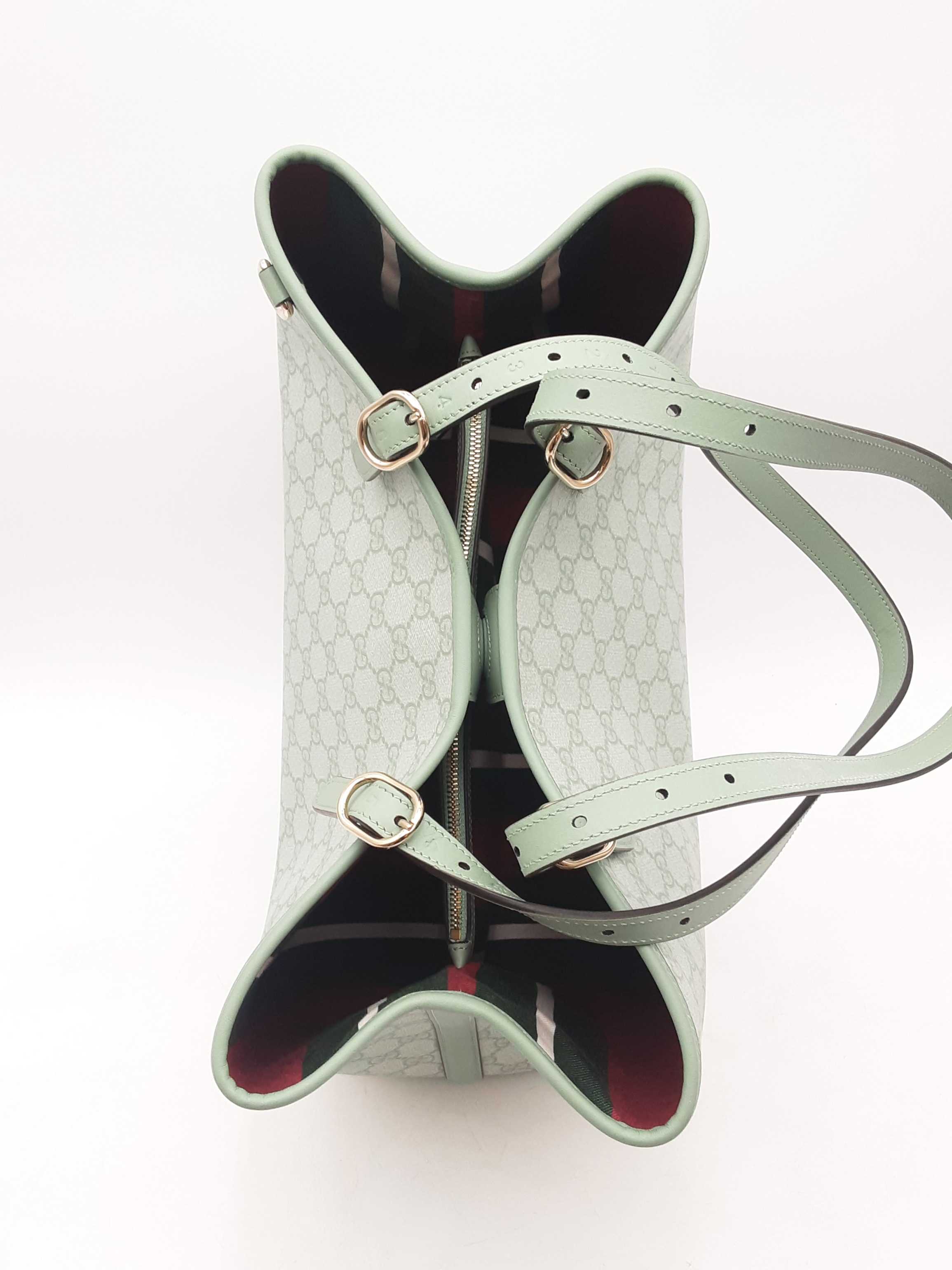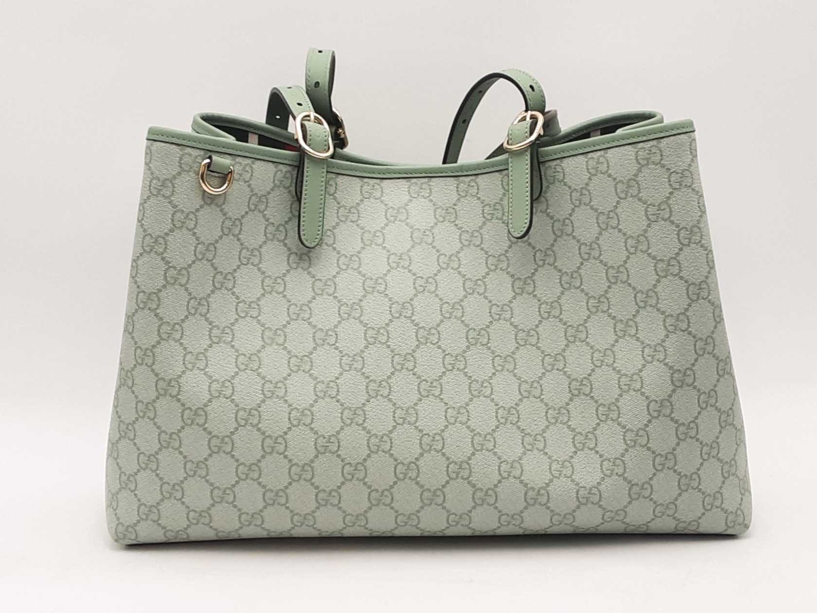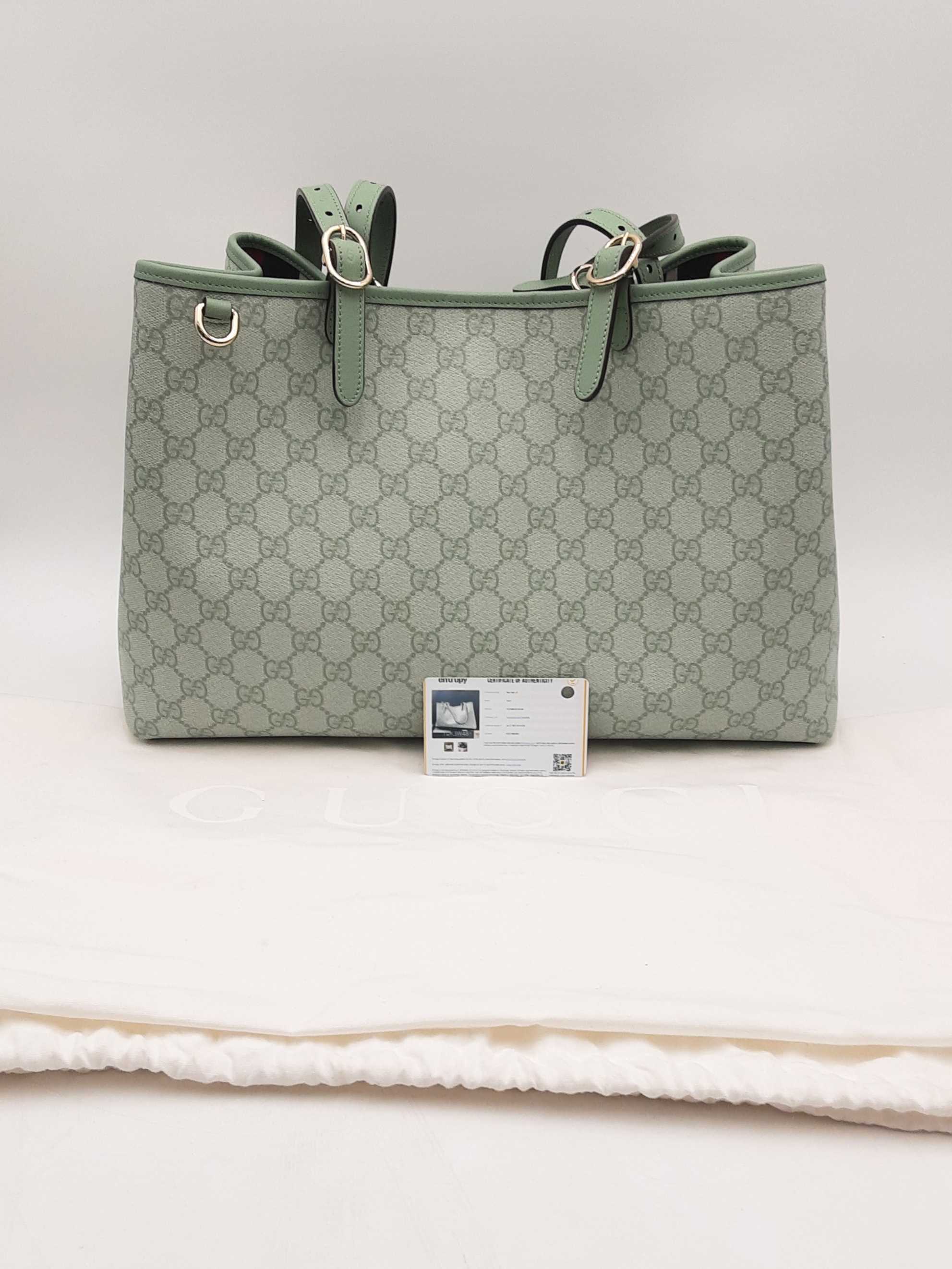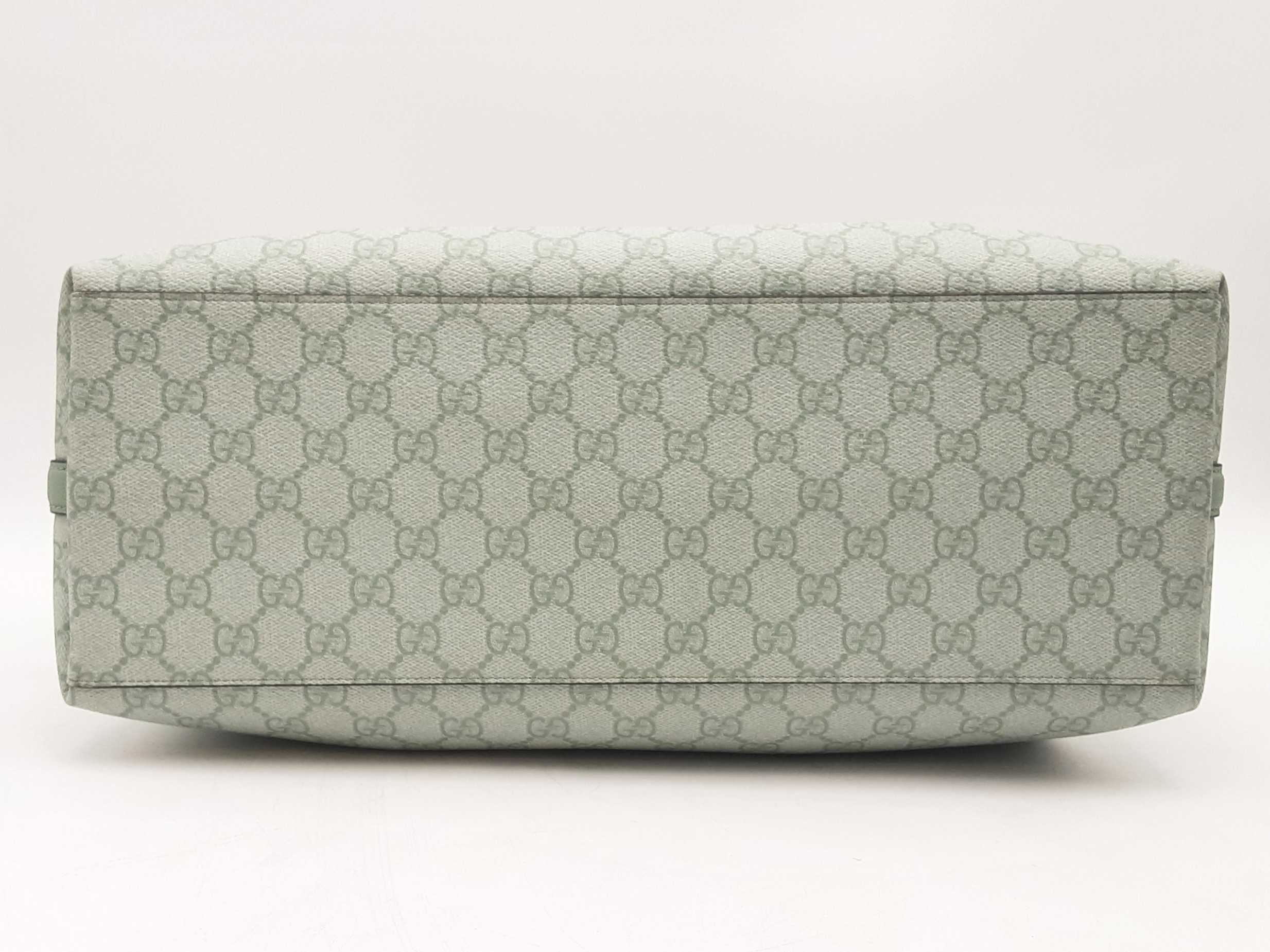 144010061461Gucci Gg Emblem Sage Green Tote Bag. Silver-Tone Hardware. Approximate measurements Height 9.5 IN X Length 15.5 IN X Width 8 IN. Handle drop 9-12 IN. Interior has dust and debris. Entrupy Certificate Card #TDK3W48