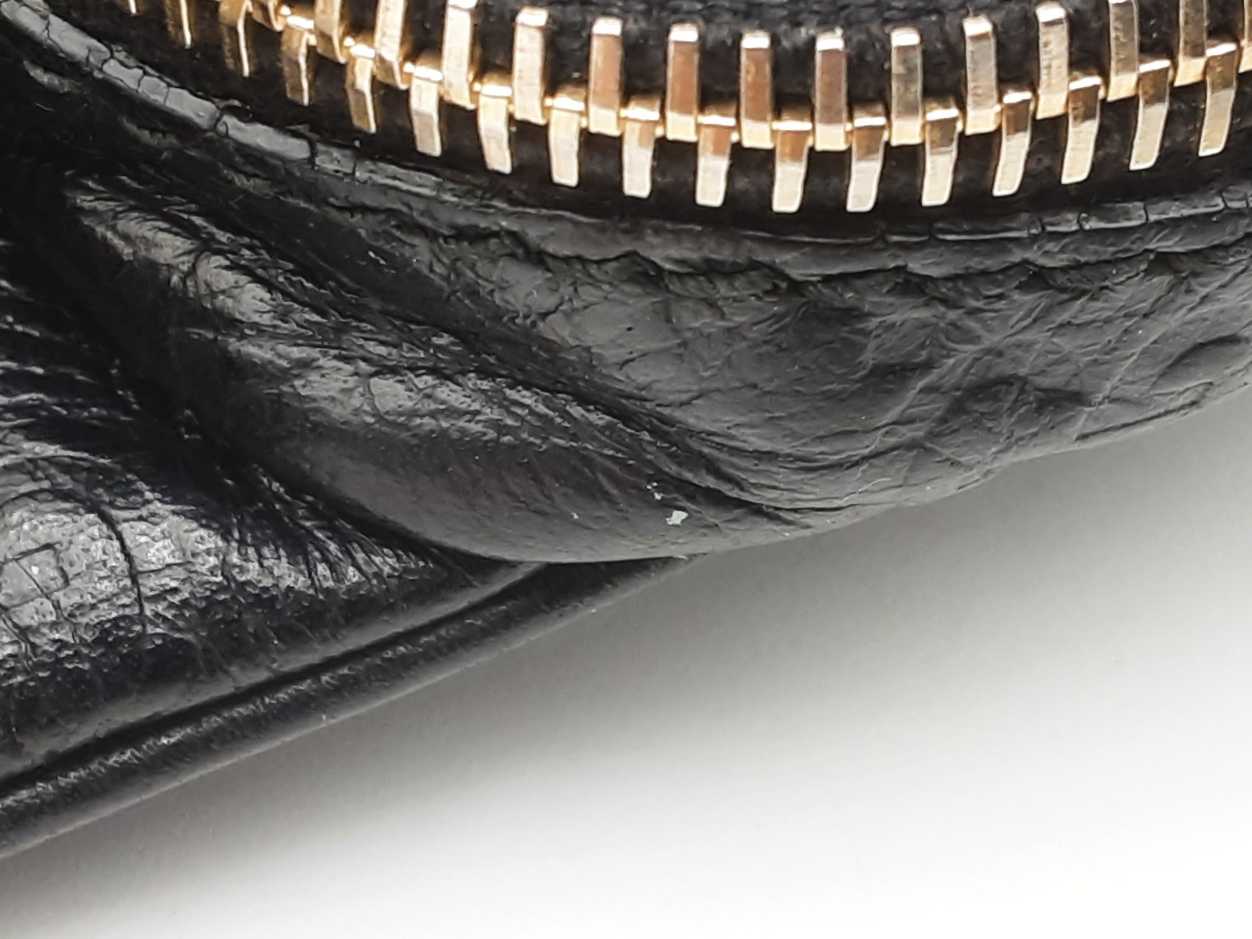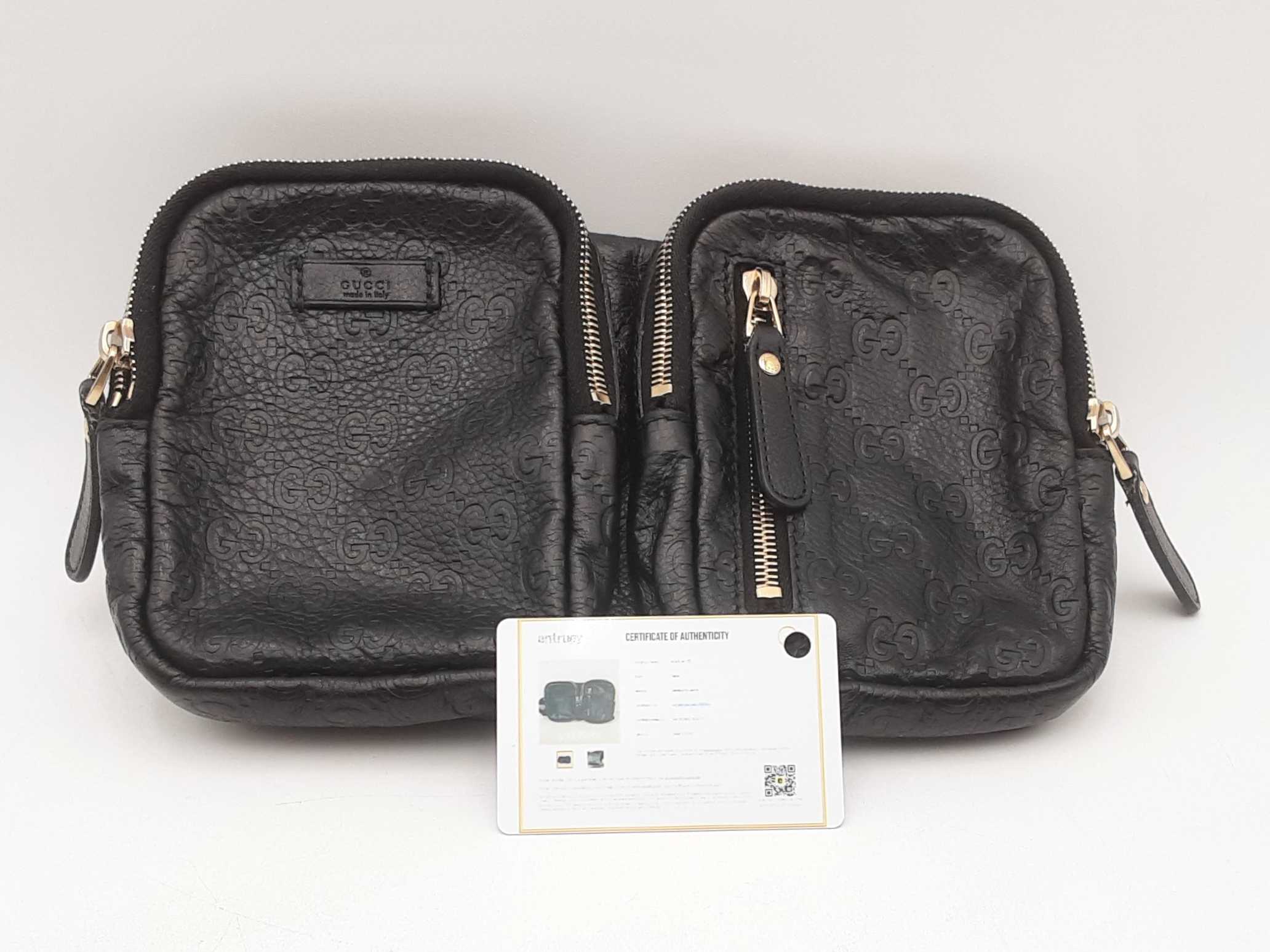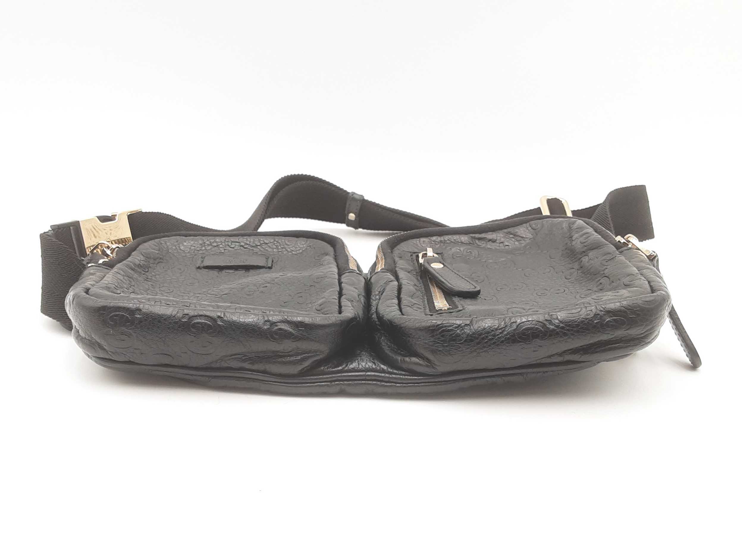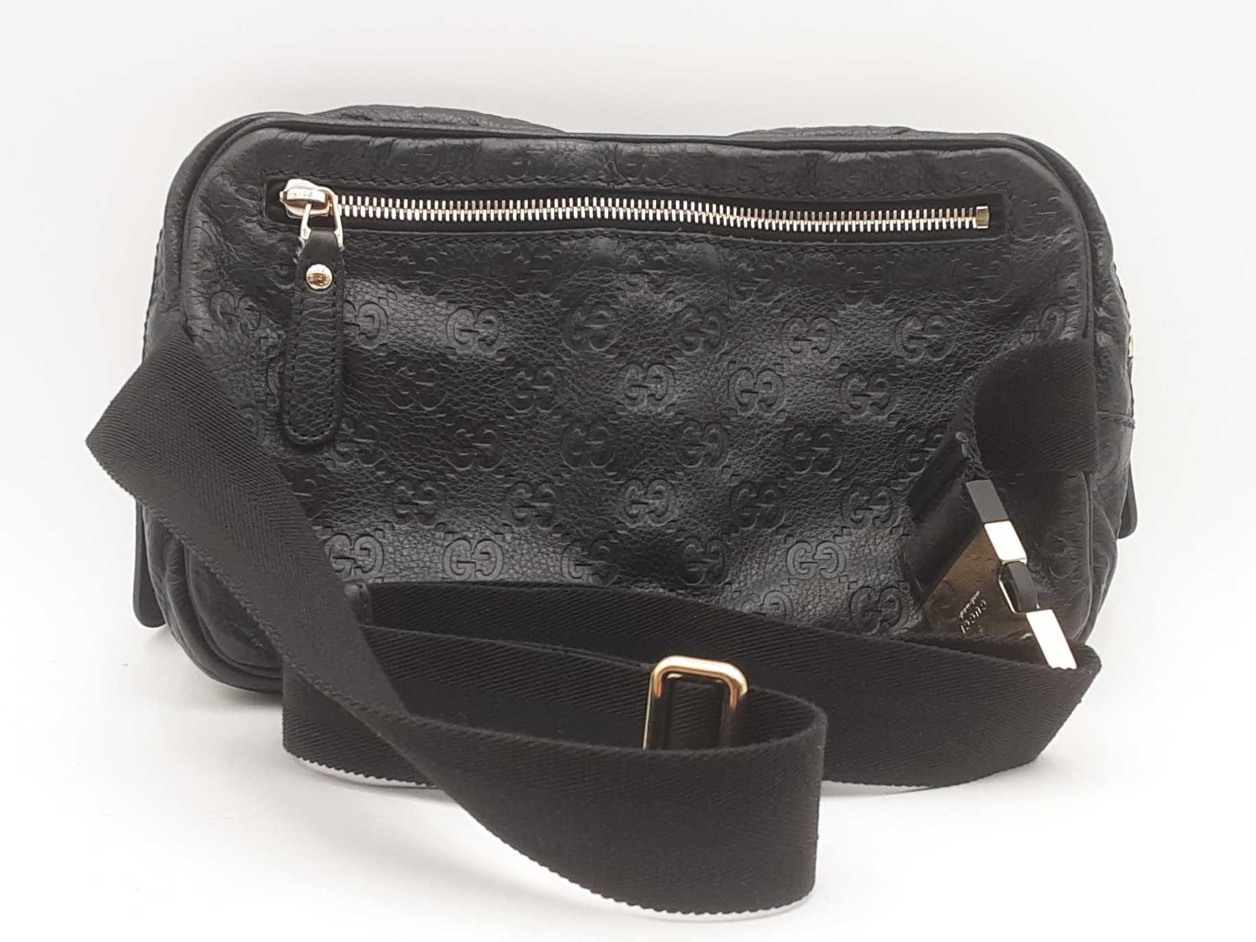 144010055821Gucci Guccissima Black Leather Belt Bag. Yellowish Steel Toned Hardware. Approximate measurements Height 7 IN X Length 11 IN X Width 1.5 IN. Good Pre-Owned Condition. Scratches and wear on hardware. Loose threads on zipper pulls. Entrupy Certificate #V7XT9HV