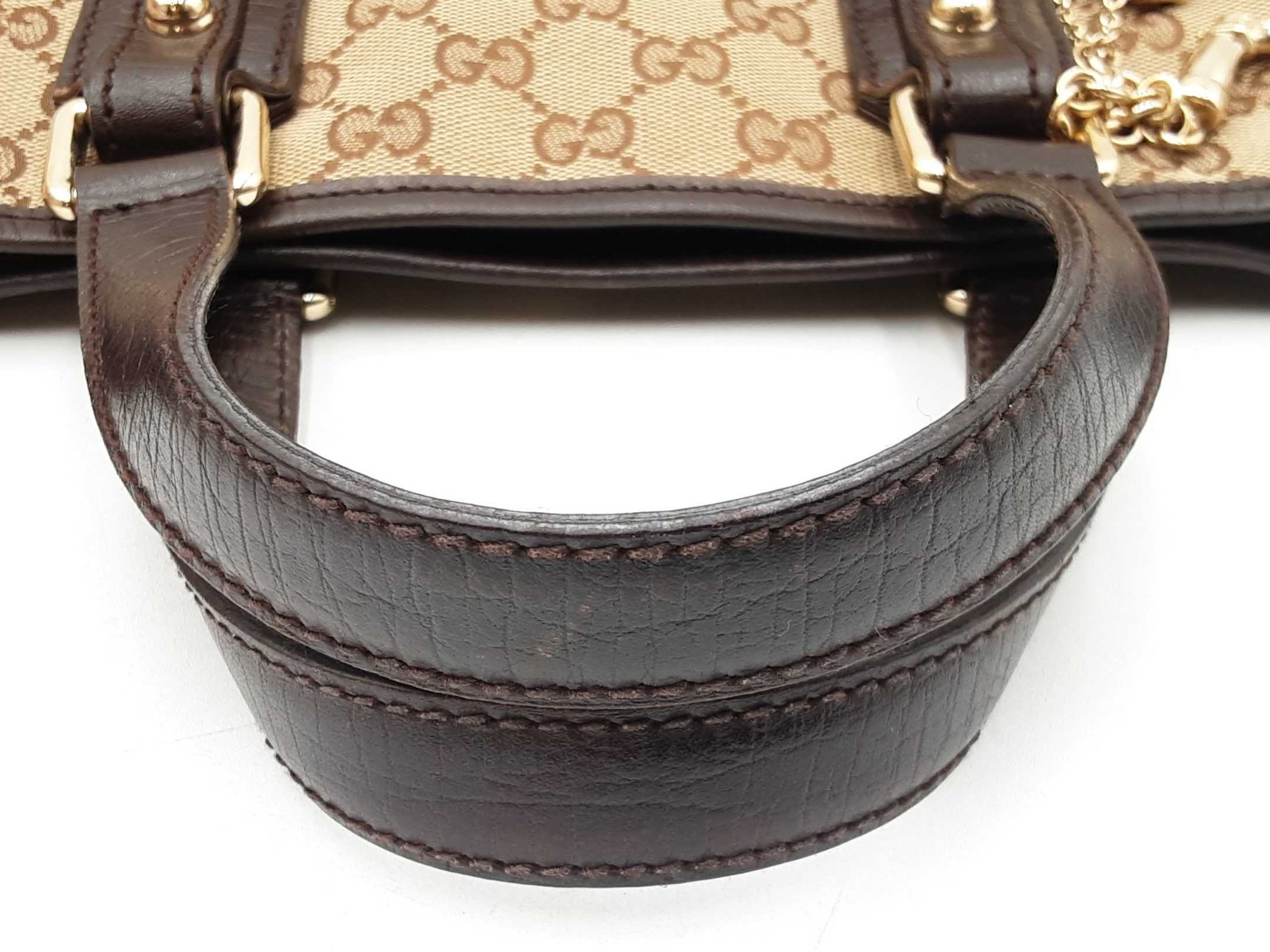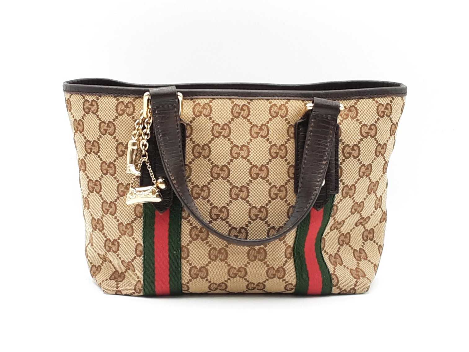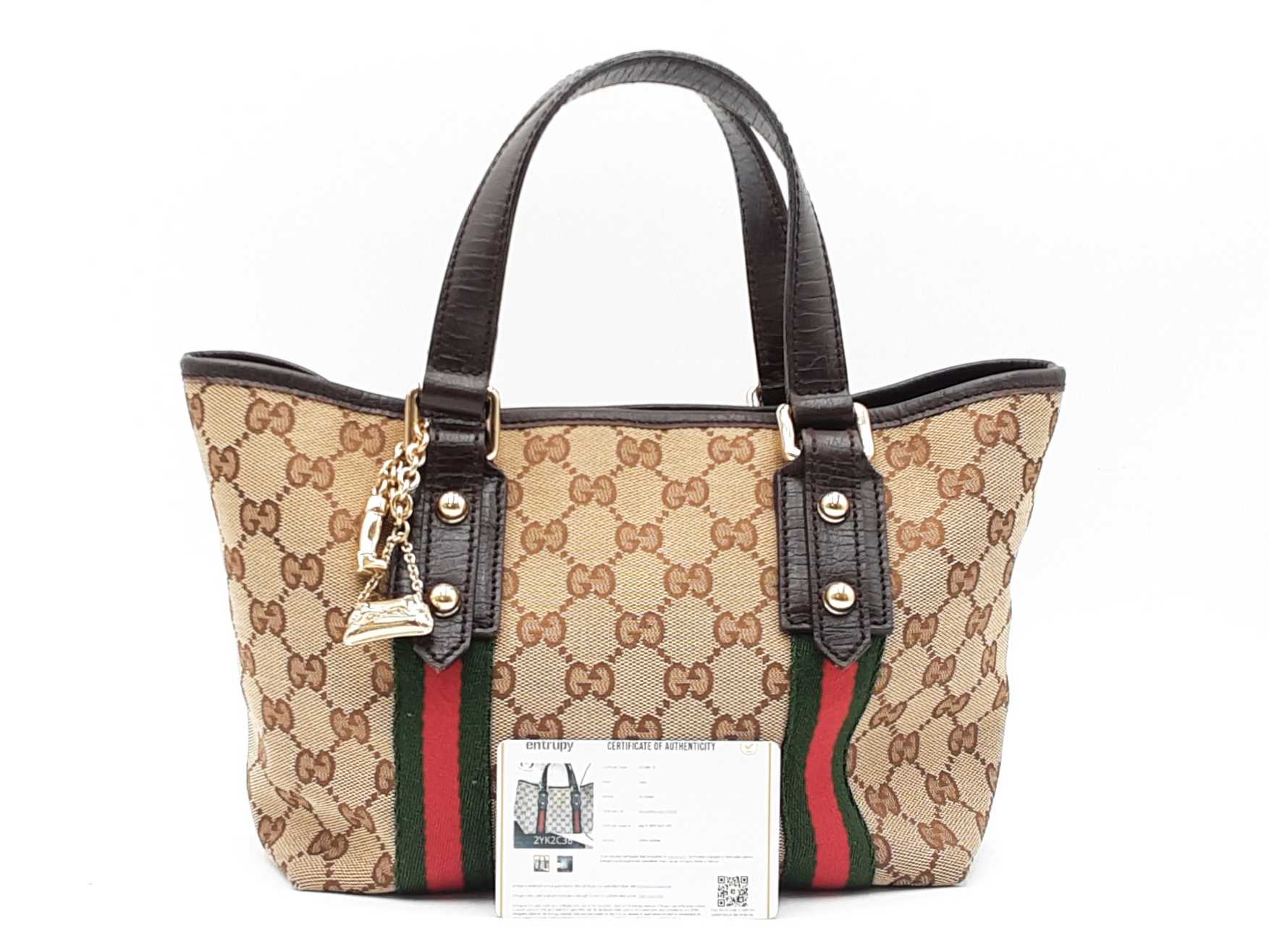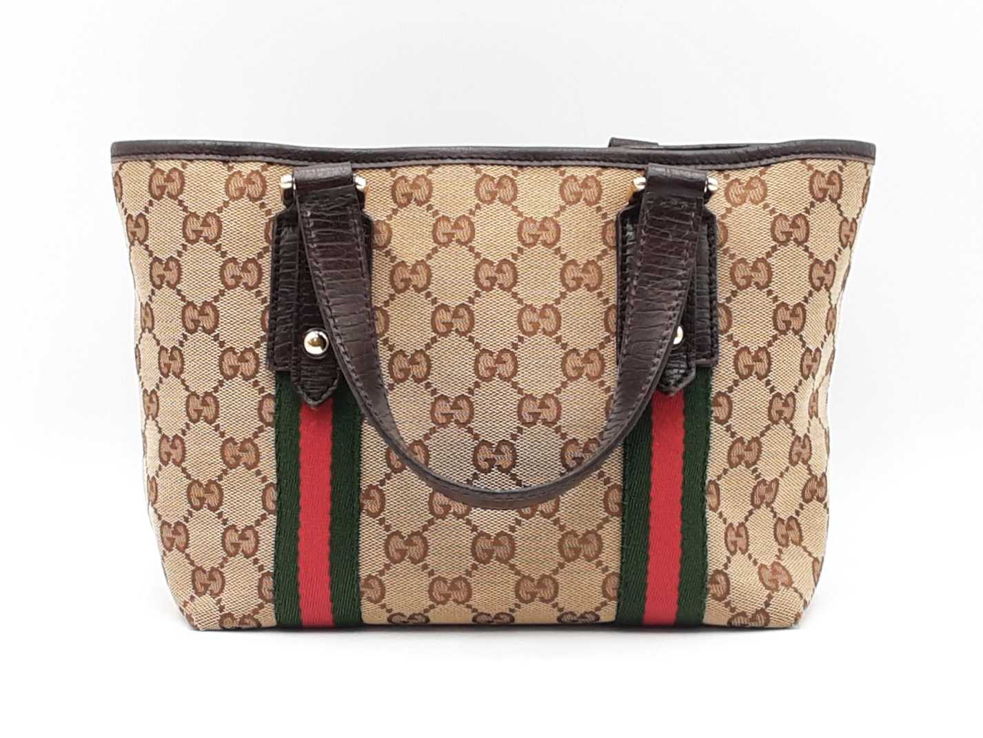 144030027297Gucci Small Jolicouer Tote In GG Monogram Canvas Fabric. Gold-Tone Hardware. Base Length 8.5 IN X Height 6.75 IN X Width 4.25 IN X Handle Drop 4 IN, approximately. Good Pre-Owned Condition. Wear and creasing on leather details, including straps. Entrupy Certificate # 2YK2C38