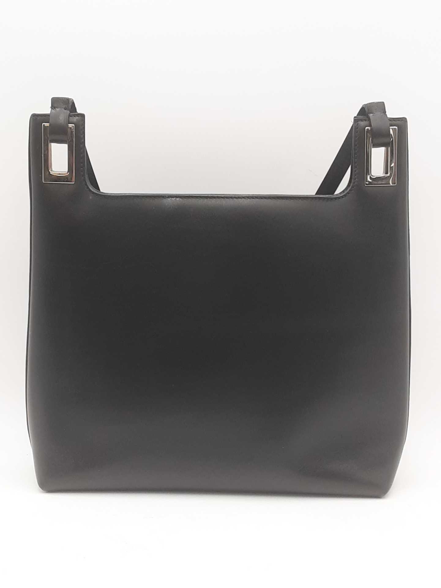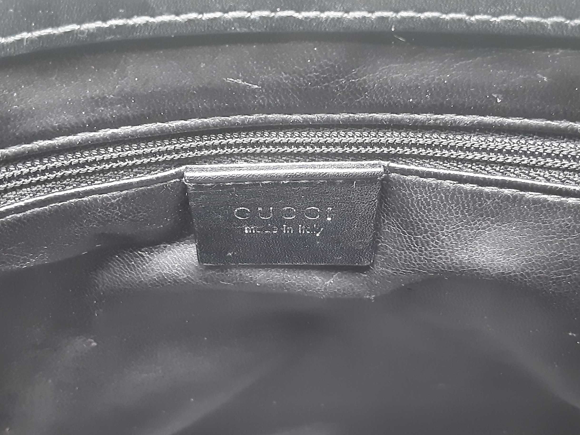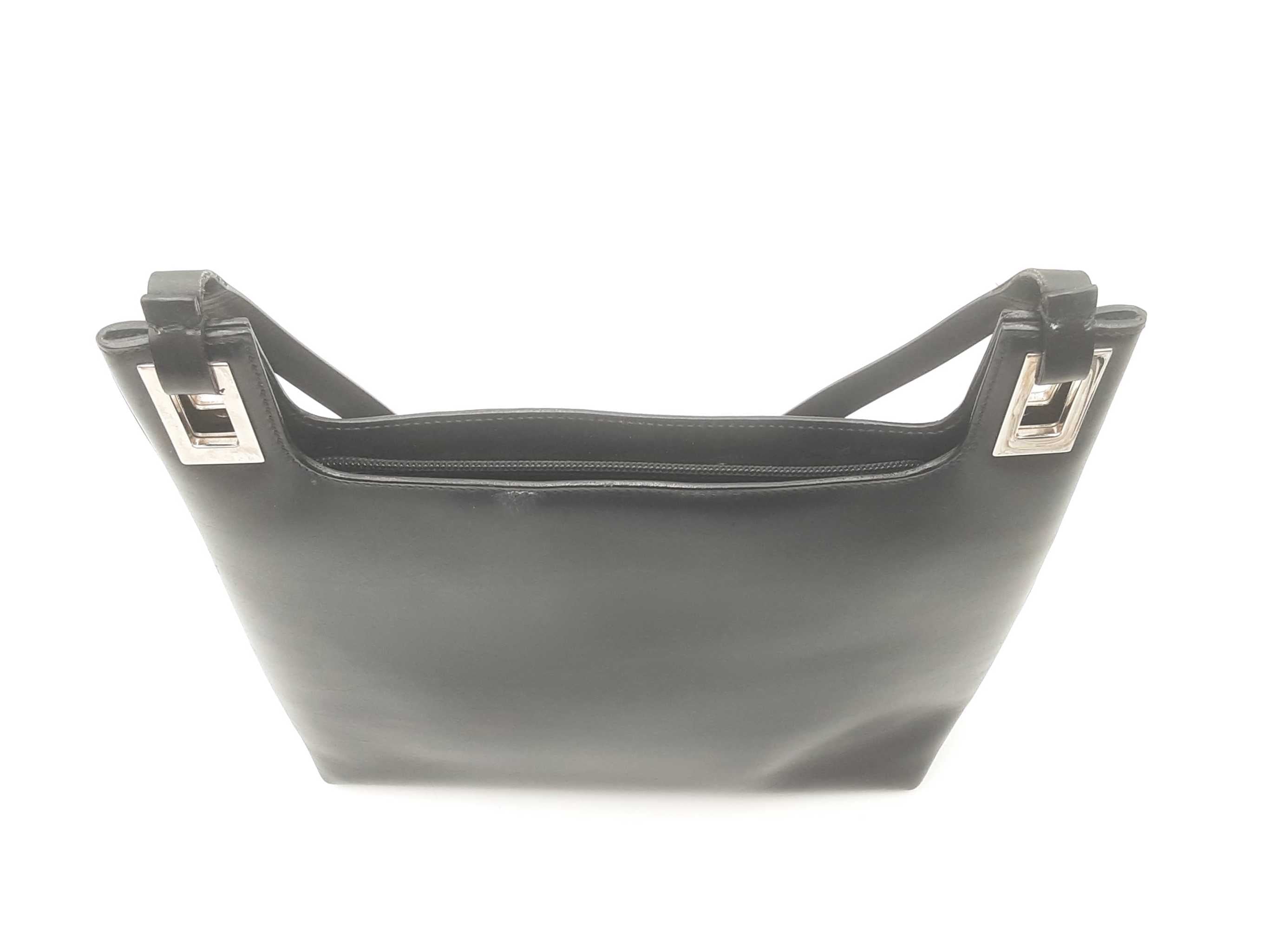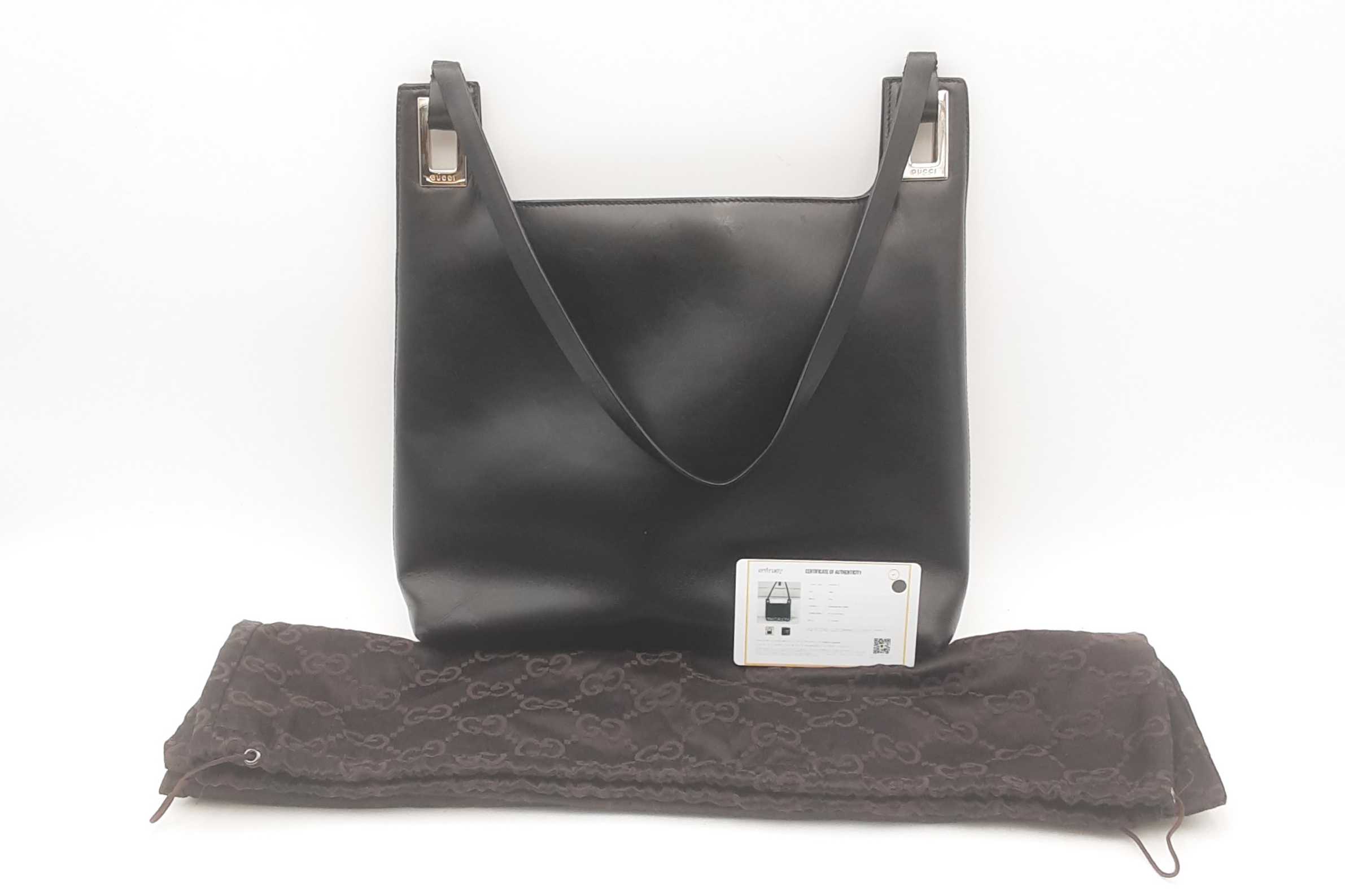 144010060009Gucci Vintage Black Leather Shoulder Bag. Stainless Steel Hardware. Approximate measurements Height 9 IN X Length 11 IN X Width 3 IN. Handle drop 10 IN. Good Pre-Owned Condition. Scratches on hardware. White residue on exterior. Strap is separating at the connection to bag on both sides. Dust, debris and light staining on interior. Entrupy Certificate #THGR43Y