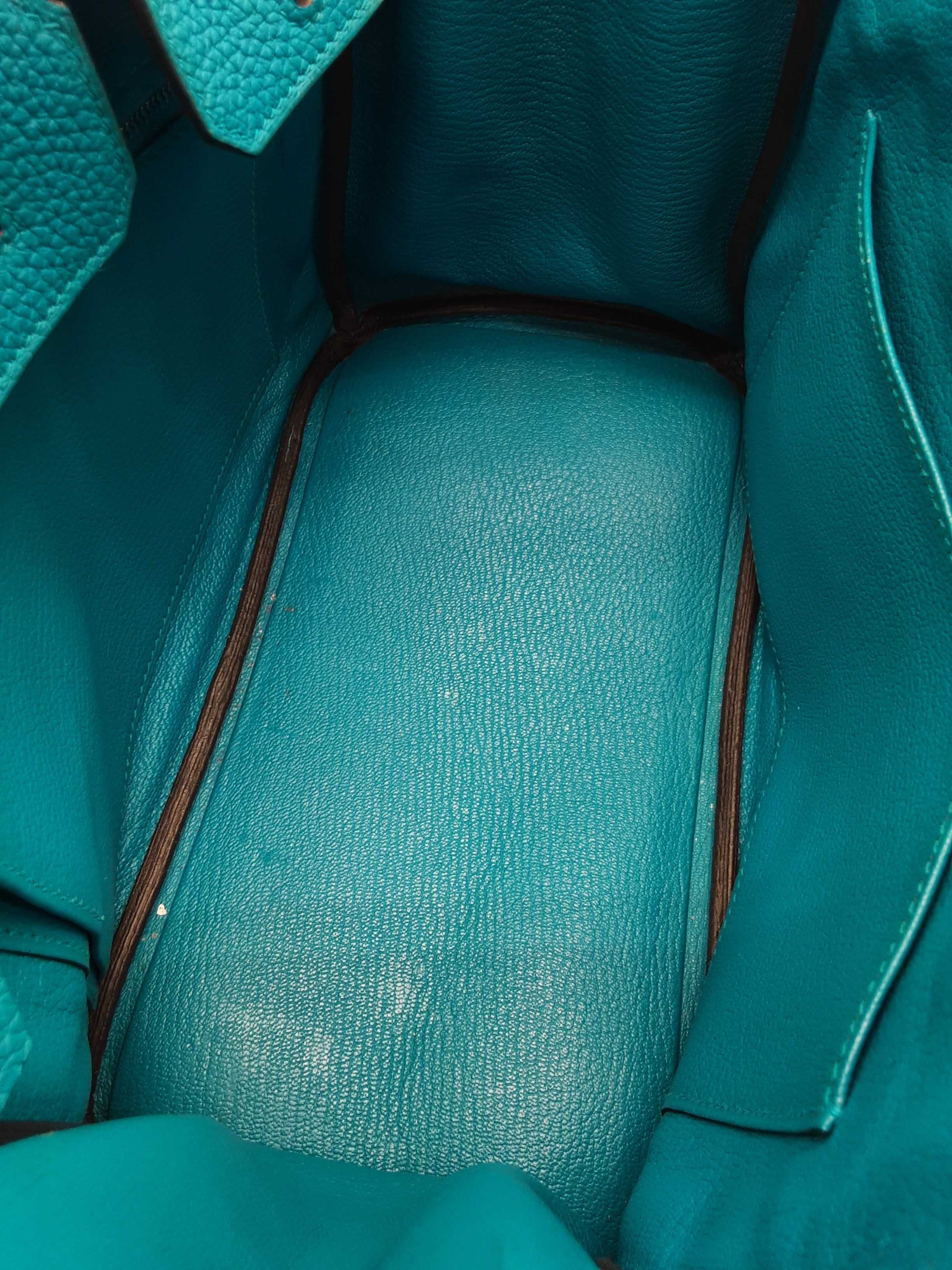 144020037982Hermes Birkin 25CM Bleu Zanzibar Blue Togo Palladium Hardware Handbag. Length 10 IN X Height 7.5 IN X Width 5.5 IN X Drop 2.5 IN. Date Code Z (2021). Entrupy Certificate #VGWH7JT. Pre-owned - Good Condition with creases, flap curved, scratches on metal hardware, white mark on exterior bottom, marks and wear on flap spine, wear on edges, marks and indentations on interior, and wear and discoloration on corners. Note: Pictures are more blue or green than real color.