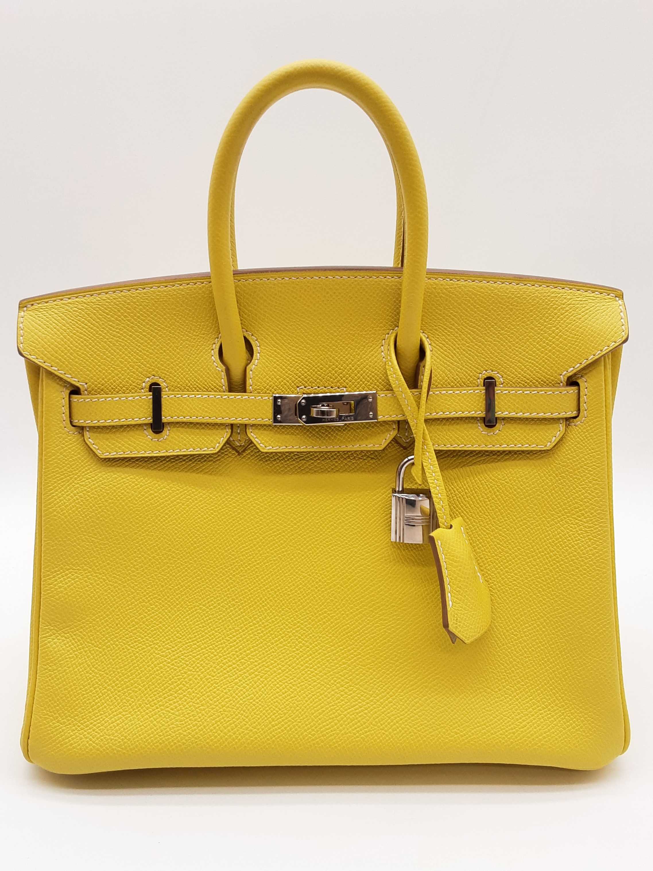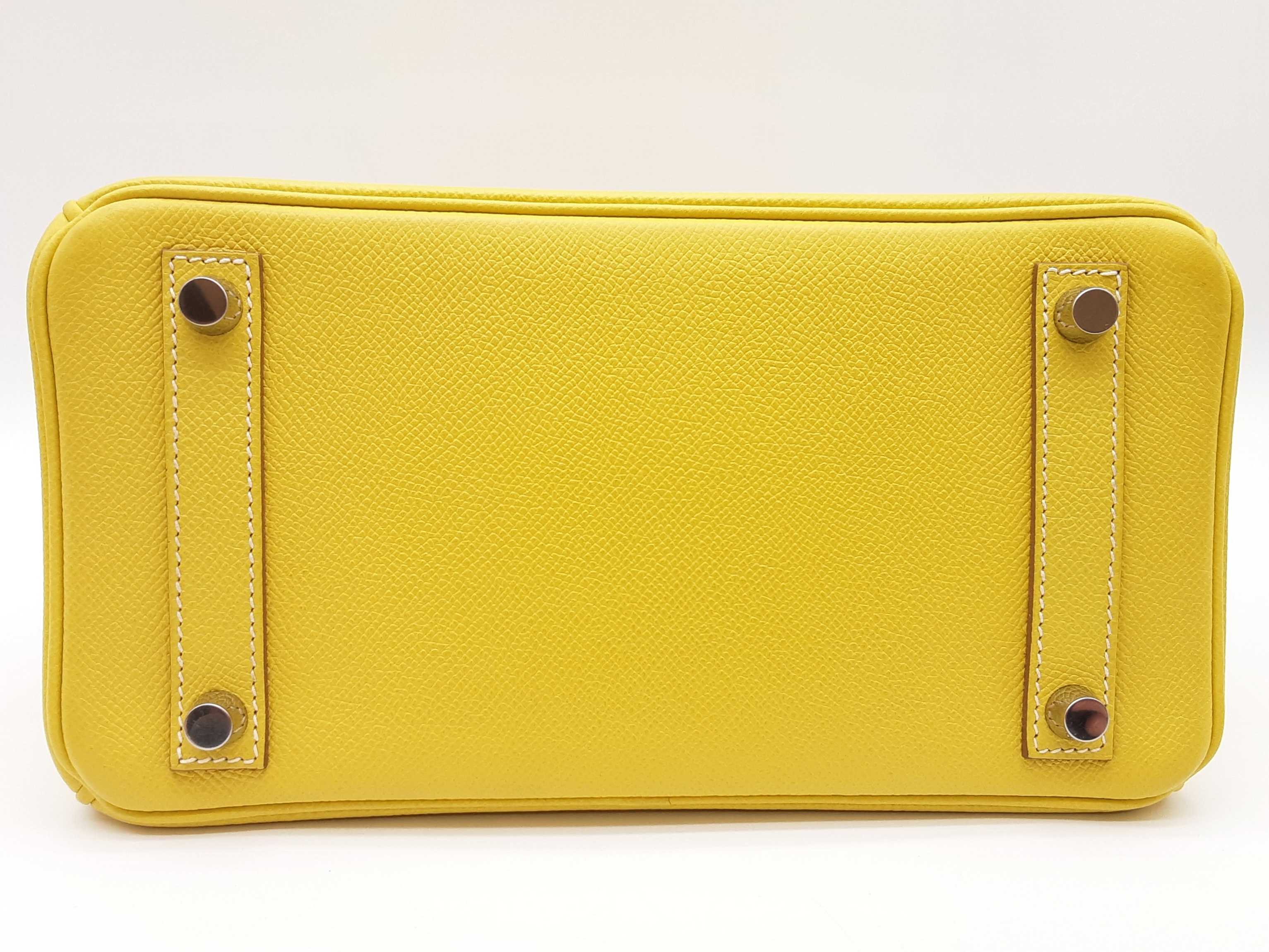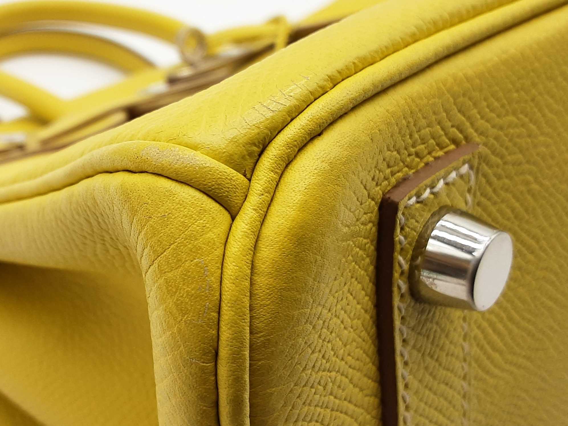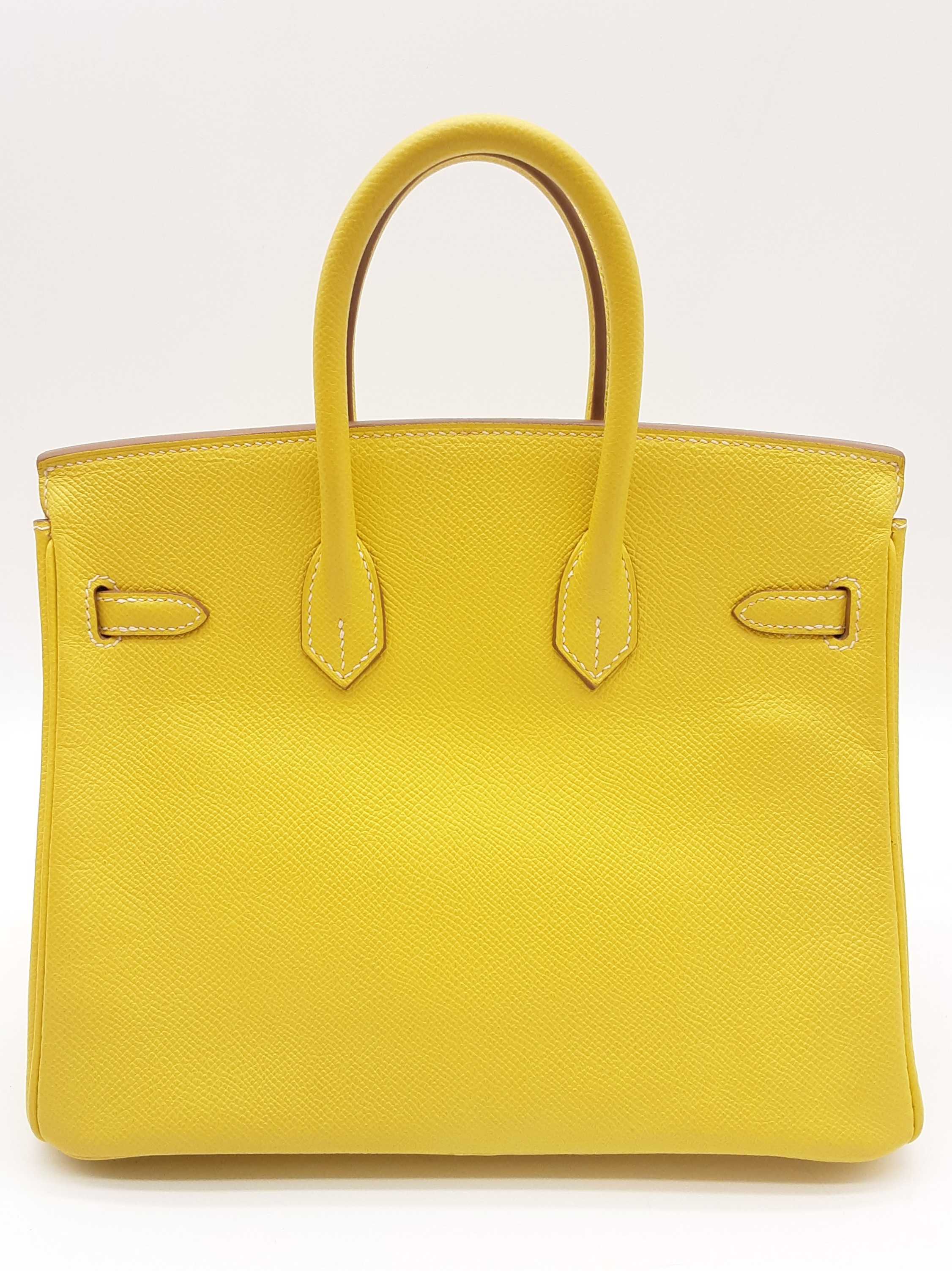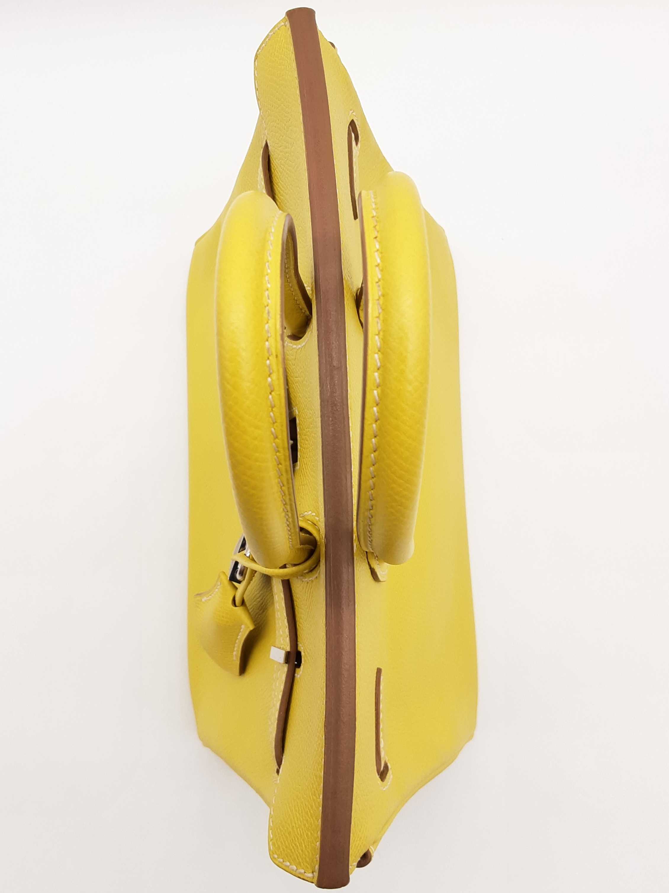 144020033314Hermes Birkin 25CM Special Order Candy Lime Yellow Epsom Gris Gray Interior Palladium Hardware Handbag. Length 10 IN X Height 7.5 IN X Width 5 IN X Drop 2.5 IN. Date Code Square O (2011). Pre-owned - Good Condition with creases, flap curved, scratches on metal hardware and bottom interior, marks on interior, marks and scratches in interior pockets, and wear on corners and flap notches.