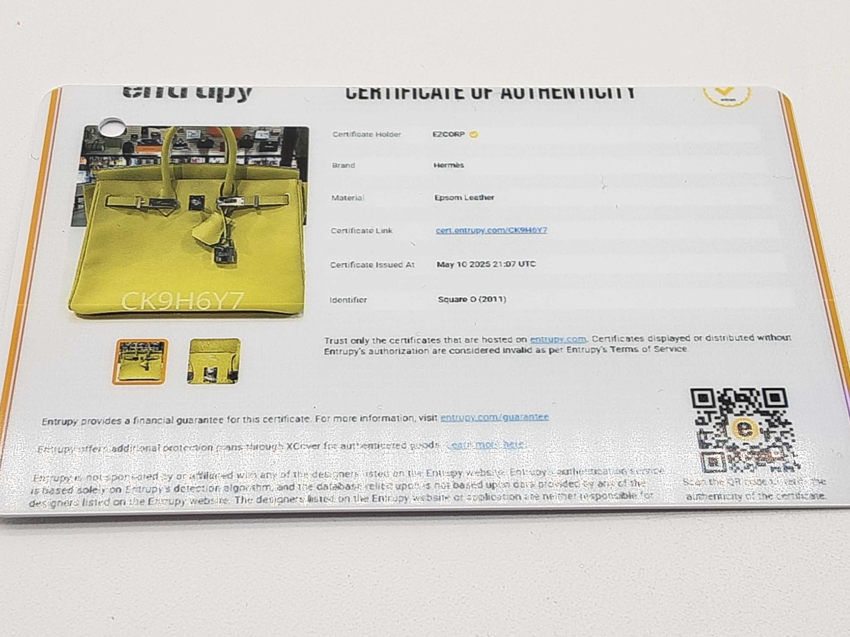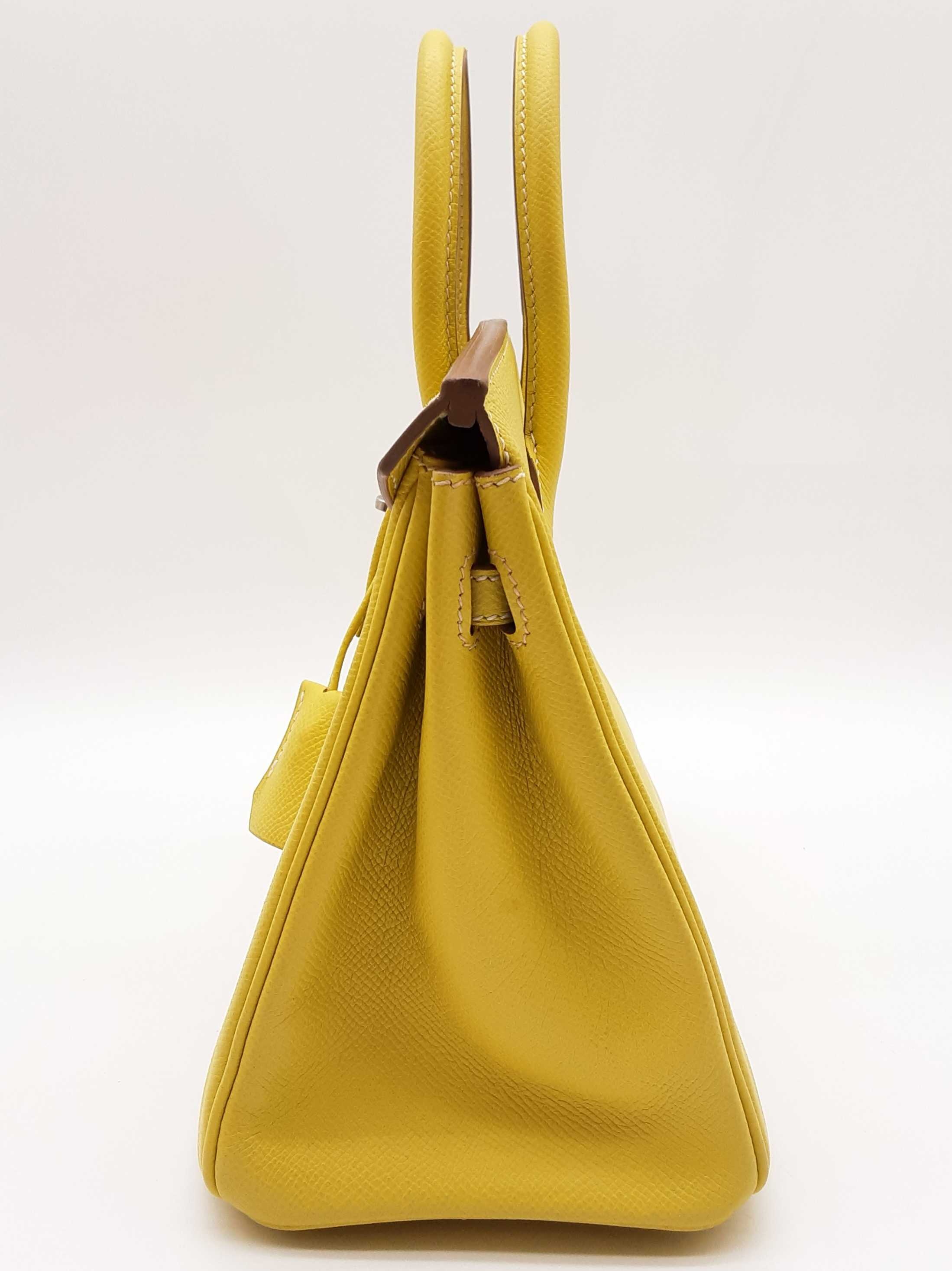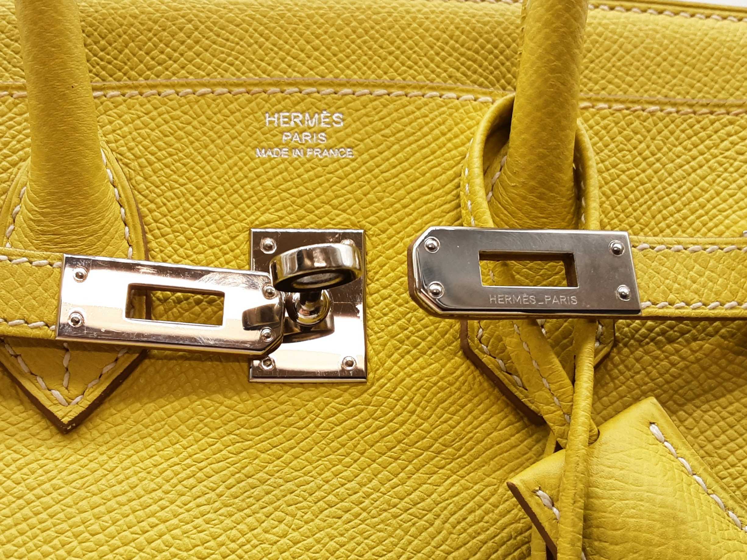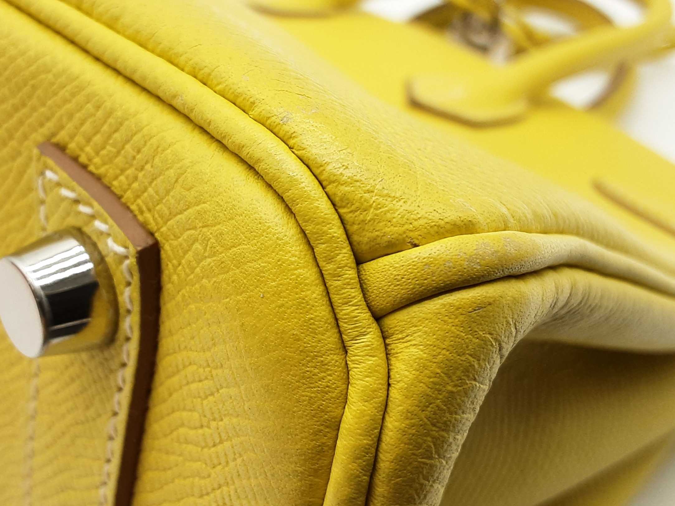 144020033314Hermes Birkin 25CM Special Order Candy Lime Yellow Epsom Gris Gray Interior Palladium Hardware Handbag. Length 10 IN X Height 7.5 IN X Width 5 IN X Drop 2.5 IN. Date Code Square O (2011). Pre-owned - Good Condition with creases, flap curved, scratches on metal hardware and bottom interior, marks on interior, marks and scratches in interior pockets, and wear on corners and flap notches.