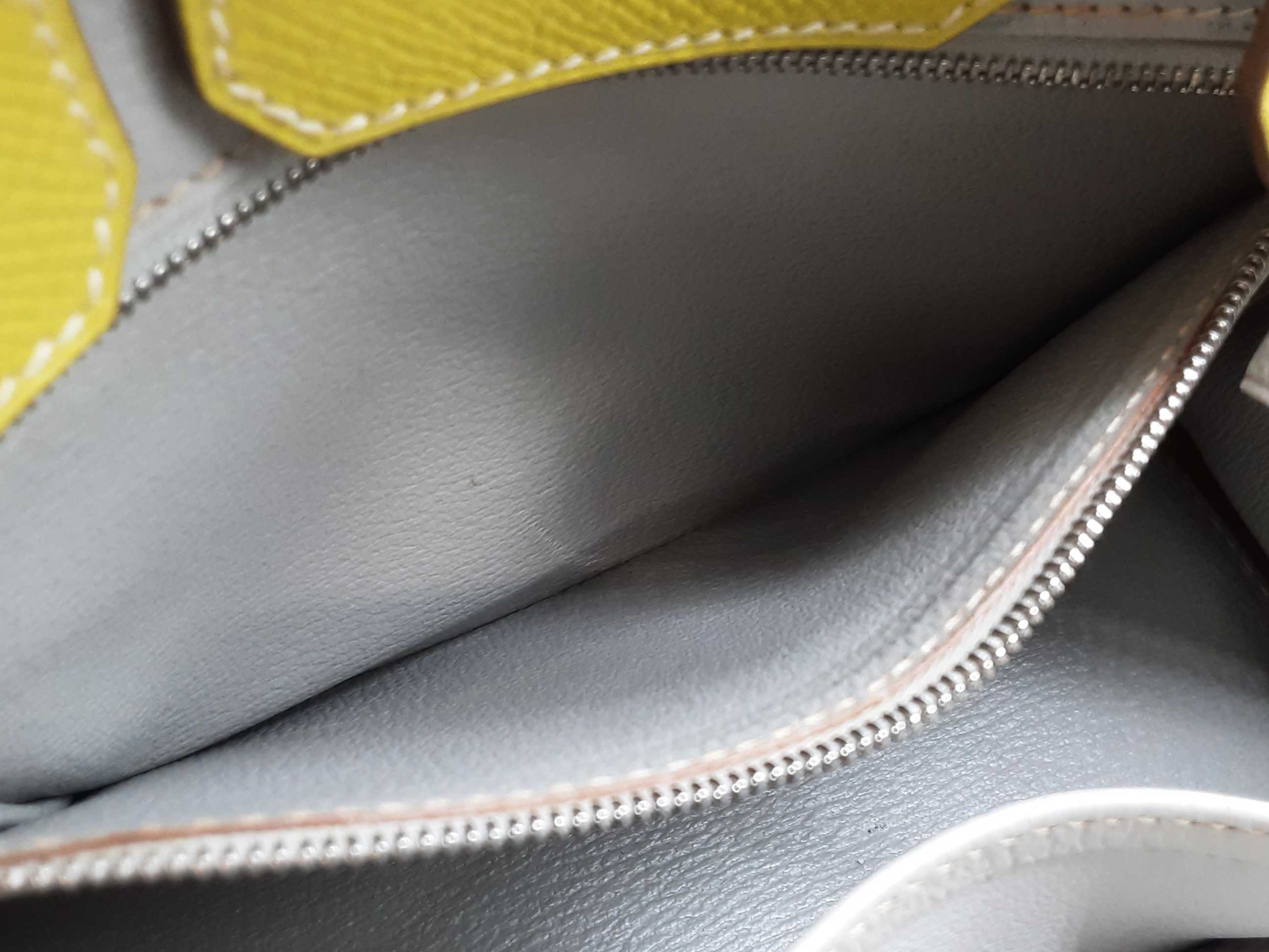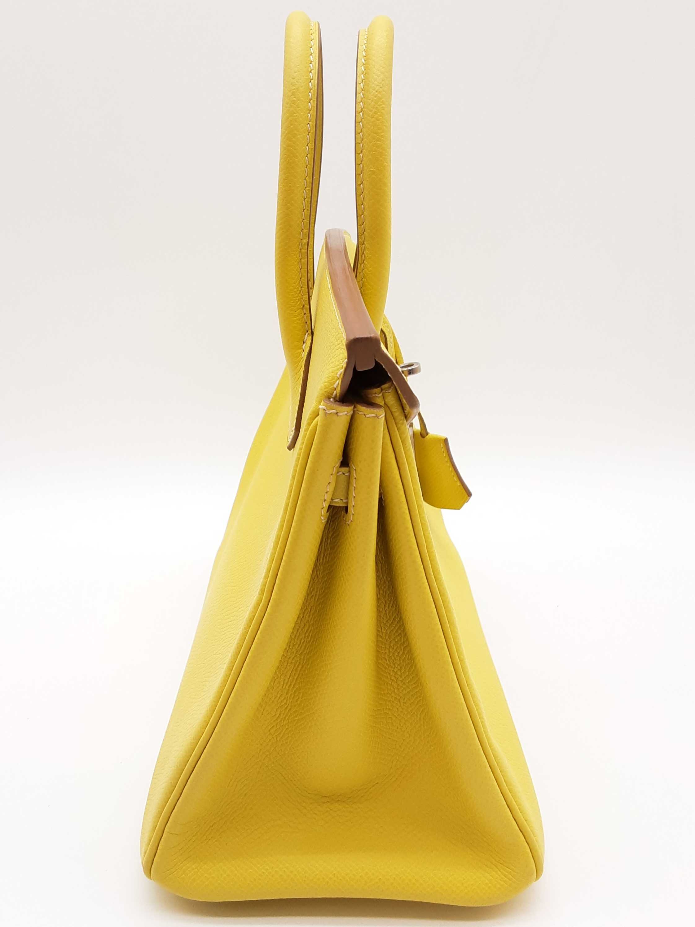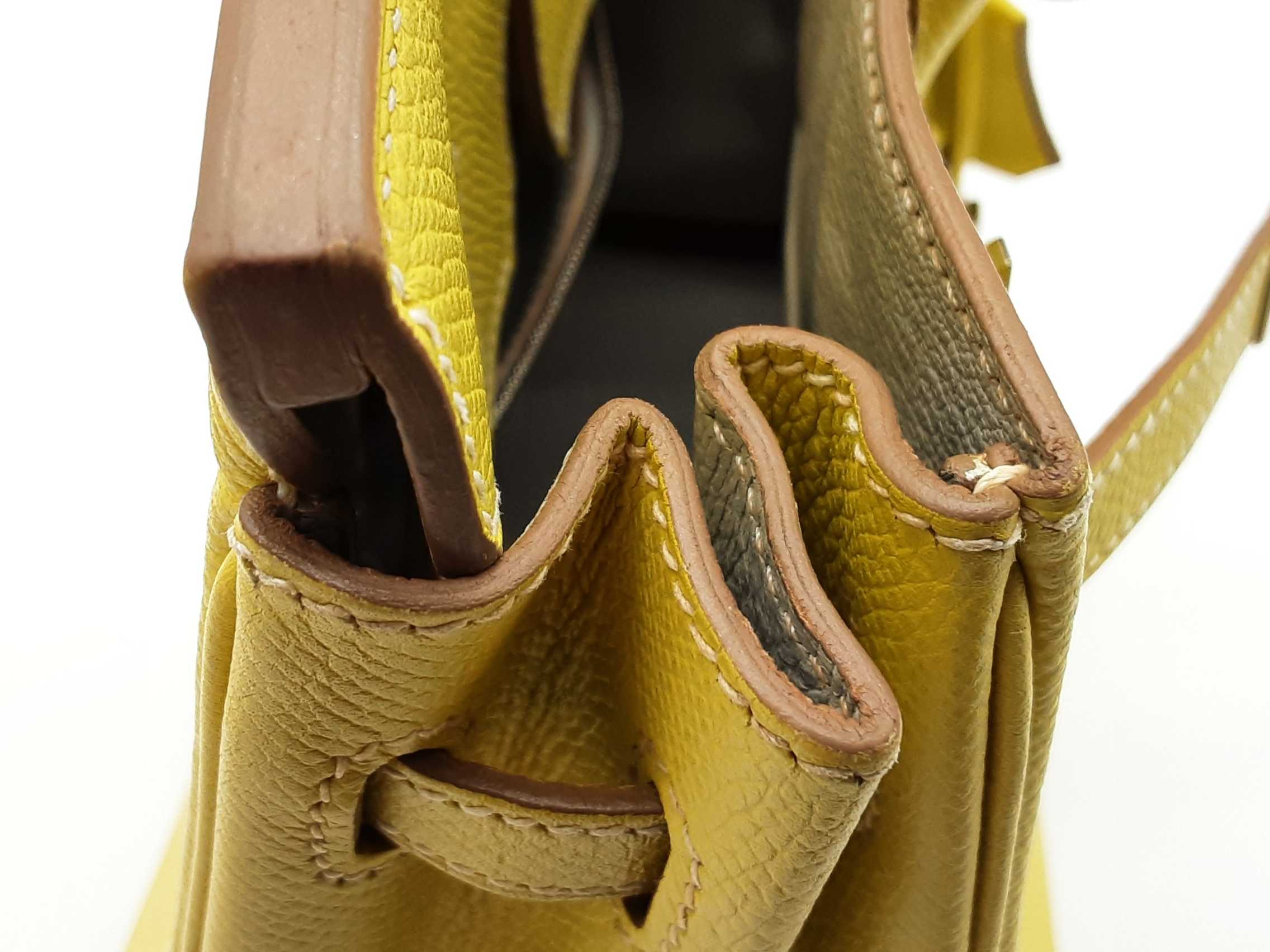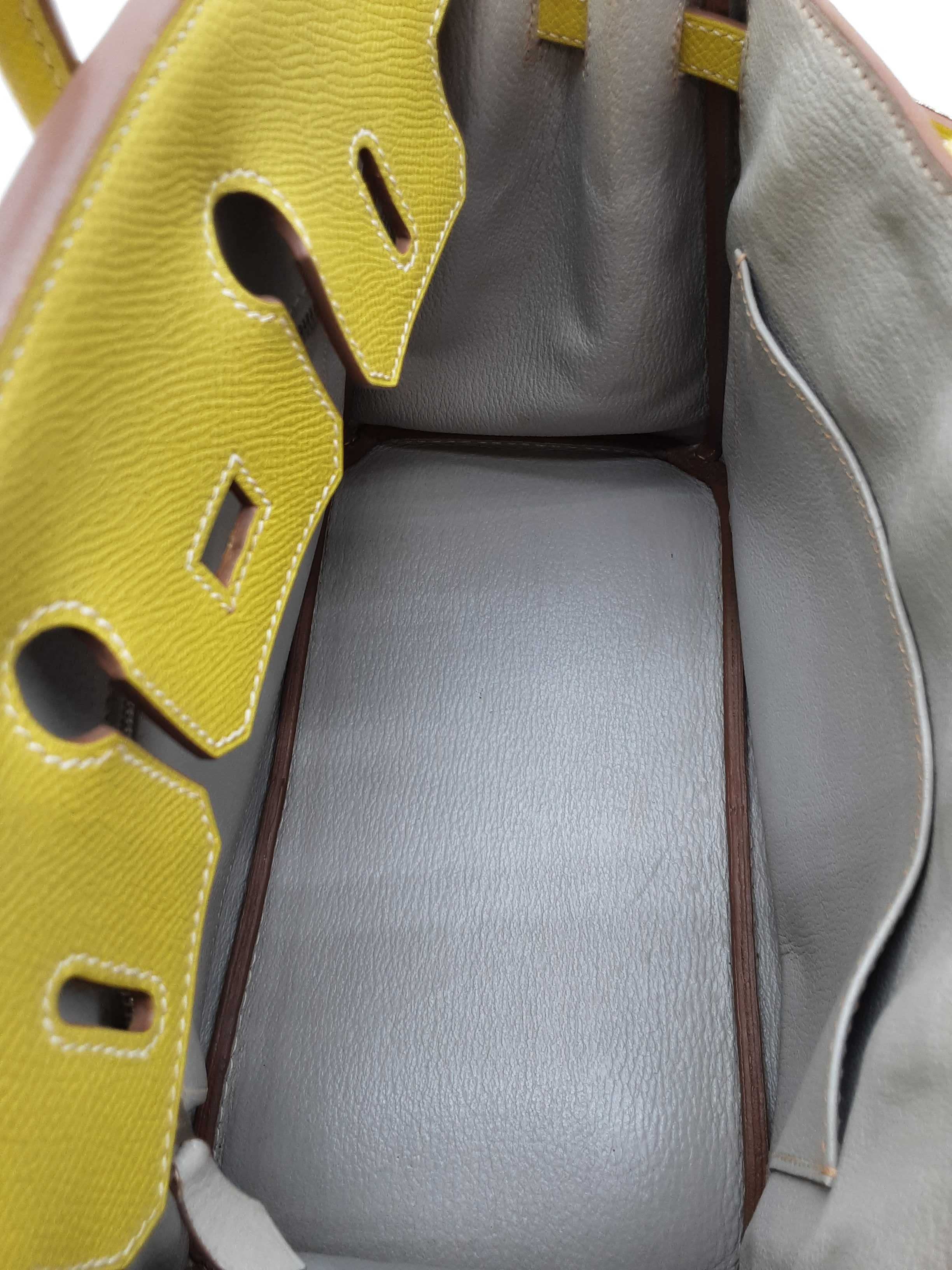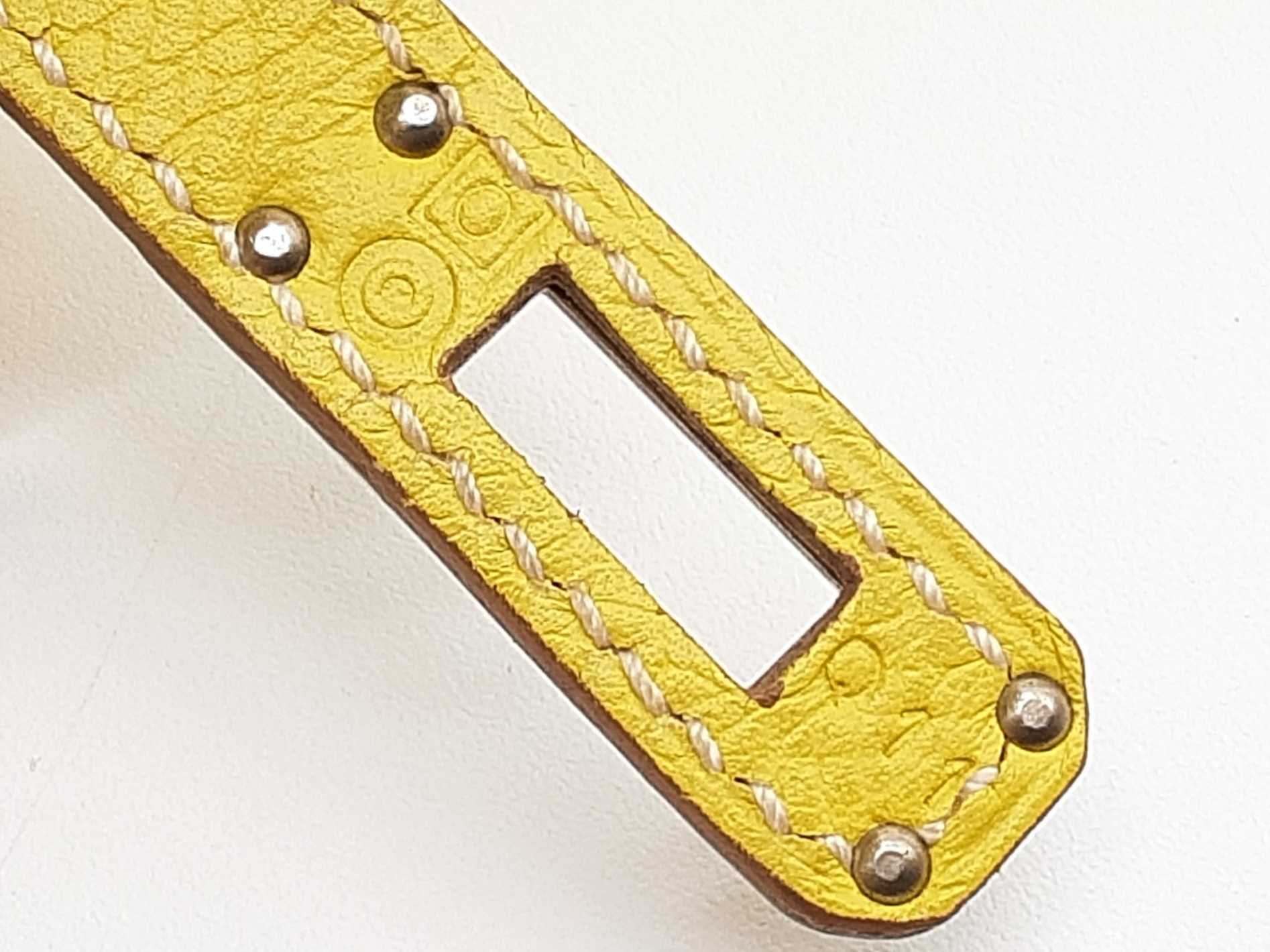144020033314Hermes Birkin 25CM Special Order Candy Lime Yellow Epsom Gris Gray Interior Palladium Hardware Handbag. Length 10 IN X Height 7.5 IN X Width 5 IN X Drop 2.5 IN. Date Code Square O (2011). Pre-owned - Good Condition with creases, flap curved, scratches on metal hardware and bottom interior, marks on interior, marks and scratches in interior pockets, and wear on corners and flap notches.