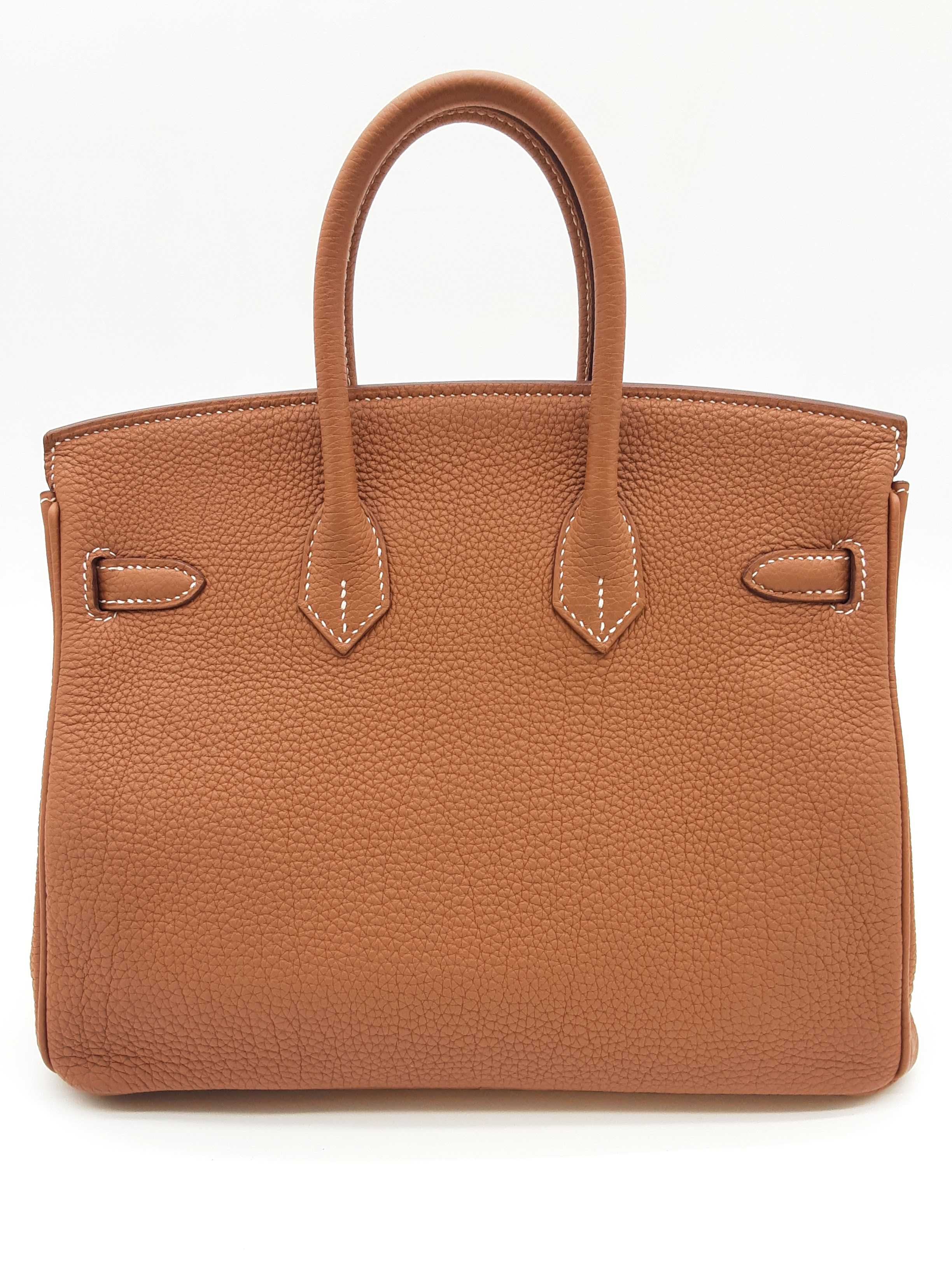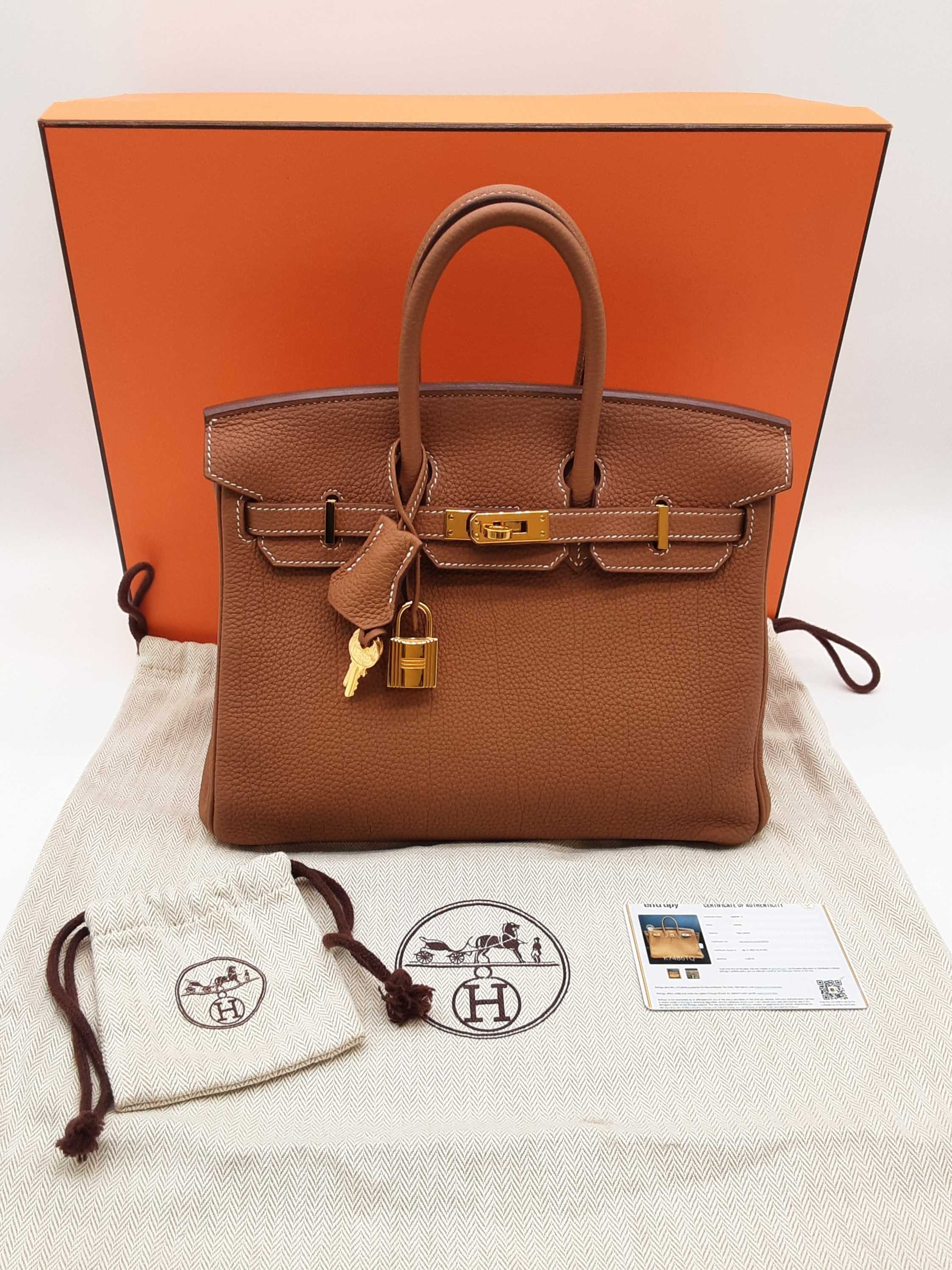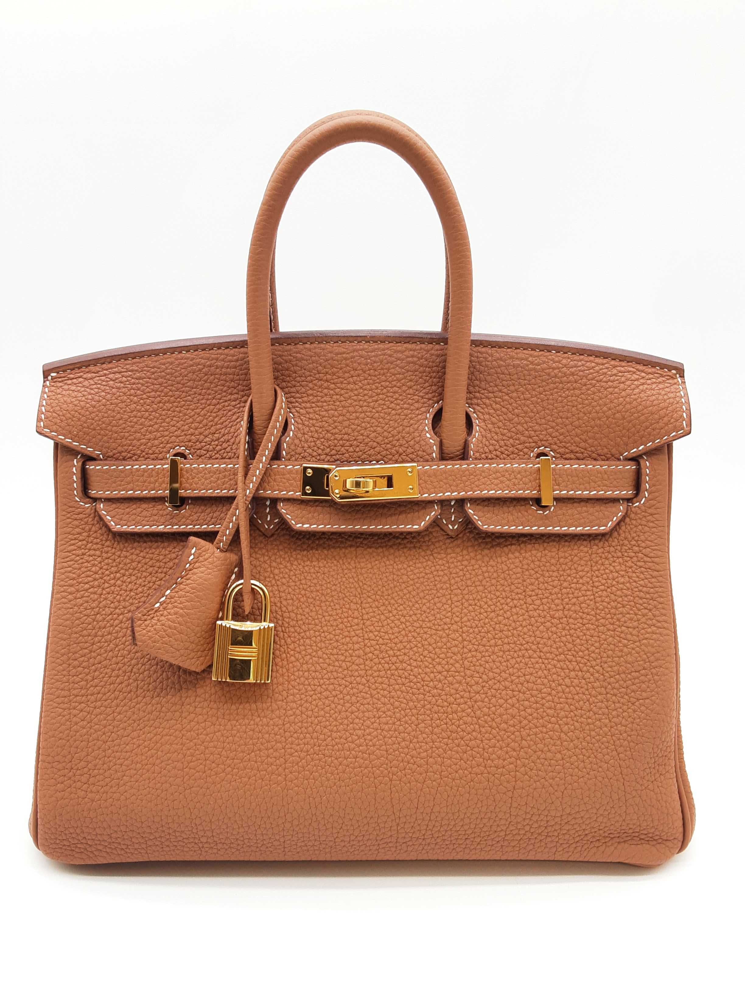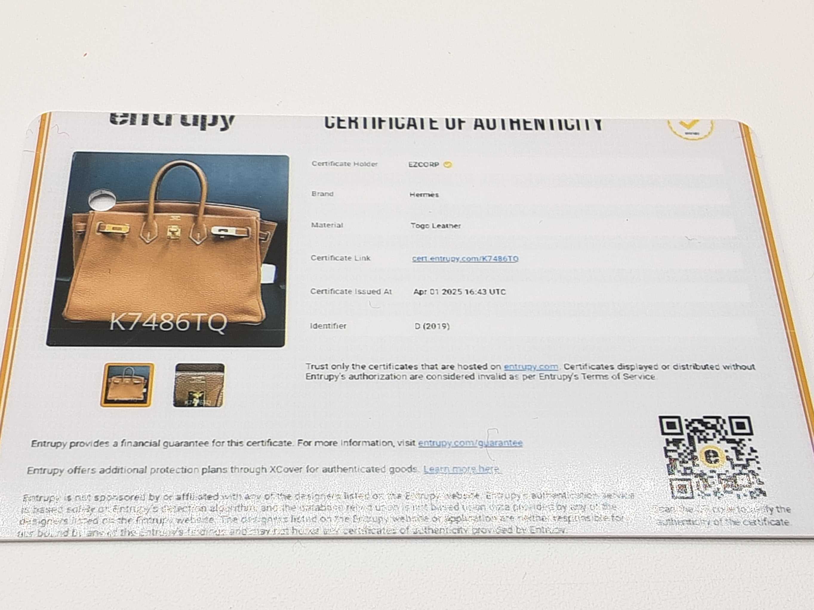 144020031381Hermes Birkin 25CM Gold Brown Fjord Leather Gold Hardware Handbag. Length 10 IN X Height 7 IN X Width 5 IN X Drop 2.5 IN. Date Code D (2019). Entrupy Certificate #K7486TQ. Great Pre-owned Condition with creases, scratches on metal hardware, flap curved, wear on corners and edges, and indentations and scratches on interior and in interior pockets.