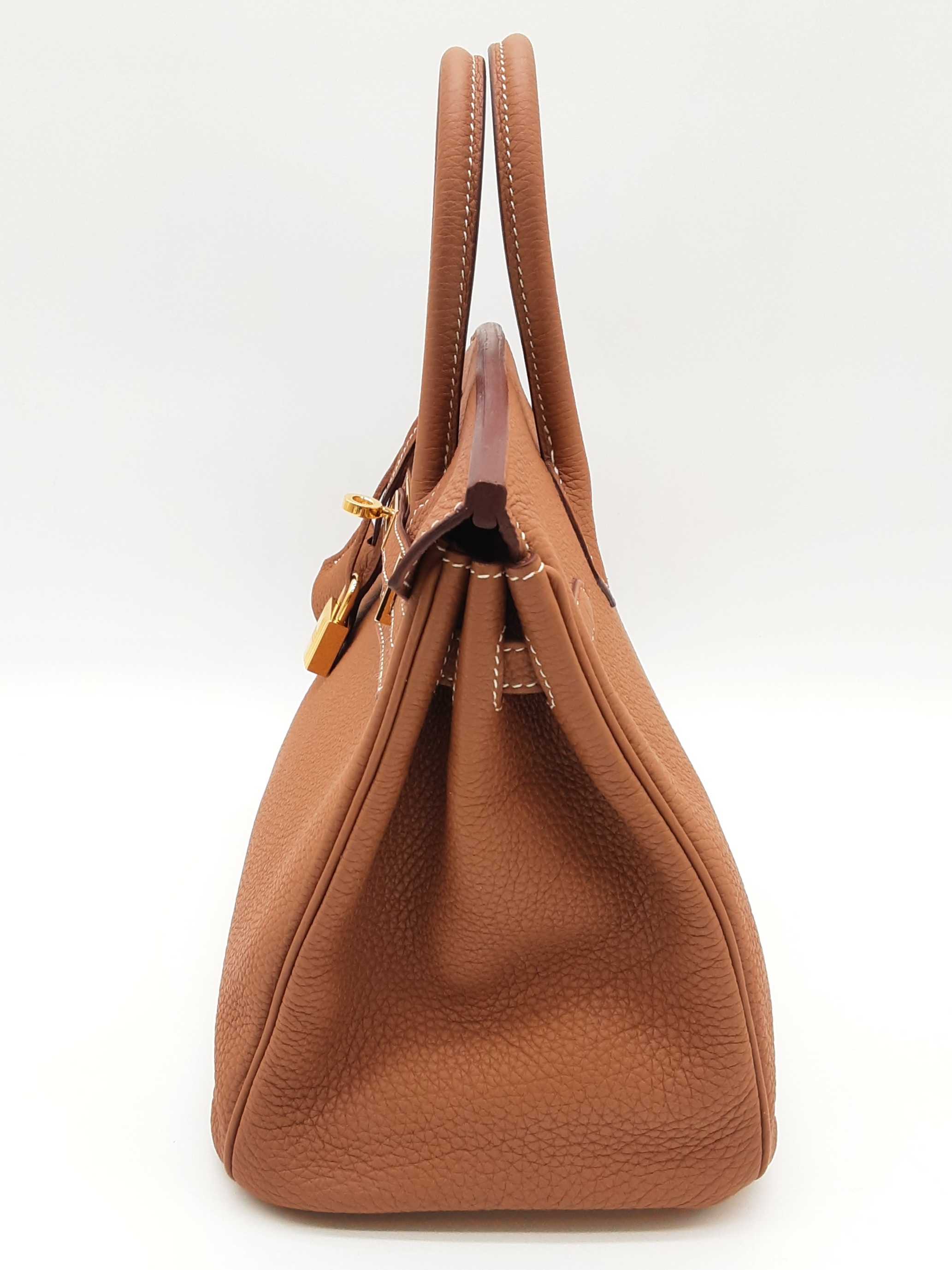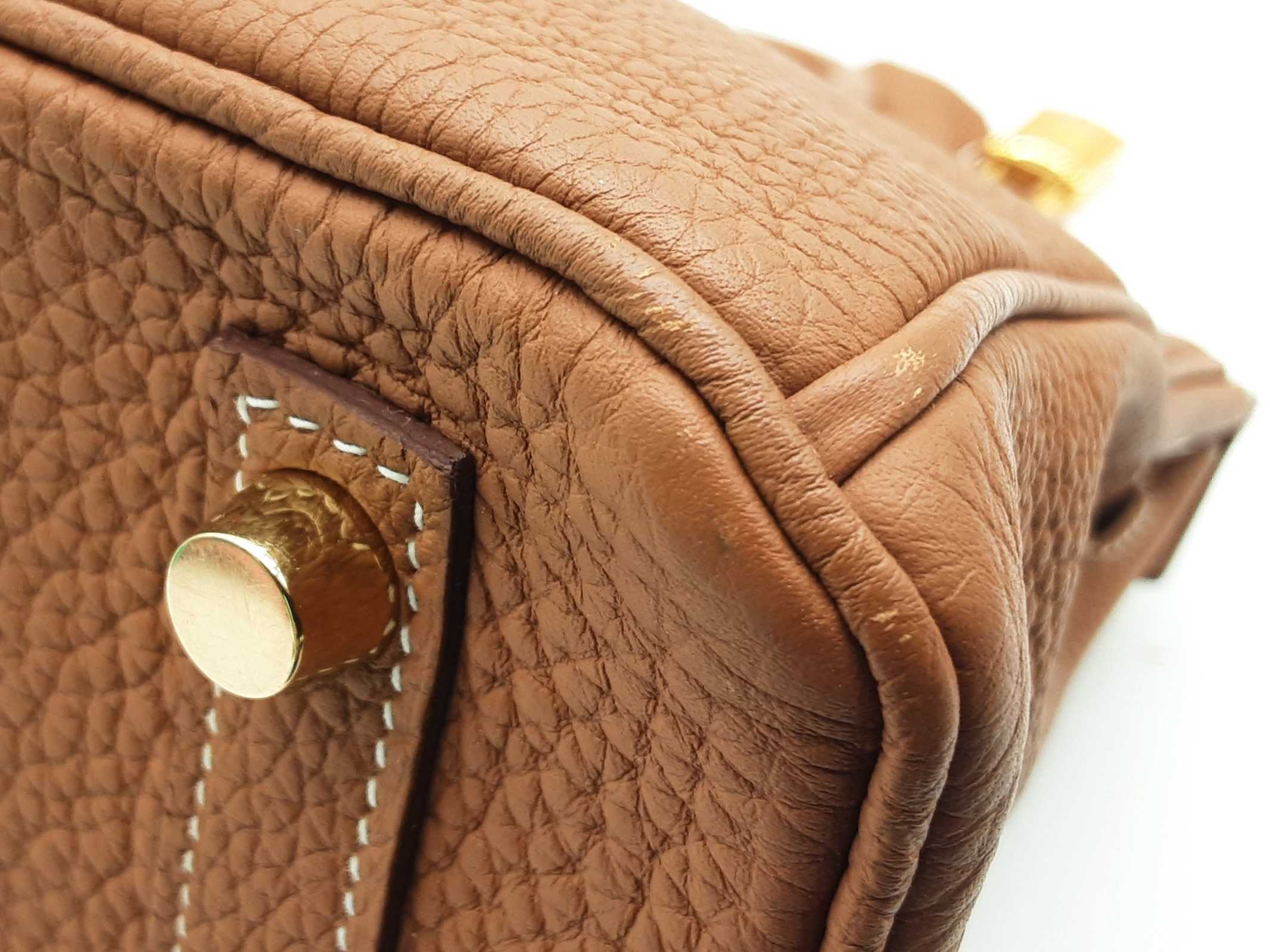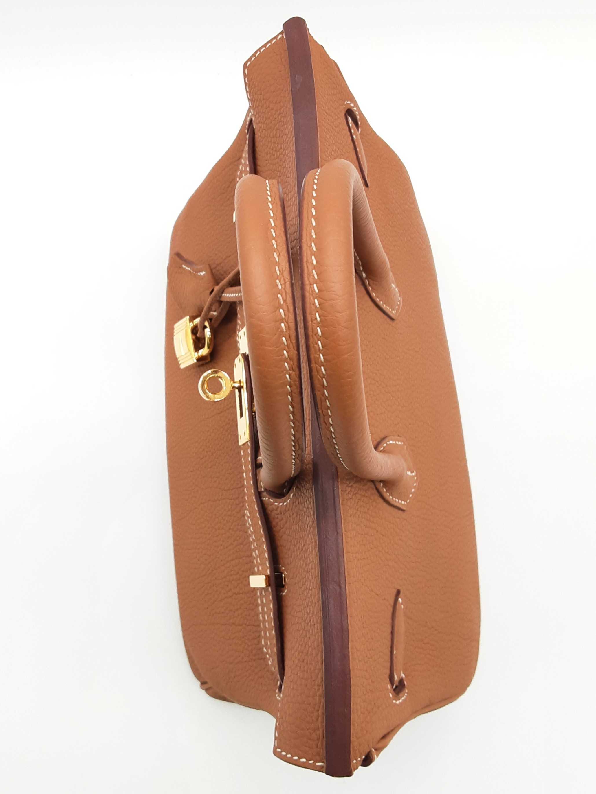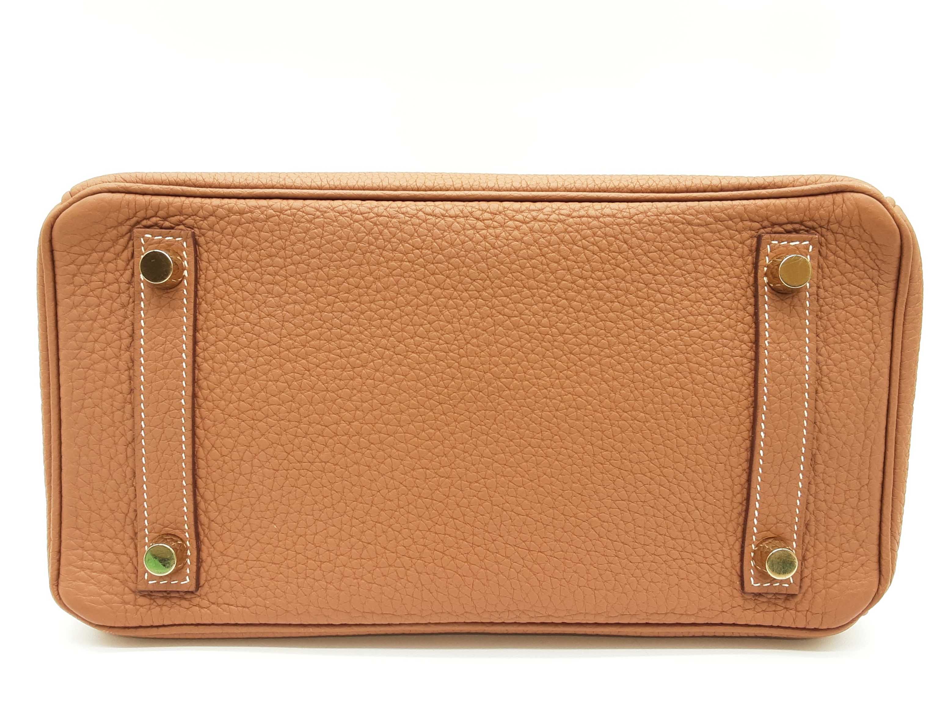 144020031381Hermes Birkin 25CM Gold Brown Fjord Leather Gold Hardware Handbag. Length 10 IN X Height 7 IN X Width 5 IN X Drop 2.5 IN. Date Code D (2019). Entrupy Certificate #K7486TQ. Great Pre-owned Condition with creases, scratches on metal hardware, flap curved, wear on corners and edges, and indentations and scratches on interior and in interior pockets.