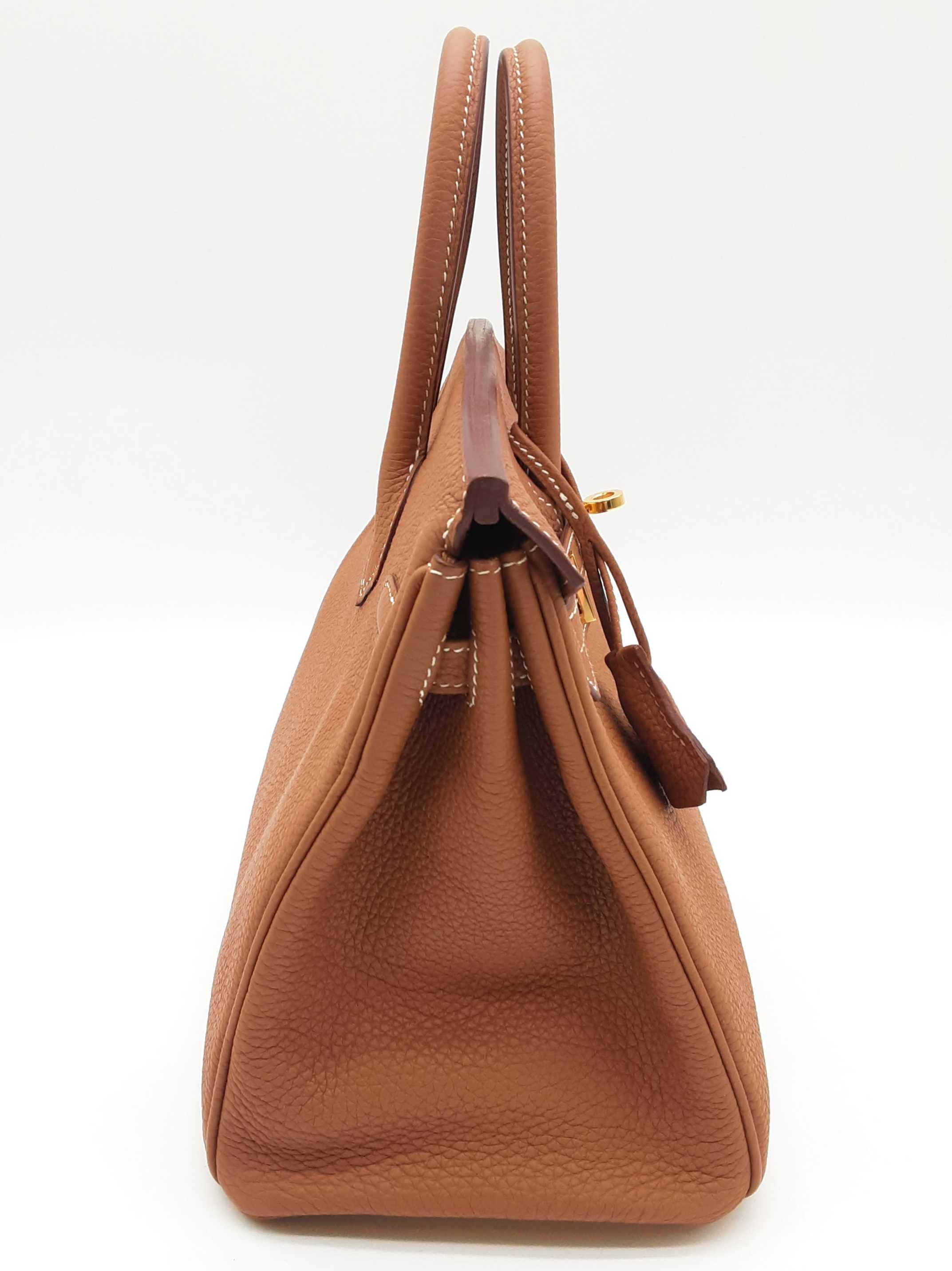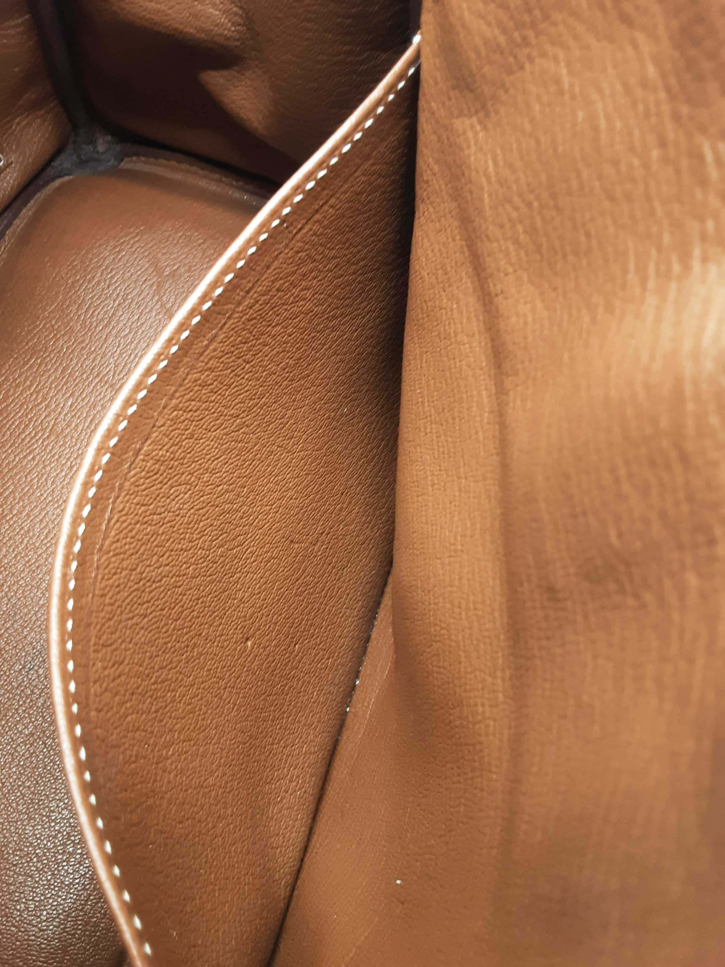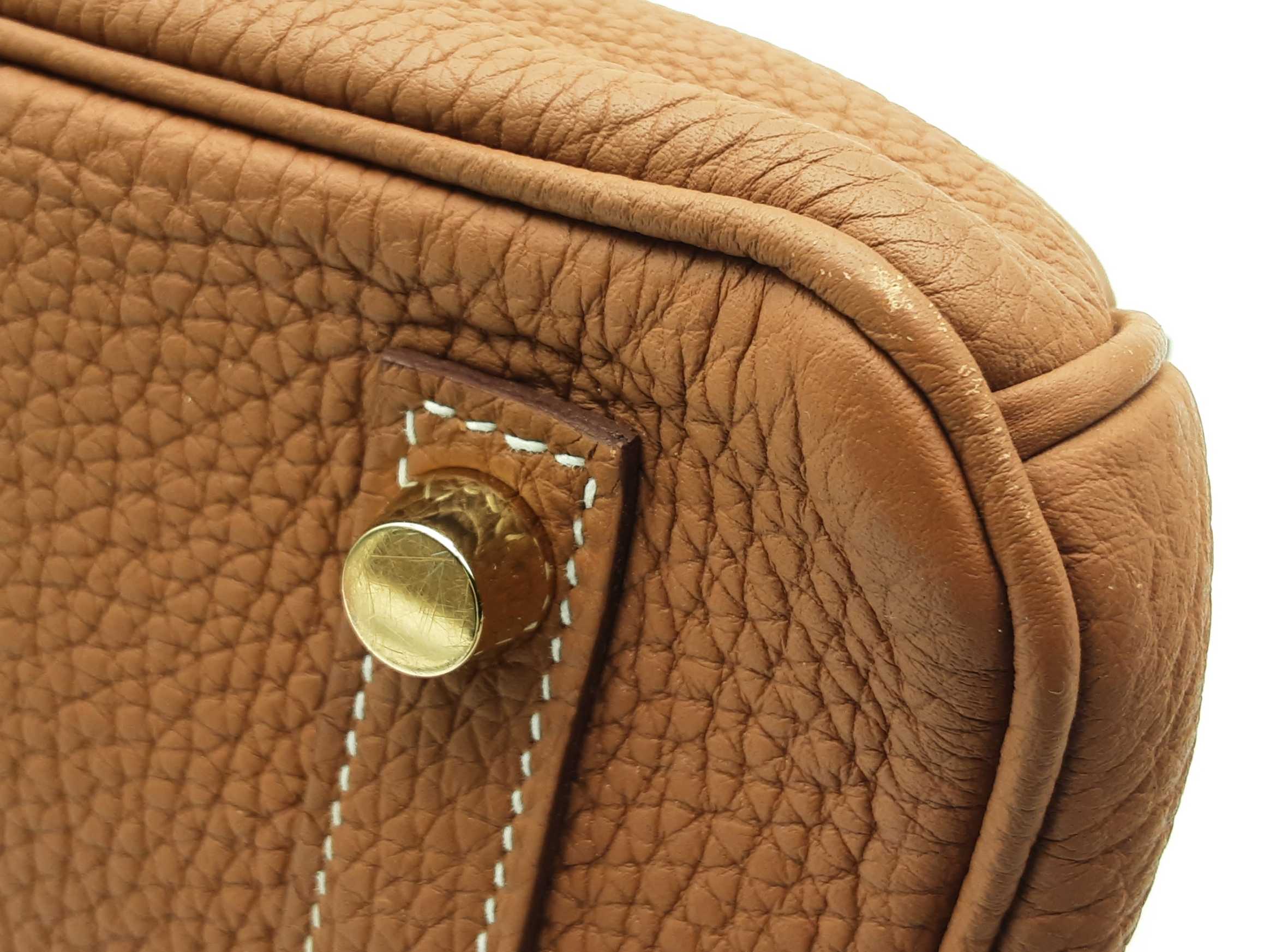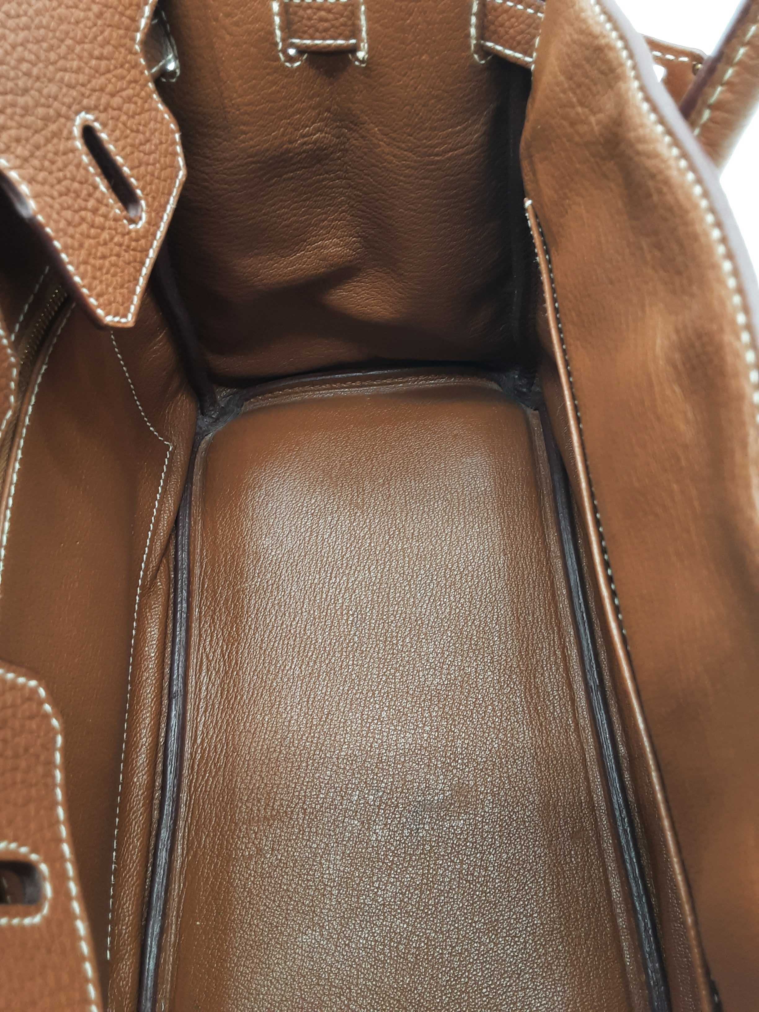 144020031381Hermes Birkin 25CM Gold Brown Fjord Leather Gold Hardware Handbag. Length 10 IN X Height 7 IN X Width 5 IN X Drop 2.5 IN. Date Code D (2019). Entrupy Certificate #K7486TQ. Great Pre-owned Condition with creases, scratches on metal hardware, flap curved, wear on corners and edges, and indentations and scratches on interior and in interior pockets.