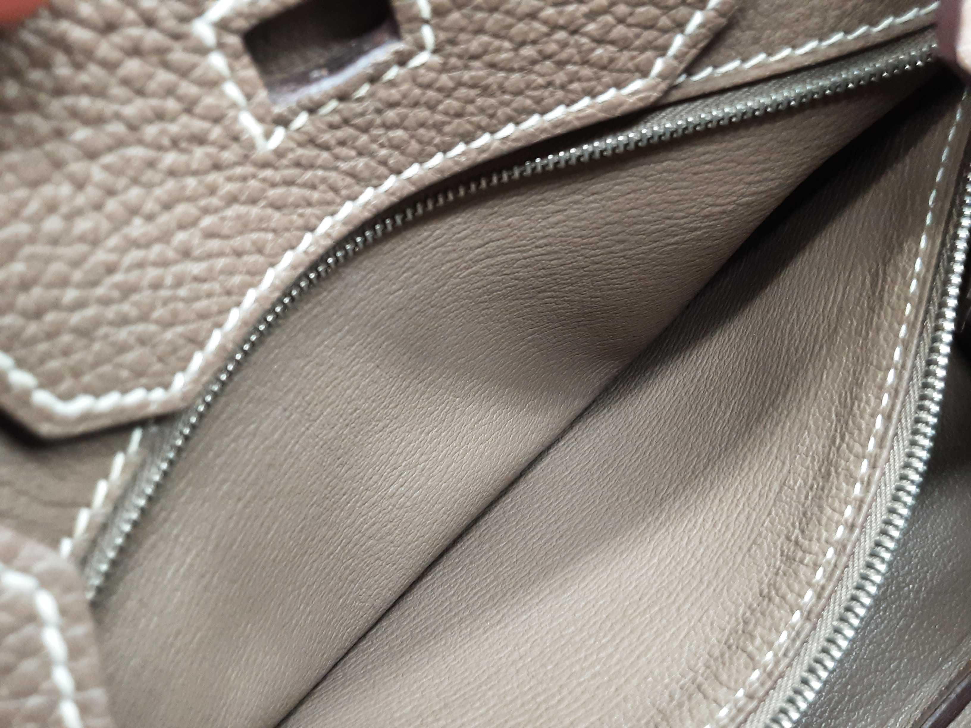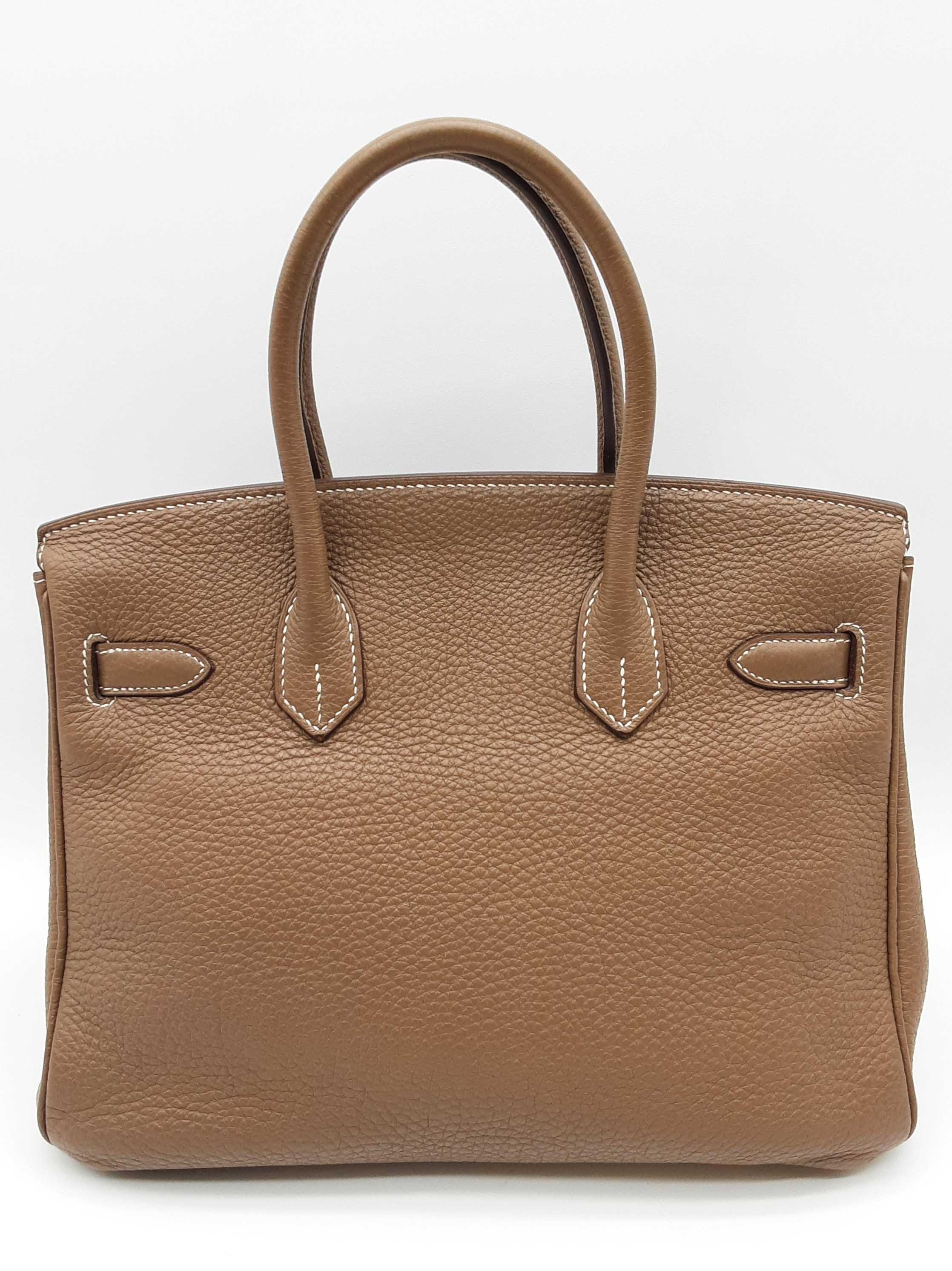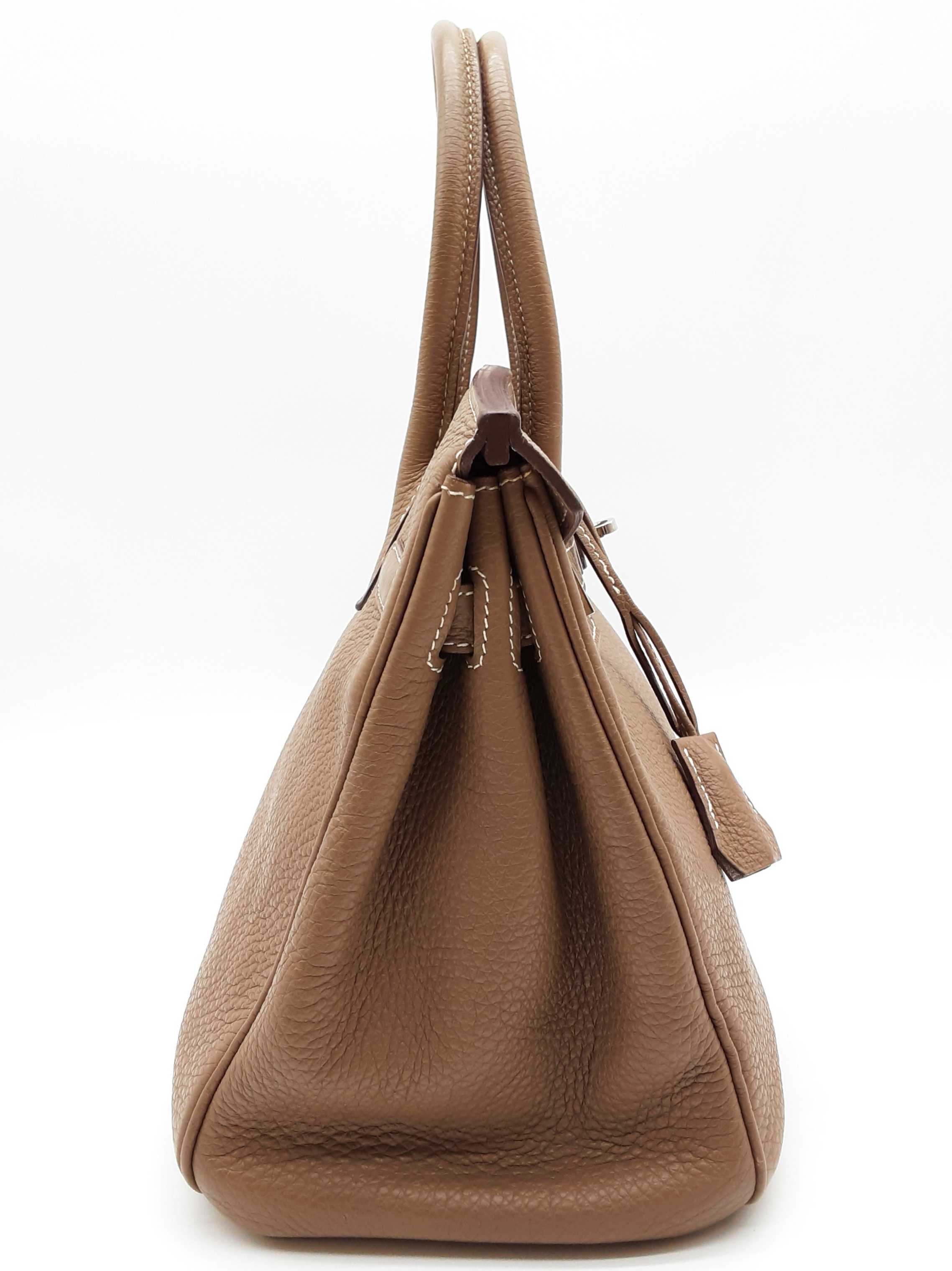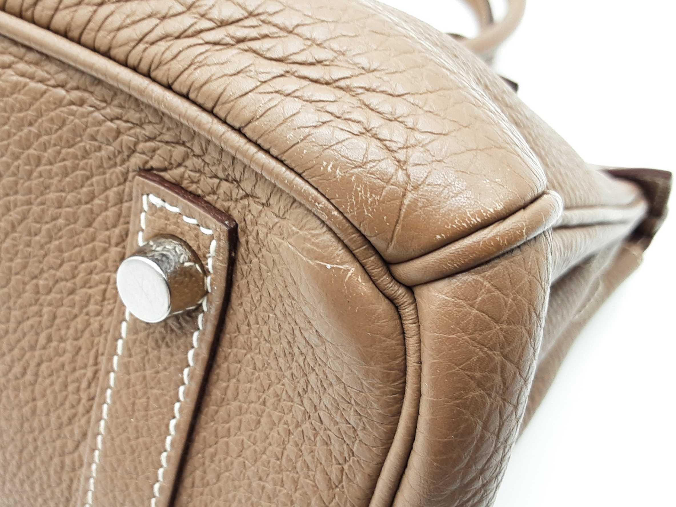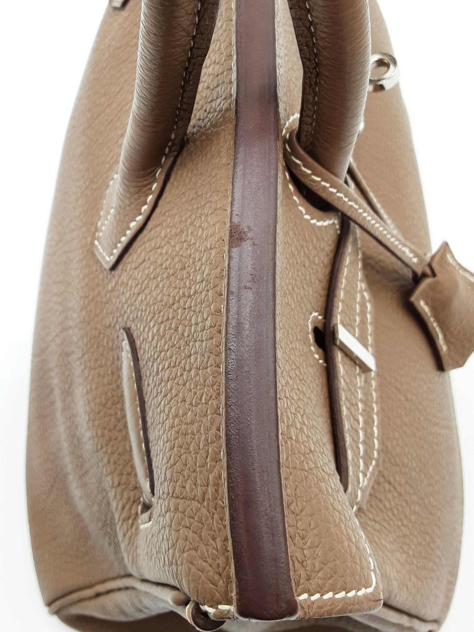 144020036352Hermes Birkin 30CM Etoupe Gray Togo Palladium Hardware Handbag. Length 12 IN X Height 8 IN X Width 6.5 IN X Drop 4 IN. Date Code Square O (2011). Great Pre-owned Condition with creases, scratches and wear on metal hardware, flap curved, indentations on interior bottom, and wear on corners, edges, and handles.