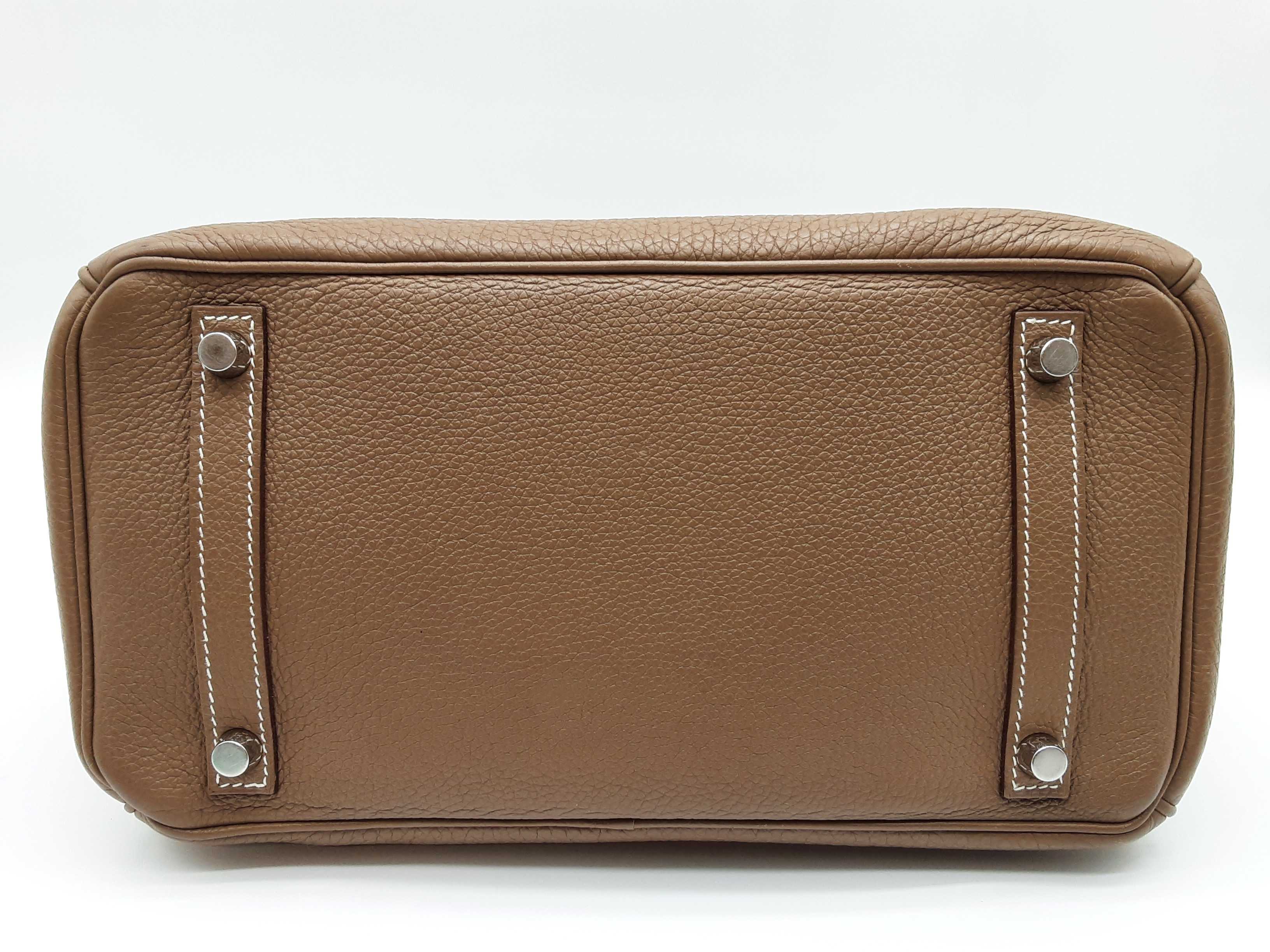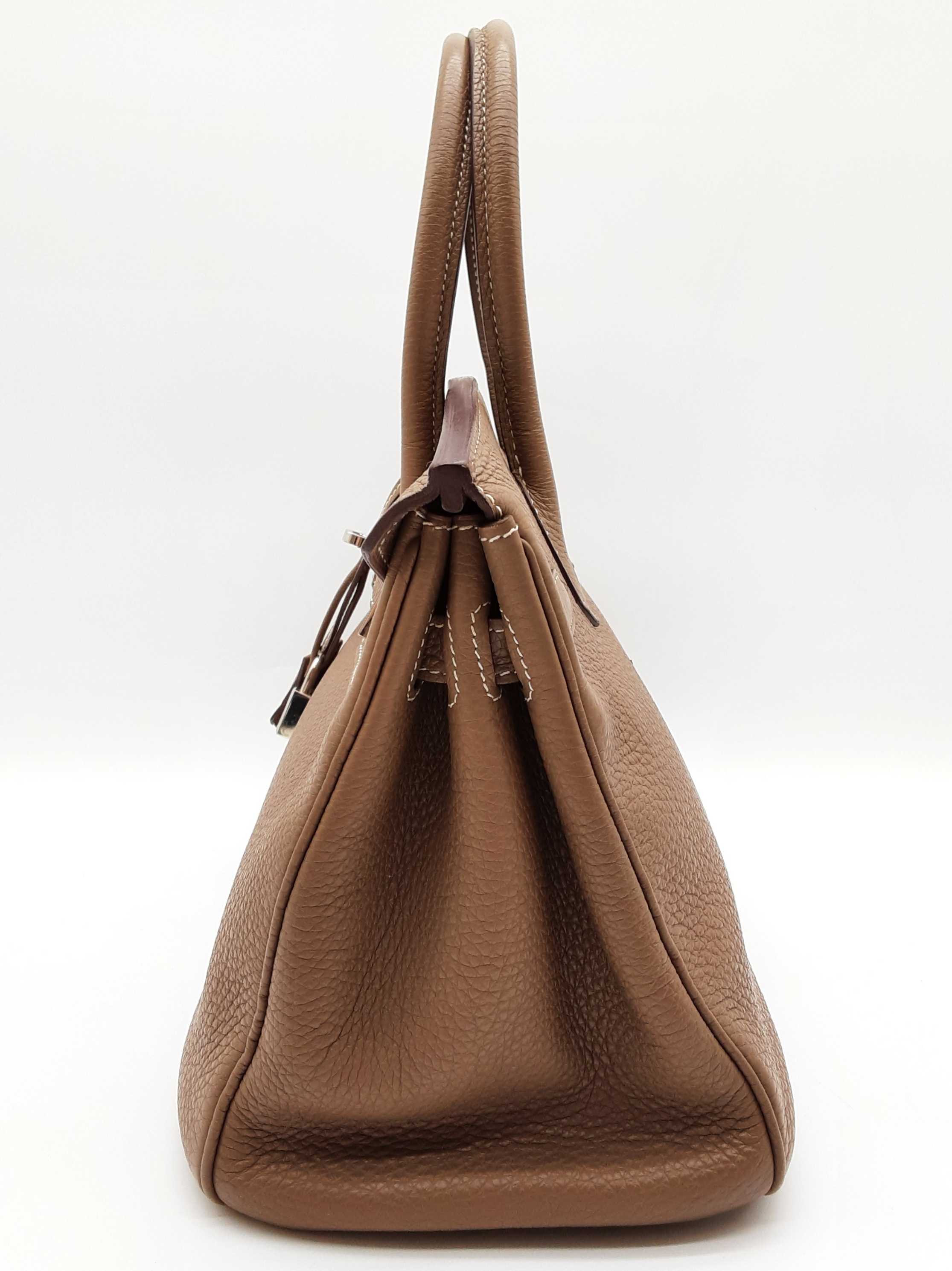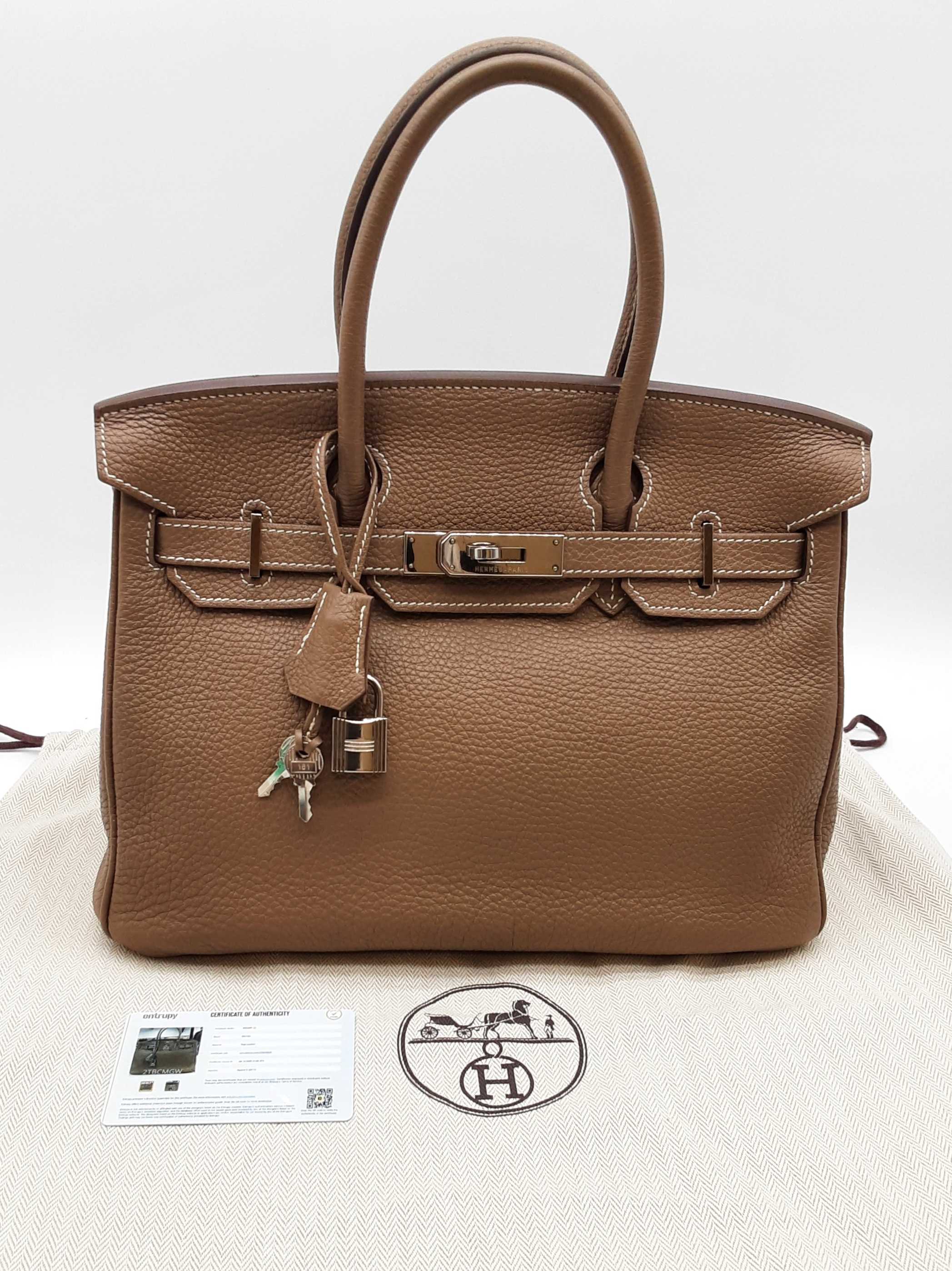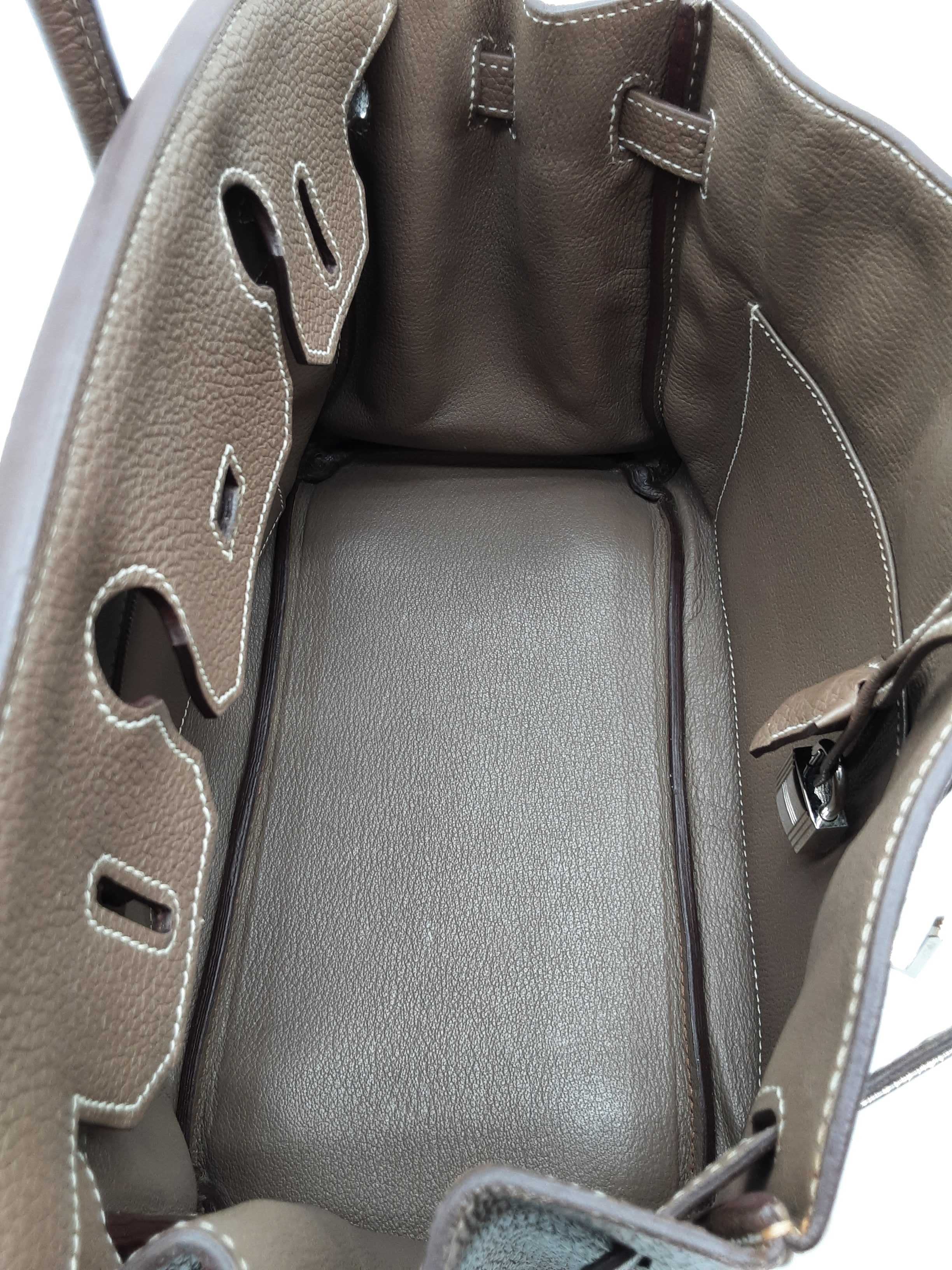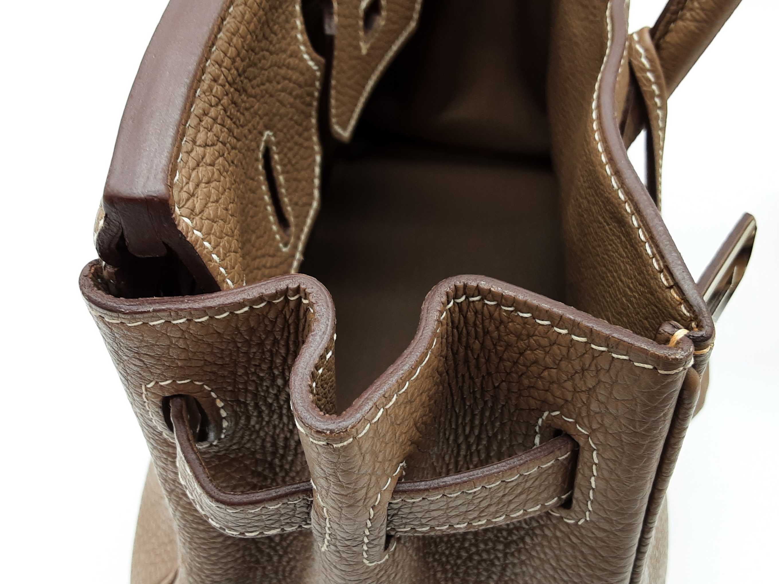 144020036352Hermes Birkin 30CM Etoupe Gray Togo Palladium Hardware Handbag. Length 12 IN X Height 8 IN X Width 6.5 IN X Drop 4 IN. Date Code Square O (2011). Great Pre-owned Condition with creases, scratches and wear on metal hardware, flap curved, indentations on interior bottom, and wear on corners, edges, and handles.