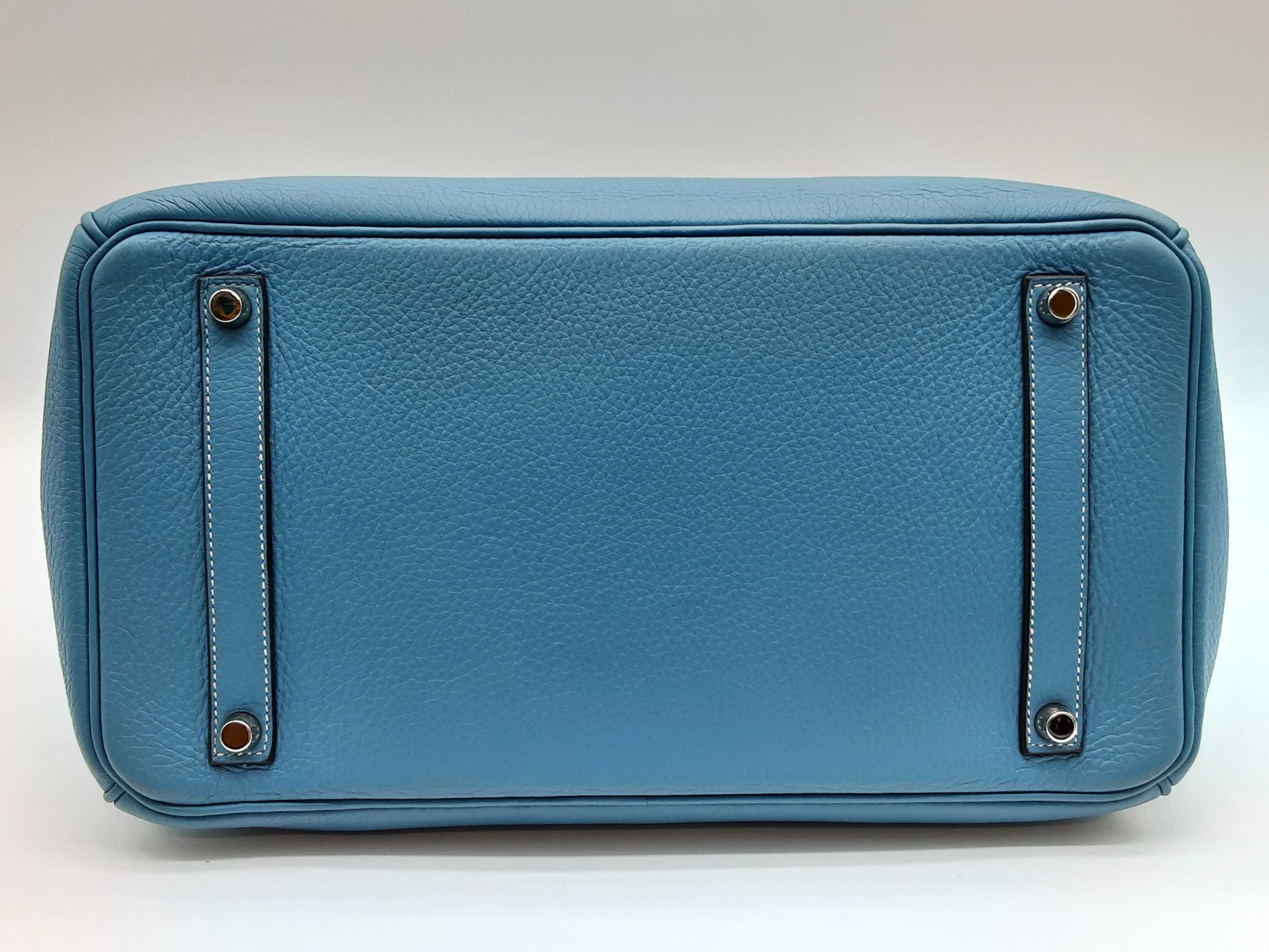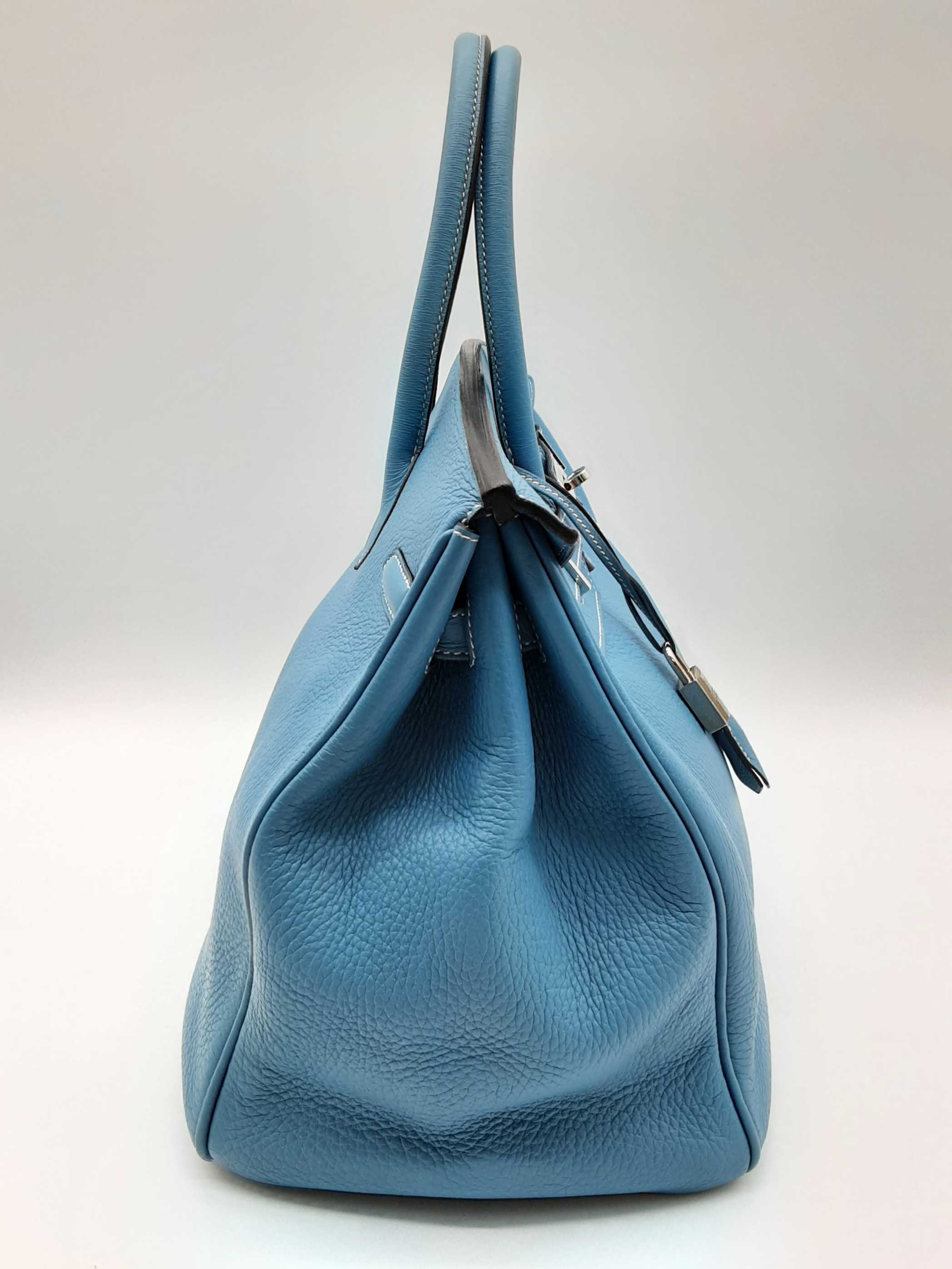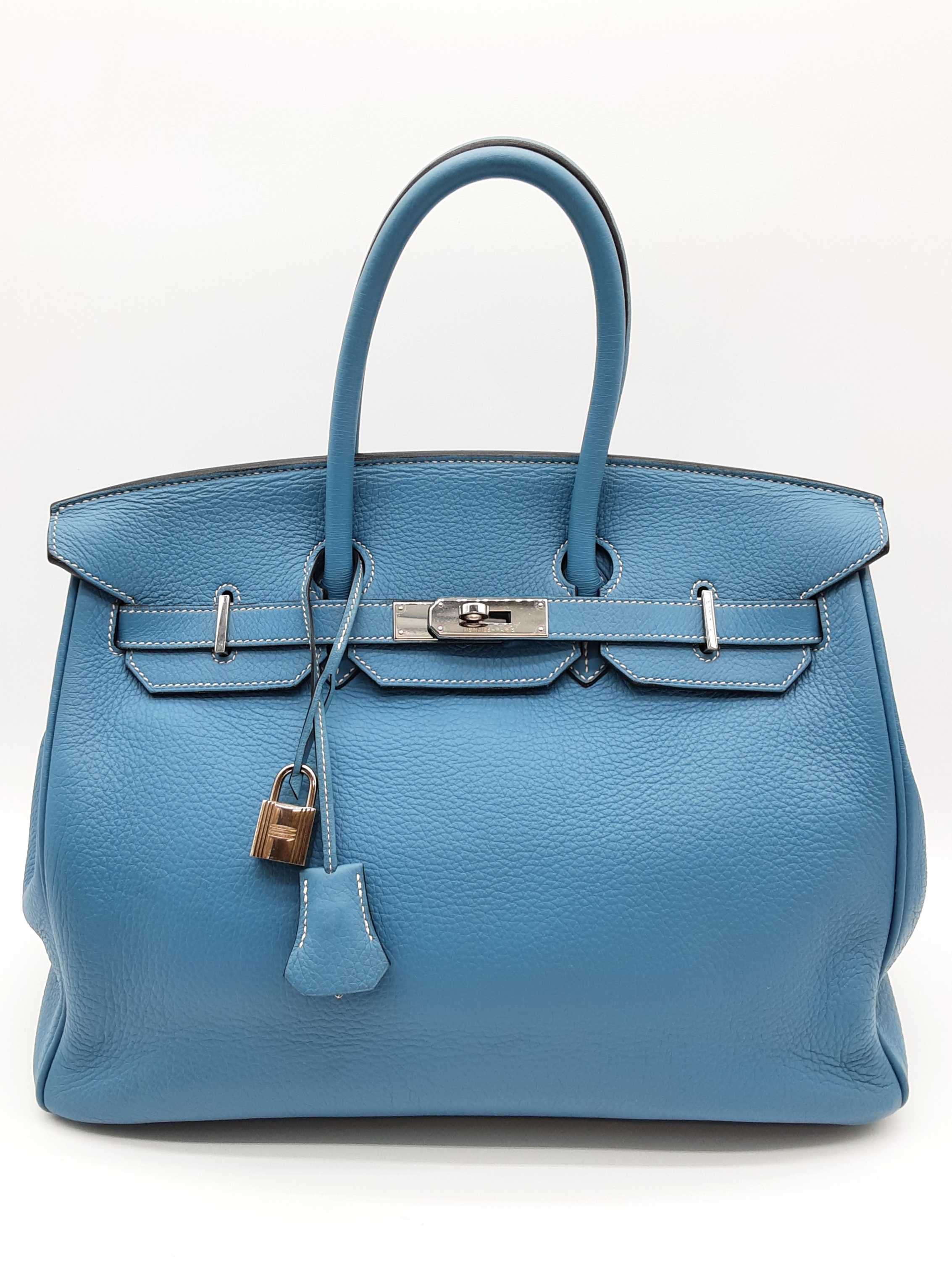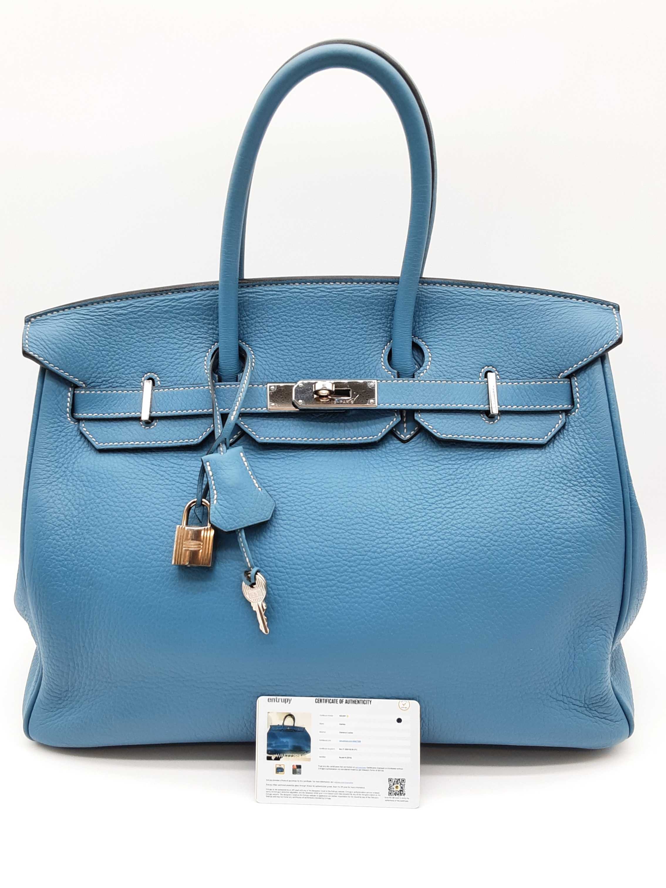 144020026028Hermes Birkin 35CM Bleu Jean Blue Clemence Palladium Hardware Handbag. Length 13.5 IN X Height 9 IN X Width 7.5 IN X Drop 4.5 IN. Date Code Square N (2010). Entrupy Certificate #WM772R8. Great Pre-owned Condition with creases, scratches and wear on metal hardware, small wear and discoloration on corners, indentations on interior bottom, flap curved, and wear on flap and top edges.