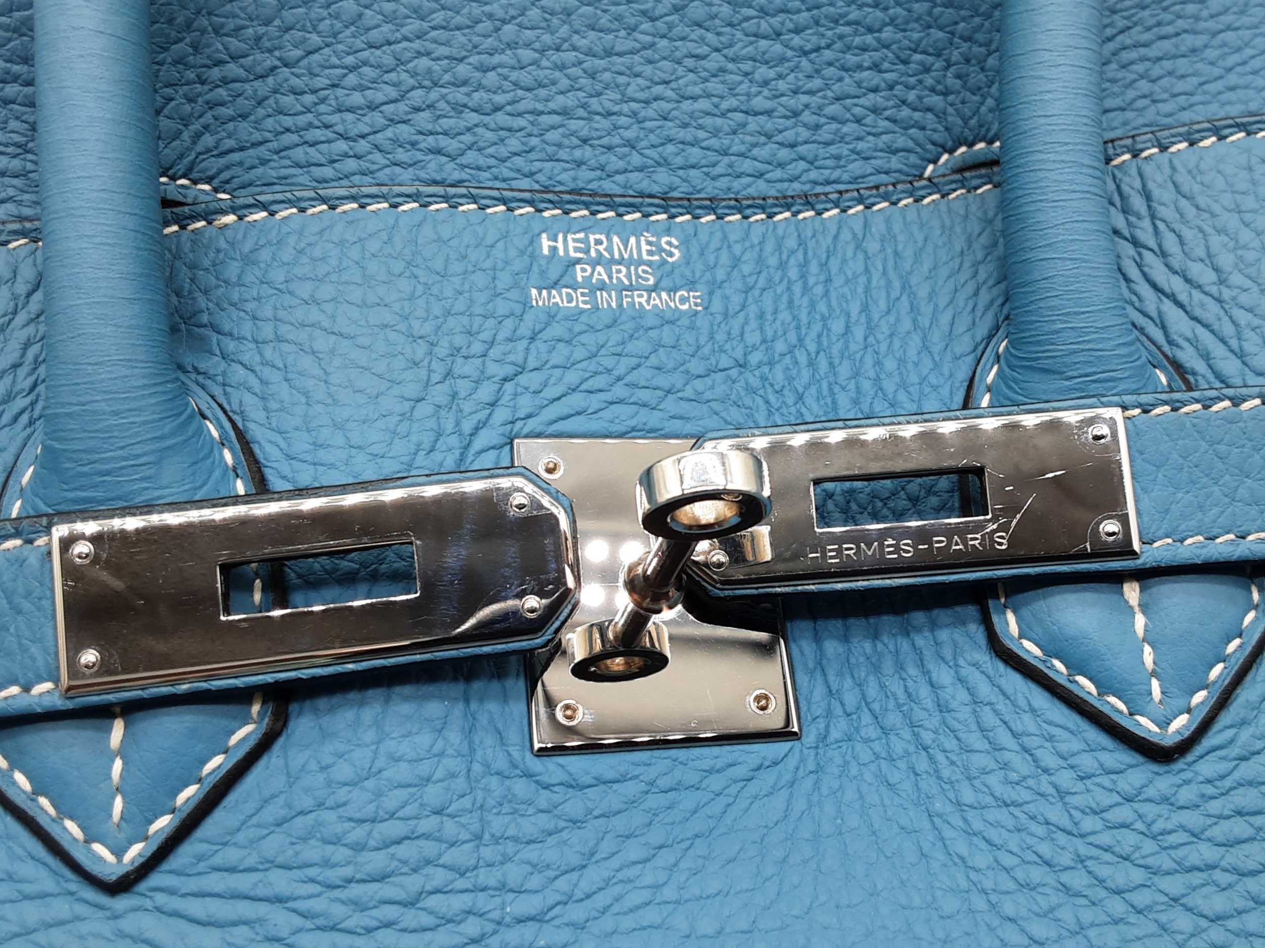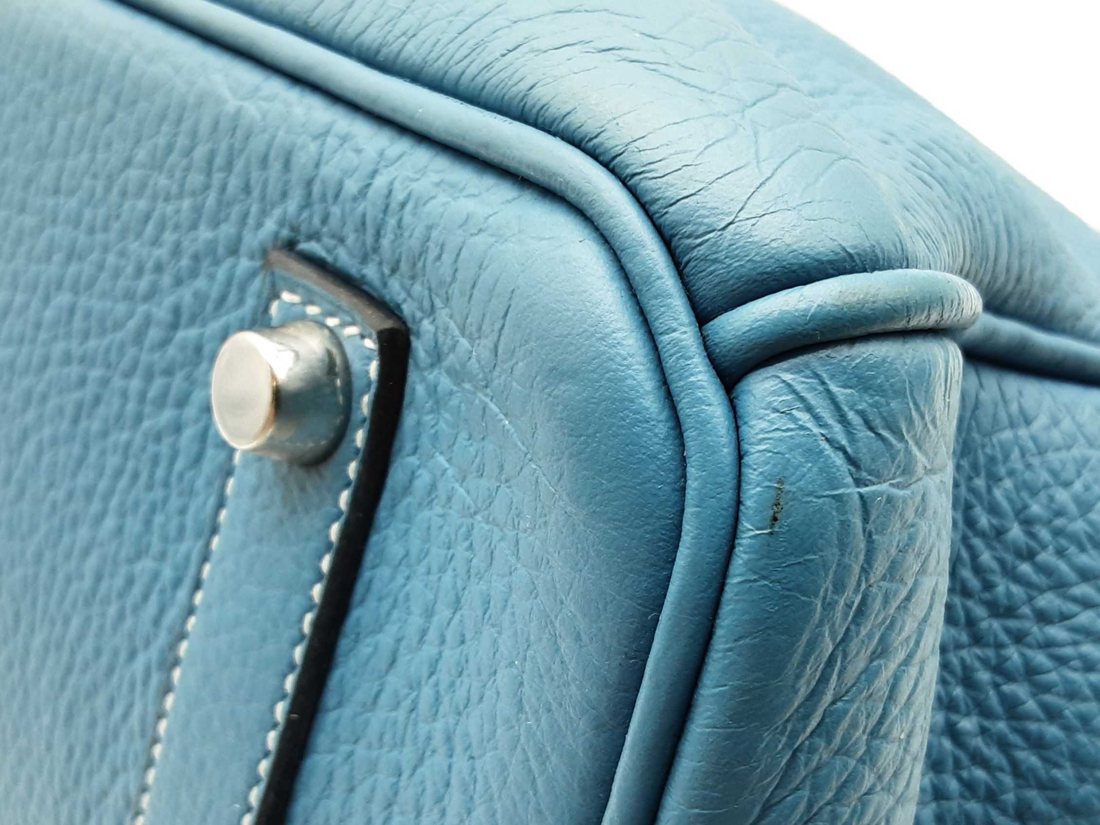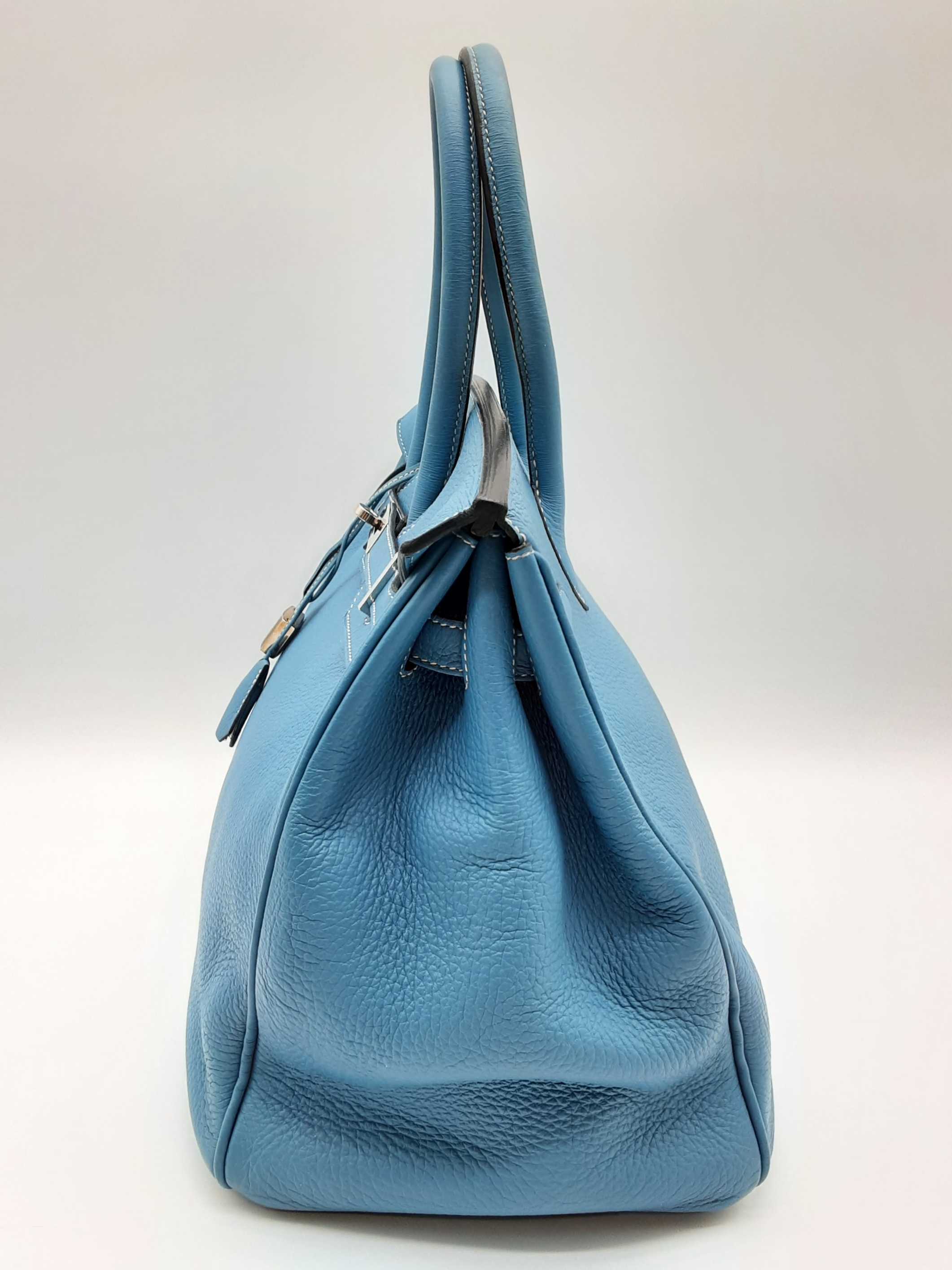 144020026028Hermes Birkin 35CM Bleu Jean Blue Clemence Palladium Hardware Handbag. Length 13.5 IN X Height 9 IN X Width 7.5 IN X Drop 4.5 IN. Date Code Square N (2010). Entrupy Certificate #WM772R8. Great Pre-owned Condition with creases, scratches and wear on metal hardware, small wear and discoloration on corners, indentations on interior bottom, flap curved, and wear on flap and top edges.