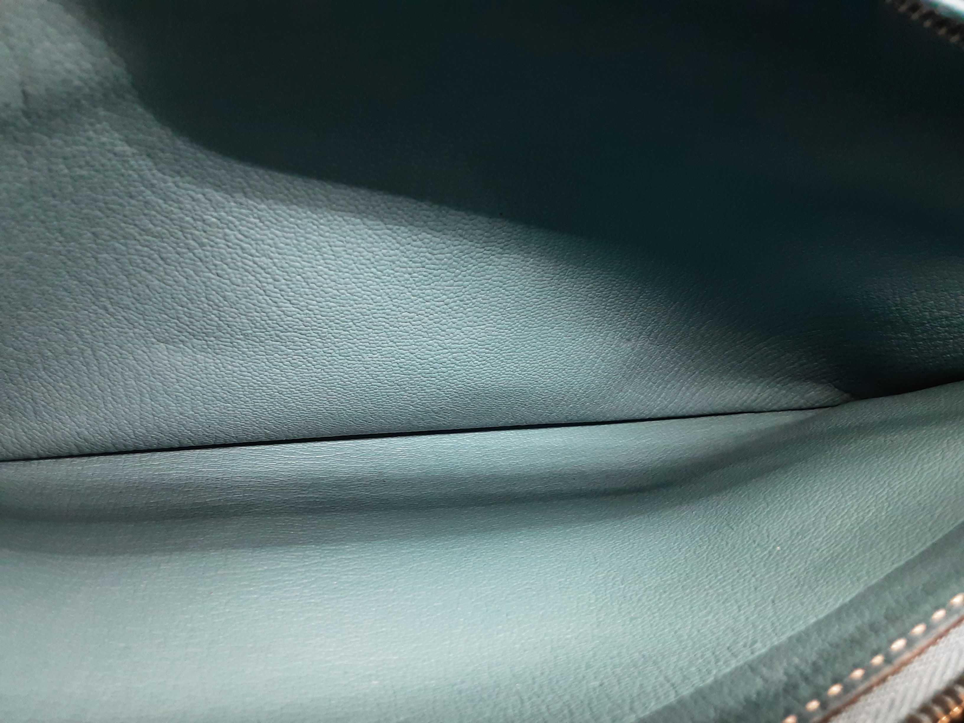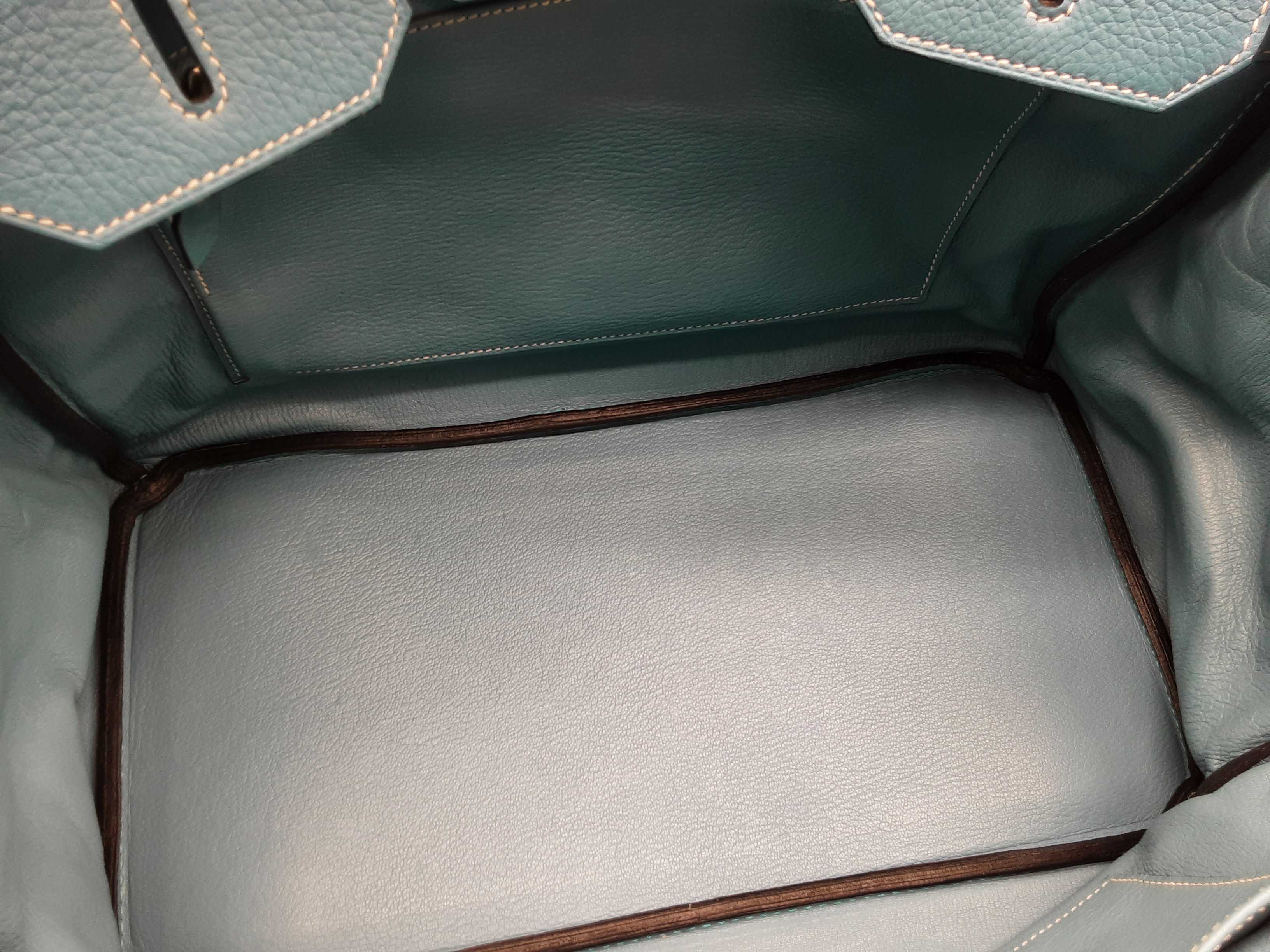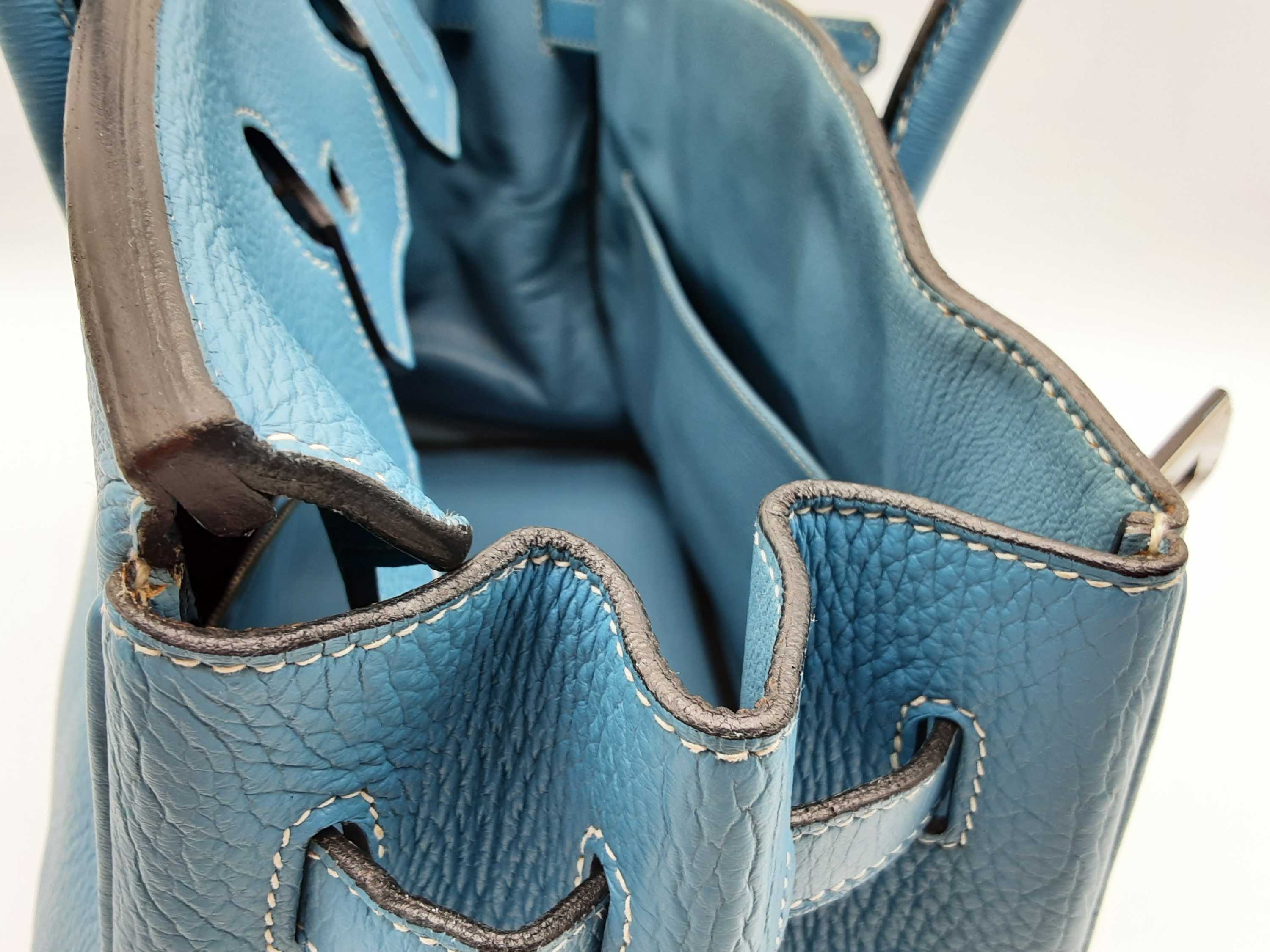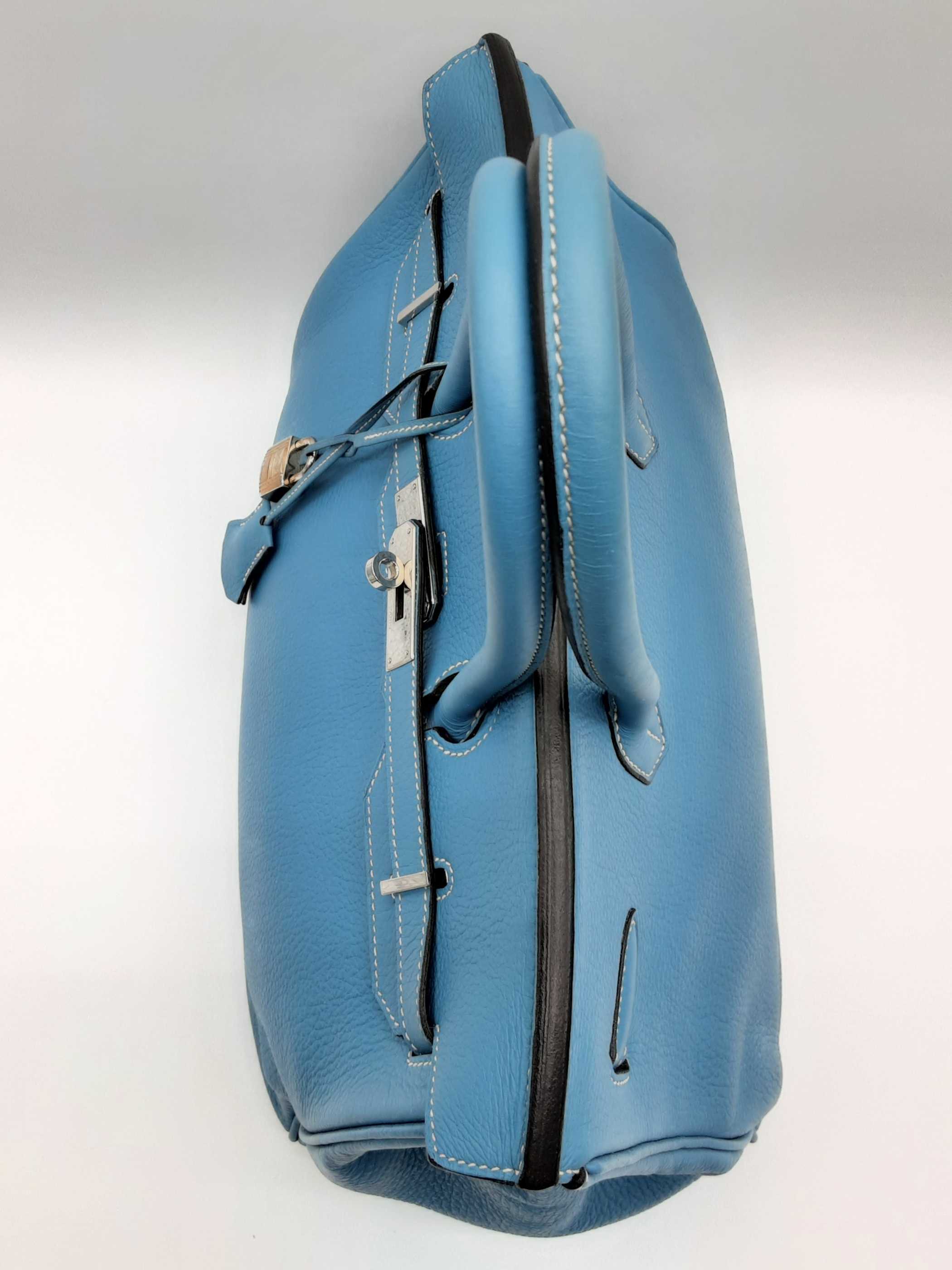 144020026028Hermes Birkin 35CM Bleu Jean Blue Clemence Palladium Hardware Handbag. Length 13.5 IN X Height 9 IN X Width 7.5 IN X Drop 4.5 IN. Date Code Square N (2010). Entrupy Certificate #WM772R8. Great Pre-owned Condition with creases, scratches and wear on metal hardware, small wear and discoloration on corners, indentations on interior bottom, flap curved, and wear on flap and top edges.