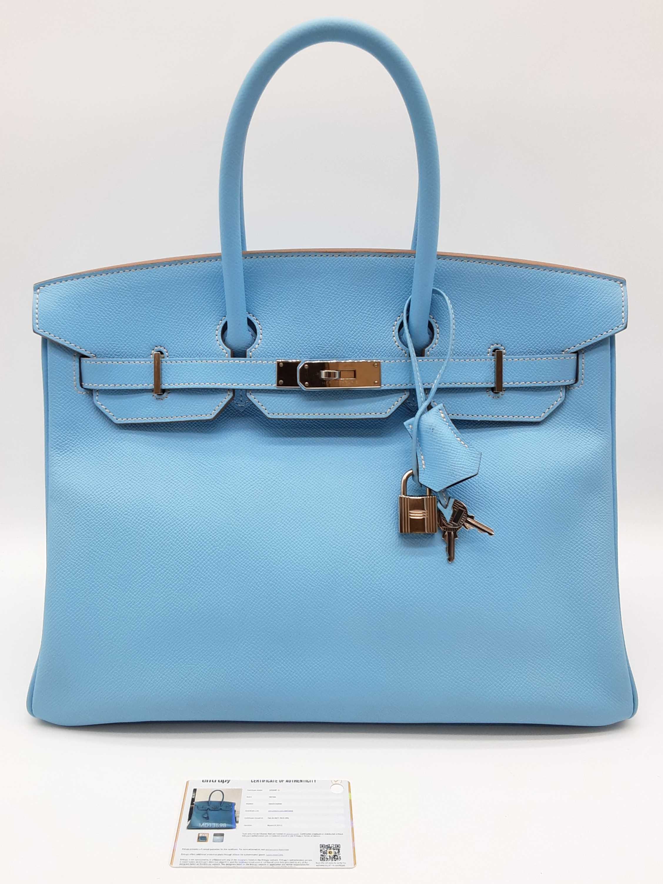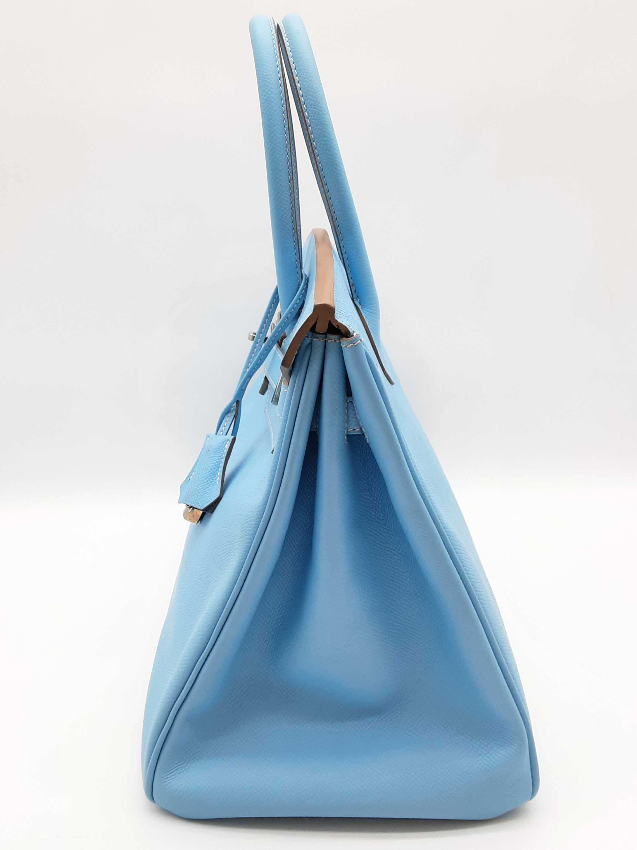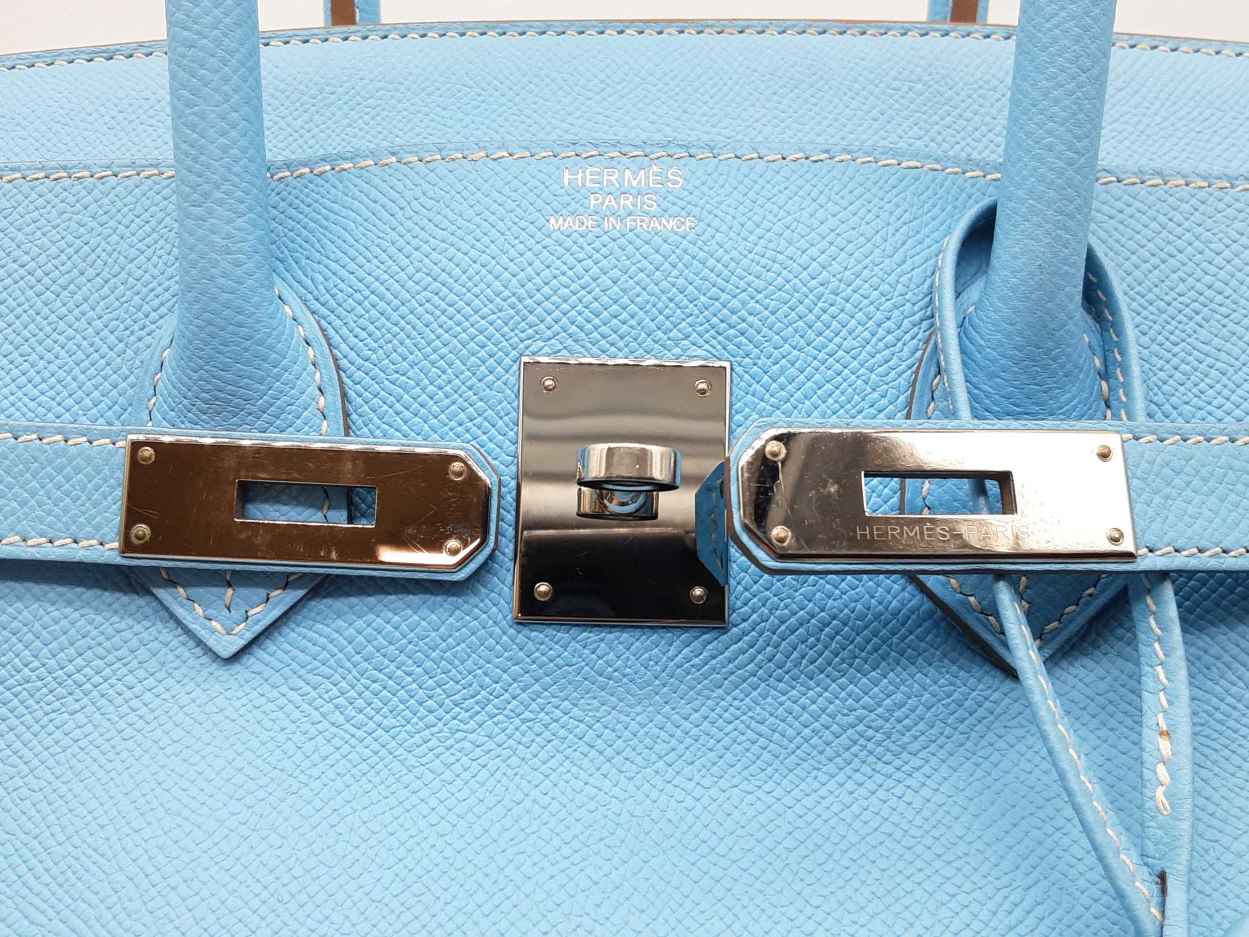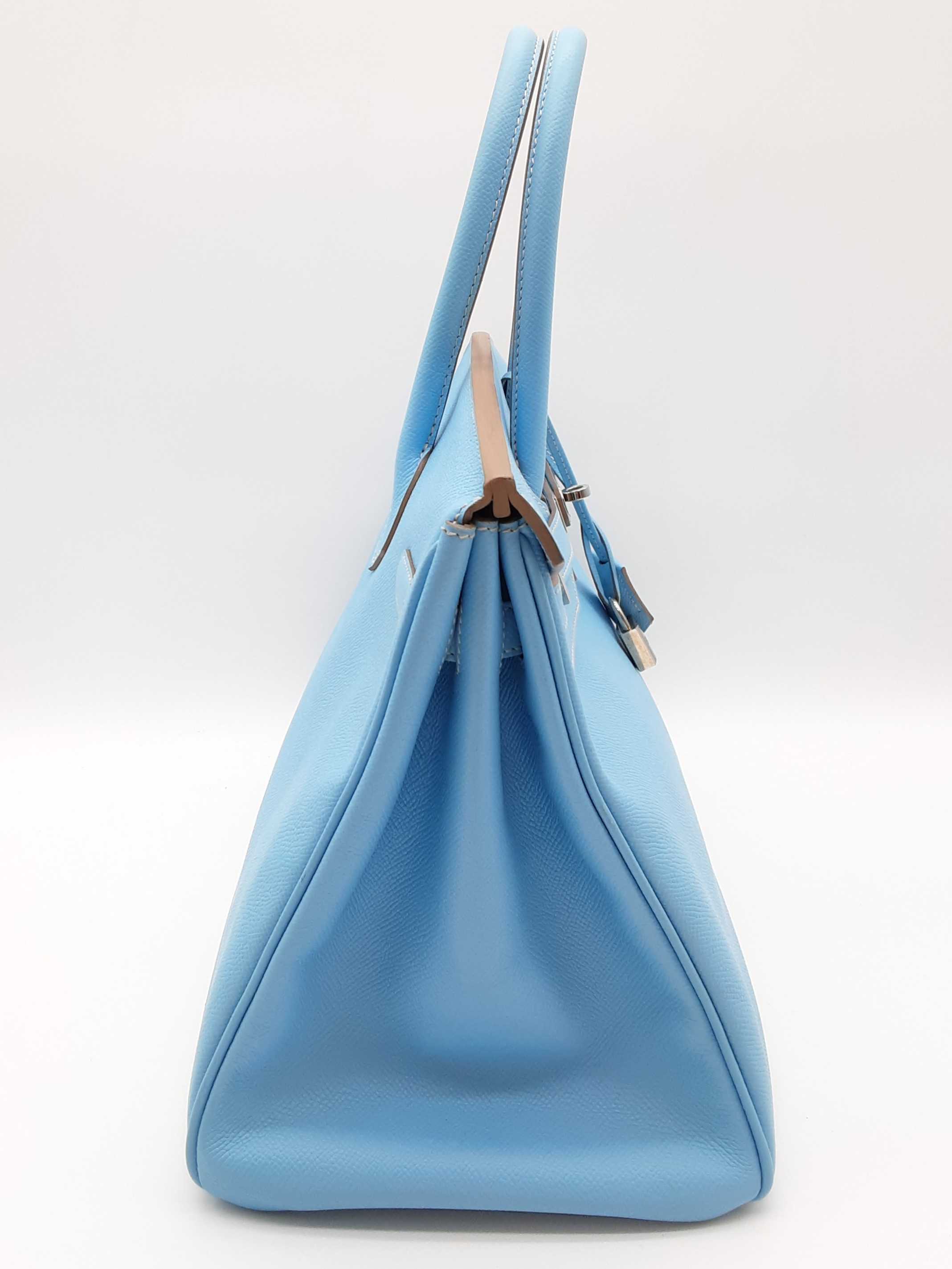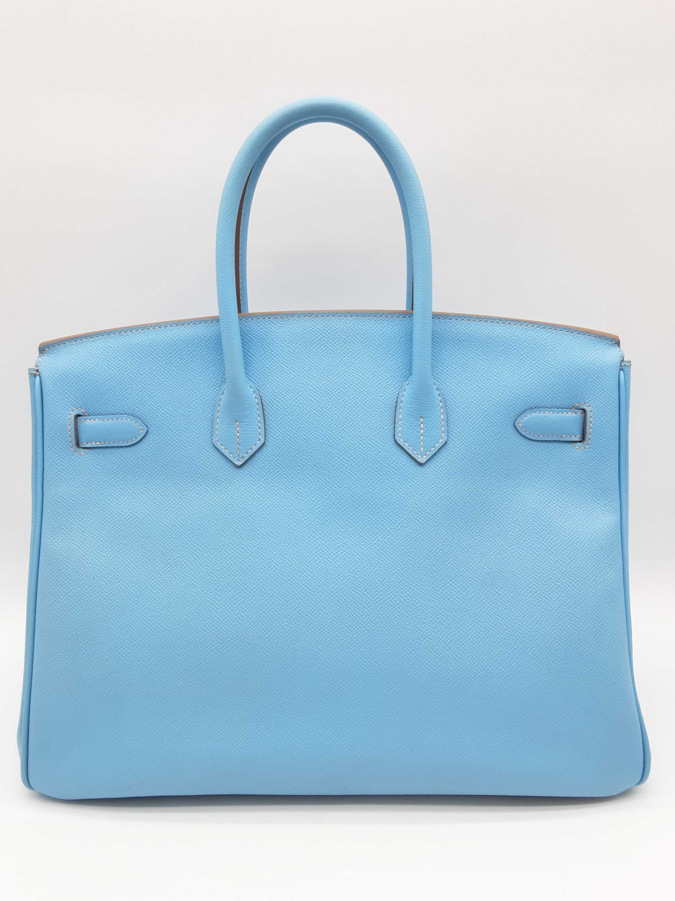 144020029784Hermes Birkin 35CM Celeste Blue Epsom Palladium Hardware Handbag. Length 14 IN X Height 9.5 IN X Width 7 IN X Drop 4 IN. Date Code Square O (2011). Entrupy Certificate #MDT3898. Good Pre-owned Condition with creases, scratches and wear on metal hardware, discoloration and wear on corners, discoloration marks on straps and clochette, marks on interior pockets, and scratches and indentations on interior bottom and in zipper pocket.
