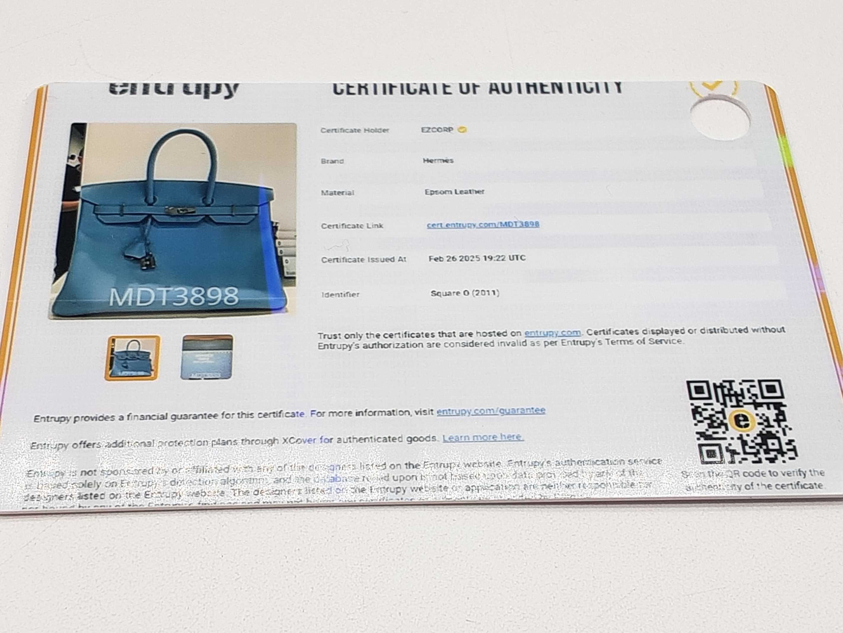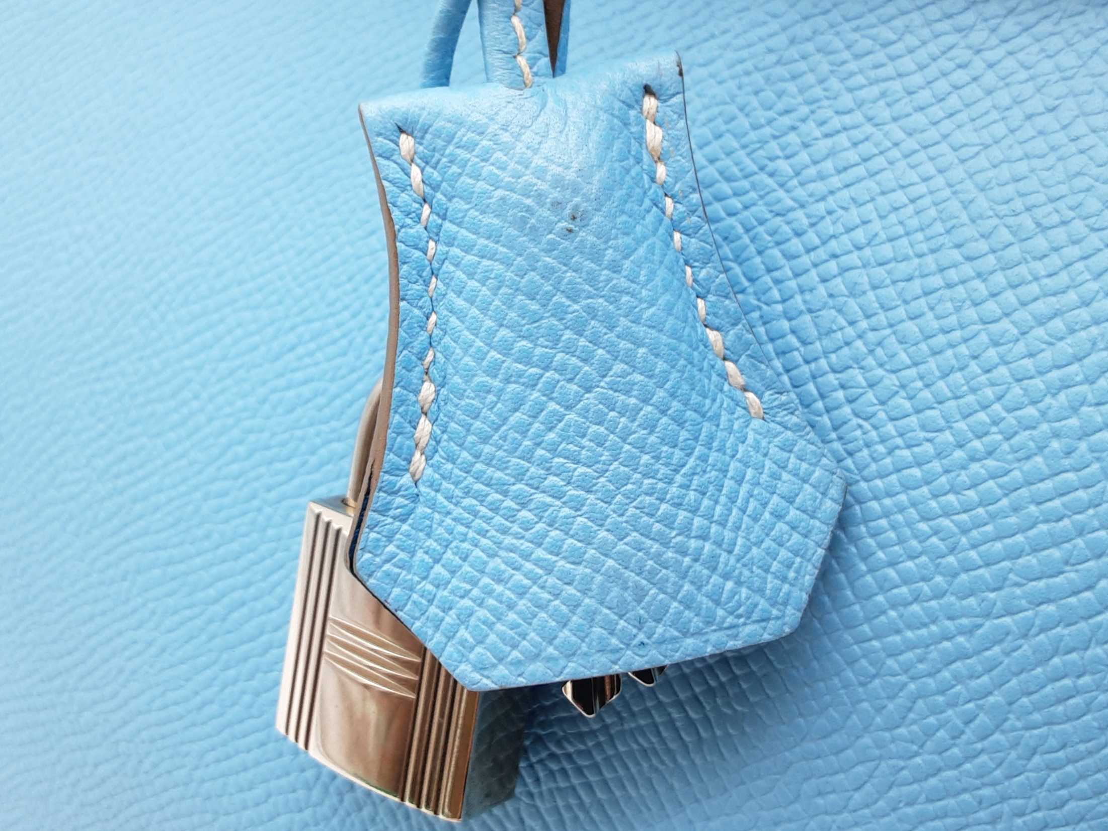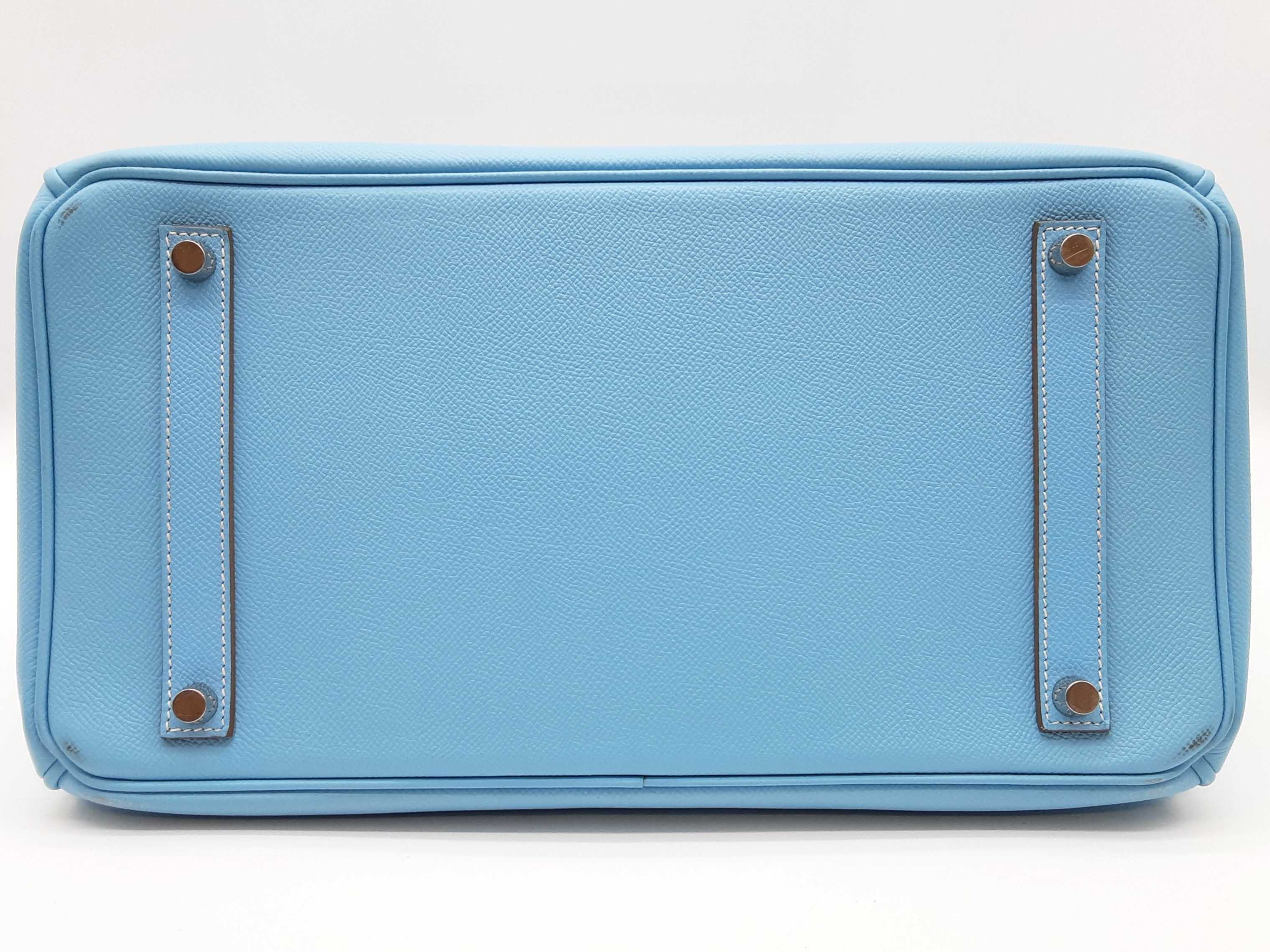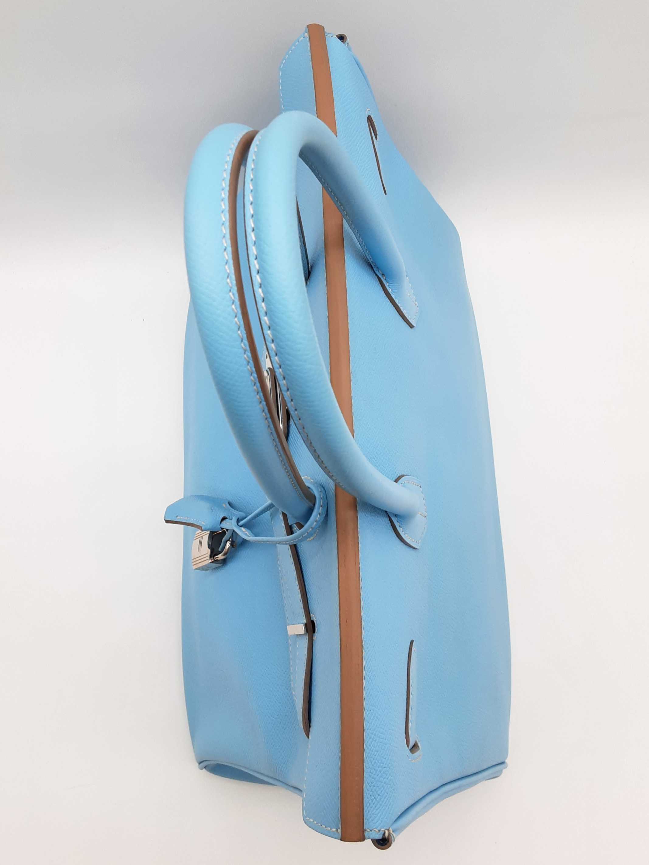 144020029784Hermes Birkin 35CM Celeste Blue Epsom Palladium Hardware Handbag. Length 14 IN X Height 9.5 IN X Width 7 IN X Drop 4 IN. Date Code Square O (2011). Entrupy Certificate #MDT3898. Good Pre-owned Condition with creases, scratches and wear on metal hardware, discoloration and wear on corners, discoloration marks on straps and clochette, marks on interior pockets, and scratches and indentations on interior bottom and in zipper pocket.