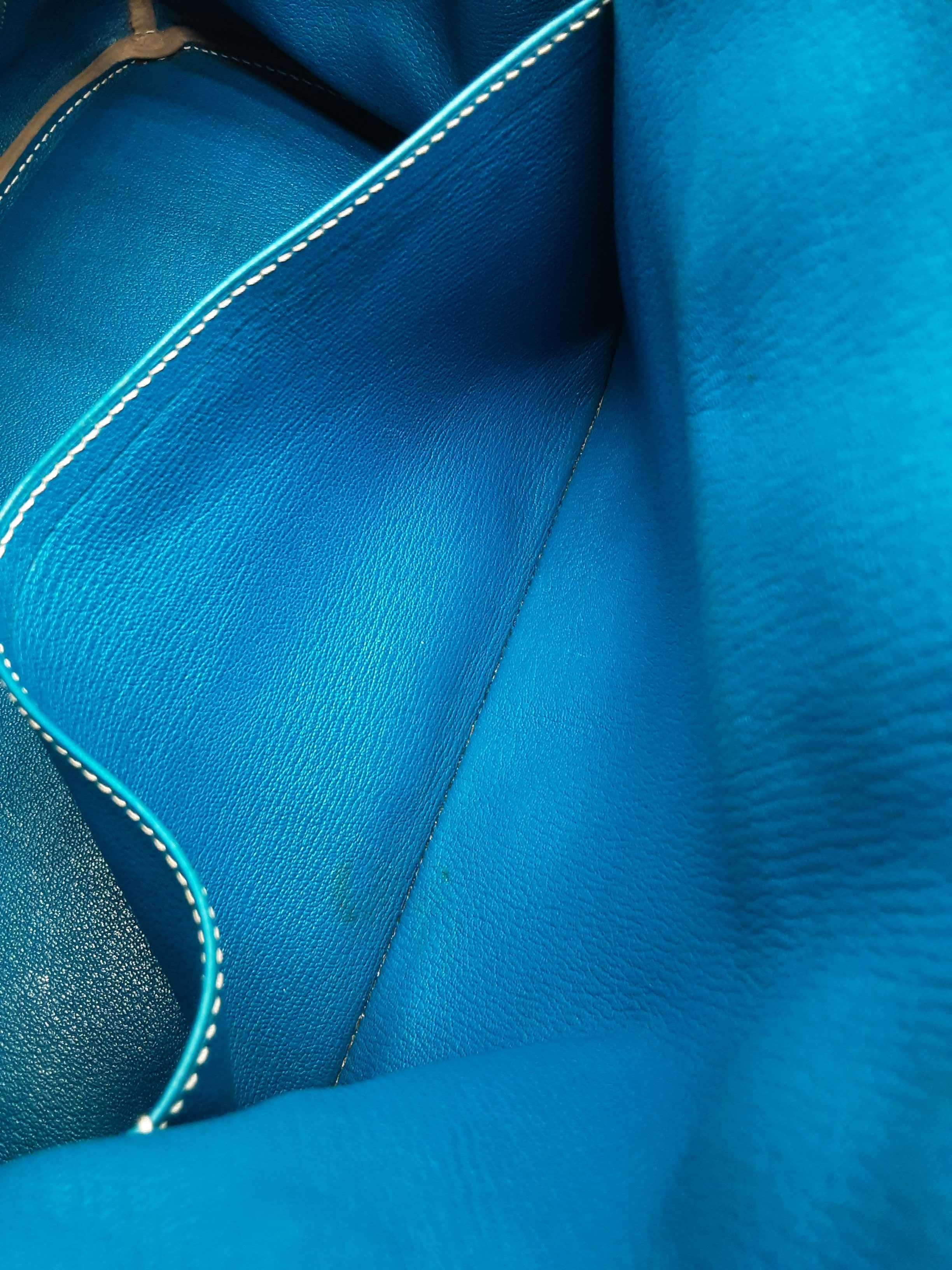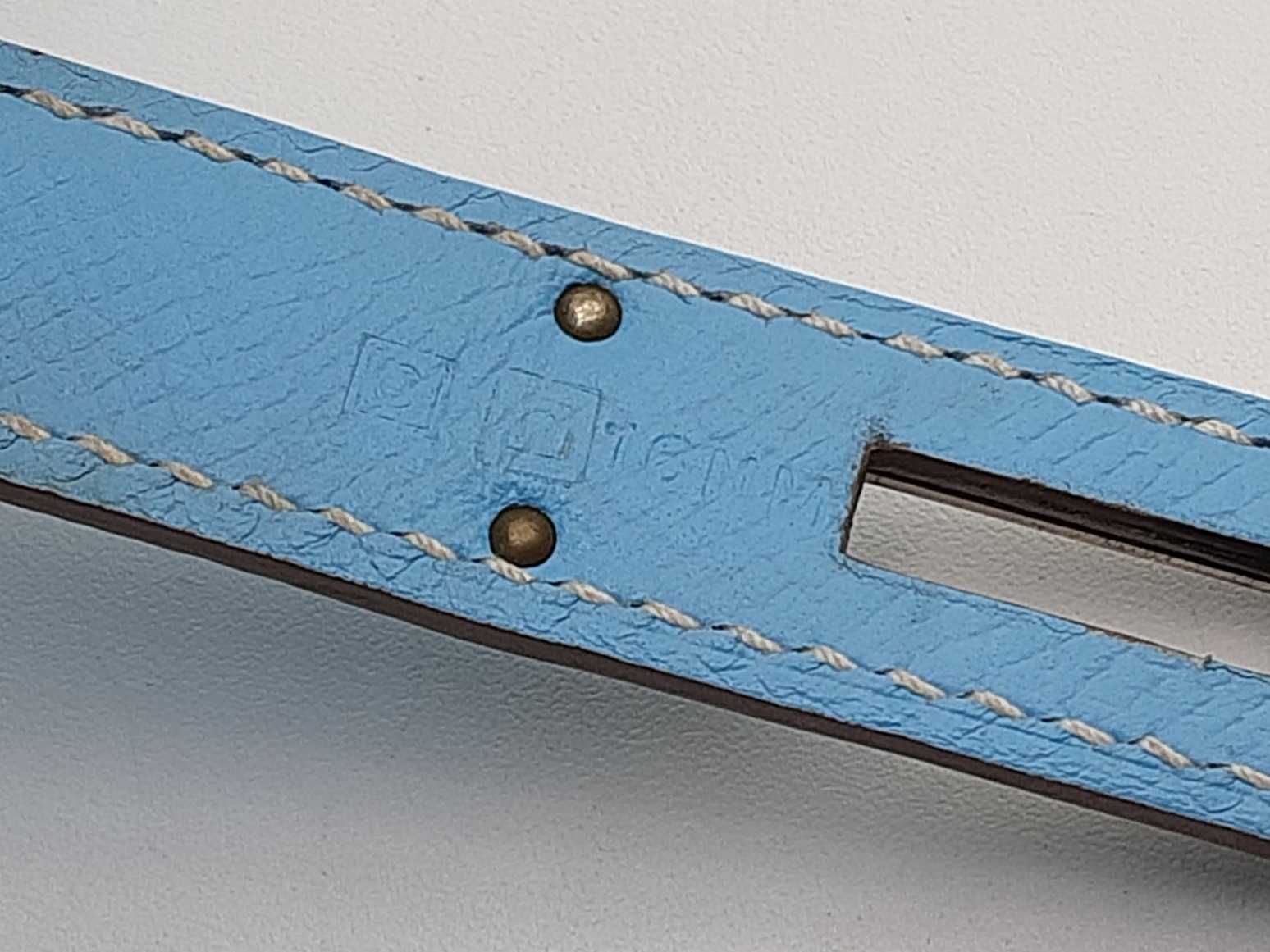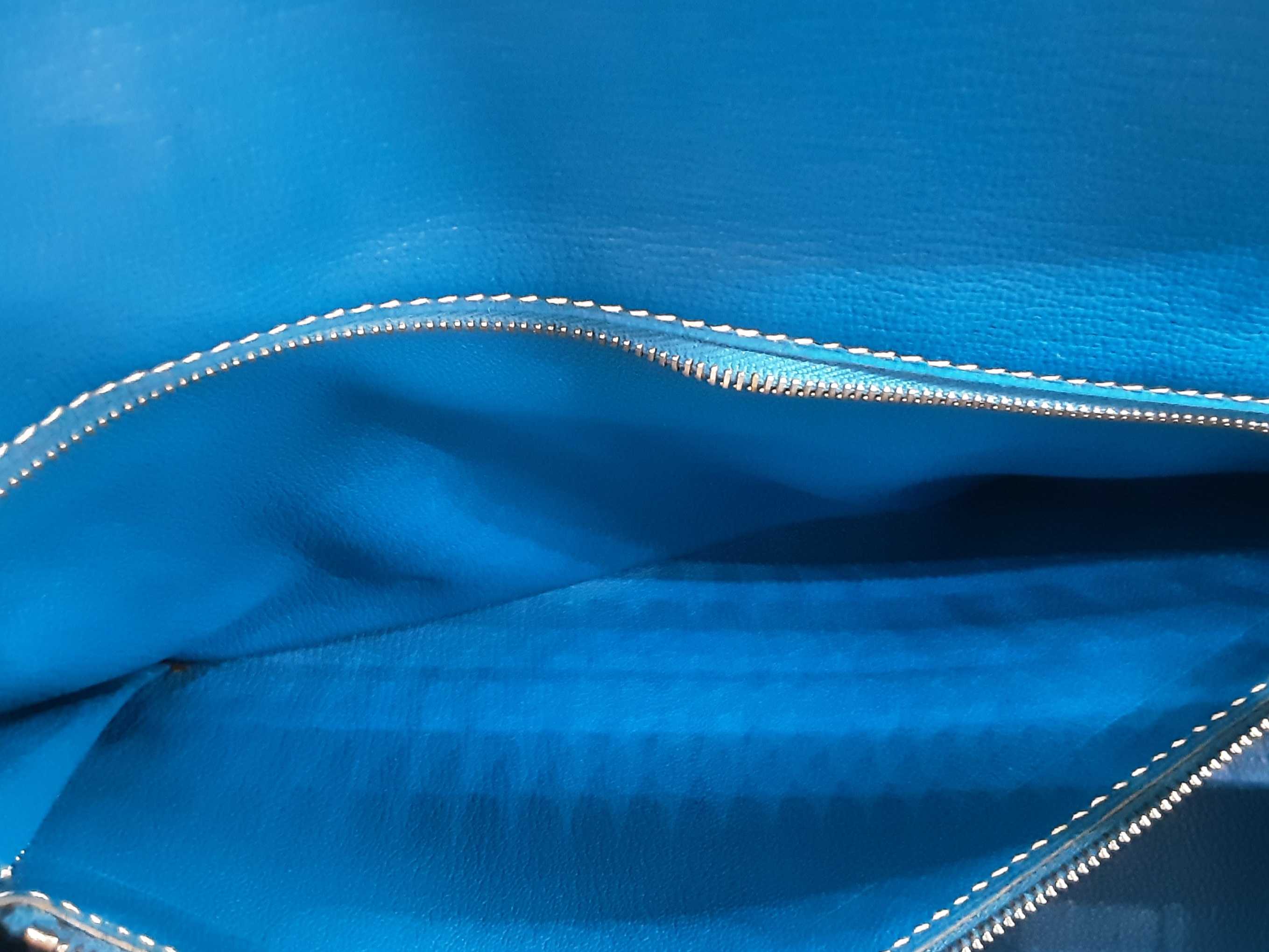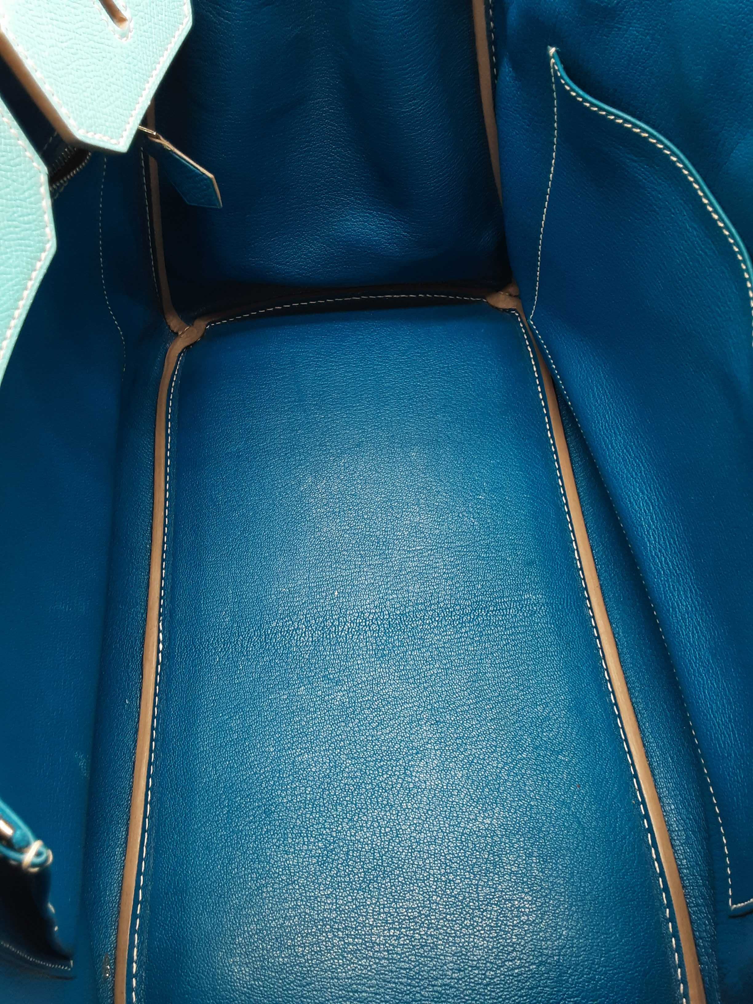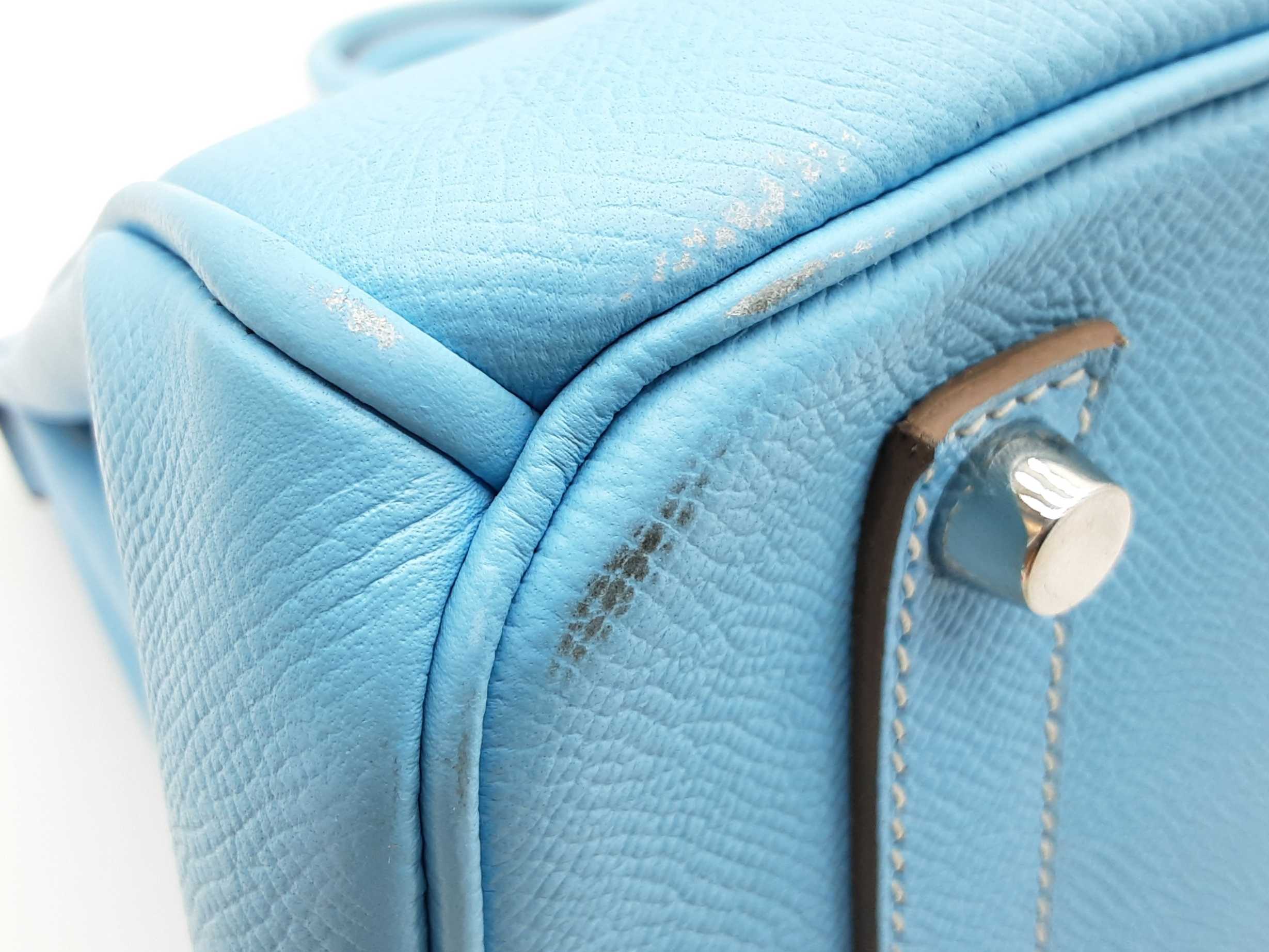 144020029784Hermes Birkin 35CM Celeste Blue Epsom Palladium Hardware Handbag. Length 14 IN X Height 9.5 IN X Width 7 IN X Drop 4 IN. Date Code Square O (2011). Entrupy Certificate #MDT3898. Good Pre-owned Condition with creases, scratches and wear on metal hardware, discoloration and wear on corners, discoloration marks on straps and clochette, marks on interior pockets, and scratches and indentations on interior bottom and in zipper pocket.