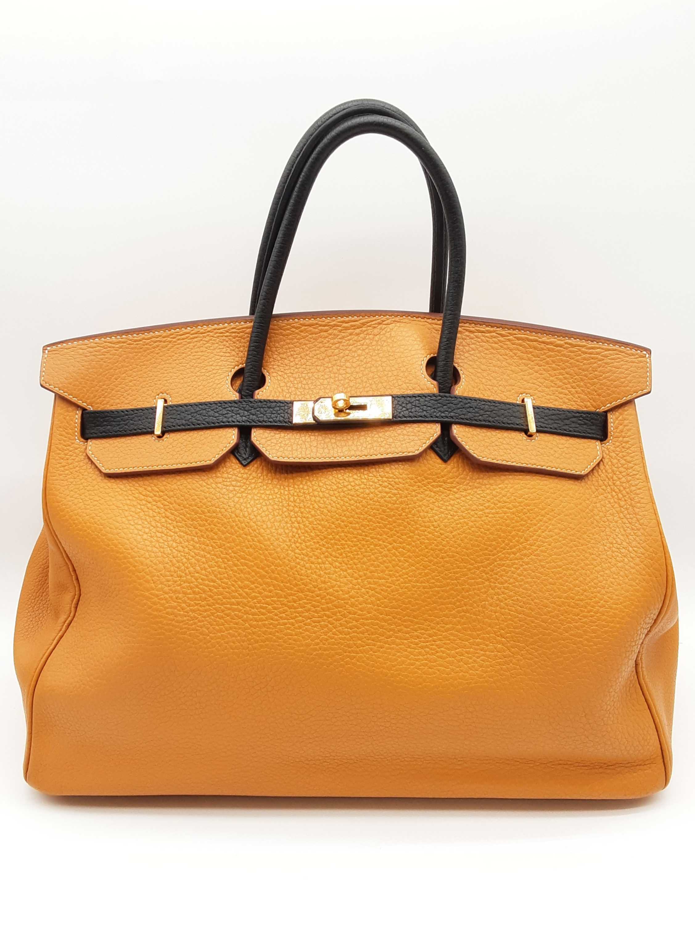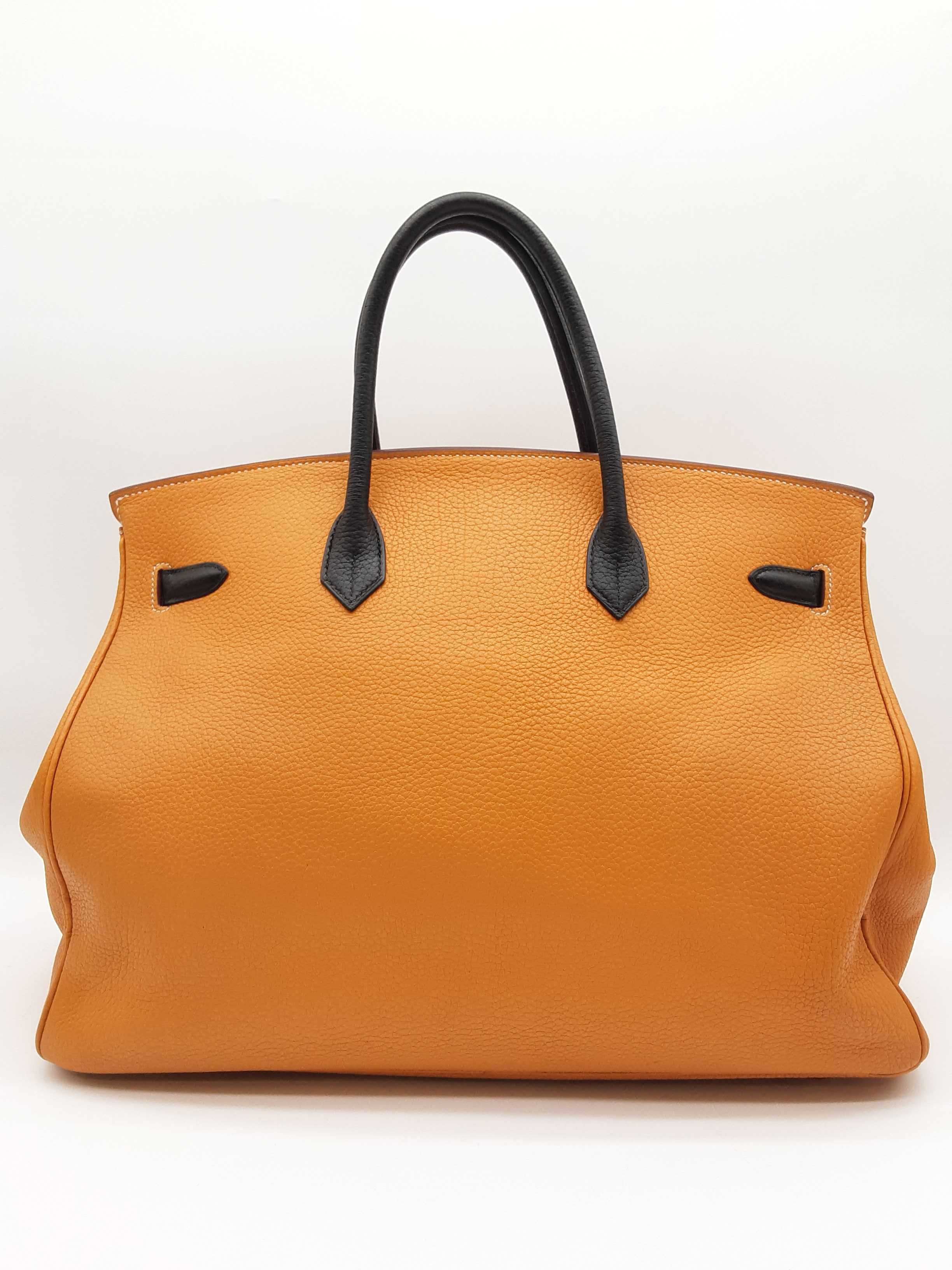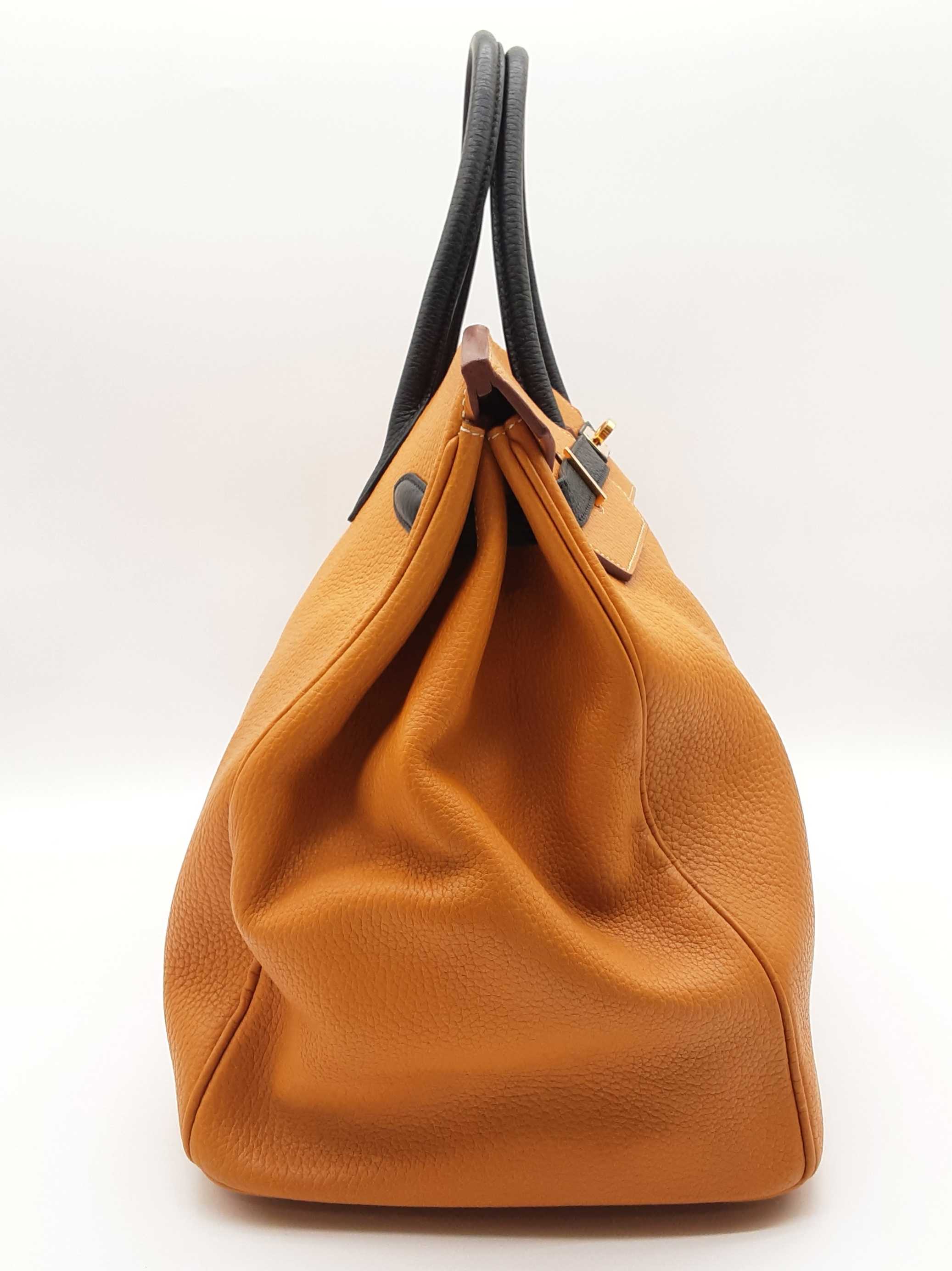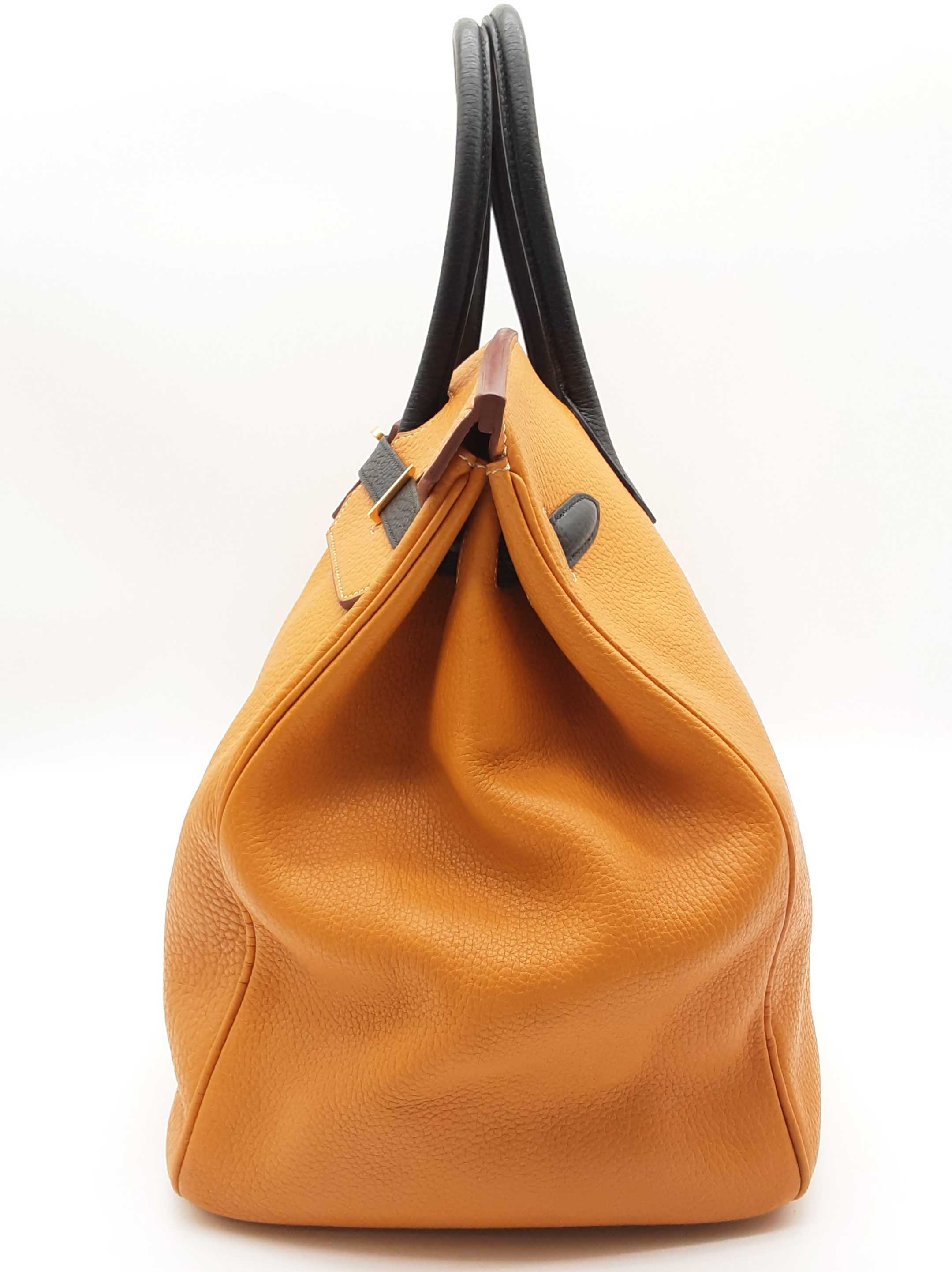 144020016141Hermes Birkin 40CM Gold Noir Black Clemence Gold Hardware Handbag. Length 16 IN X Height 11 IN X Width 8 IN X Drop 4.25 IN. Date Code Square E (2001). Entrupy Certificate #TJH6G2C. Good Pre-owned Condition with creases, flap curved, scratches and wear on metal hardware, discoloration on metal feet, wear on edges, marks and scratches on interior, and stains and wear inside interior pockets. Note: There's a possibility bag has been repainted.