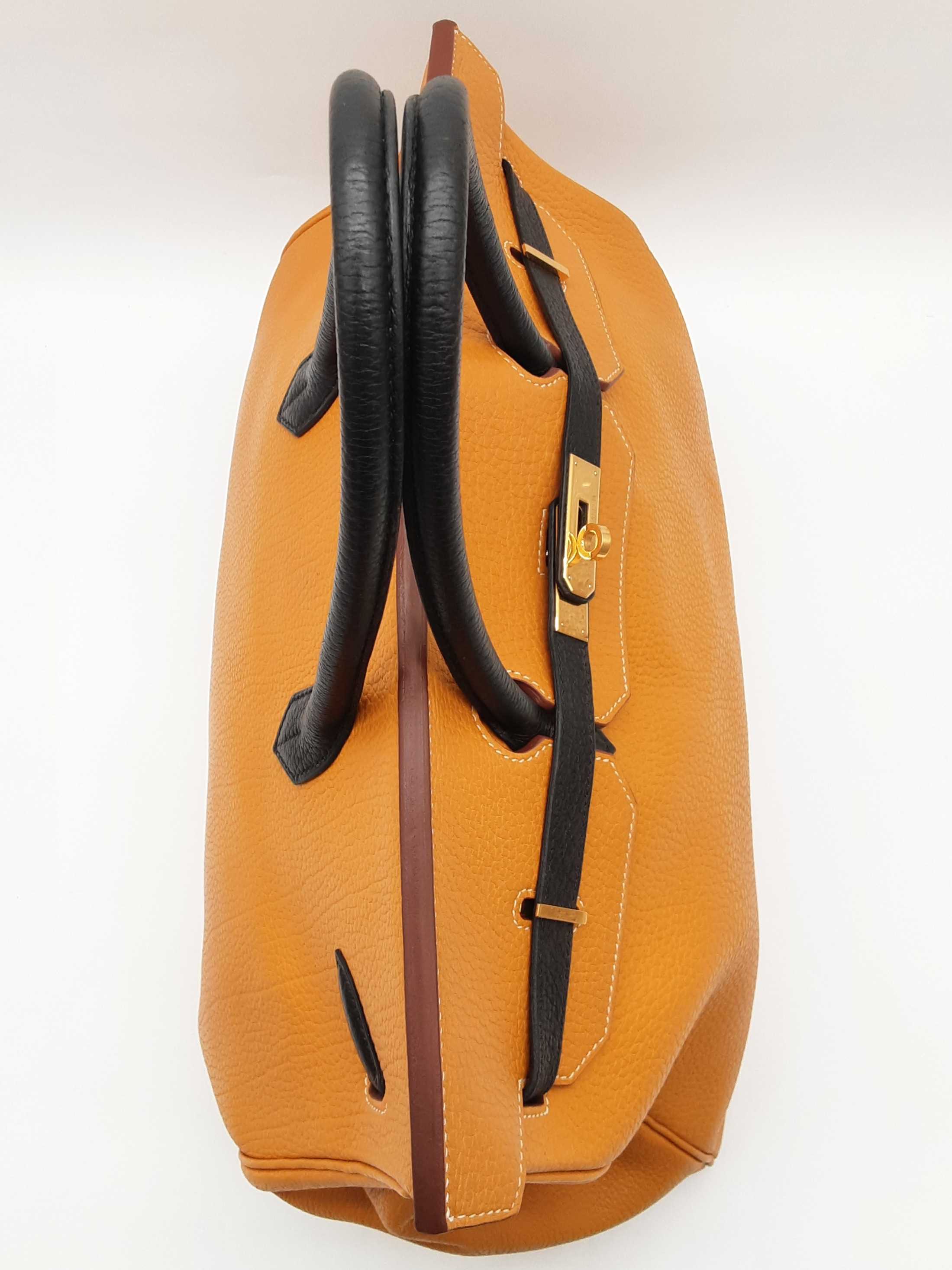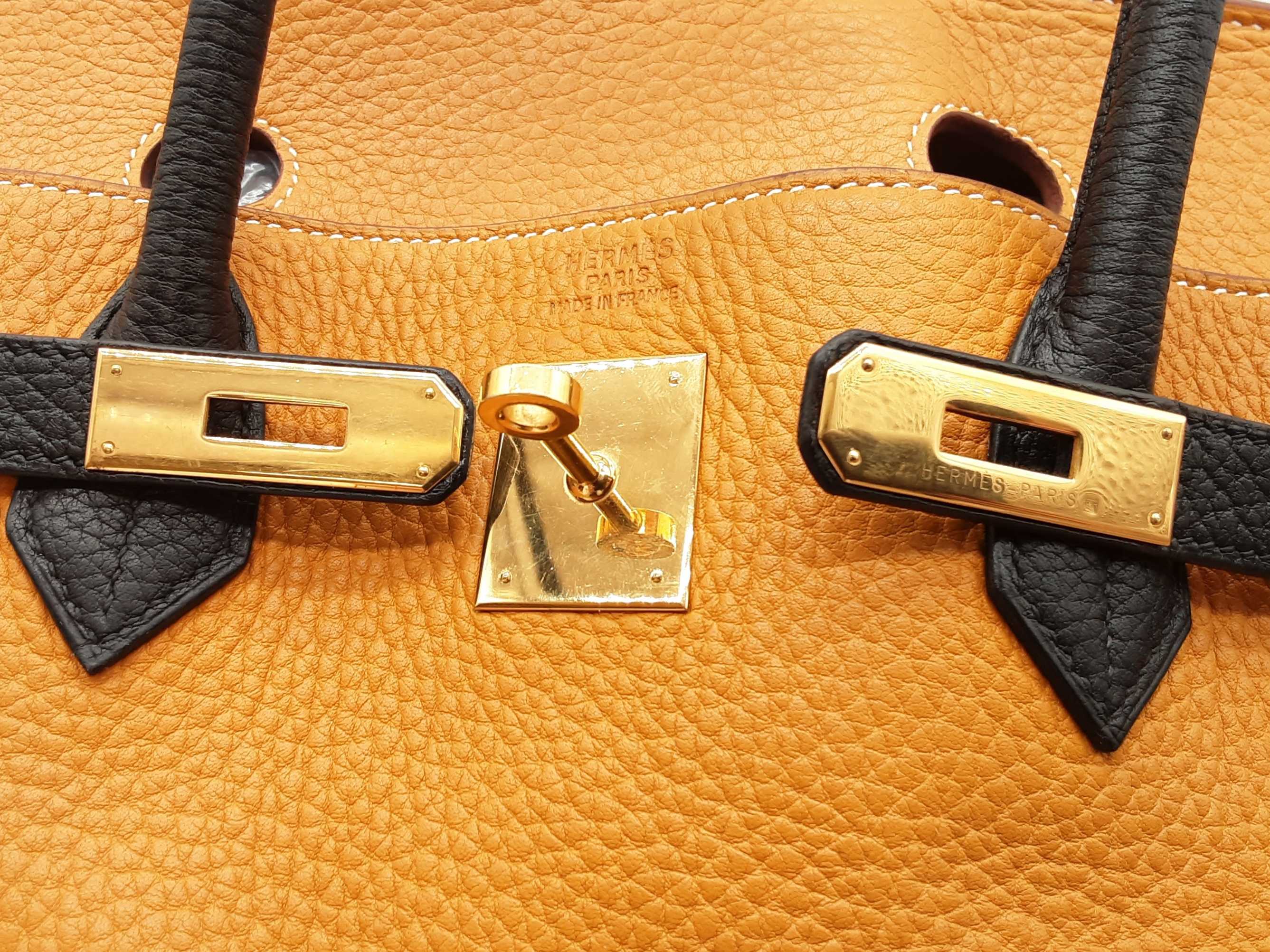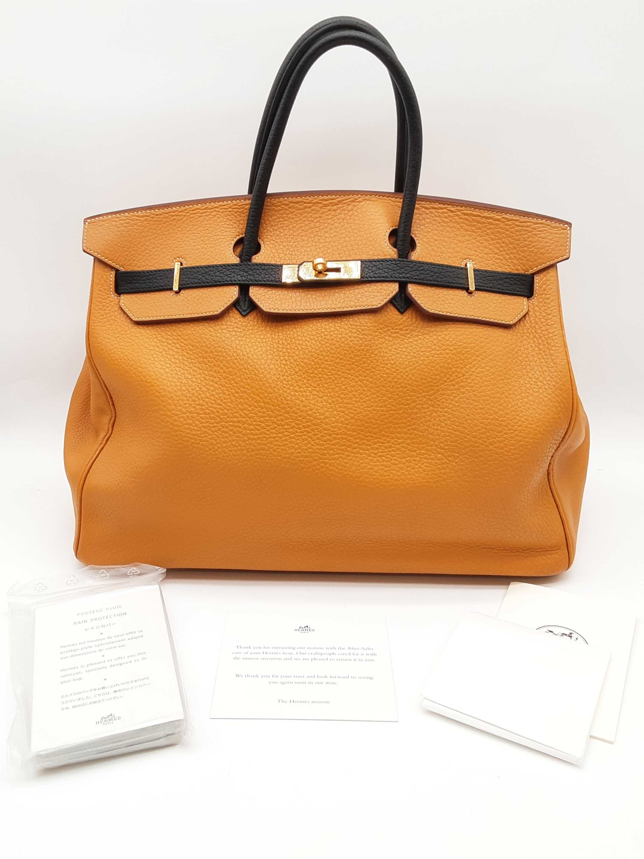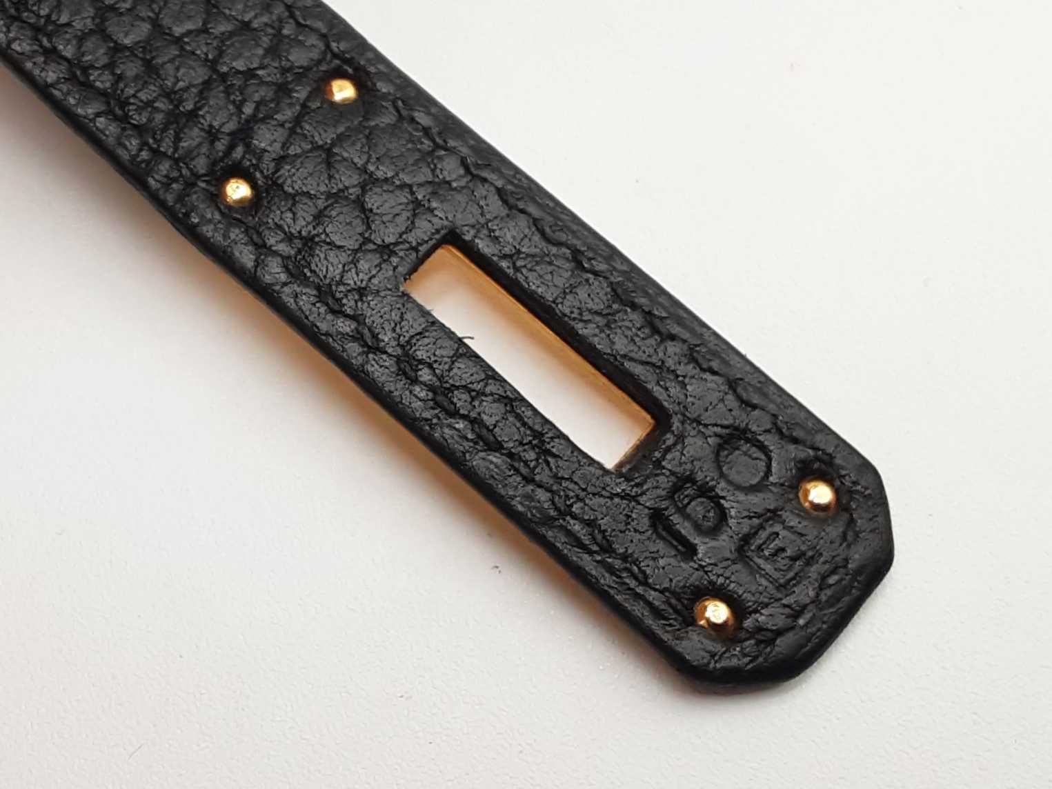 144020016141Hermes Birkin 40CM Gold Noir Black Clemence Gold Hardware Handbag. Length 16 IN X Height 11 IN X Width 8 IN X Drop 4.25 IN. Date Code Square E (2001). Entrupy Certificate #TJH6G2C. Good Pre-owned Condition with creases, flap curved, scratches and wear on metal hardware, discoloration on metal feet, wear on edges, marks and scratches on interior, and stains and wear inside interior pockets. Note: There's a possibility bag has been repainted.